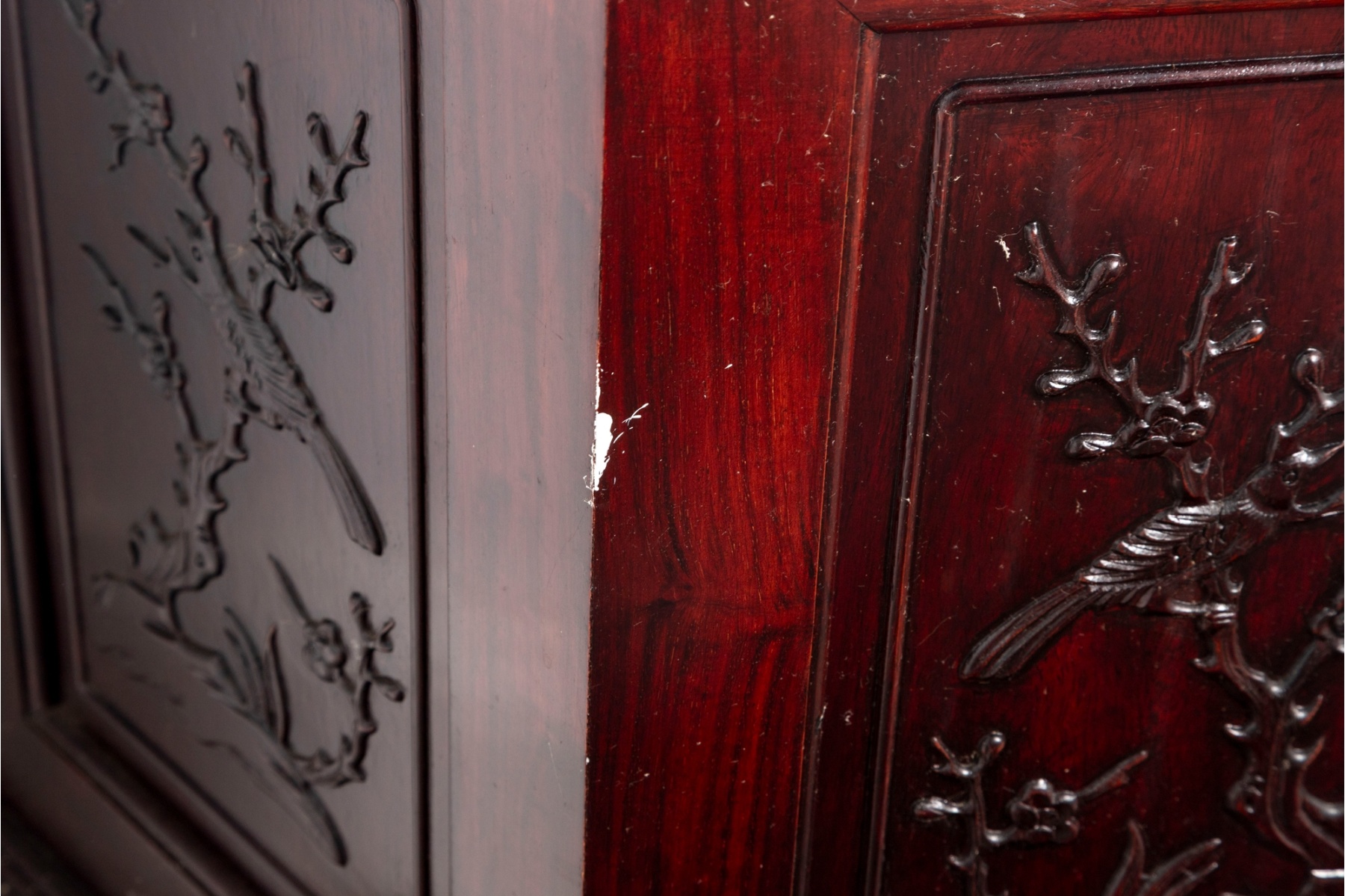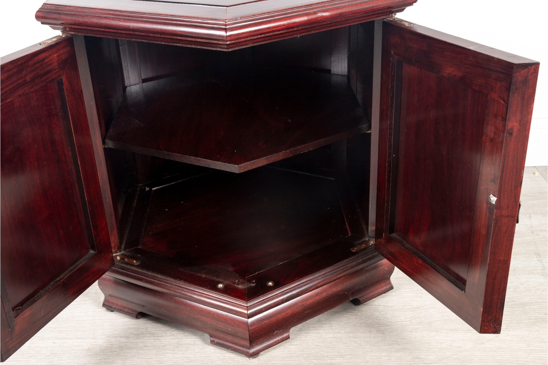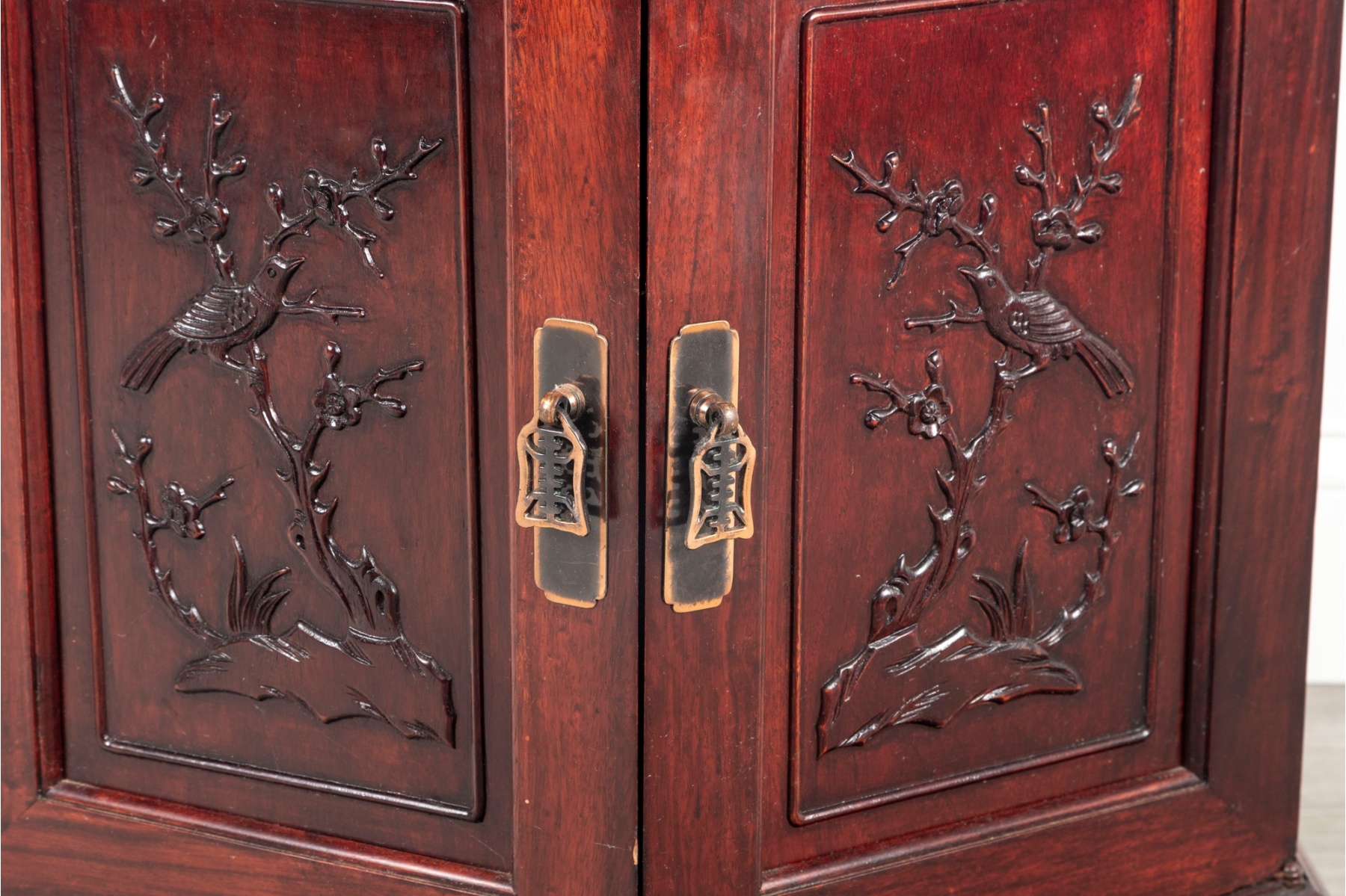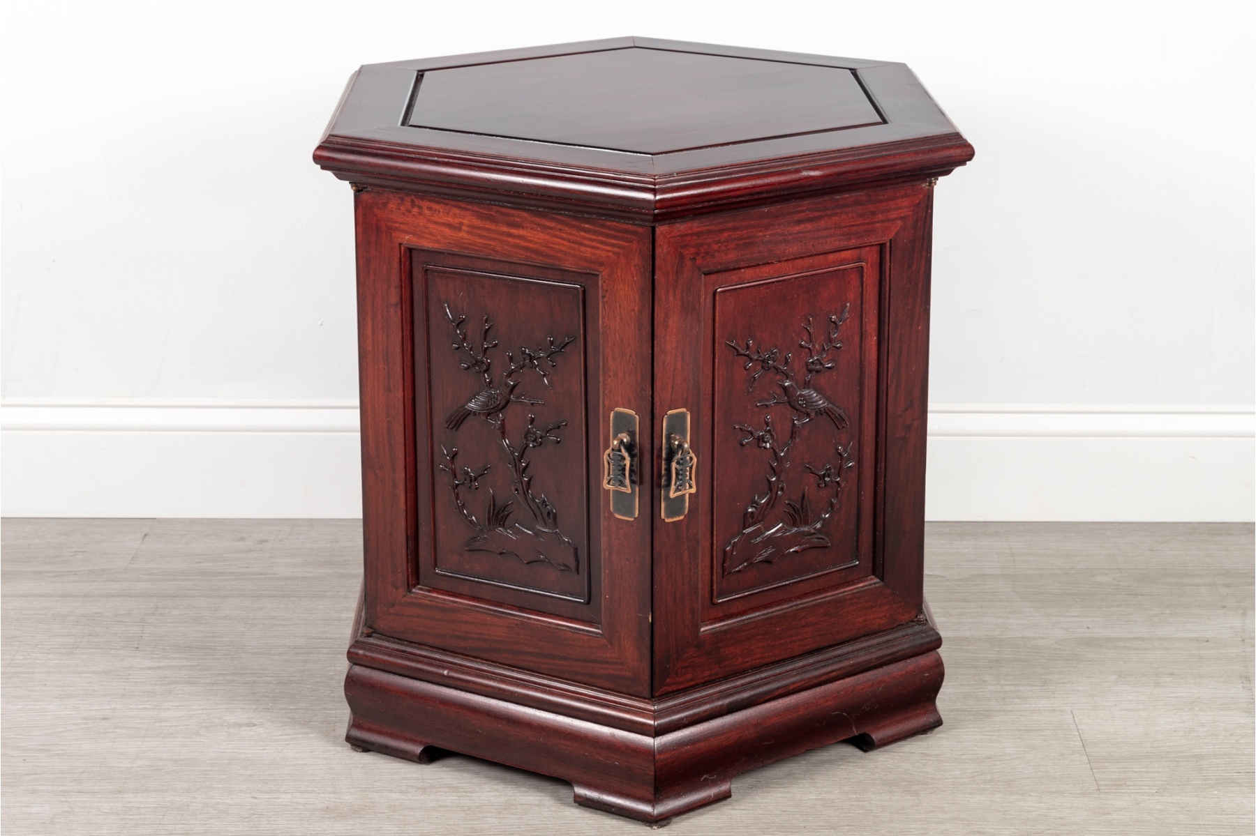 Finely crafted hexagonal cabinet featuring double doors with hand-carved panels depicting birds and flowering branches in relief. The piece rests on a molded plinth base and opens to interior storage.