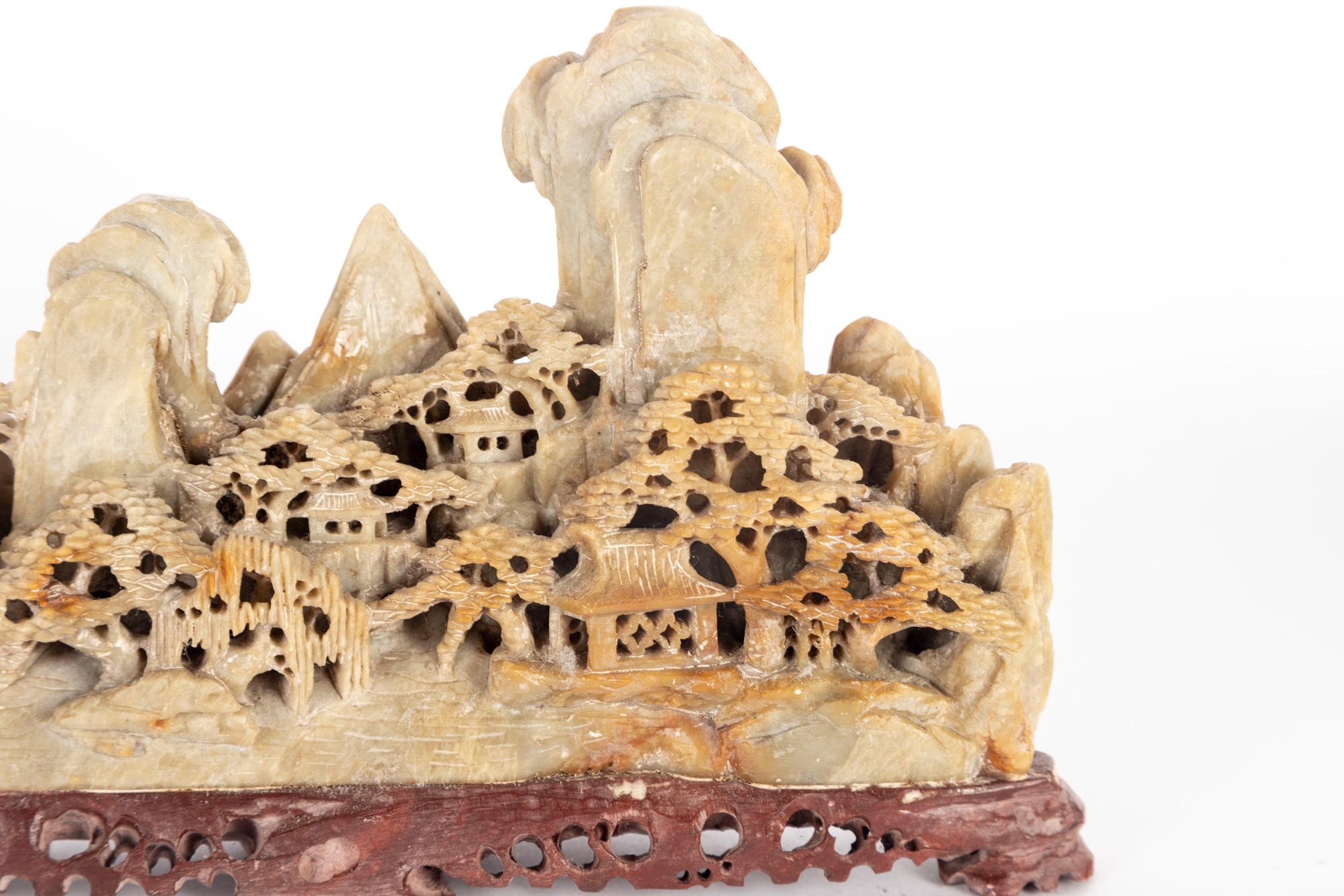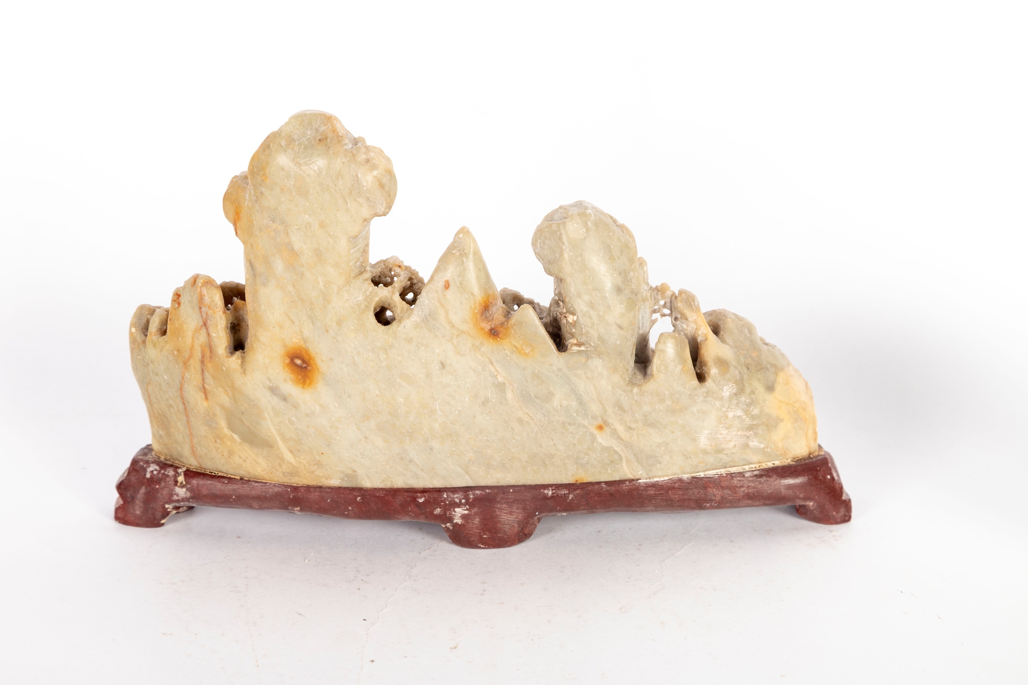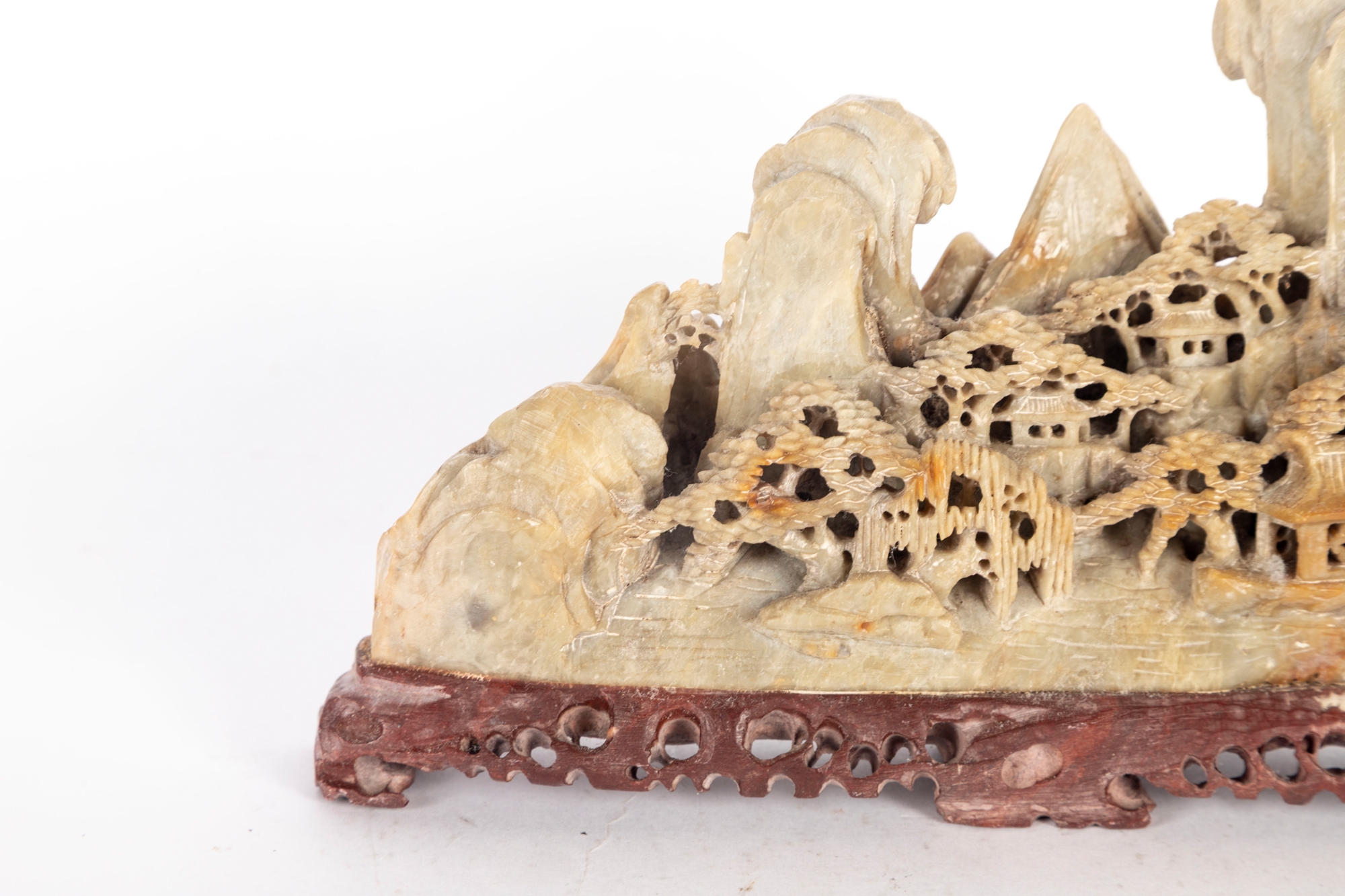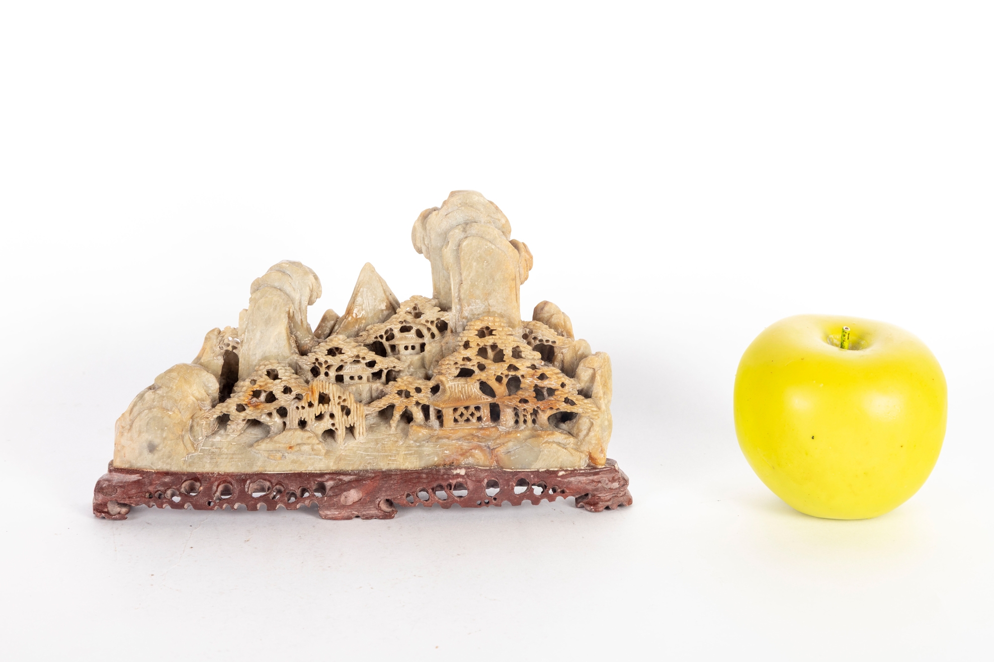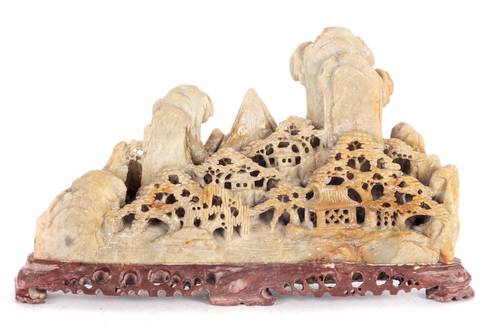 A small, lovely vintage Chinese landscape display carved from fine soapstone, including the base. Intricately and meticulously detailed throughout.