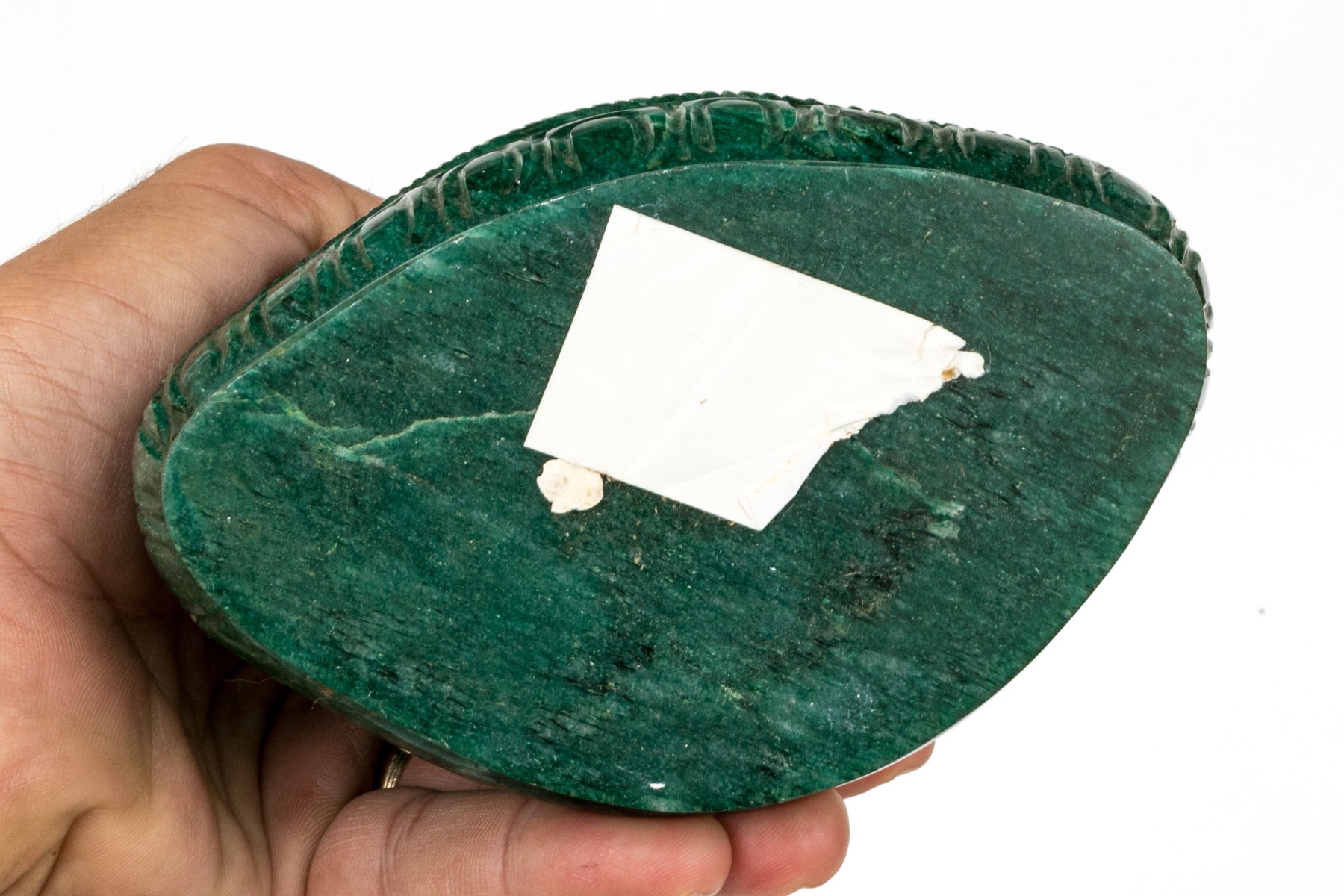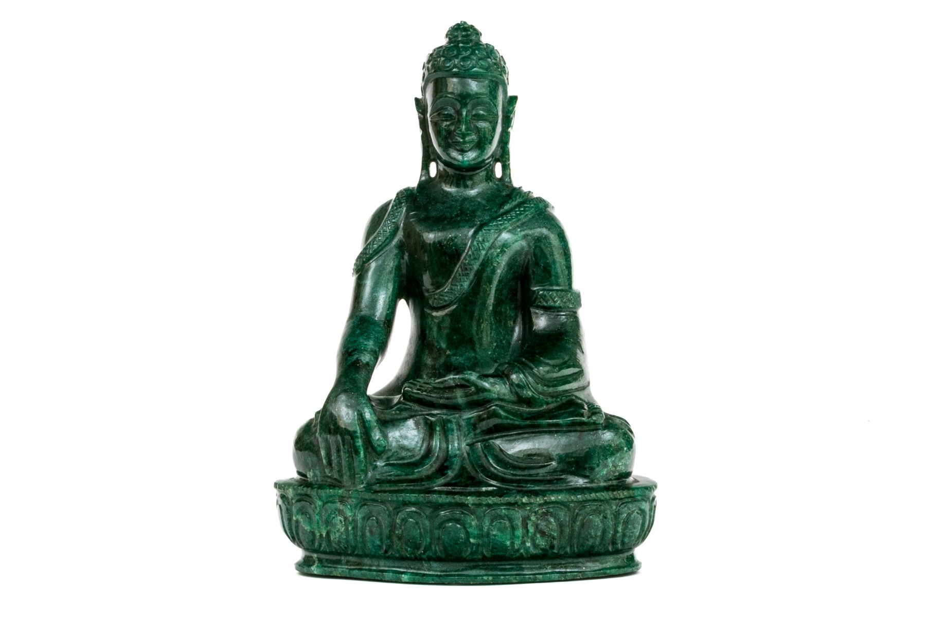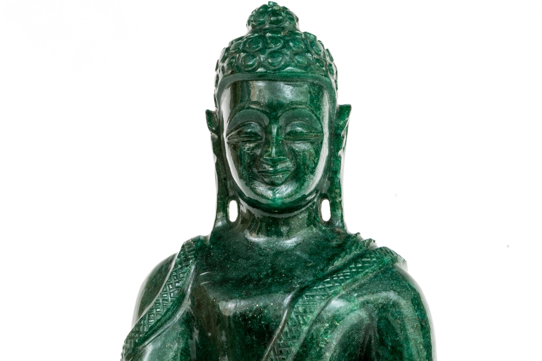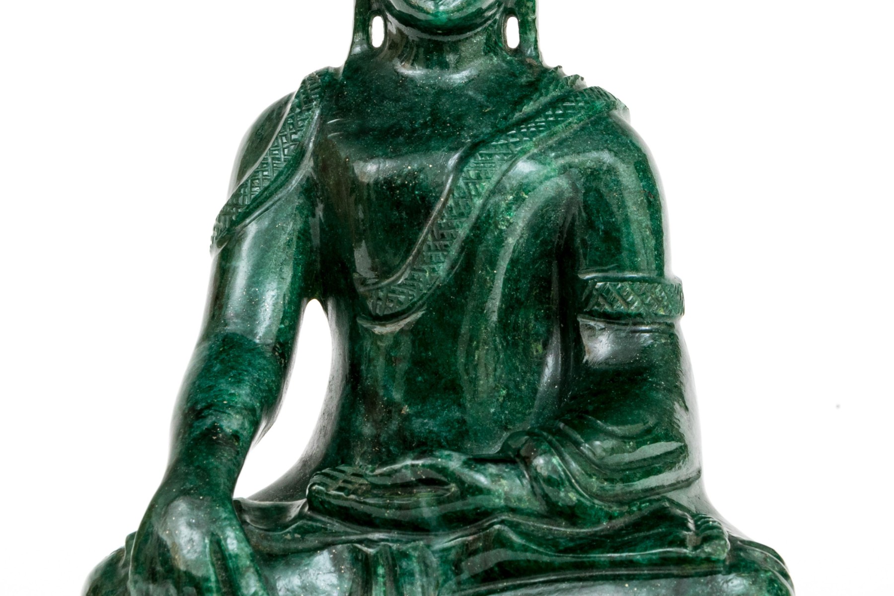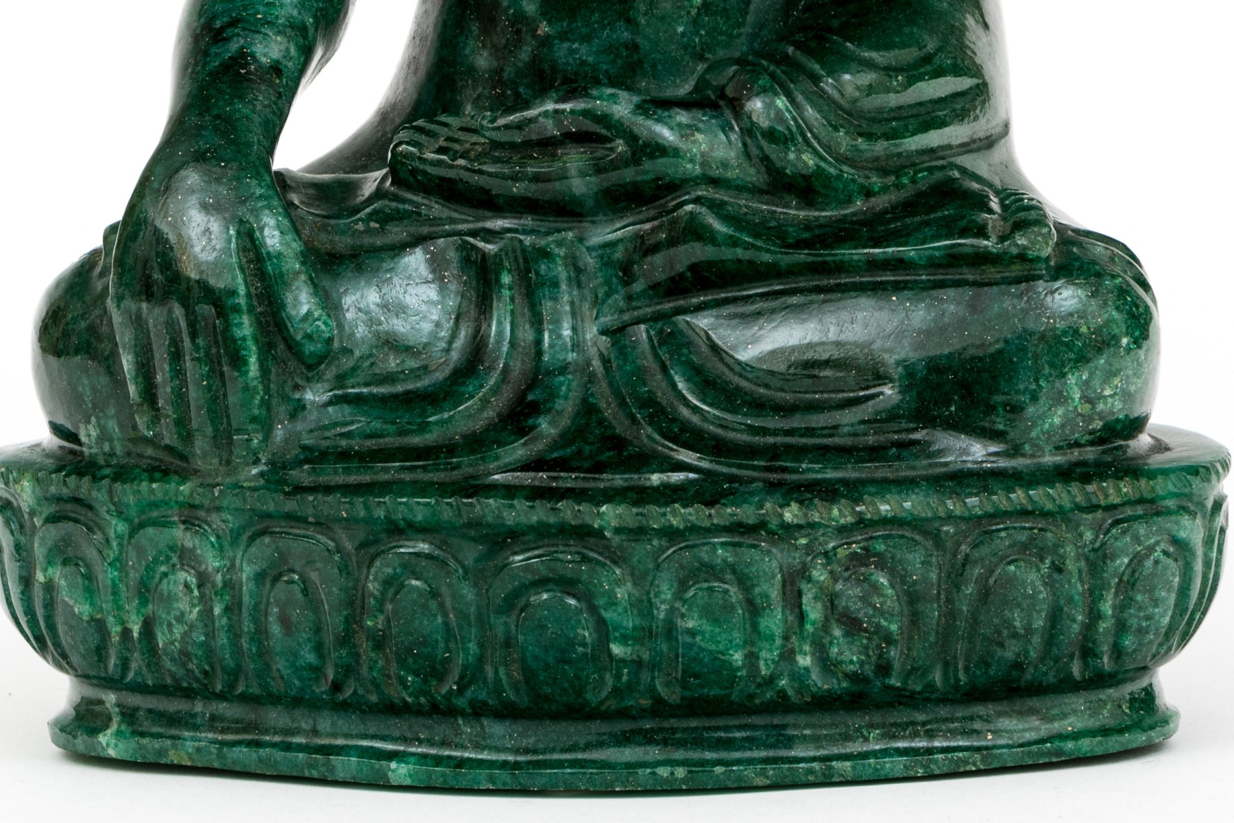A Chinese figure of Buddha presented seated in lotus position, upon a lotus form throne. The Buddha's right hand can be seen upon his knee with the left arm and hand faced palm up, upon the Buddha's lap. Carved in a gorgeous, vibrant green stone, possibly aventurine.