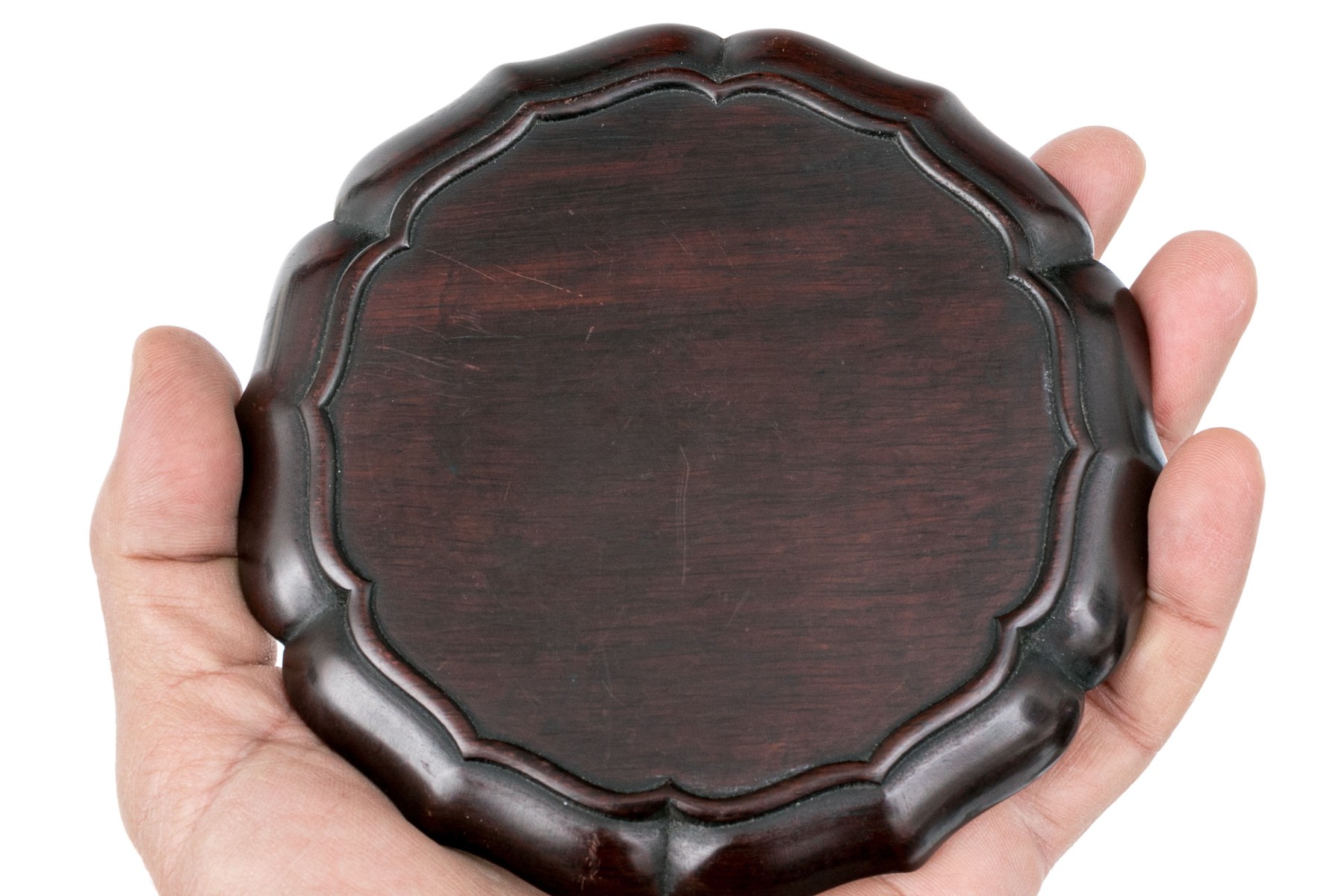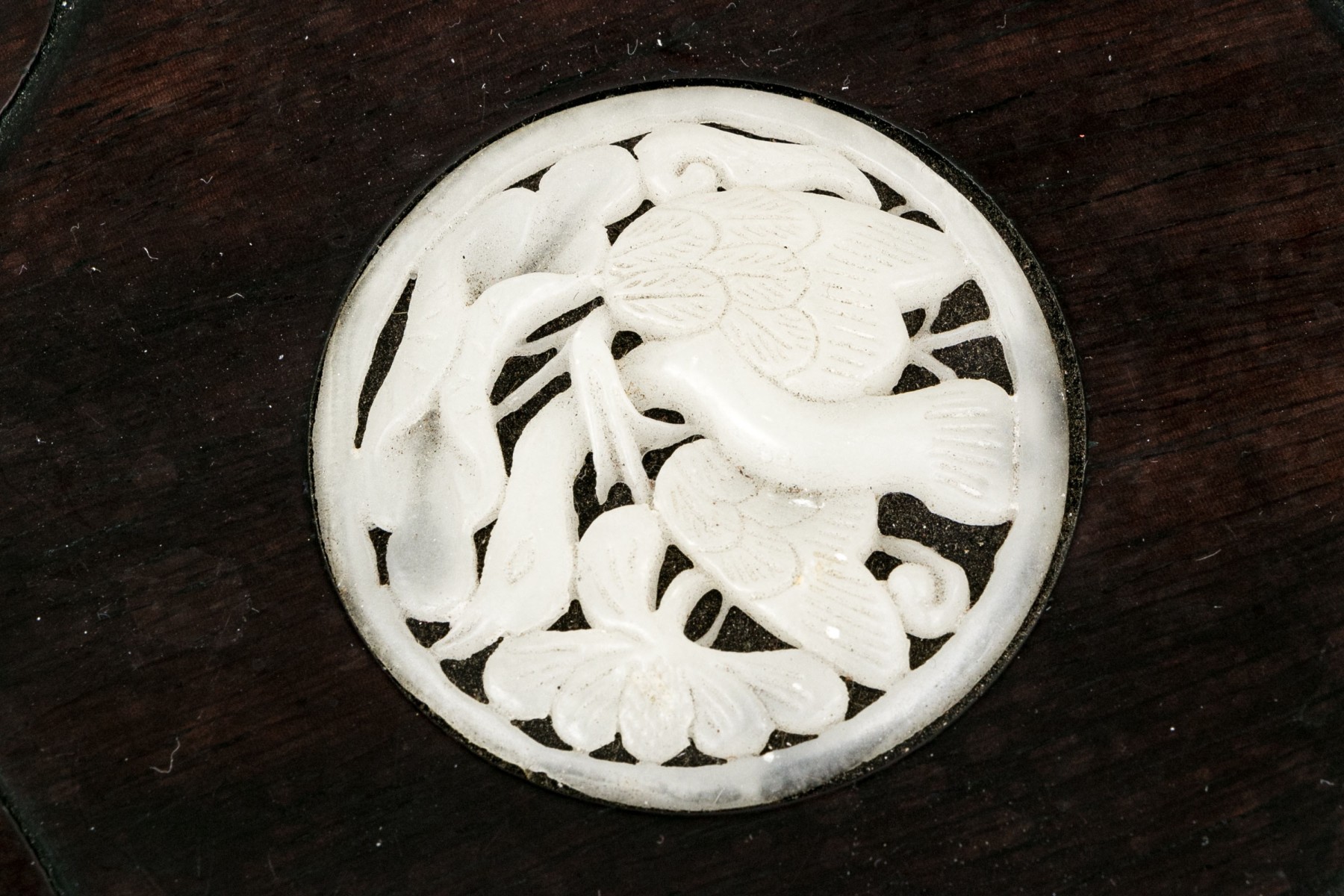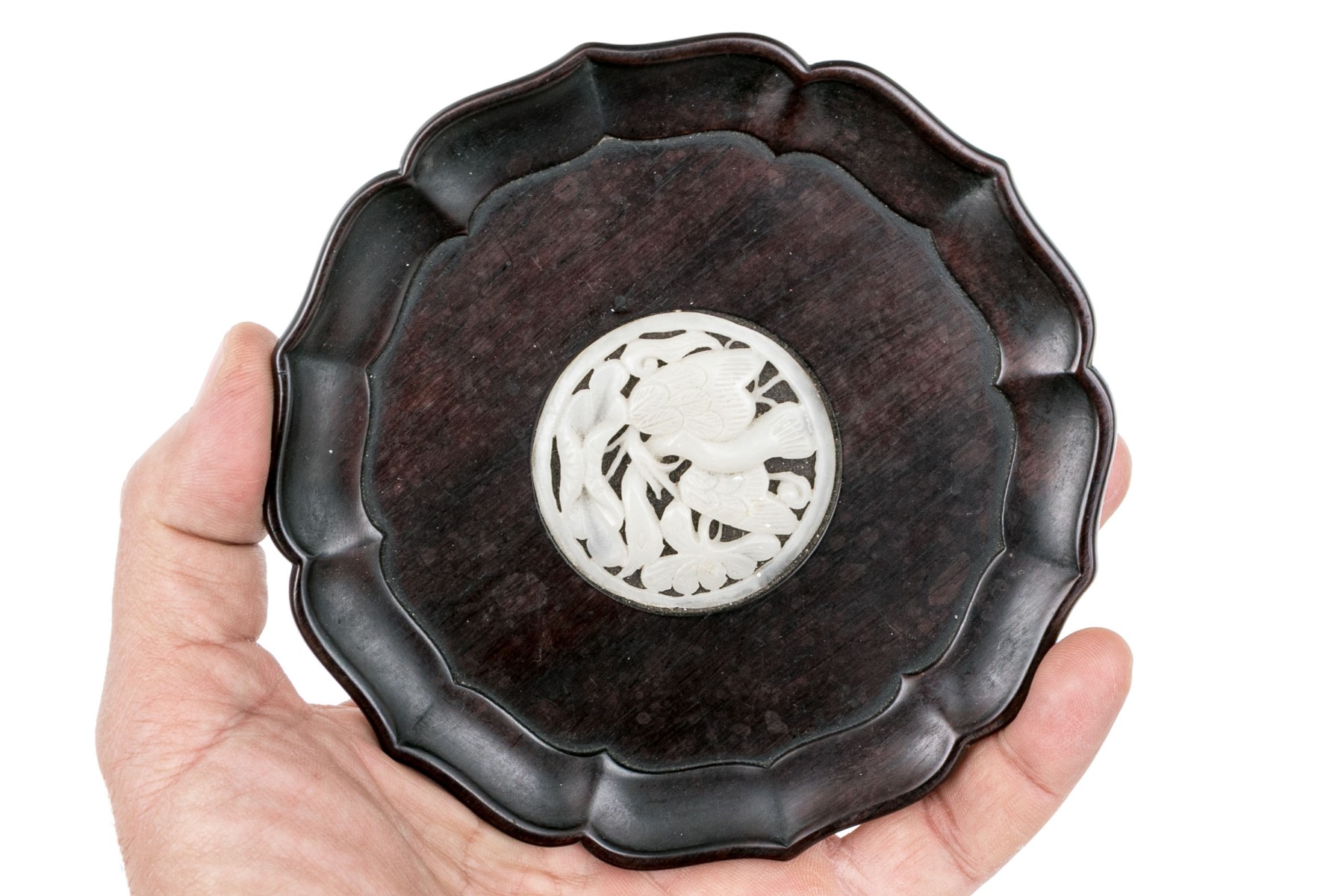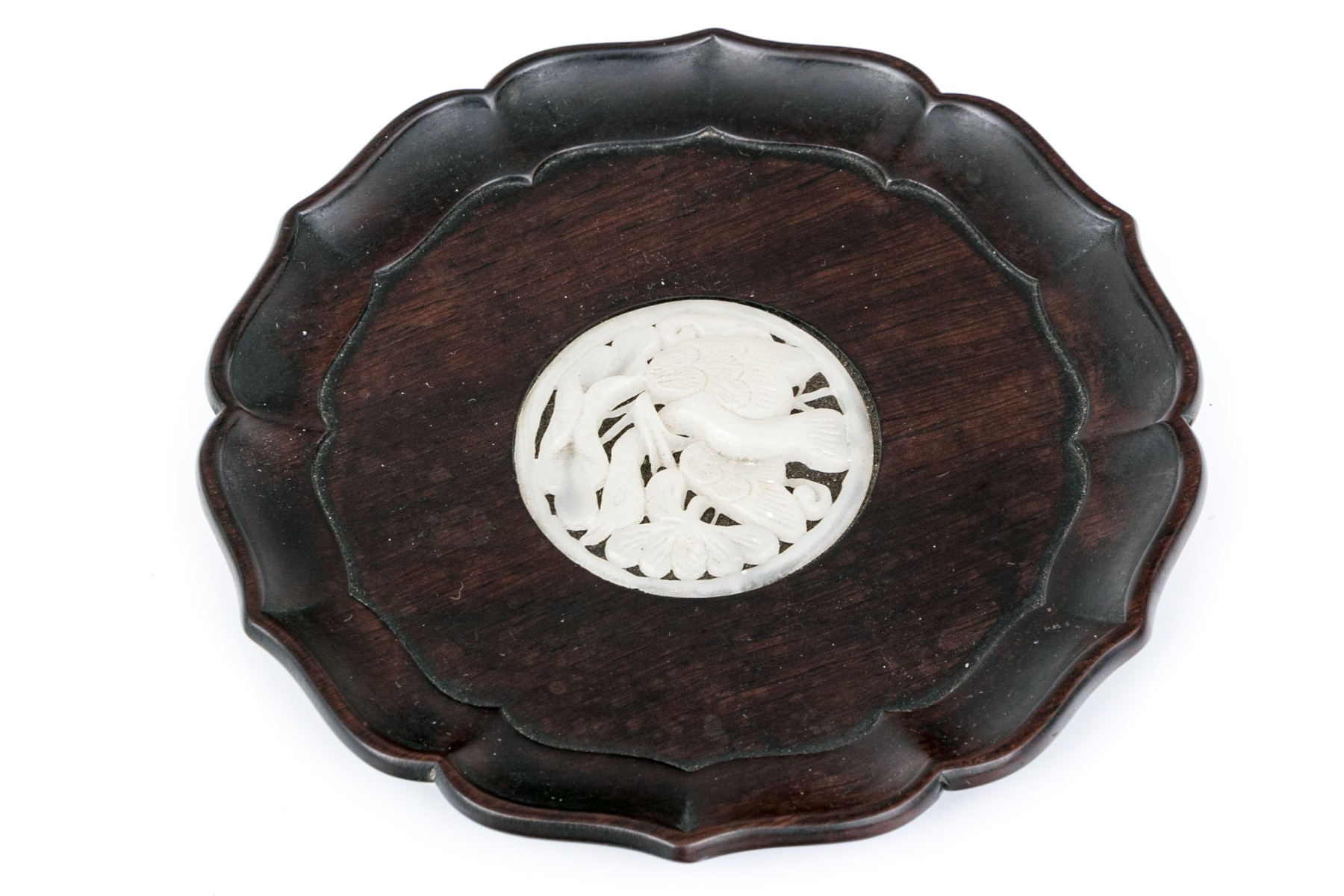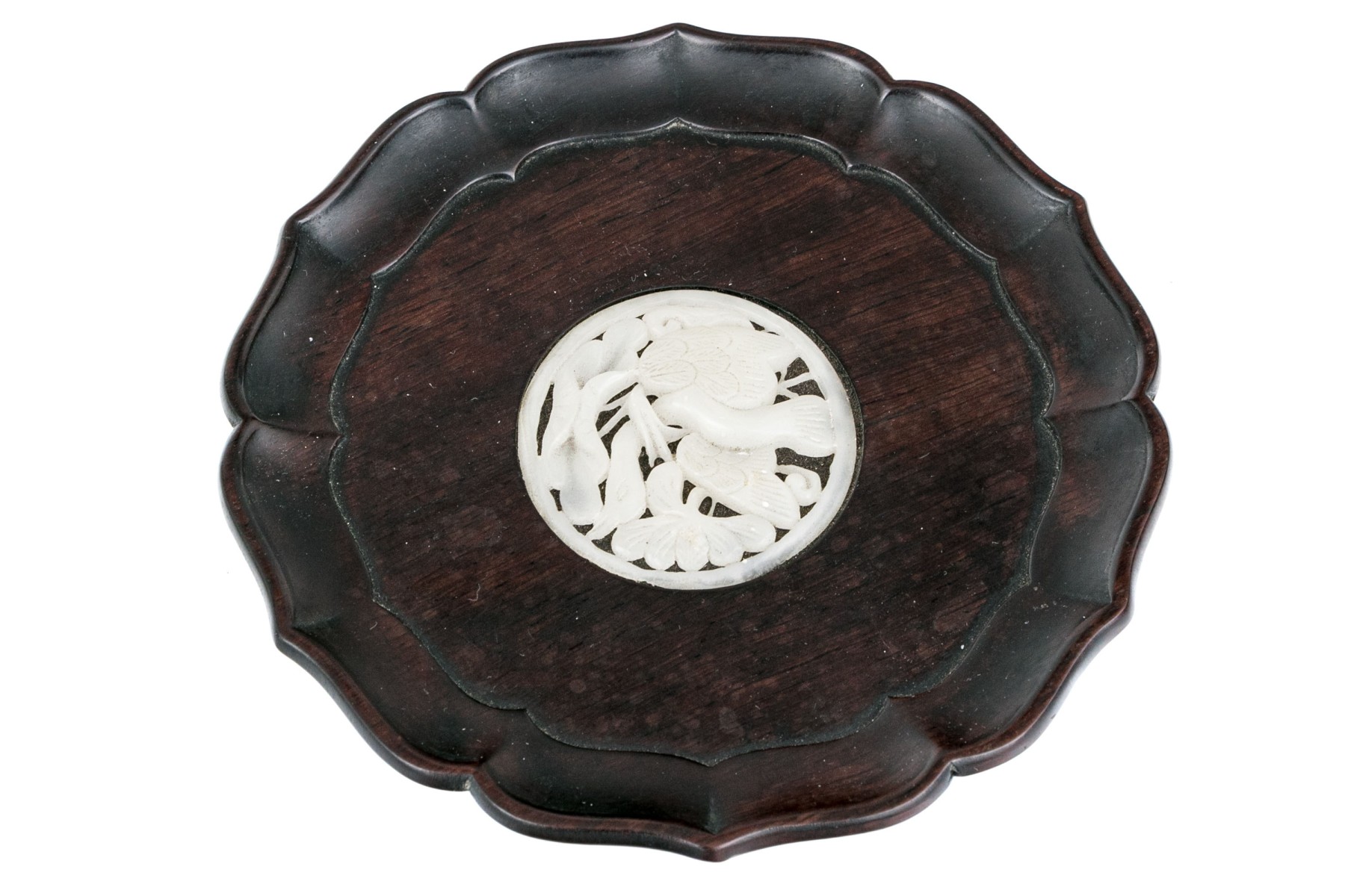 The central pierced white jade or hardstone medallion with pierced foliate and crane motif. The carved and rosewood finished wood tray with wonderfully barbed and scalloped moulded trim.