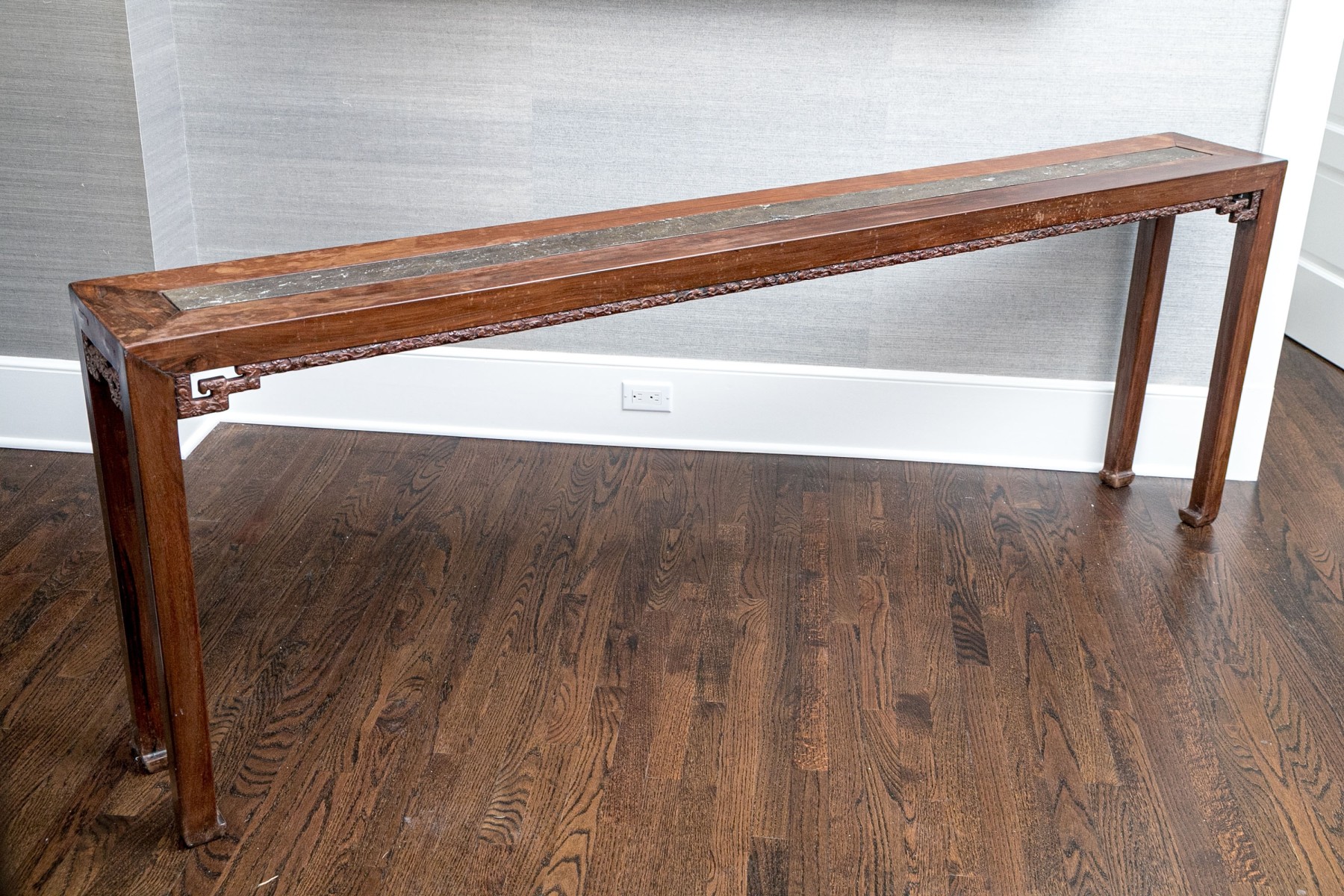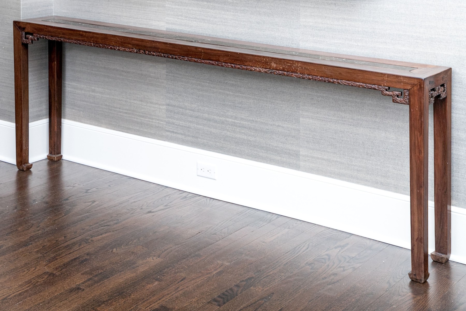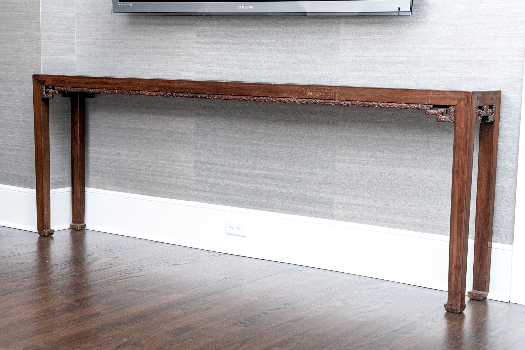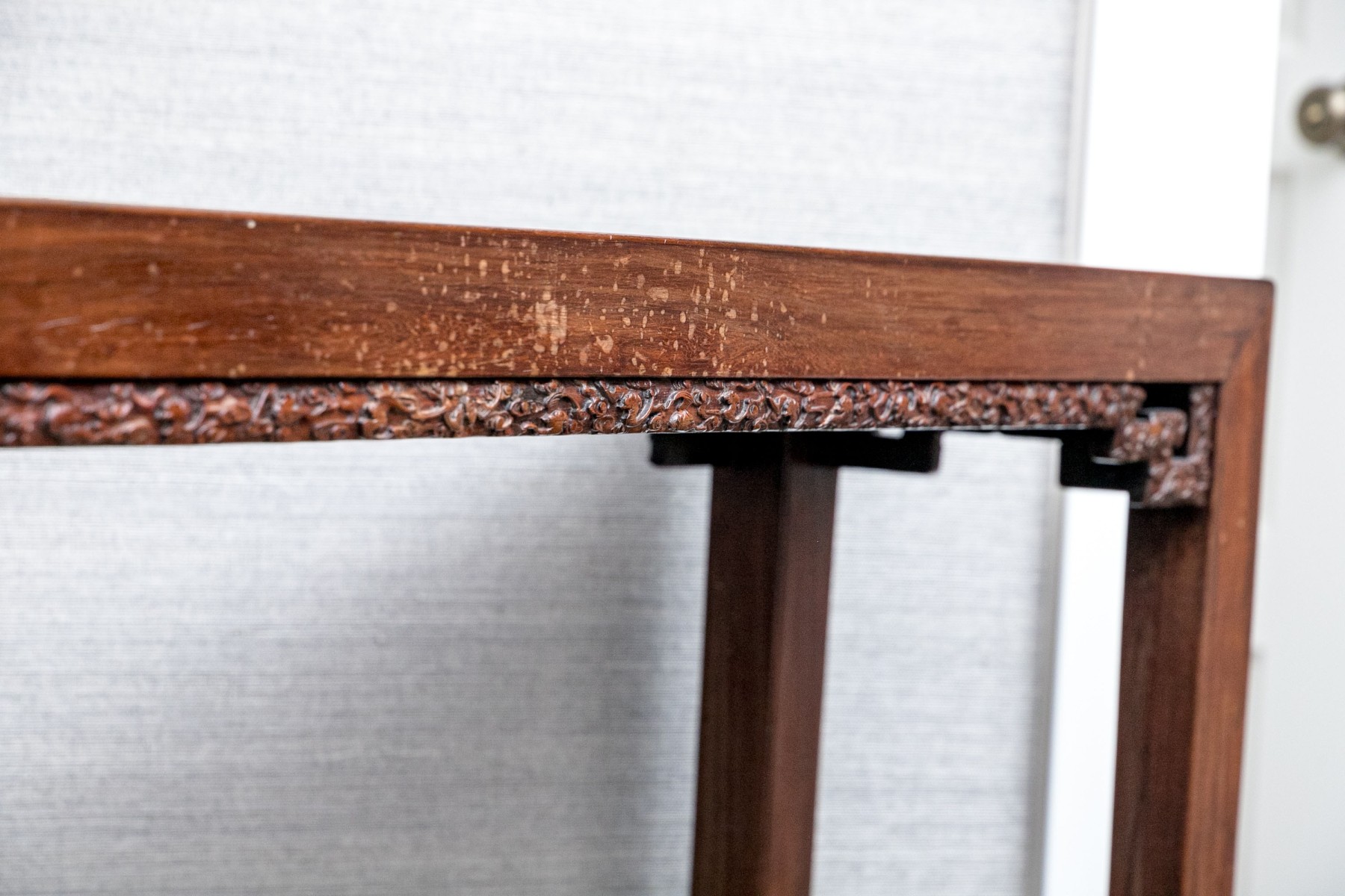On four carved legs with hoof form feet. The slender table has four square legs supporting the rectangular top. There is a wonderfully carved trim band to either side under the table top with openwork brackets between the legs and table top. There is a thin rectangular panel that is inset with texture.