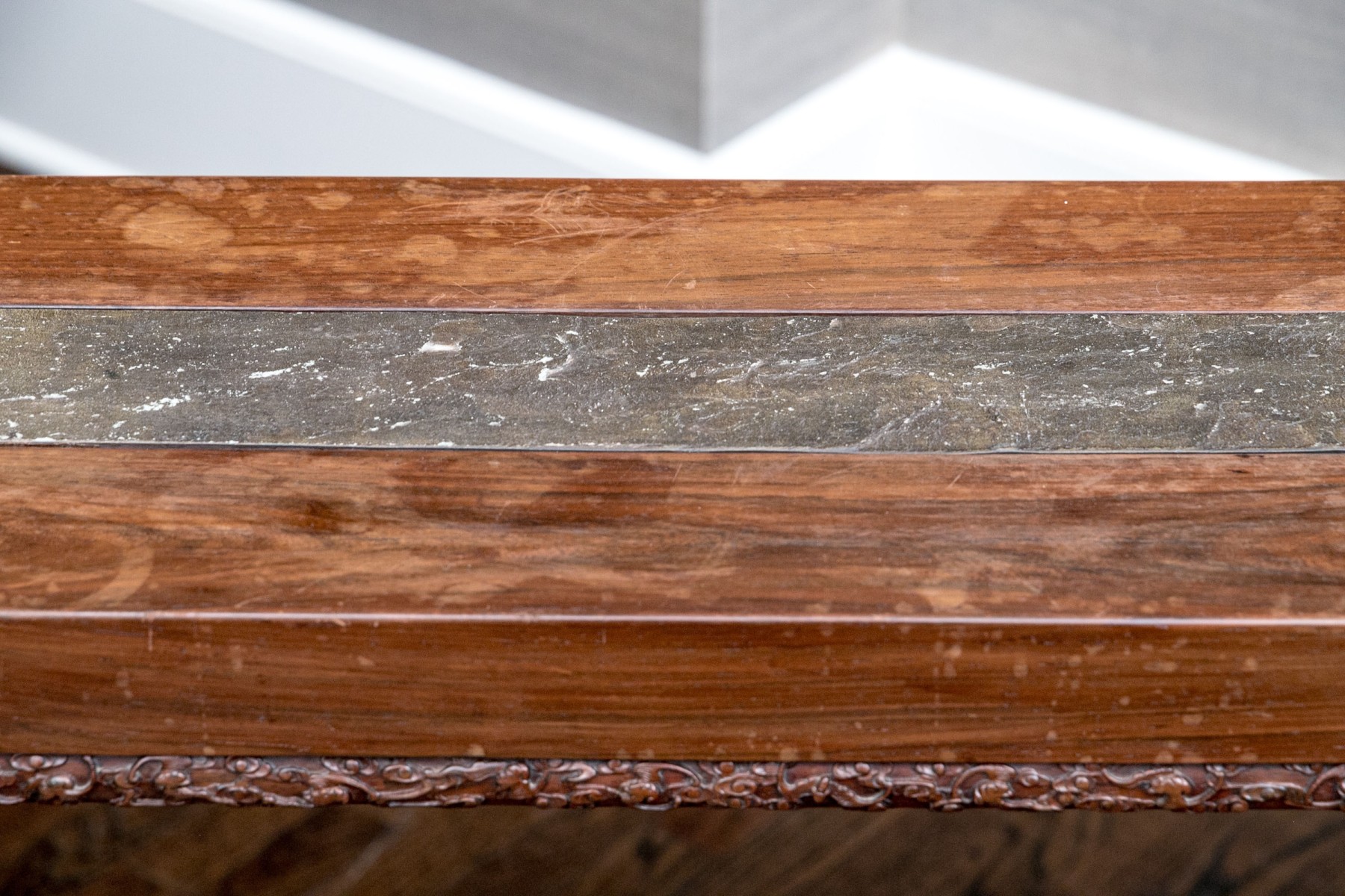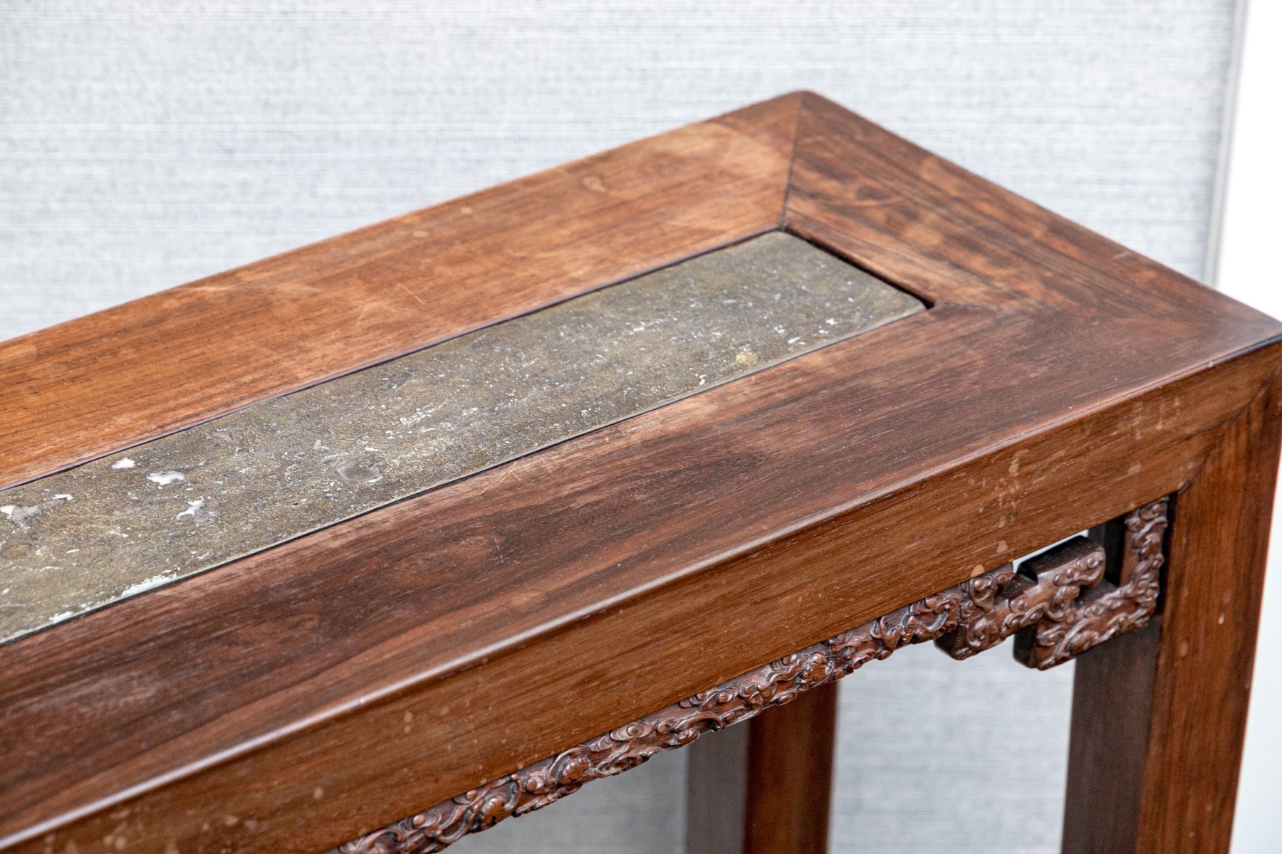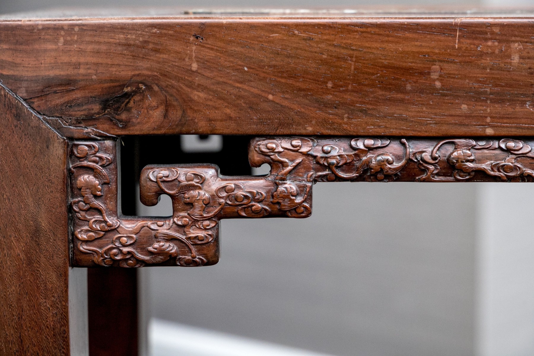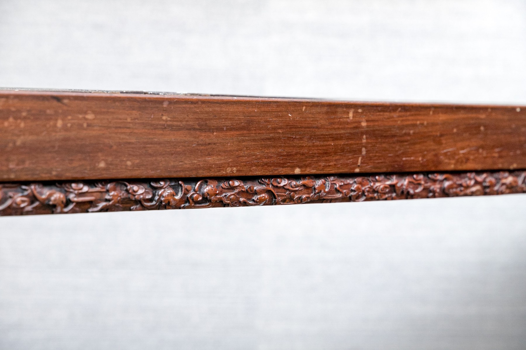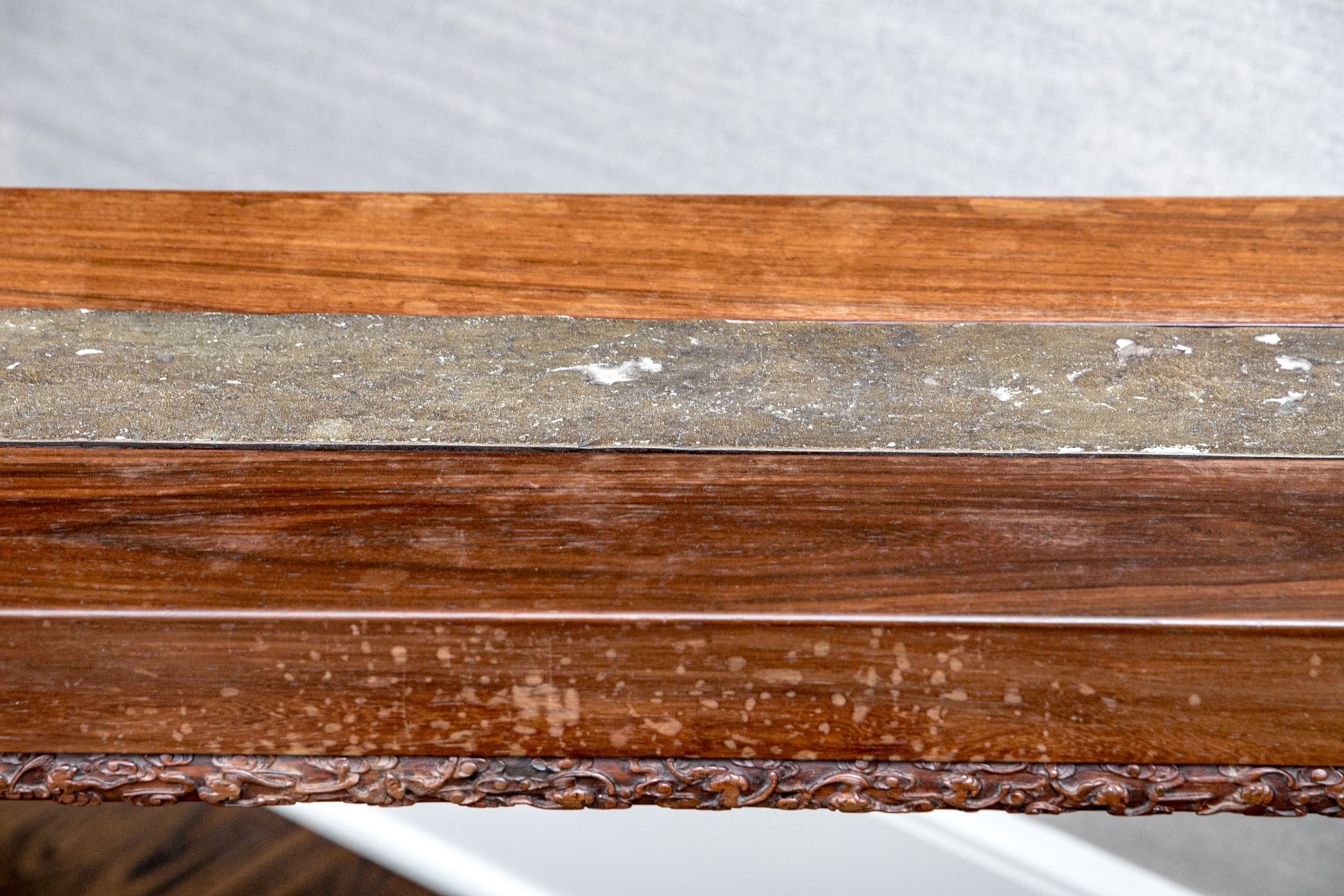 On four carved legs with hoof form feet. The slender table has four square legs supporting the rectangular top. There is a wonderfully carved trim band to either side under the table top with openwork brackets between the legs and table top. There is a thin rectangular panel that is inset with texture.