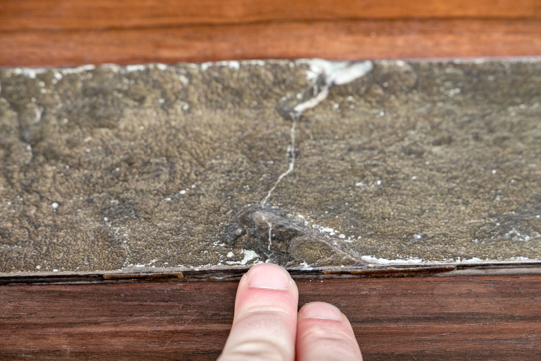 The top is stained and the inlaid panel appears to have chips and a crack to center. Finish on top is rough, should be refinished.