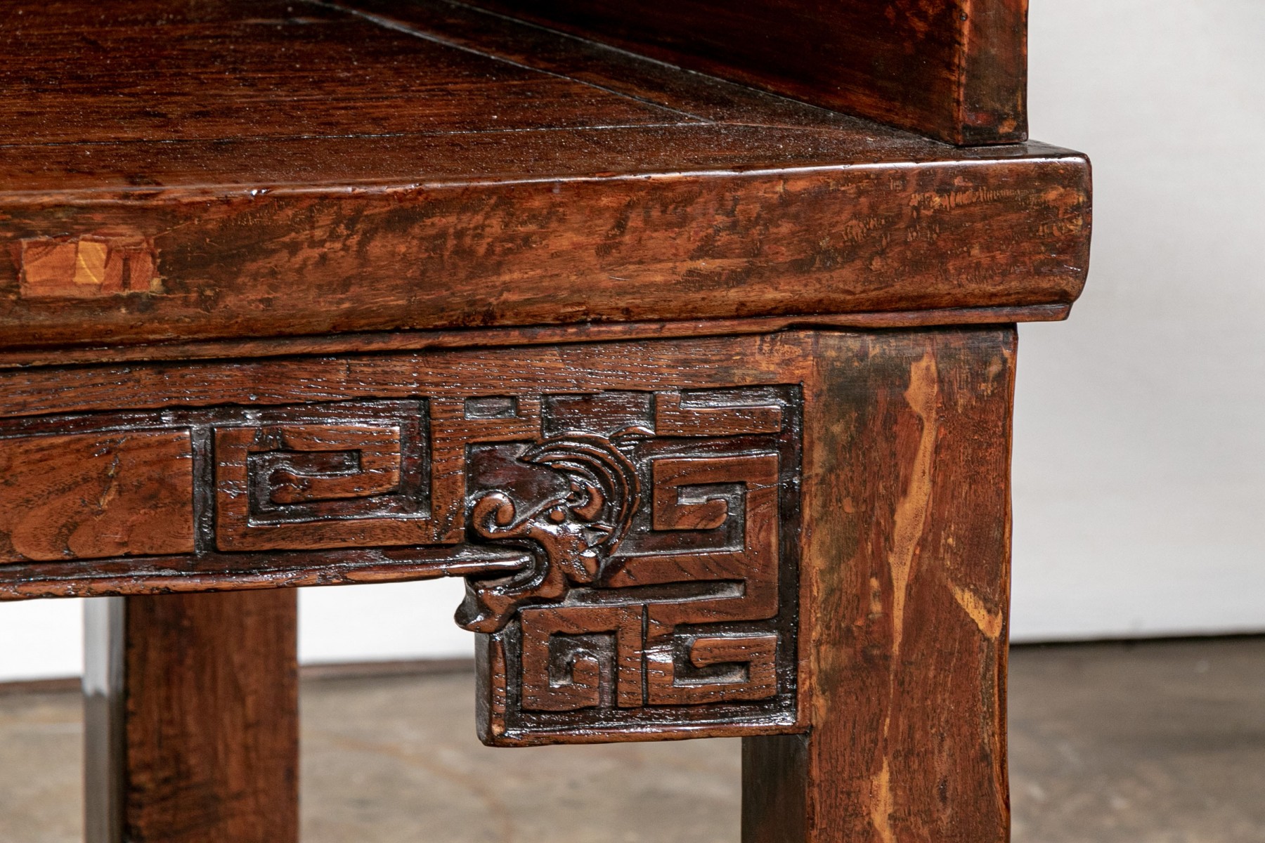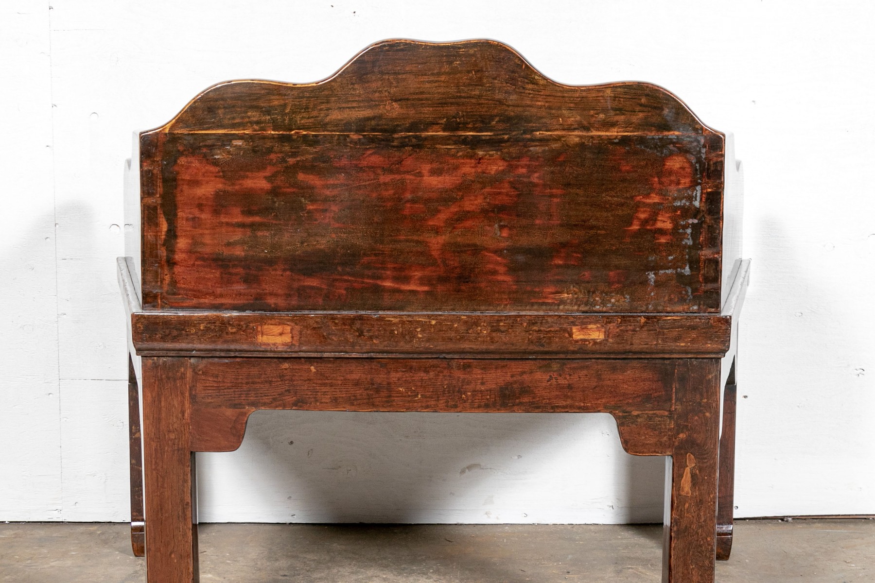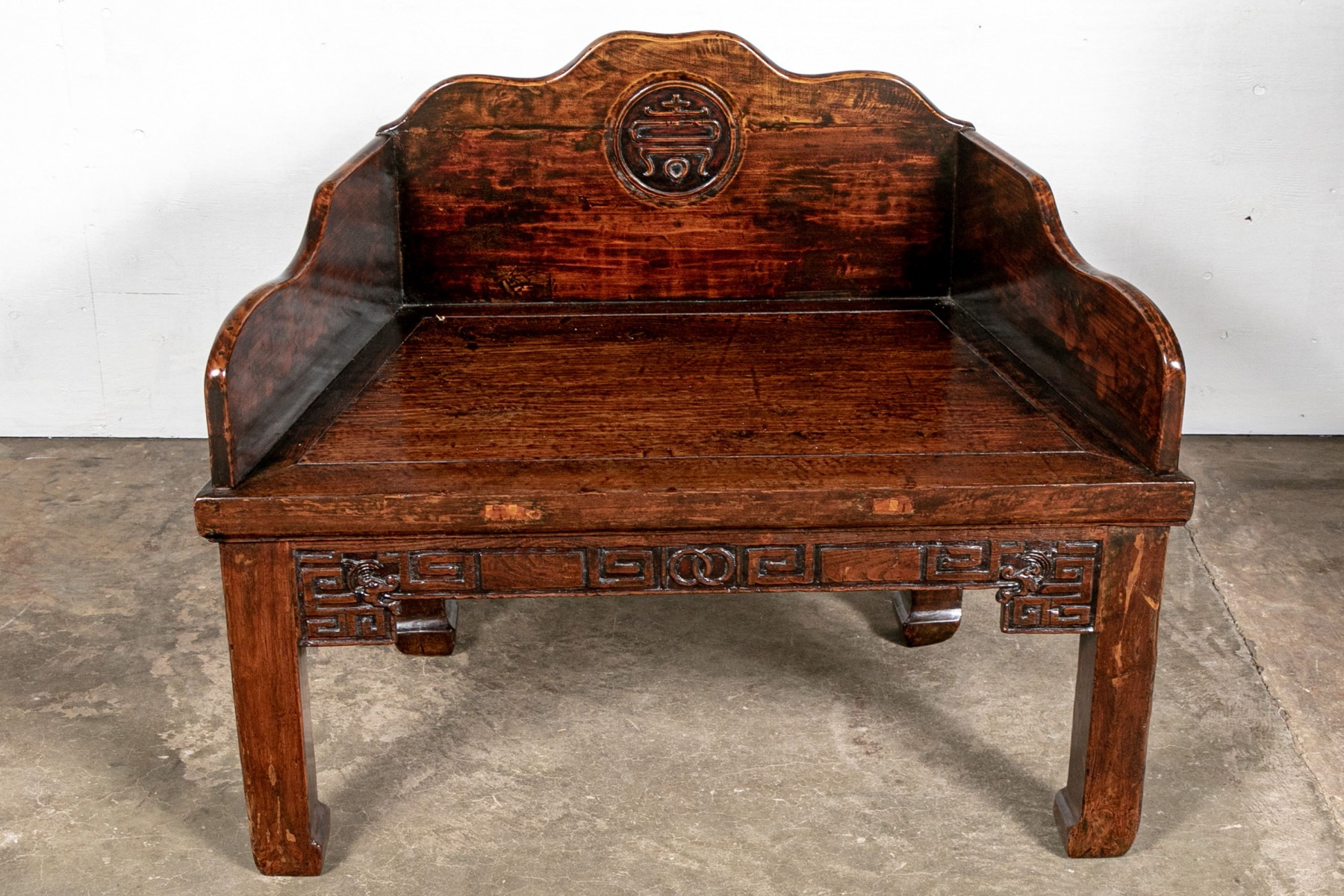 A deep angular sided carved bench with carved serpentine crest rail and sides. The crest with a carved medallion. Raised on a carved shaped skirt rail with geometric motifs, the square legs with curved feet. In a high polish.