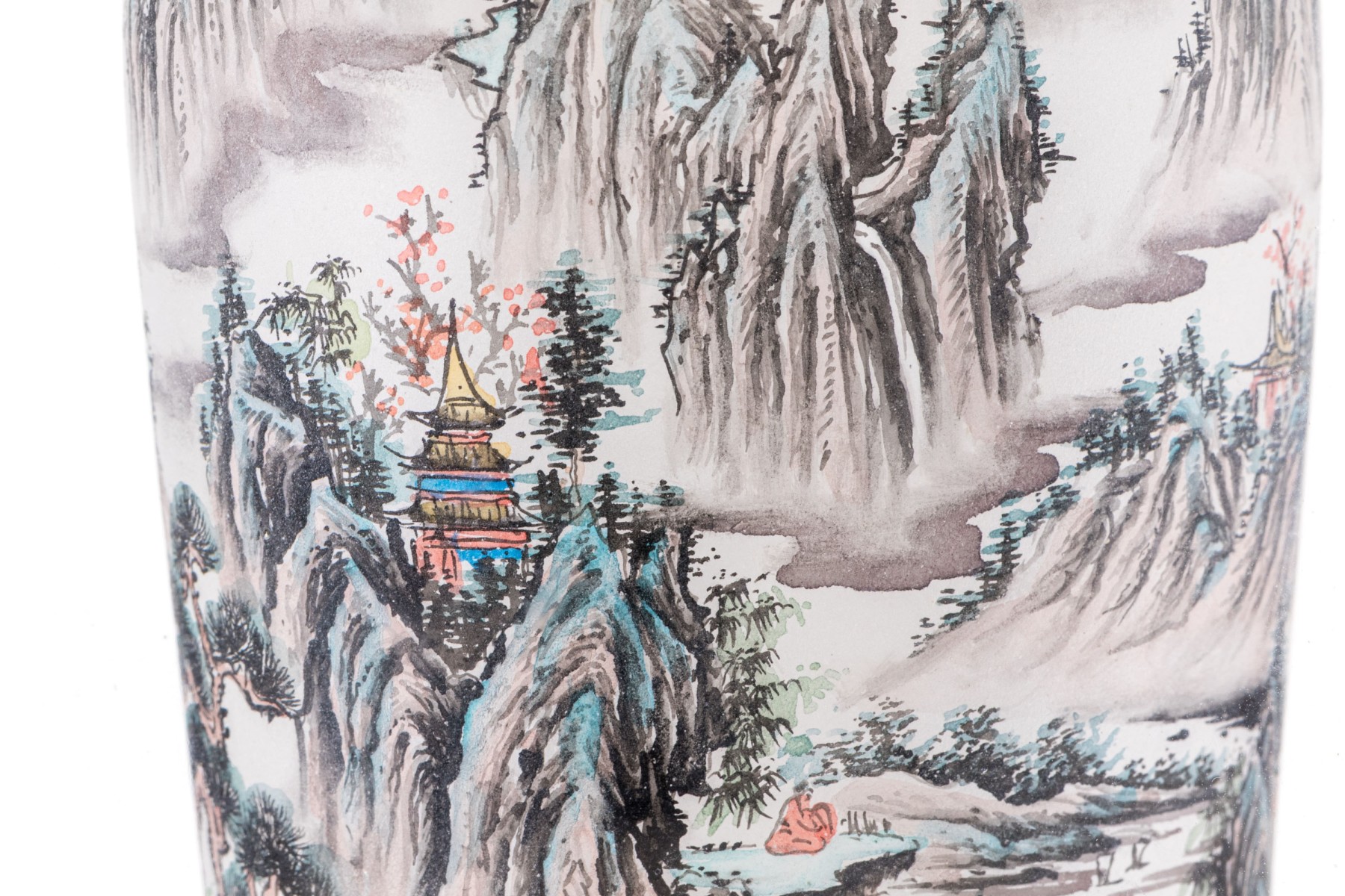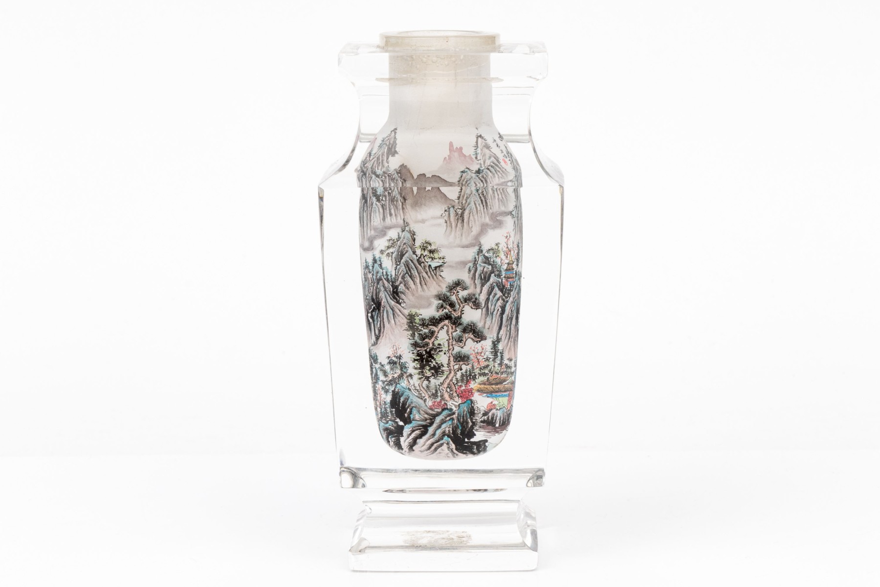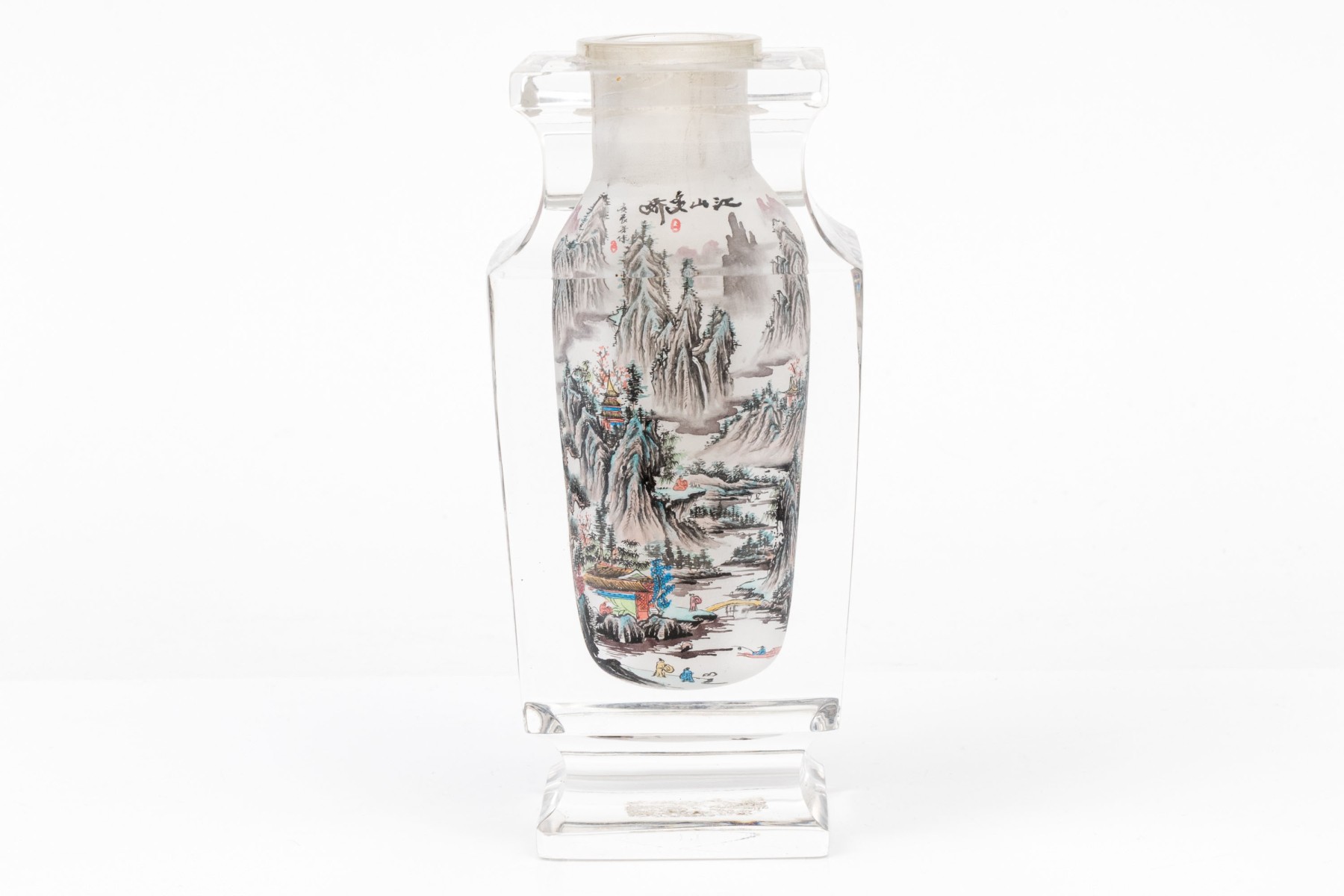 A small cased glass jar decorated with Ann elaborate mountain river landscape with pine trees and flowering trees. There is a small house, a bridge and a boat a long with figures. With a character inscription and red stamps on the vase shoulder. The vase is encased within a plexiglass mount. Lacking a lid.