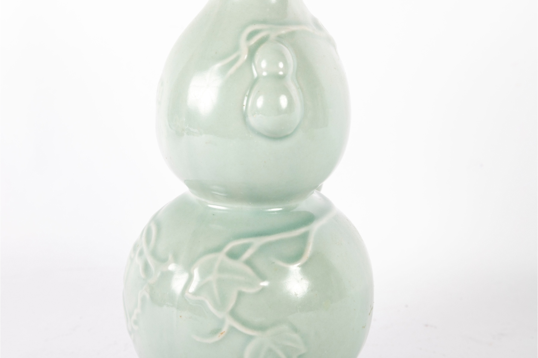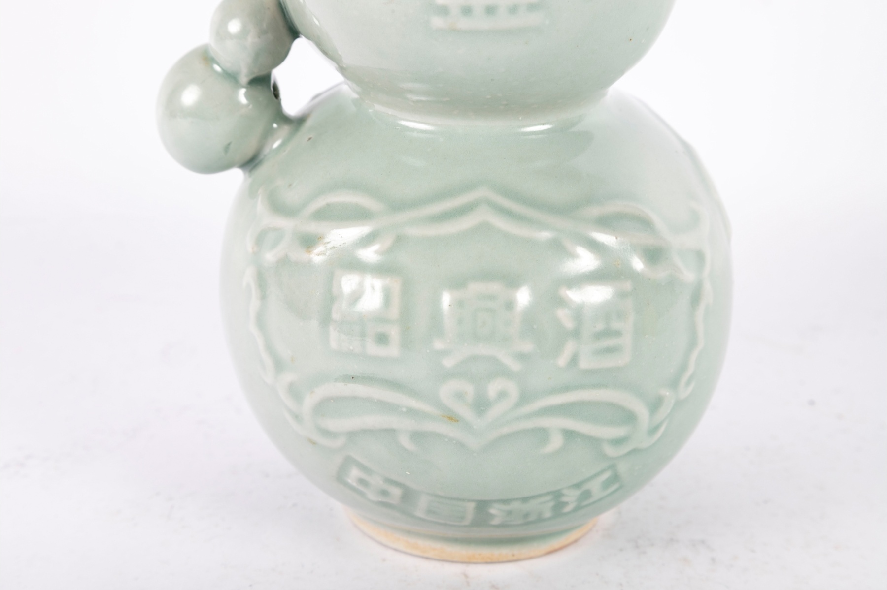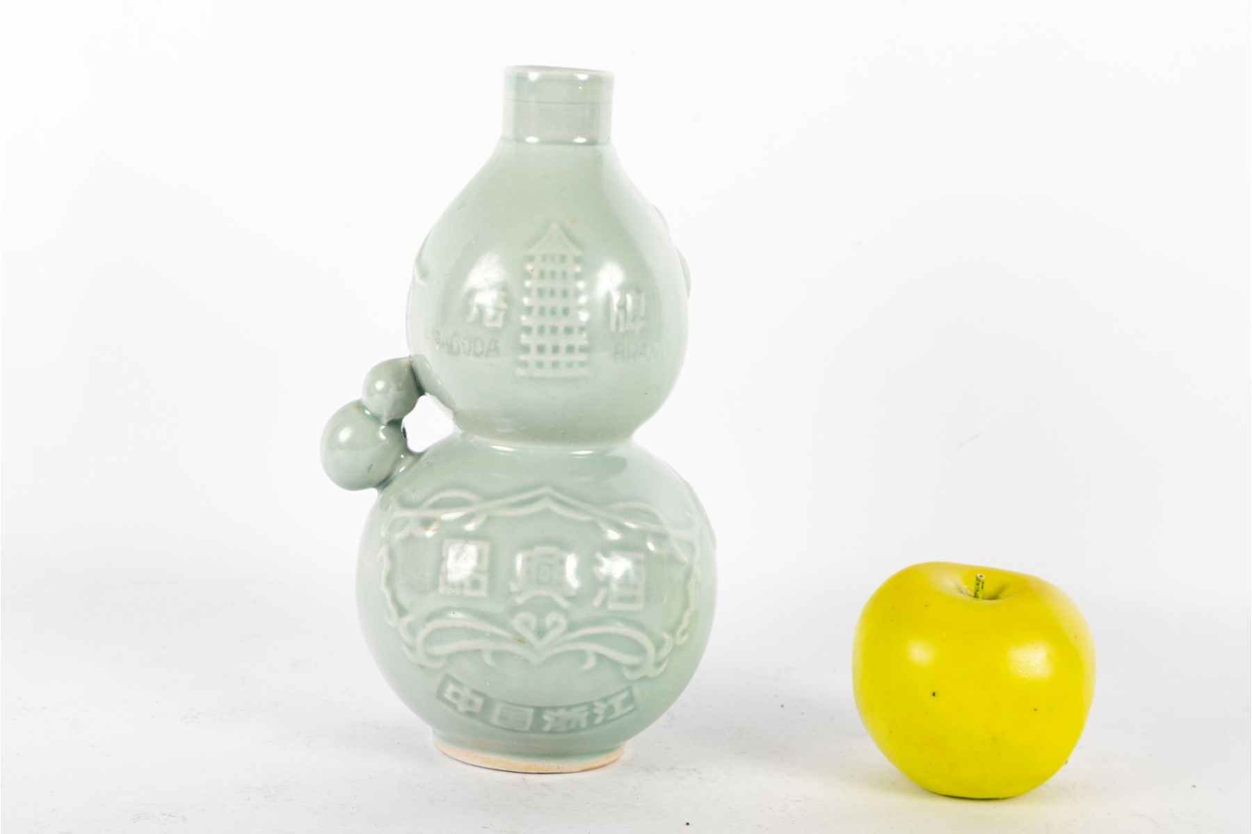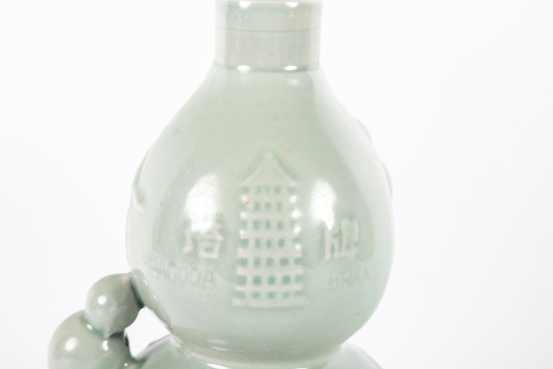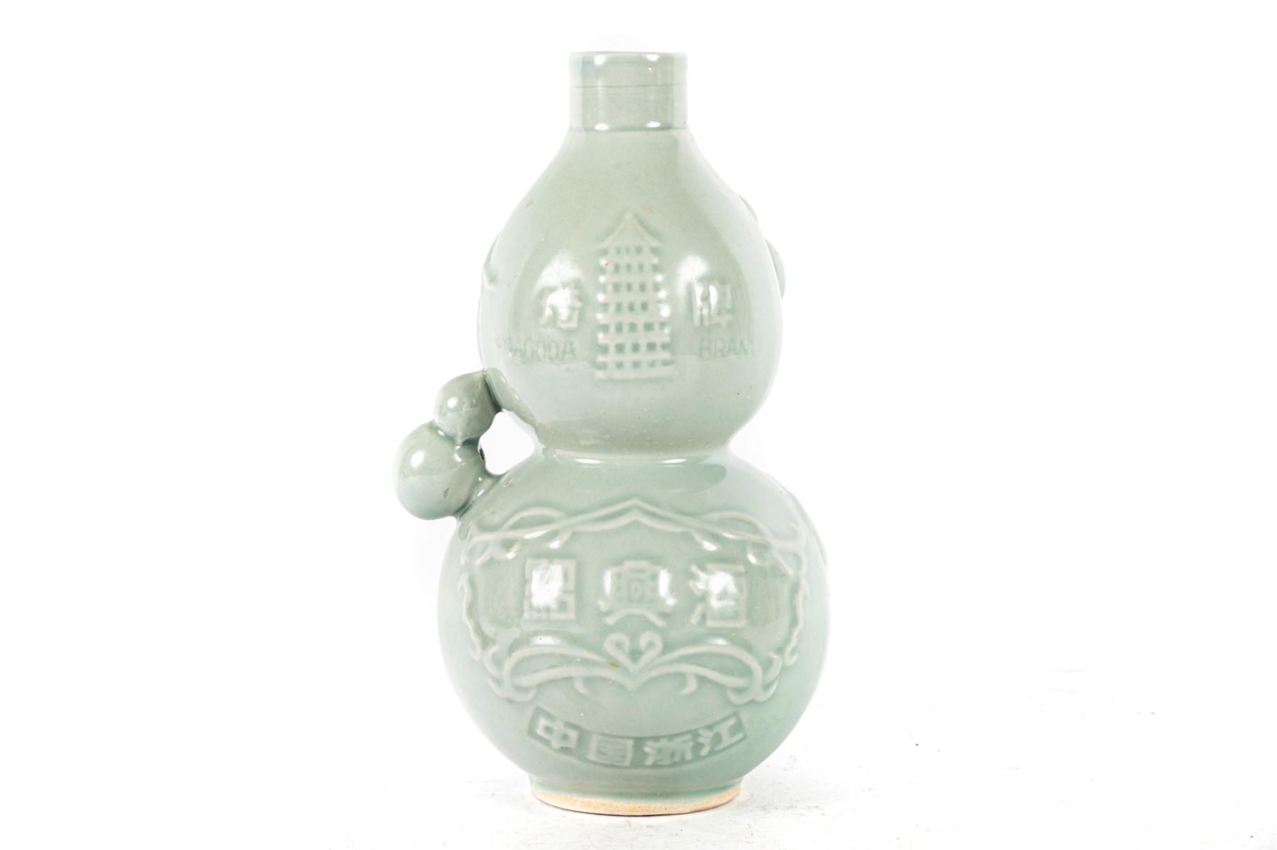 A Chinese celadon-glazed porcelain rice wine bottle in a double gourd form, featuring embossed vine and gourd motifs along the body and raised Chinese characters to the front reading “Pagoda Brand.” The soft green glaze showcases a traditional celadon tone with subtle crackle and a smooth glossy finish.
