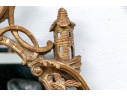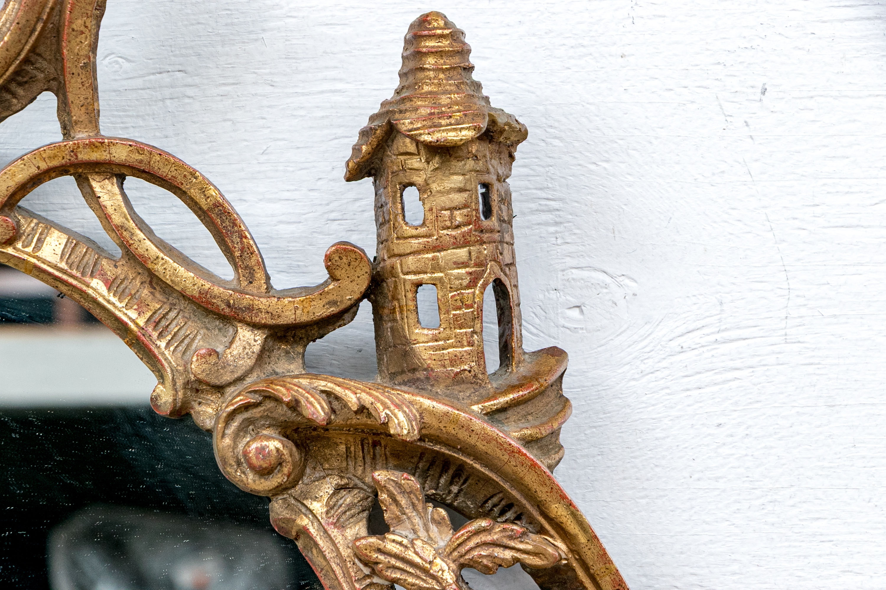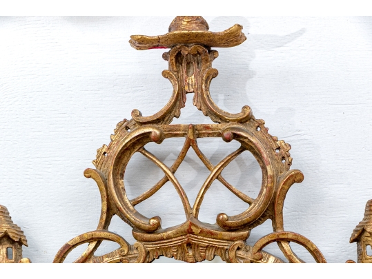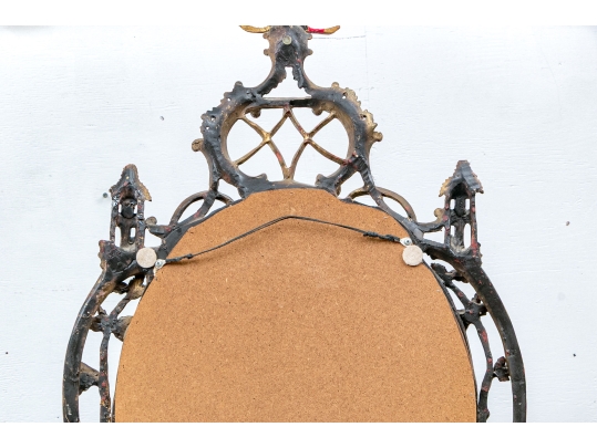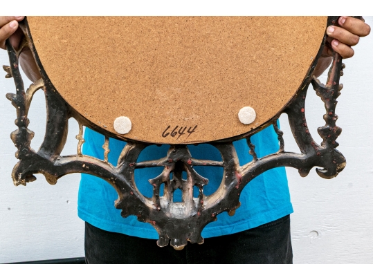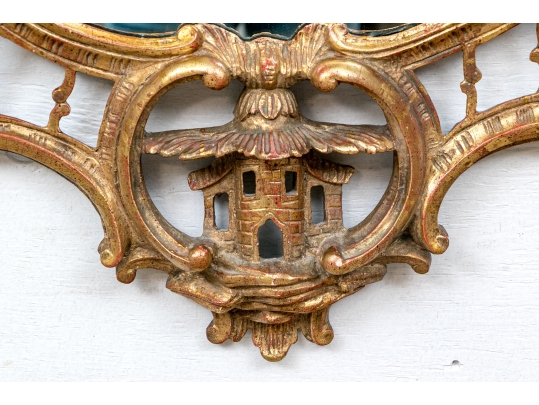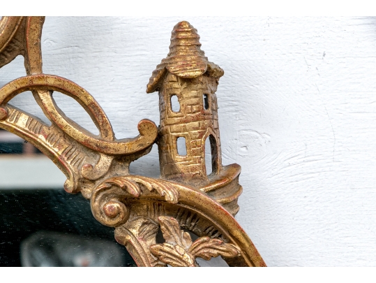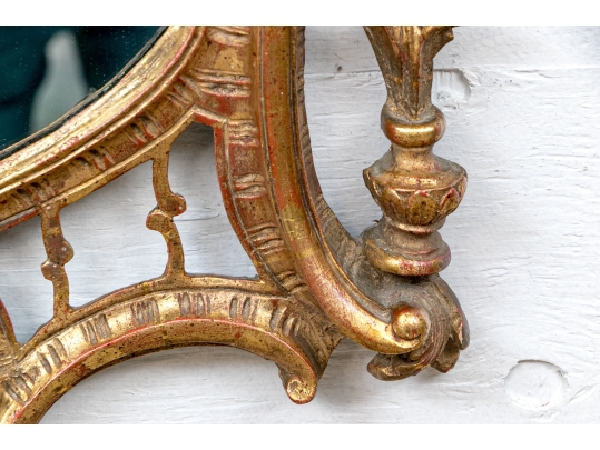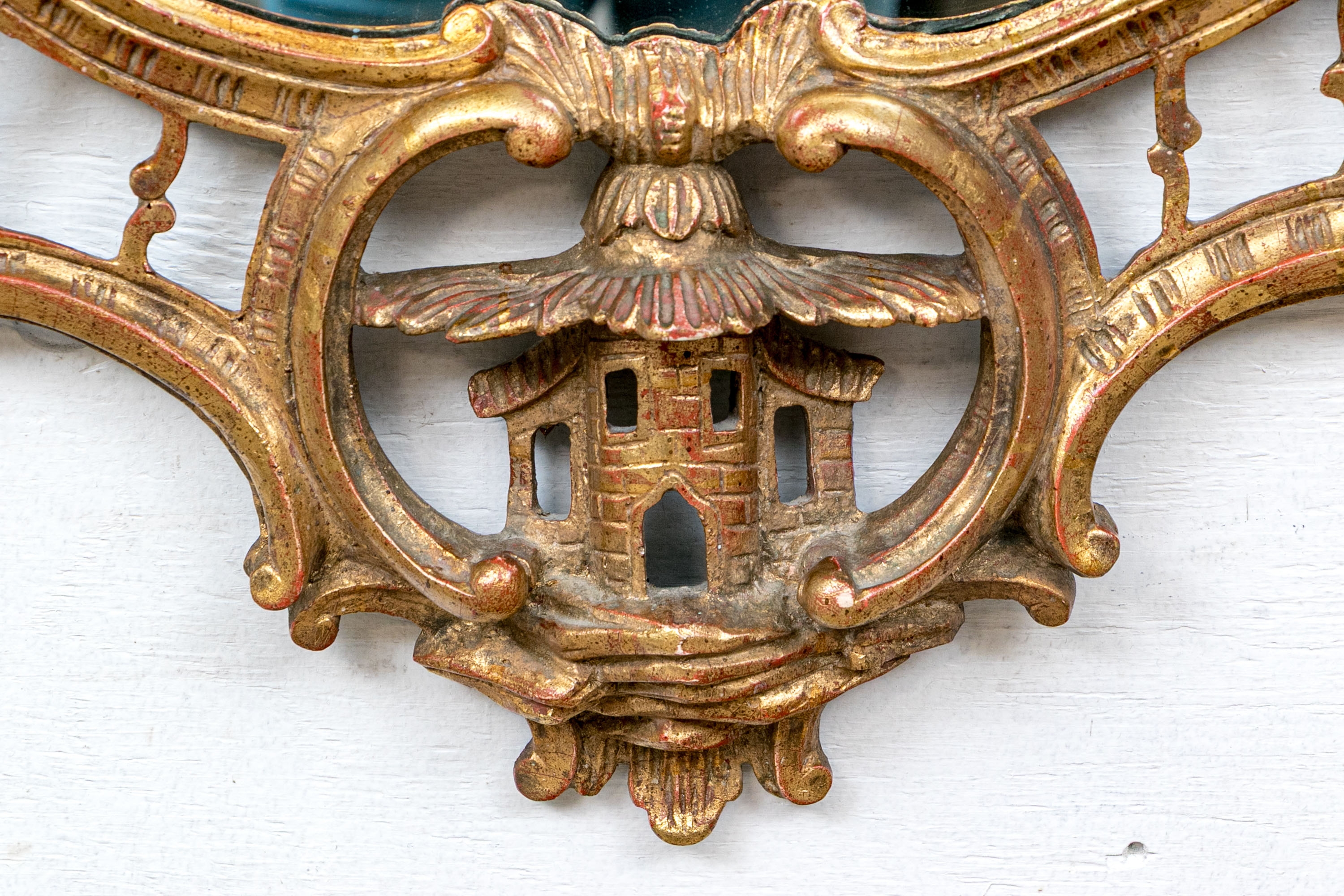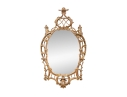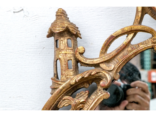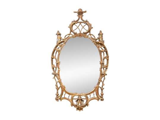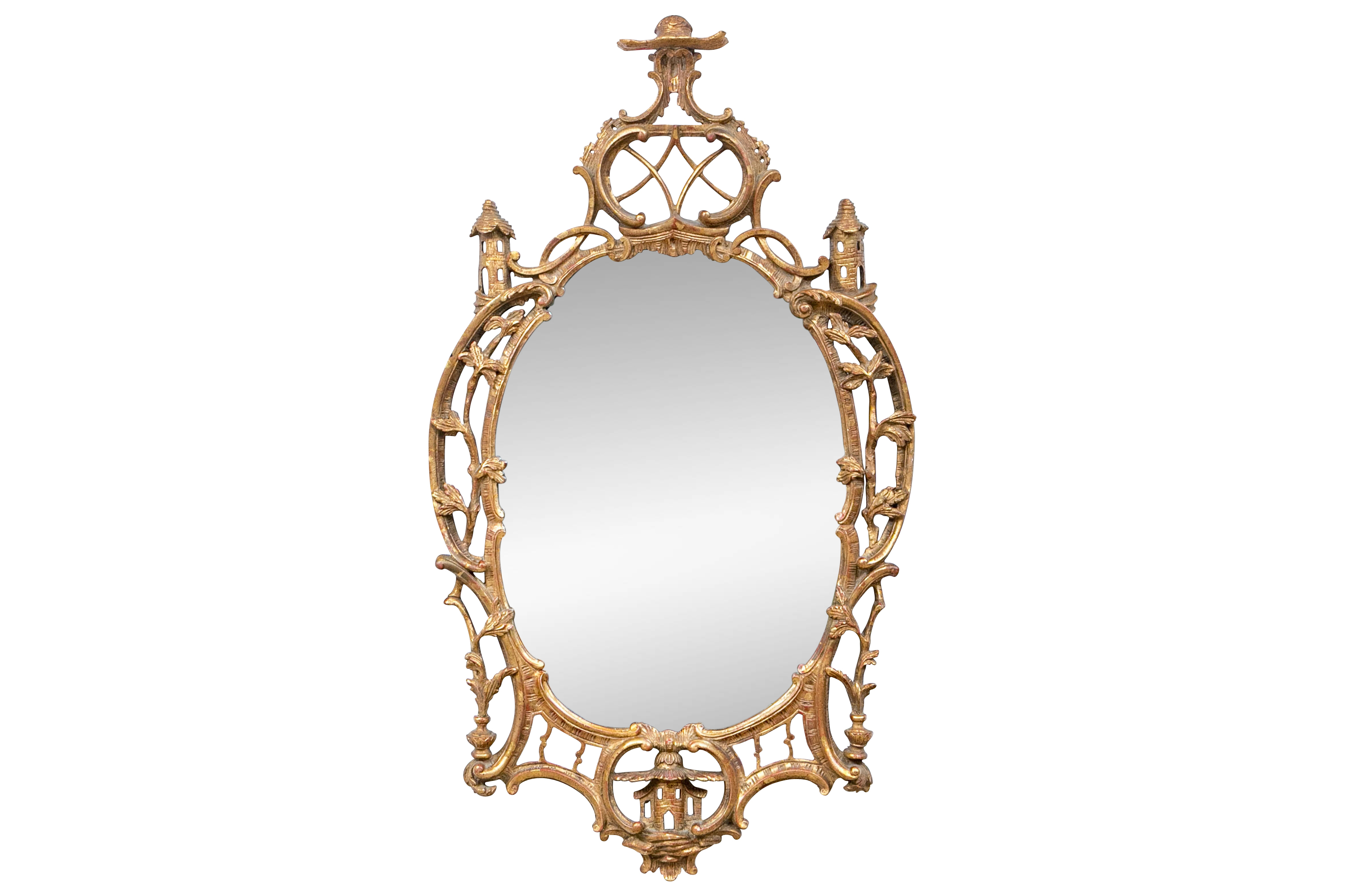 It features an oval frame topped with a pagoda-shaped cresting, supported by rocaille scrolls and pagoda finials. The sides are decorated with carvings of trailing vines and pierced rocaille ornament, with similar decorations at the base.