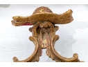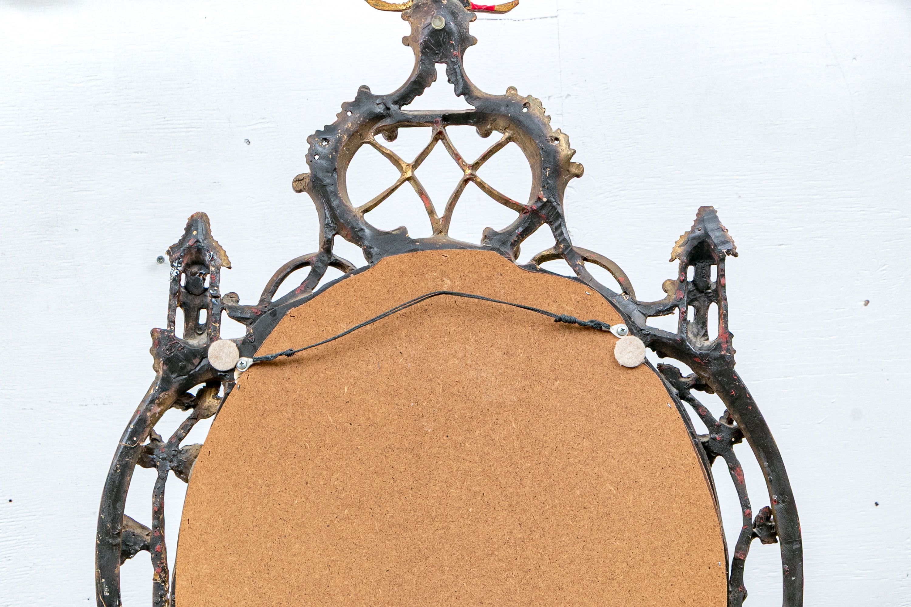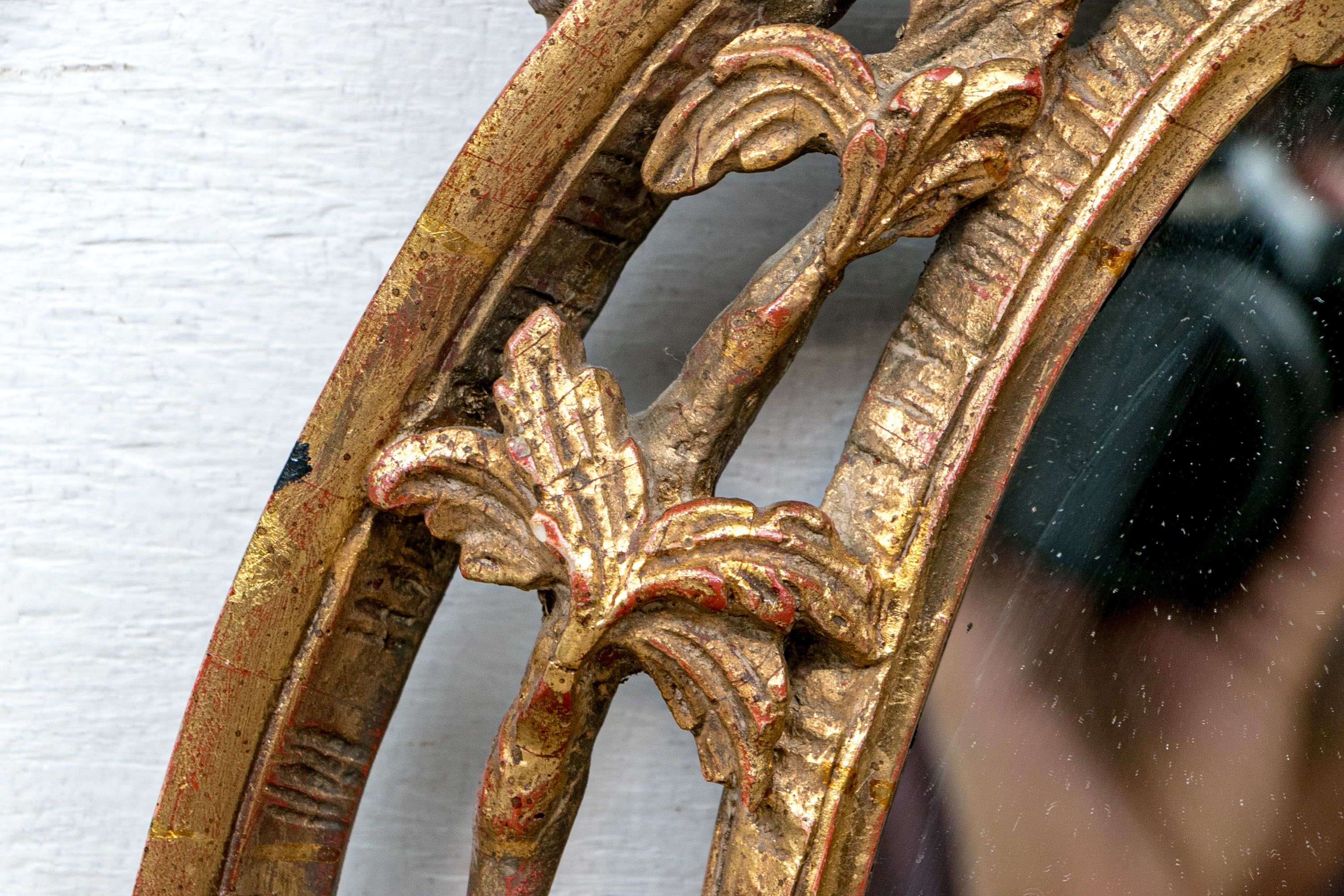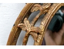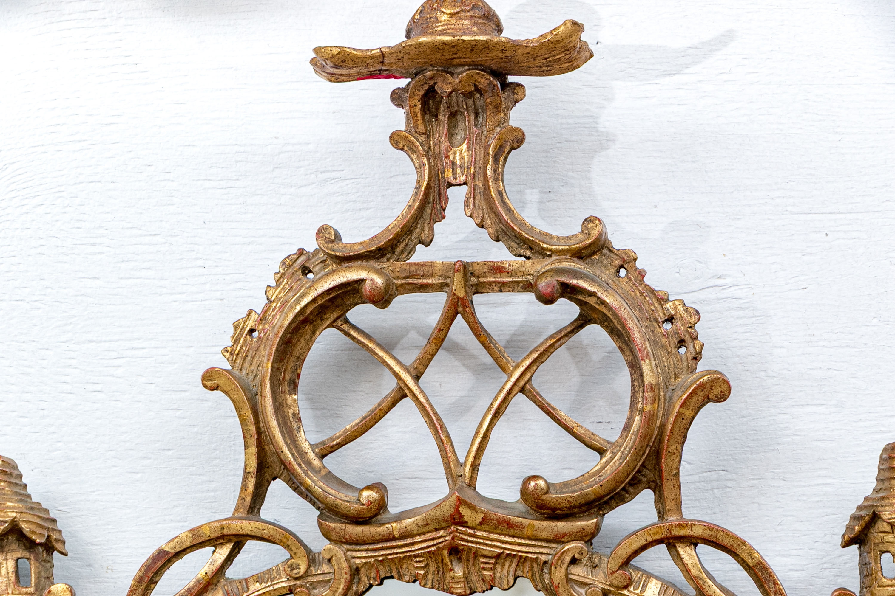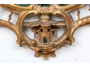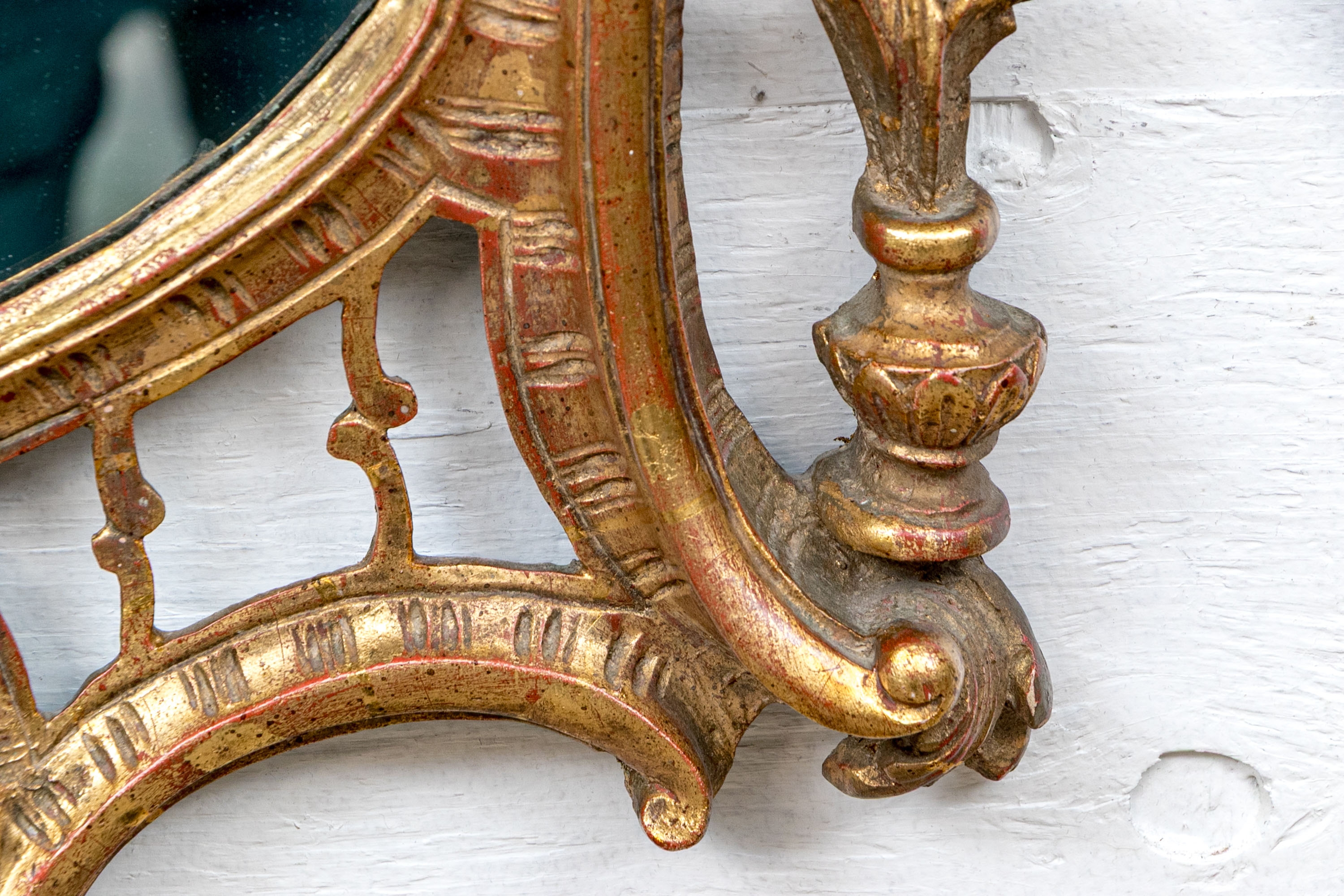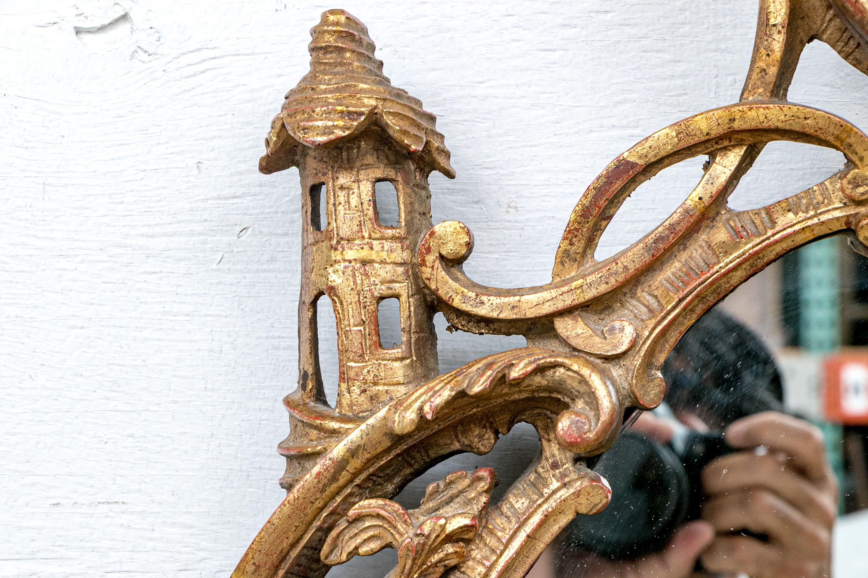 It features an oval frame topped with a pagoda-shaped cresting, supported by rocaille scrolls and pagoda finials. The sides are decorated with carvings of trailing vines and pierced rocaille ornament, with similar decorations at the base.