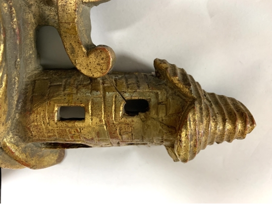 Condition: Please see detail photos. Various signs of age include a split/repair at crest as shown. Old repair of right side pagoda mentioned for accuracy as the presentation is exceptional.