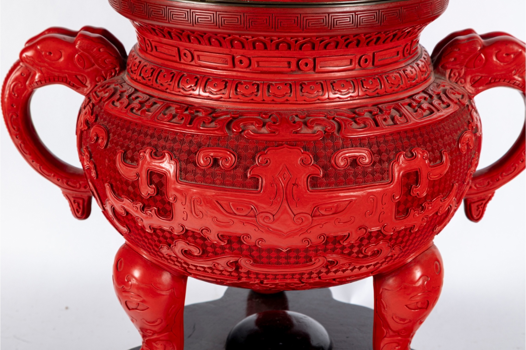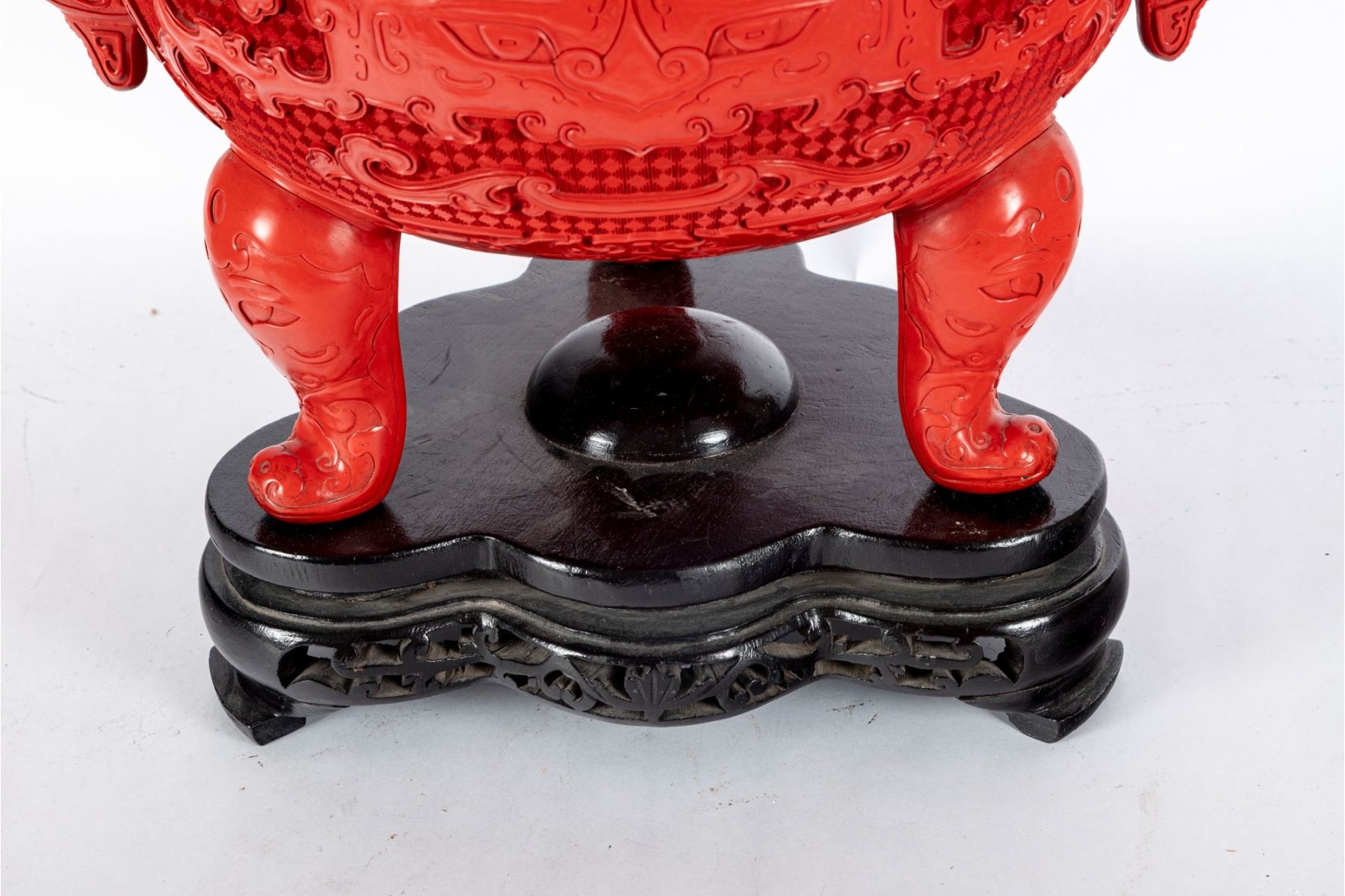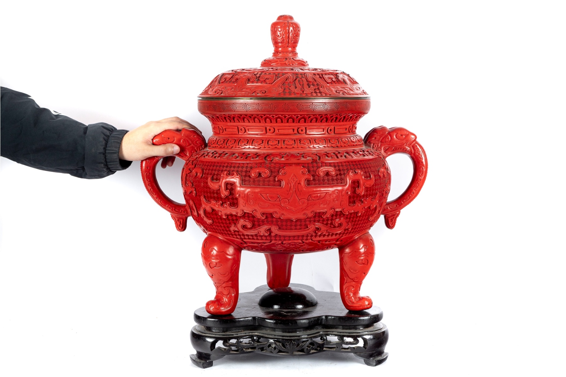 Impressive red cinnabar lacquer lidded censer featuring deeply carved geometric and stylized dragon motifs in relief, twin handles, and raised tripod legs. The domed lid is surmounted by a carved finial, and the piece rests on a black carved wood stand.