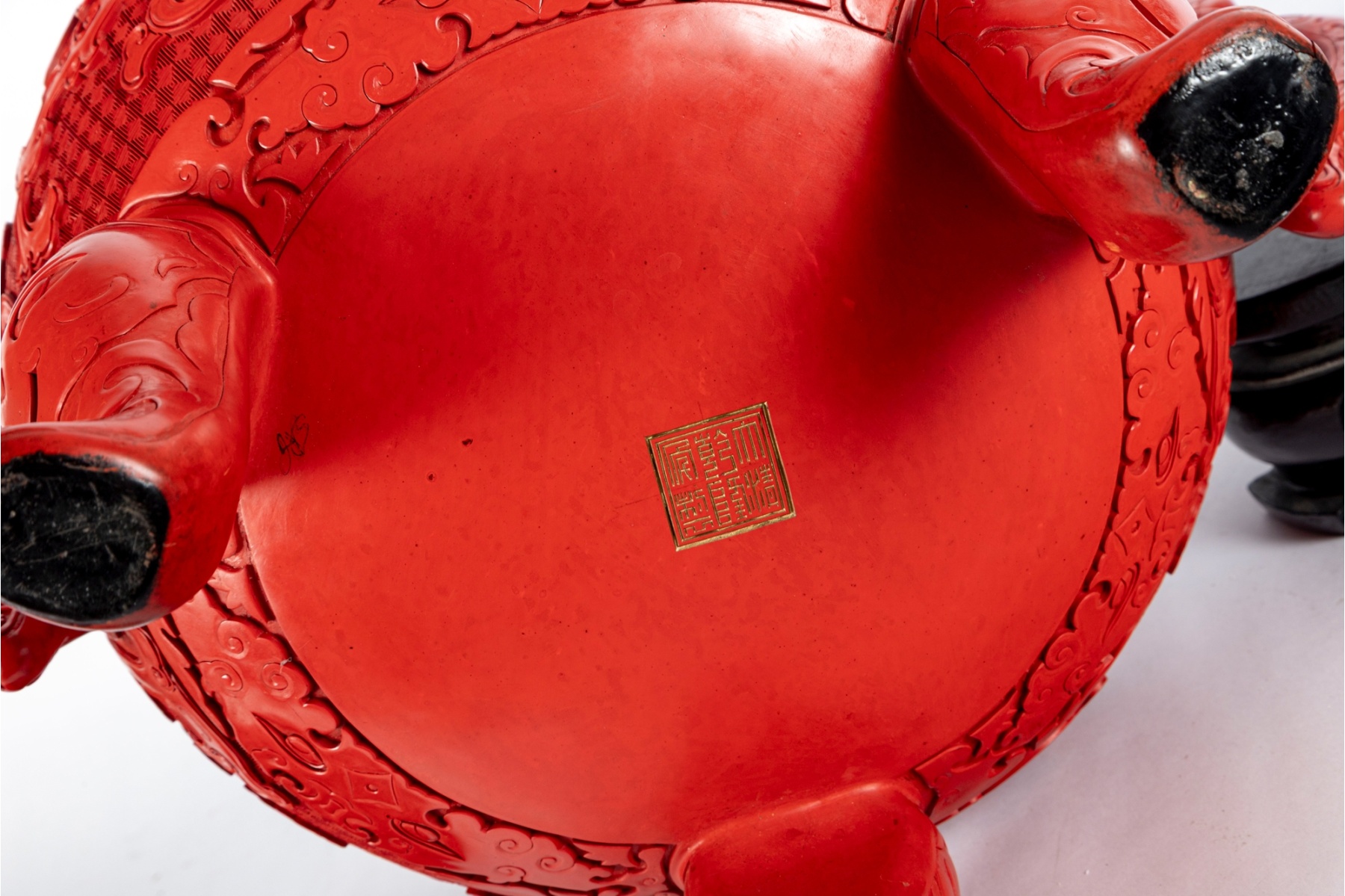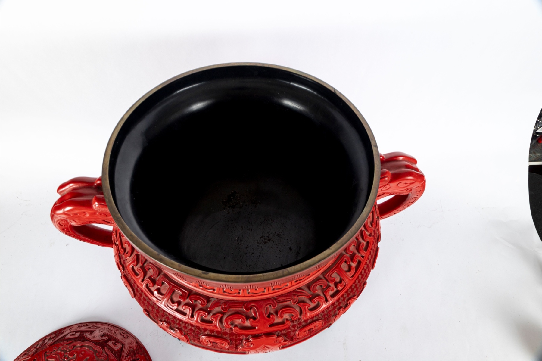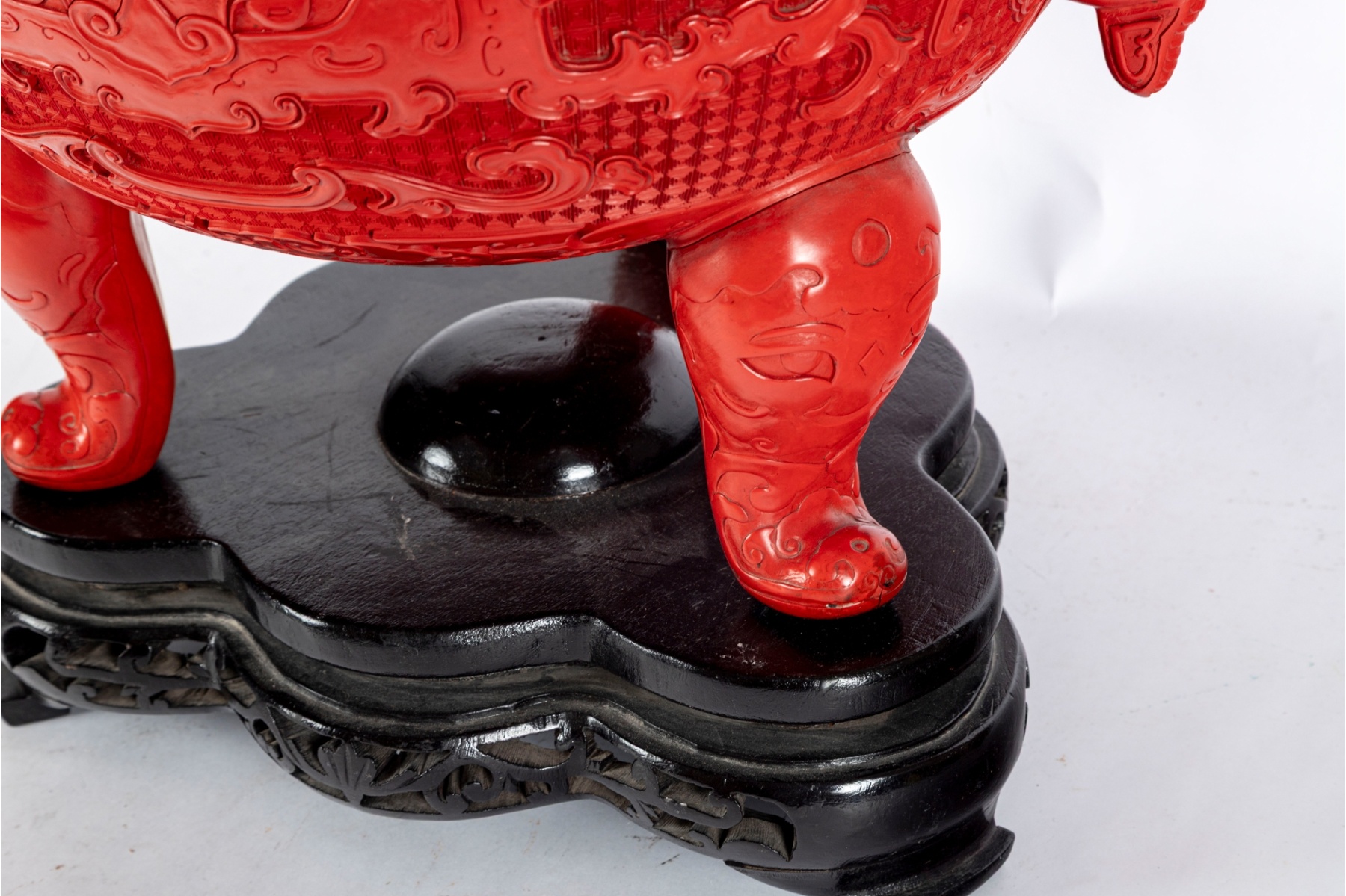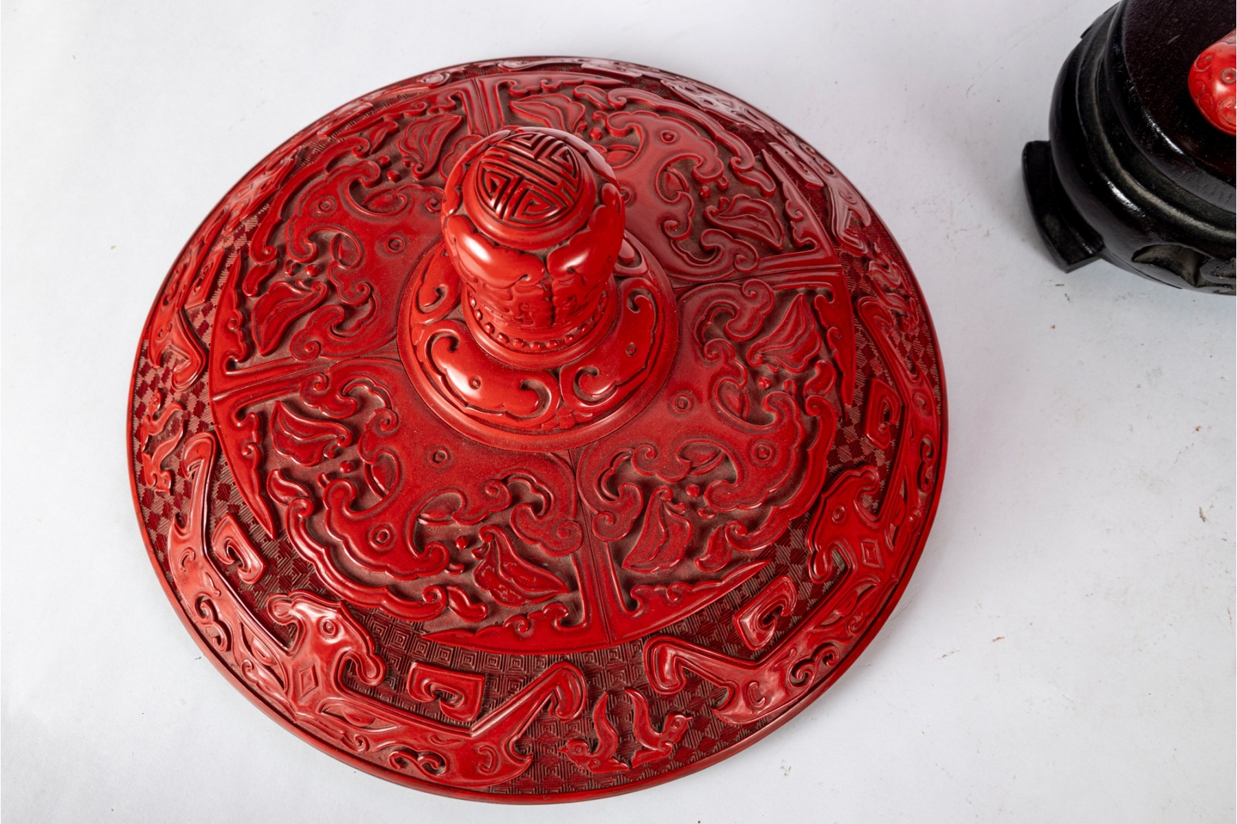 Impressive red cinnabar lacquer lidded censer featuring deeply carved geometric and stylized dragon motifs in relief, twin handles, and raised tripod legs. The domed lid is surmounted by a carved finial, and the piece rests on a black carved wood stand.