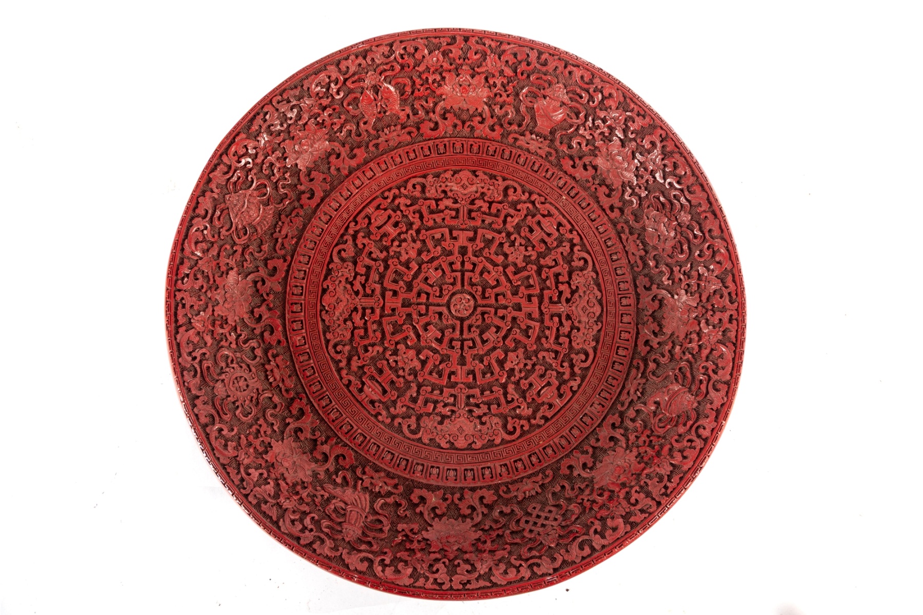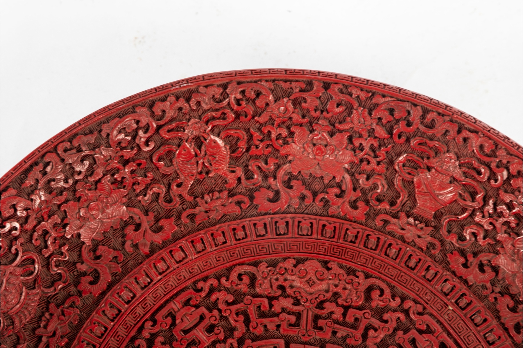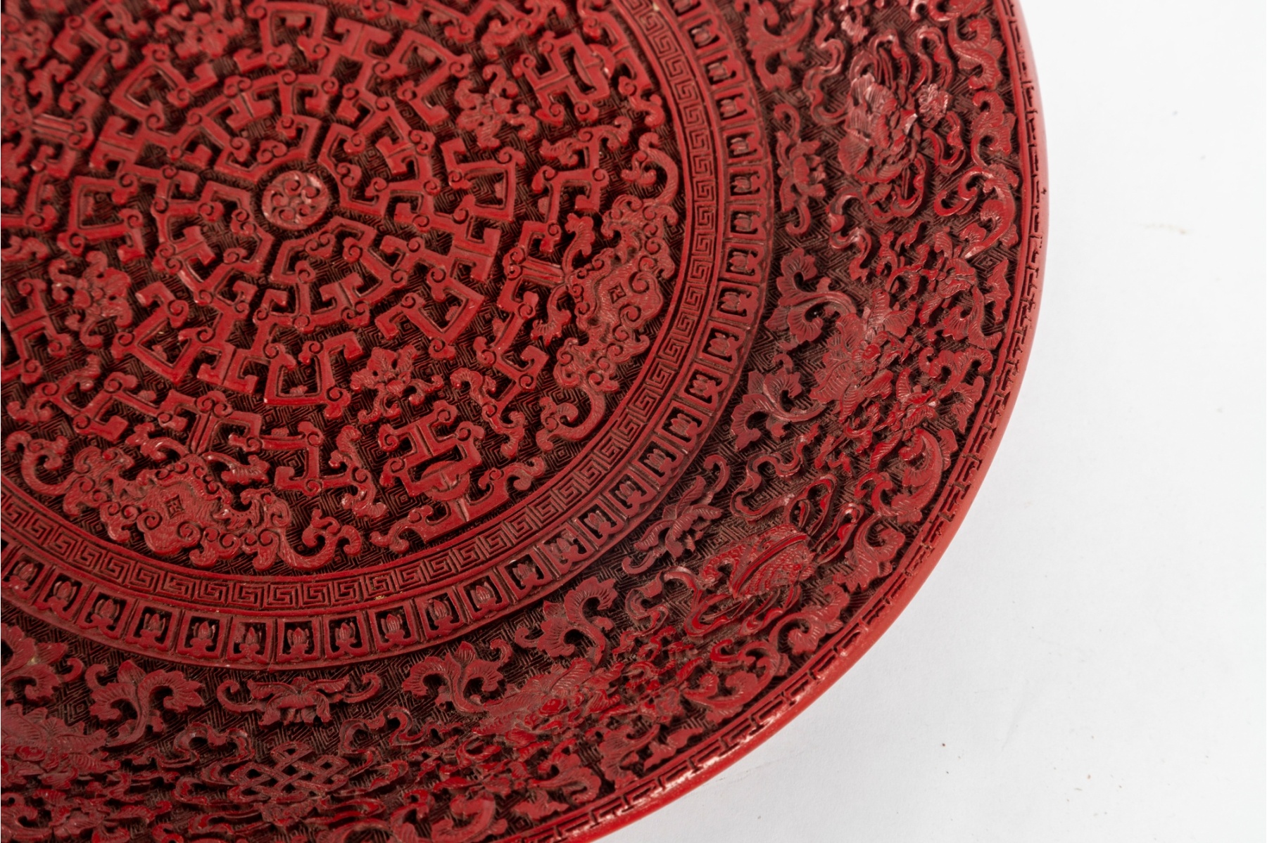 A finely carved vintage Chinese cinnabar lacquer plate featuring an intricate central medallion of geometric motifs surrounded by dragons and floral scrolls in high relief.