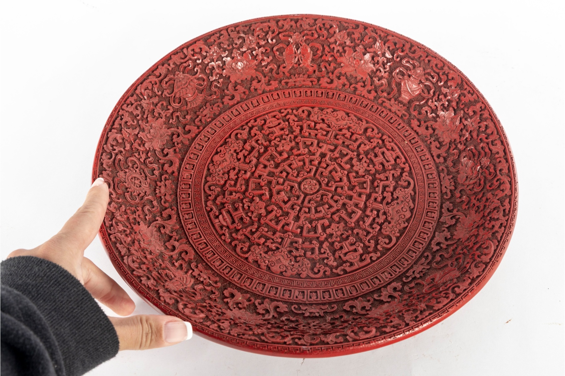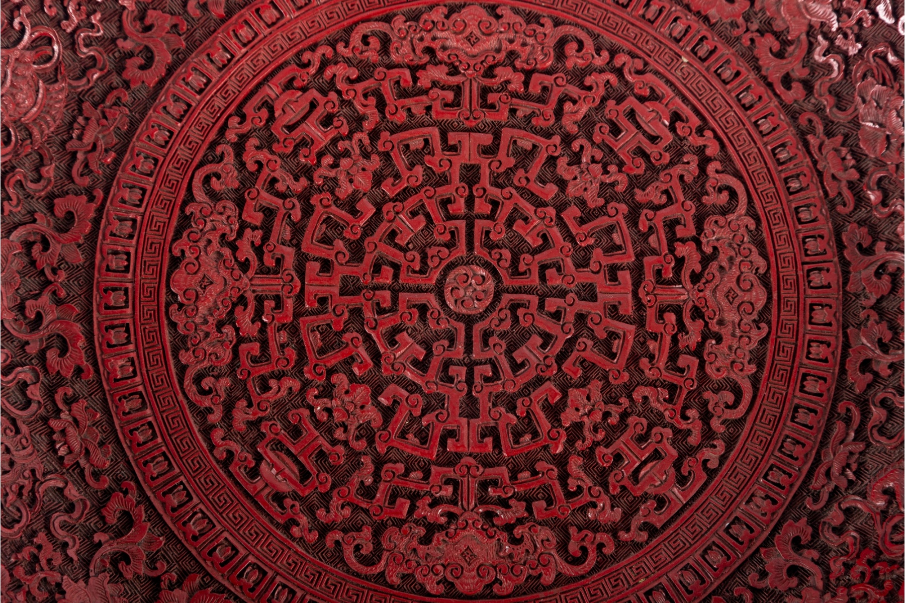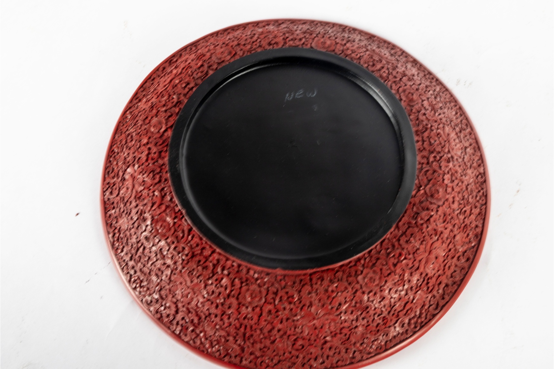 A finely carved vintage Chinese cinnabar lacquer plate featuring an intricate central medallion of geometric motifs surrounded by dragons and floral scrolls in high relief.