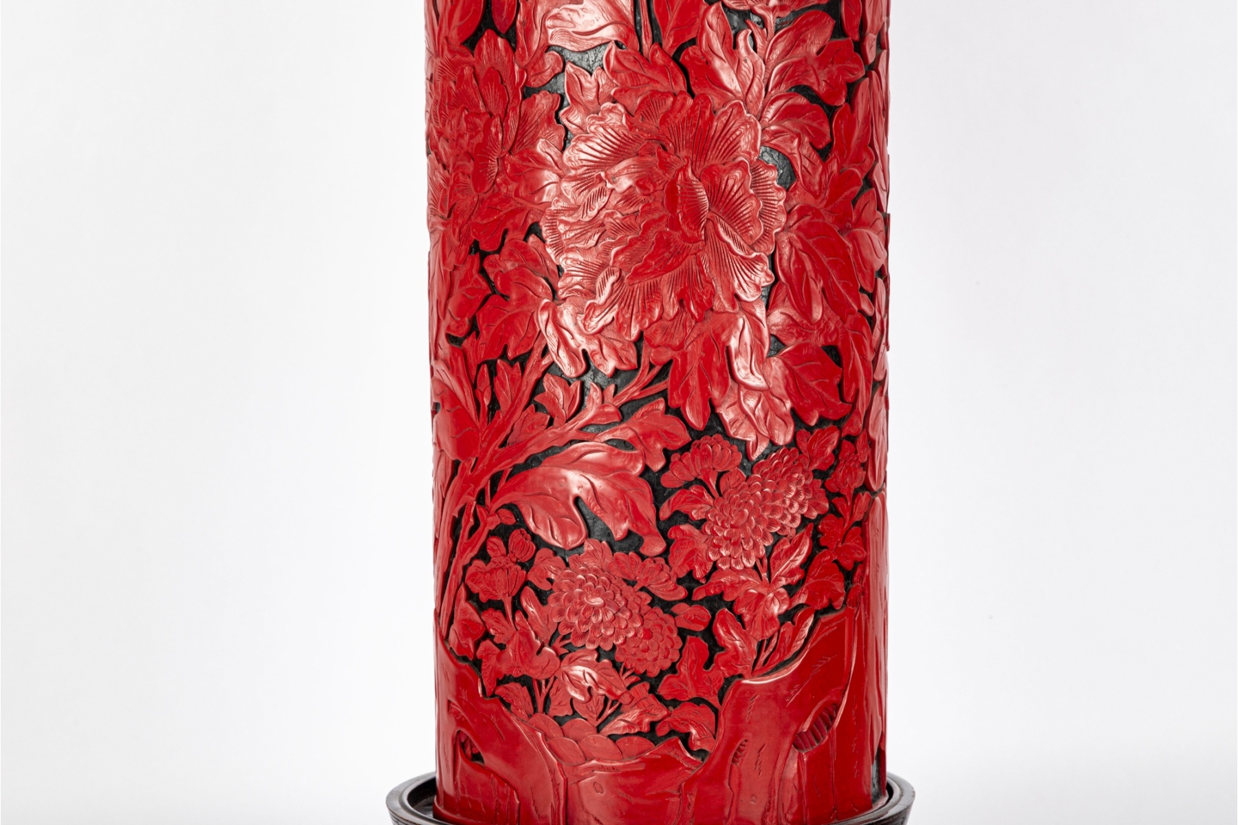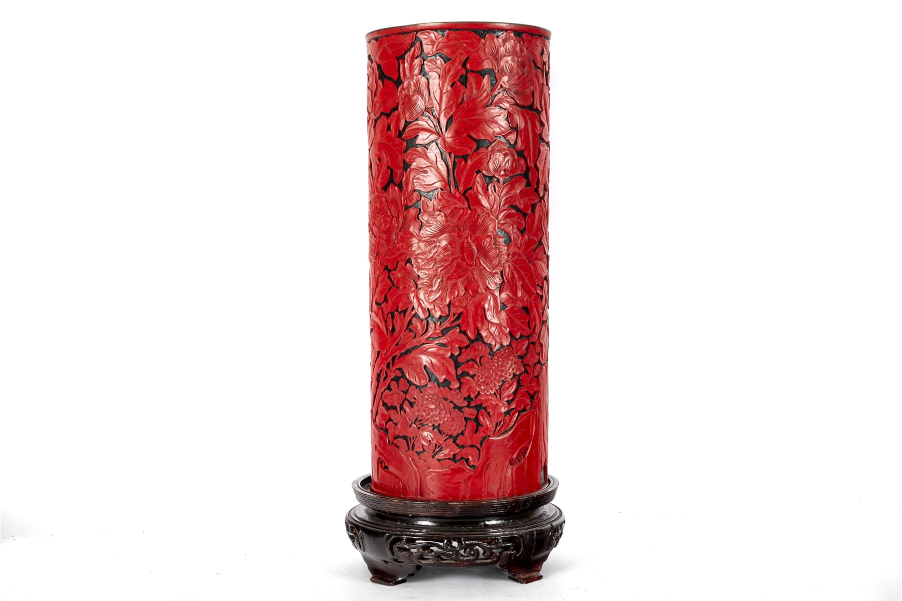 Cylindrical Chinese cinnabar lacquer vase or umbrella stand finely carved in high relief with intricate floral and foliate designs over a black lacquer ground. Mounted on a carved wood base.