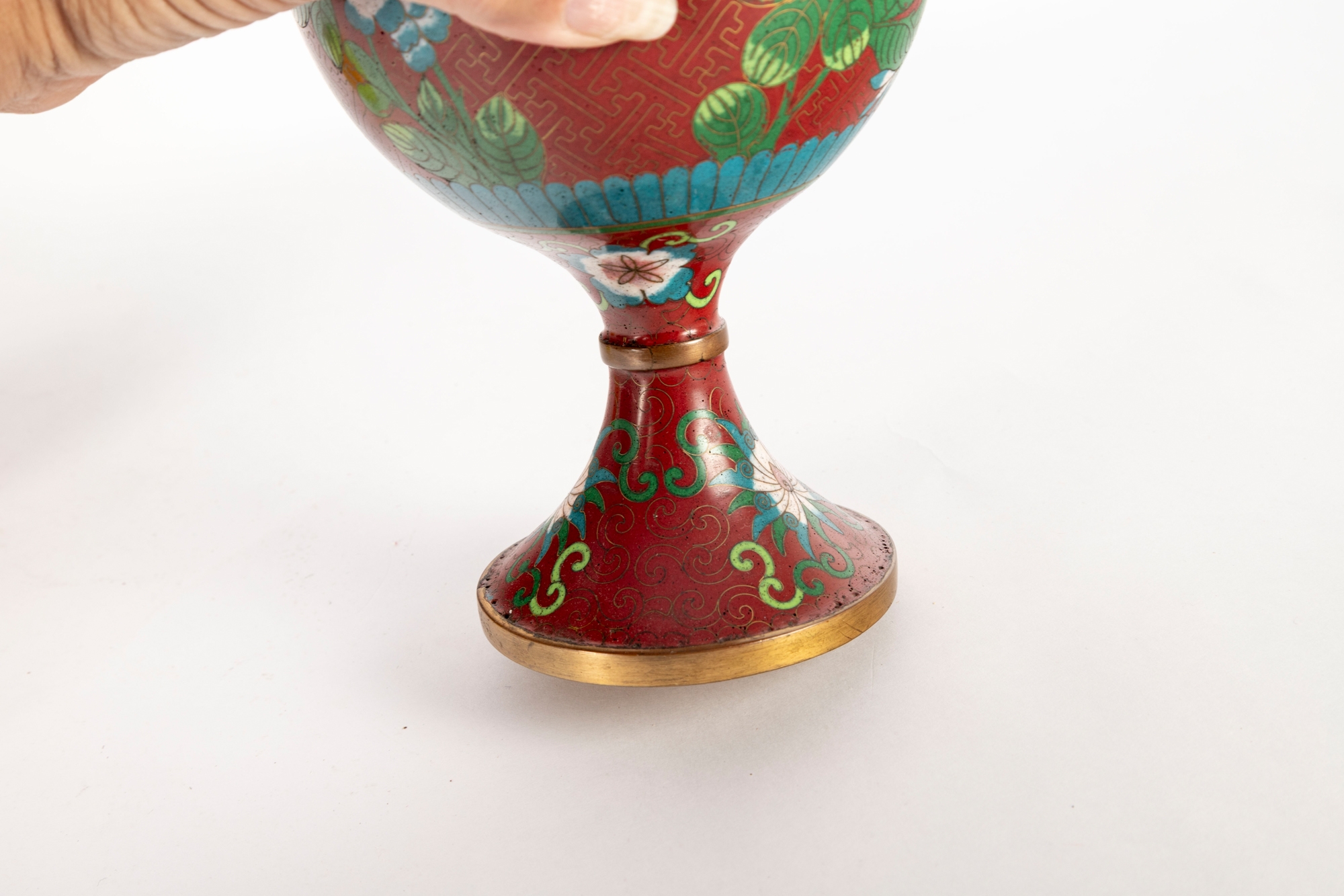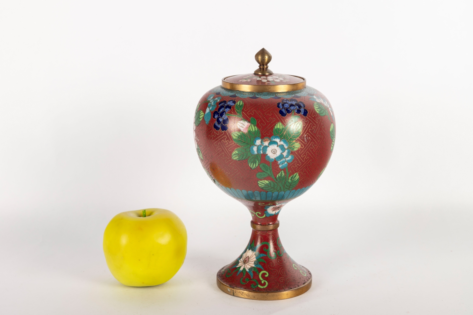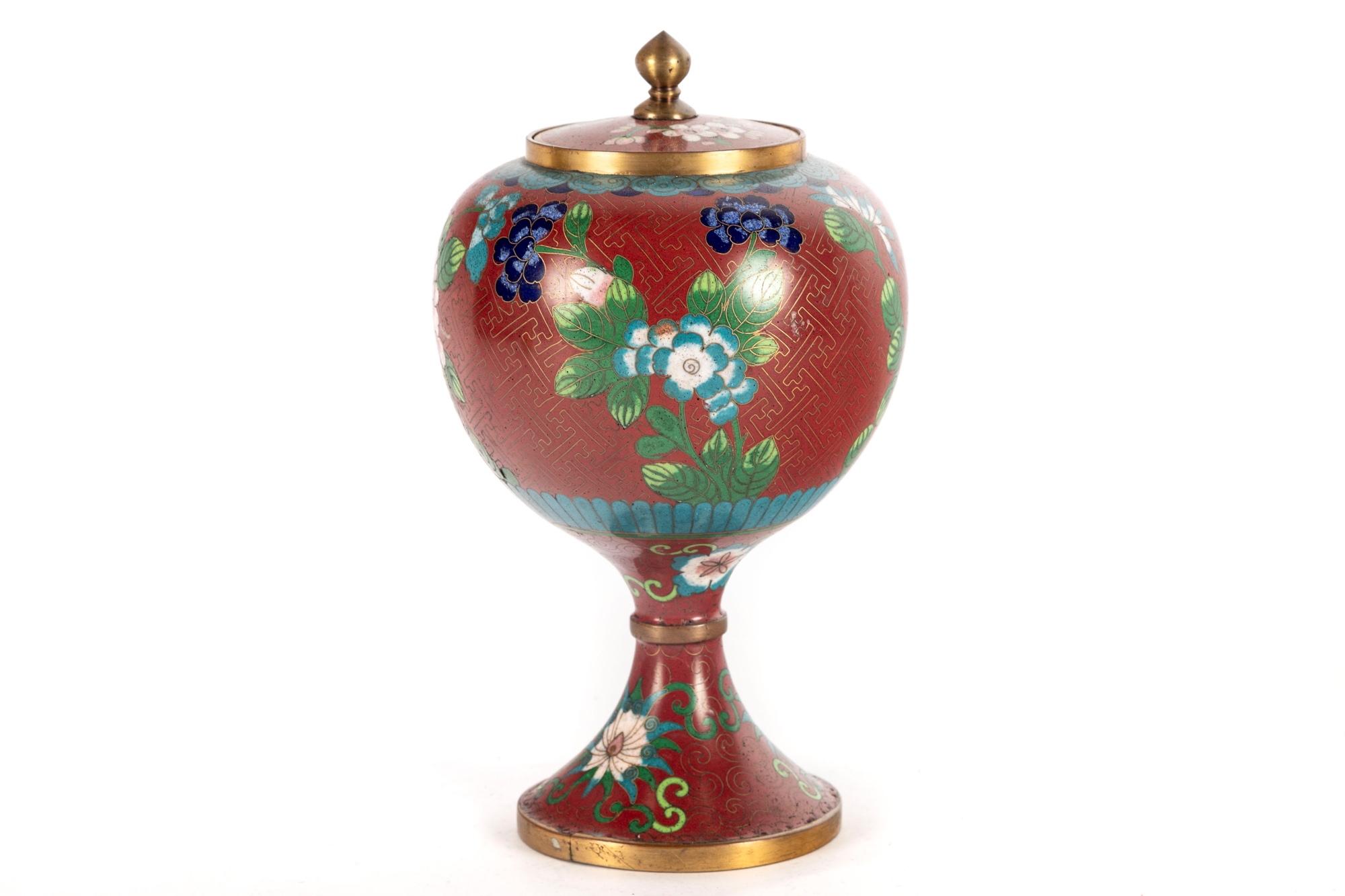 An elegant cloisonné enamel over brass goblet-form lidded vessel featuring vibrant floral motifs on a red ground. The intricate enamel work displays blossoms in blue, green, and white tones surrounded by foliate scrolls and geometric patterns