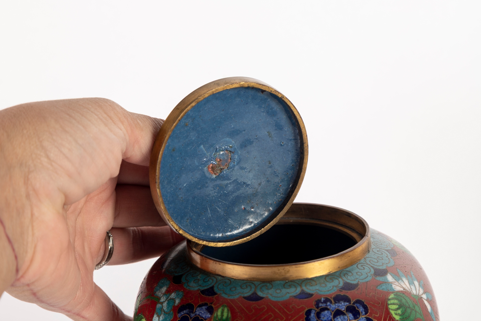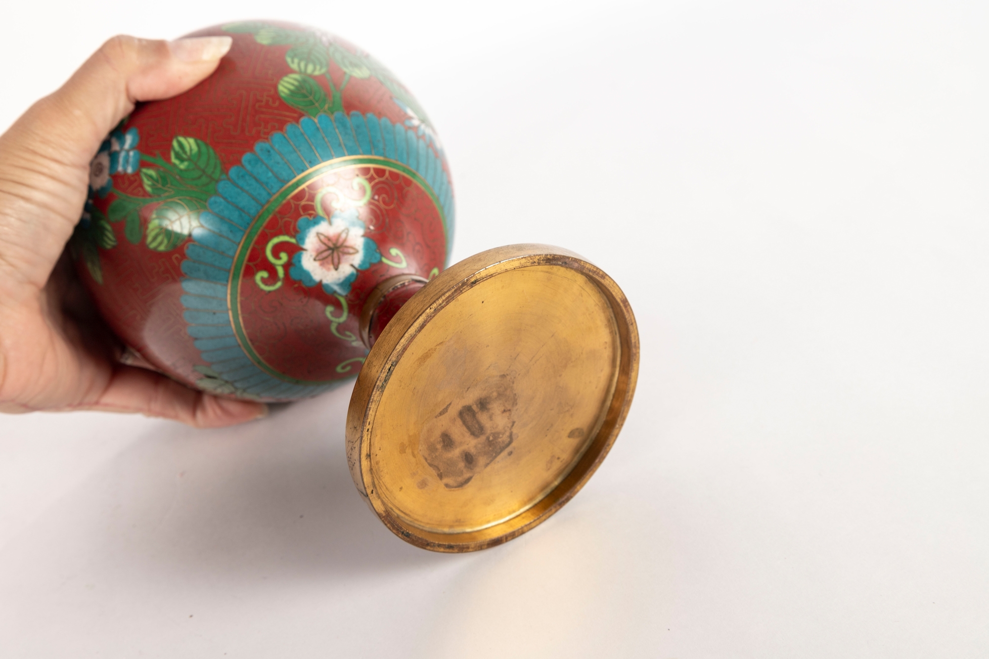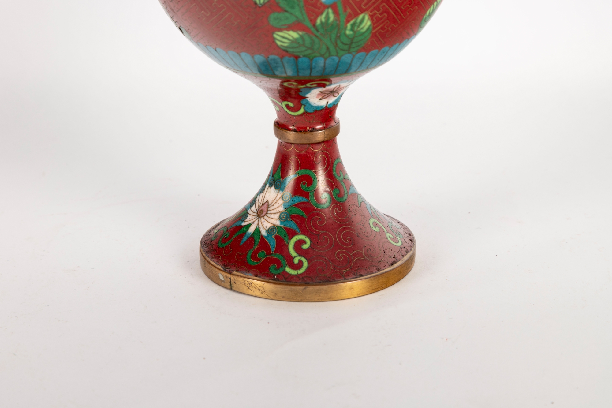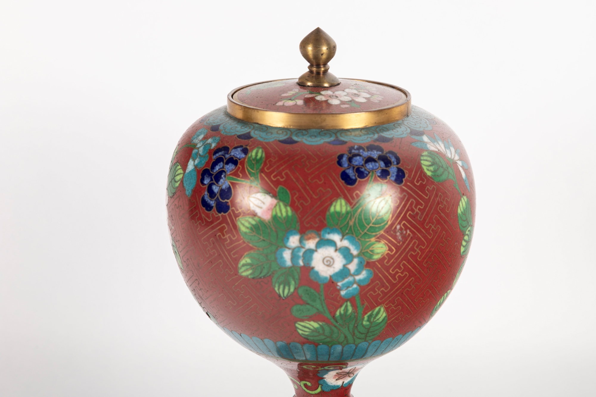 An elegant cloisonné enamel over brass goblet-form lidded vessel featuring vibrant floral motifs on a red ground. The intricate enamel work displays blossoms in blue, green, and white tones surrounded by foliate scrolls and geometric patterns