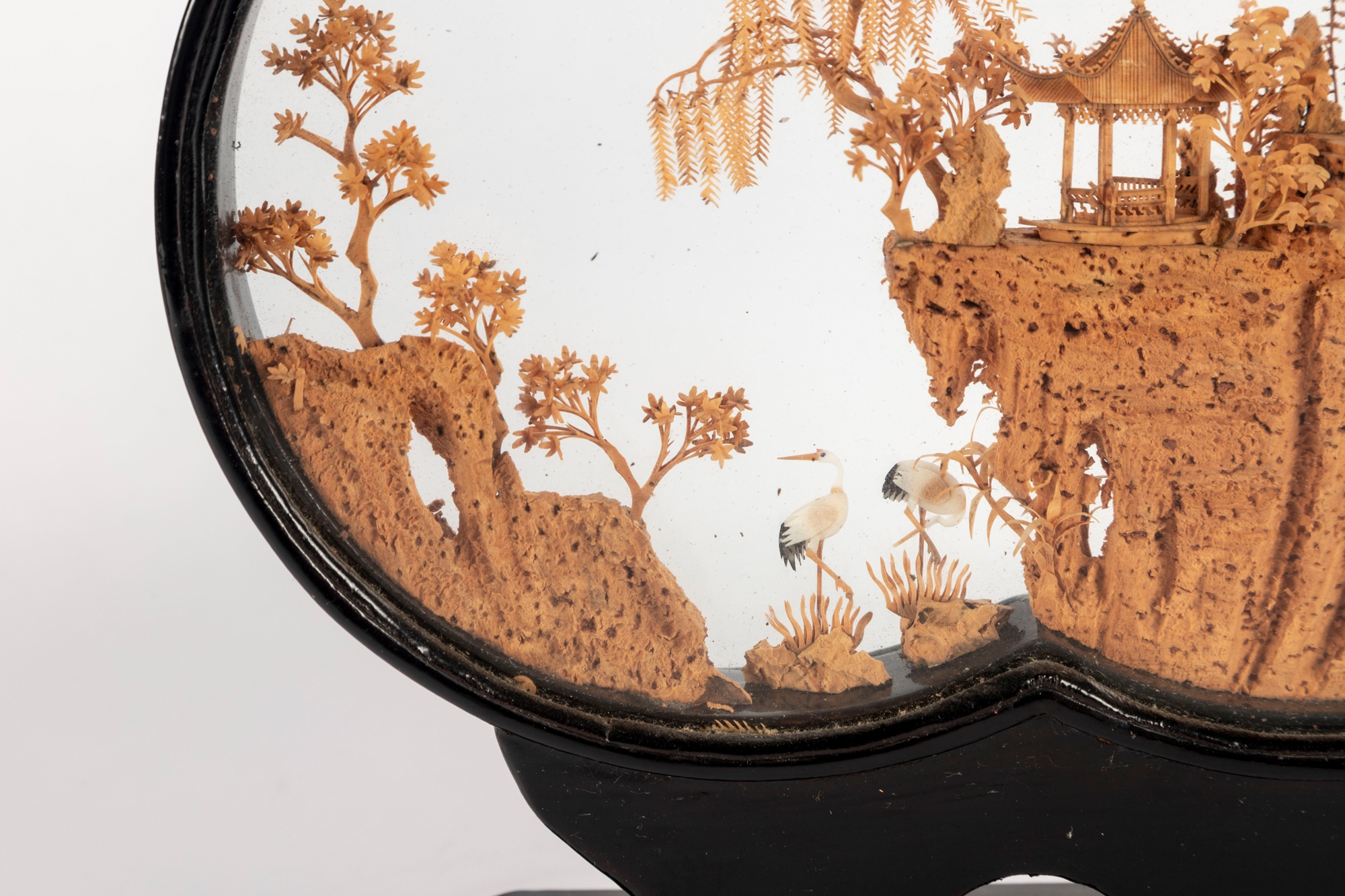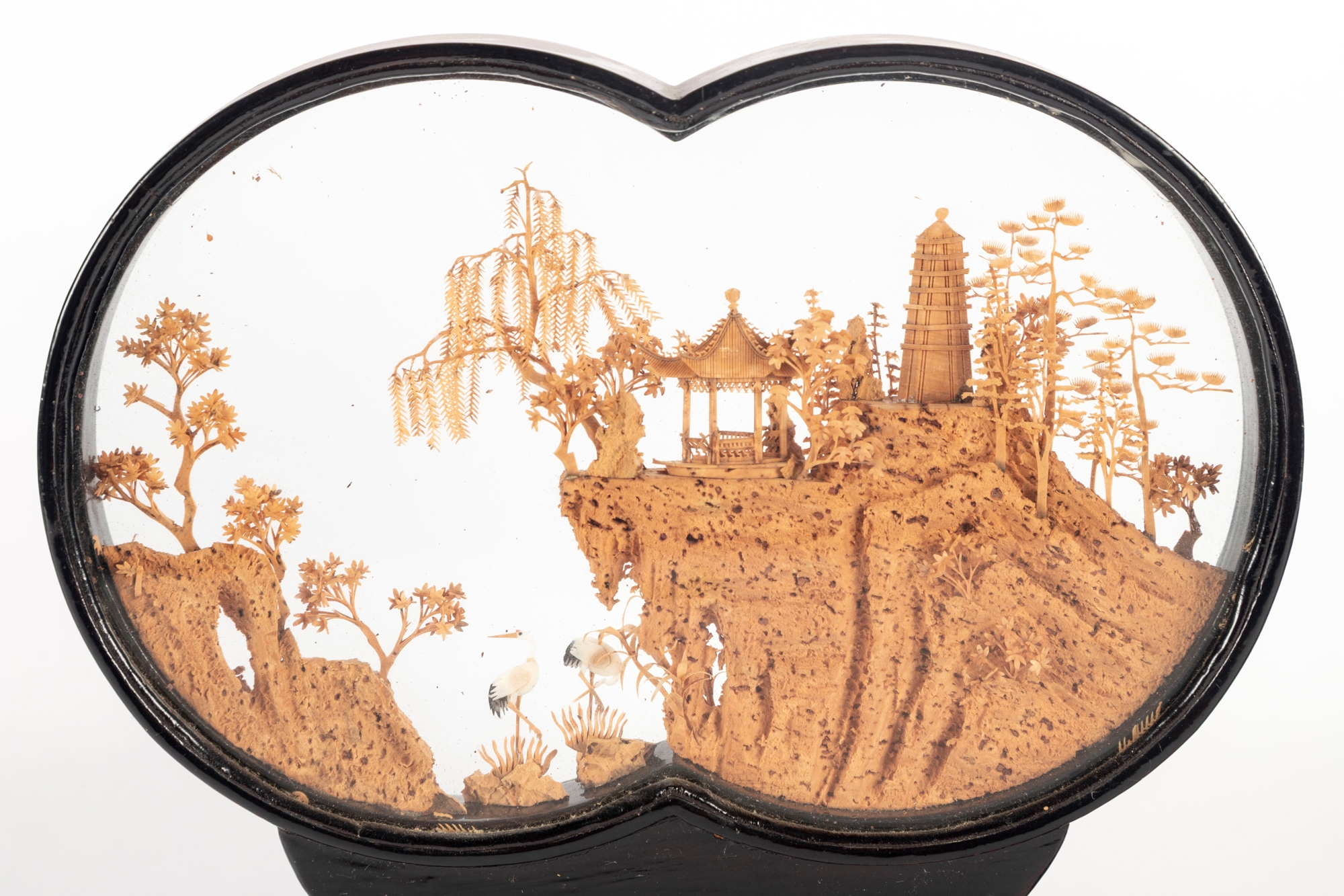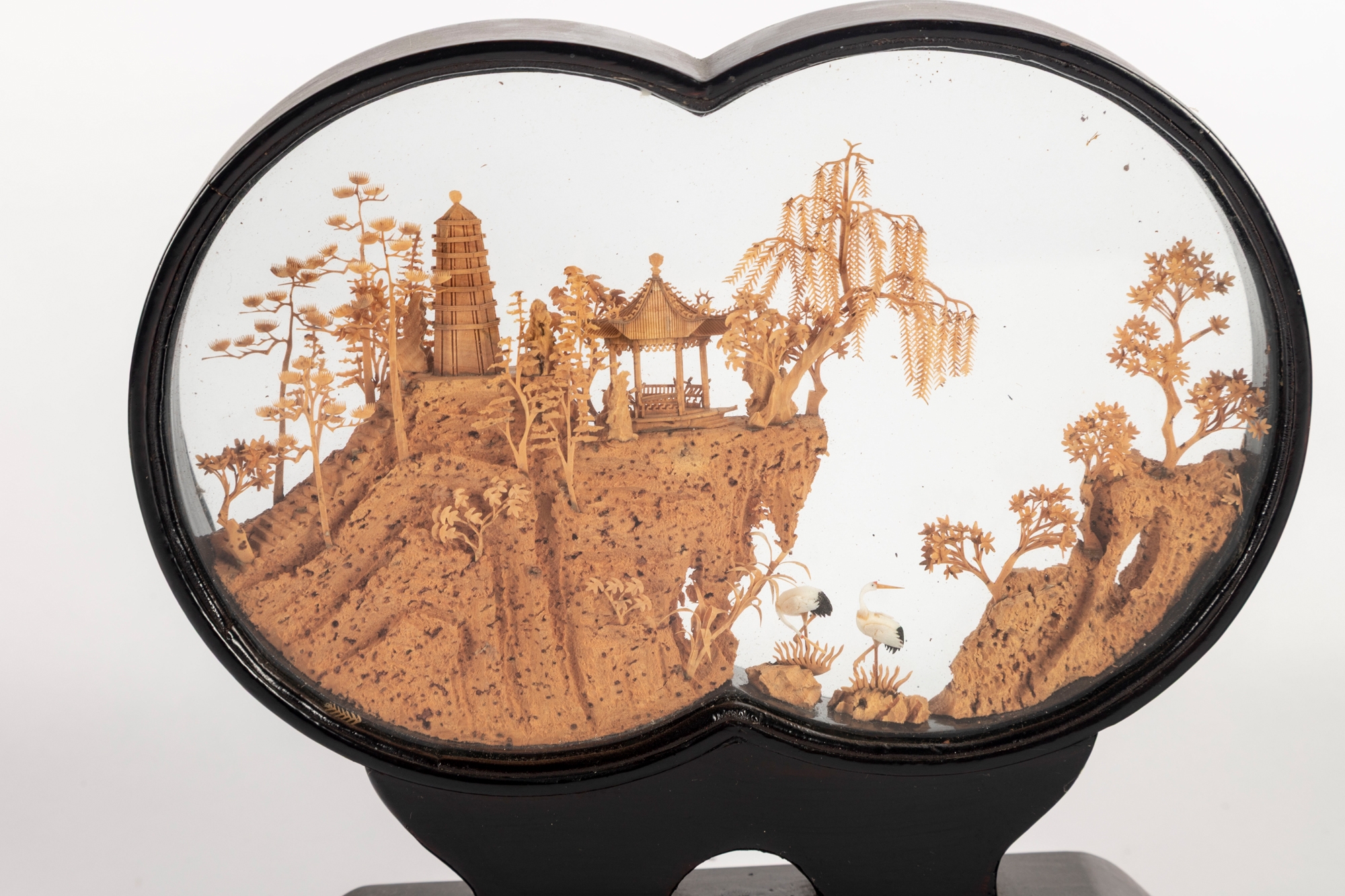 Intricately hand-carved Chinese cork diorama depicting a serene landscape with pagodas, trees, and cranes perched on a cliffside. The fine cork carving is encased between two plexiglass panels in an elegant black lacquered wood frame with a matching stand.