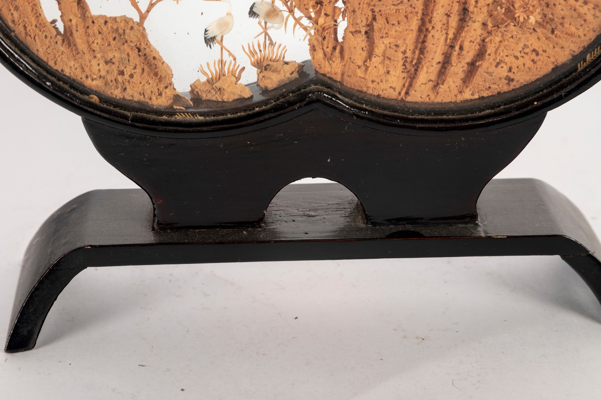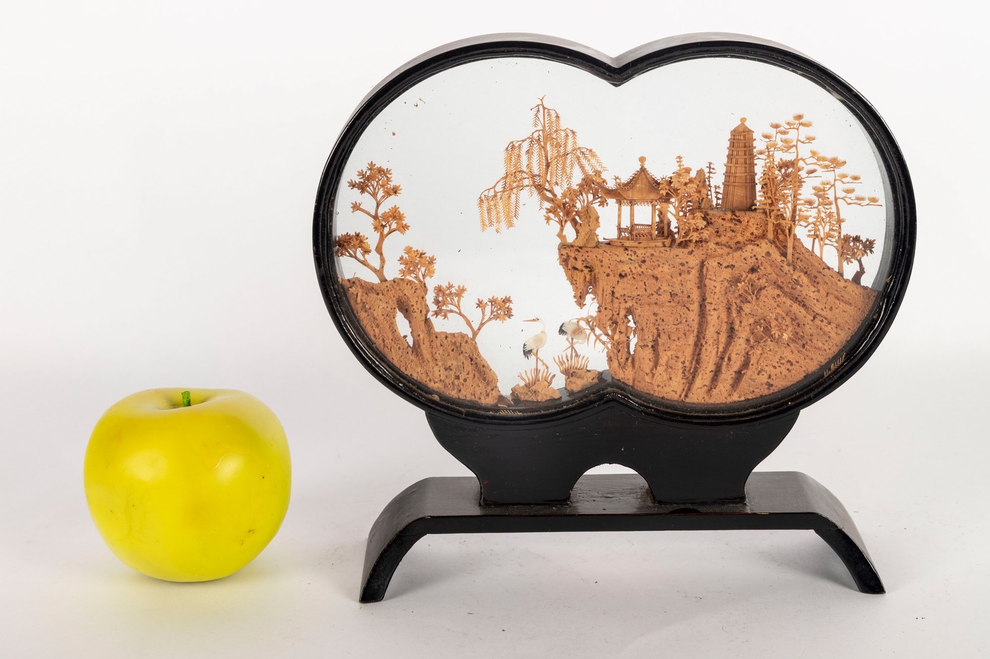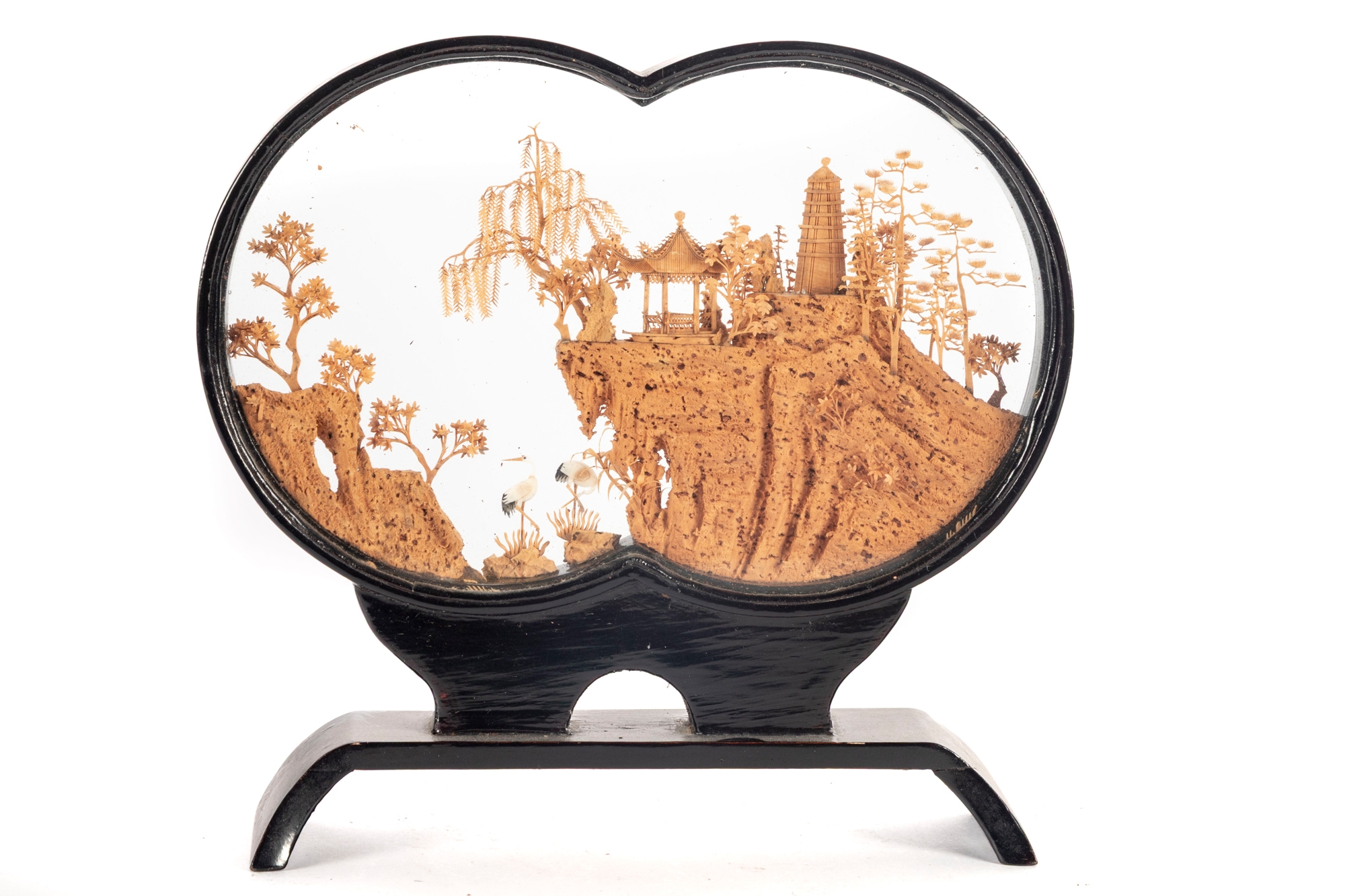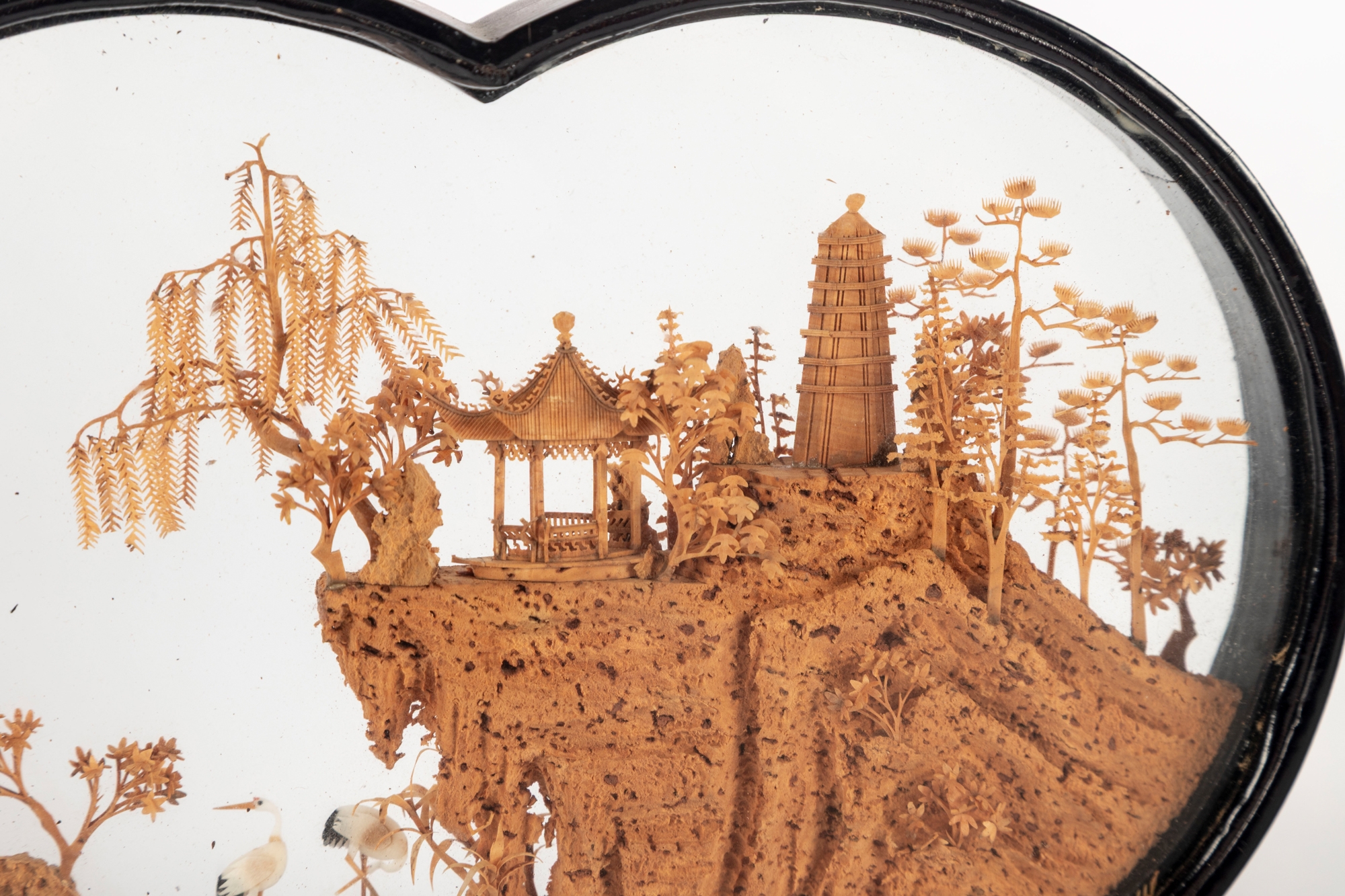 Intricately hand-carved Chinese cork diorama depicting a serene landscape with pagodas, trees, and cranes perched on a cliffside. The fine cork carving is encased between two plexiglass panels in an elegant black lacquered wood frame with a matching stand.