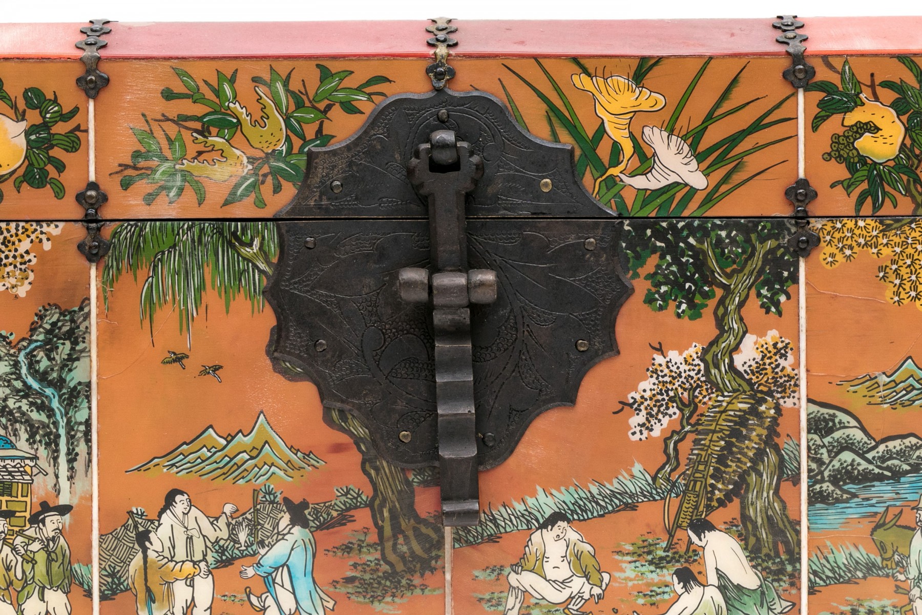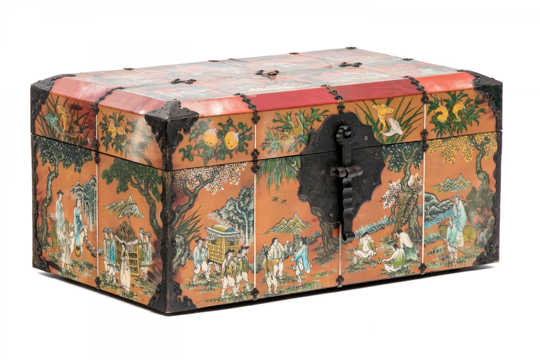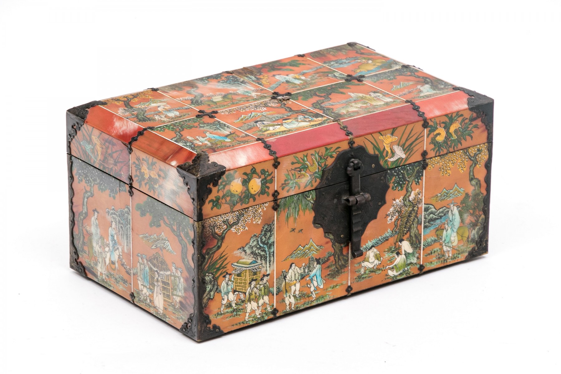 A wooden box covered with plaques of plastic all decorated with colorful scenes with figures in landscapes. With patinated and chased metal mounts. The hinged lid opens to a fabric lined interior with removable tray.