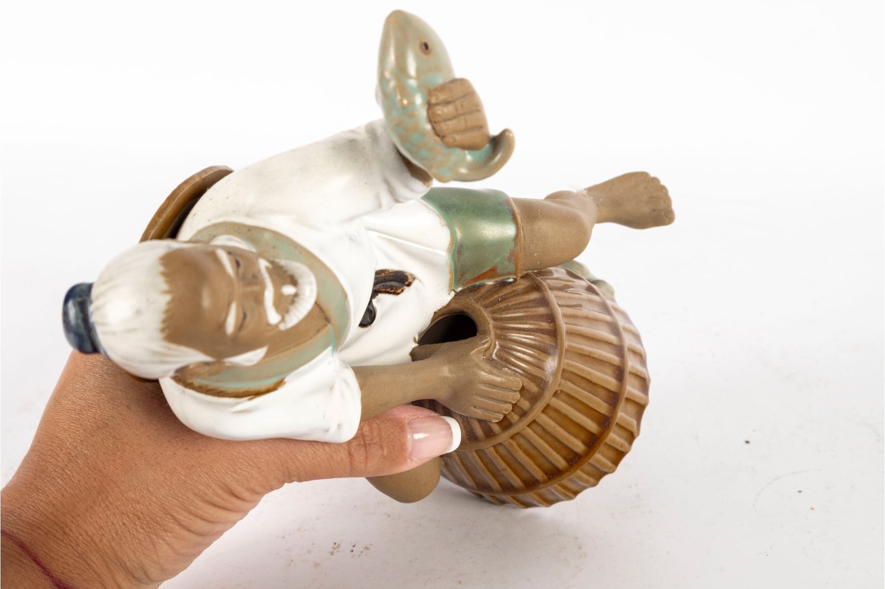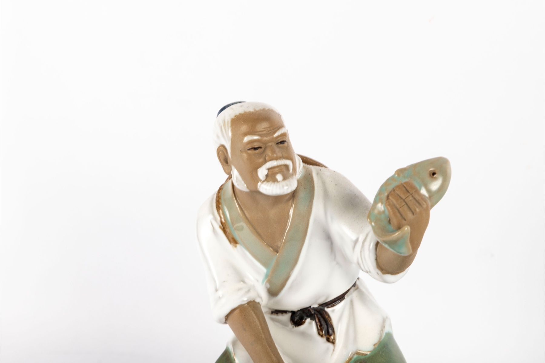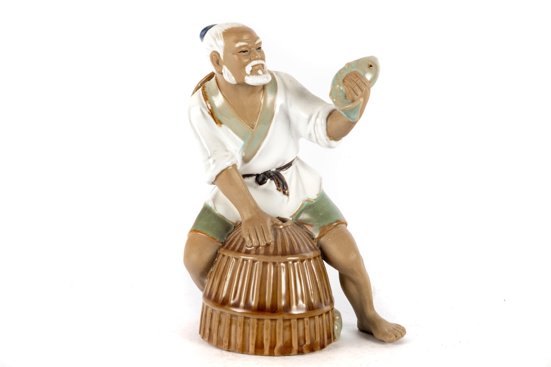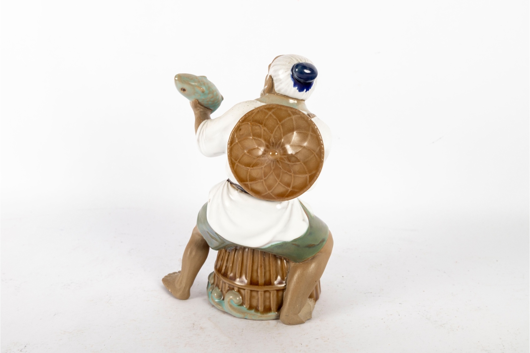Charming hand-painted porcelain figure depicting an elderly fisherman kneeling beside a woven basket while holding a freshly caught fish. The figure features soft celadon and earth-tone glazes with subtle detailing to the face, clothing, and basket. Markings: Impressed to underside “63 Wanjiang China.”