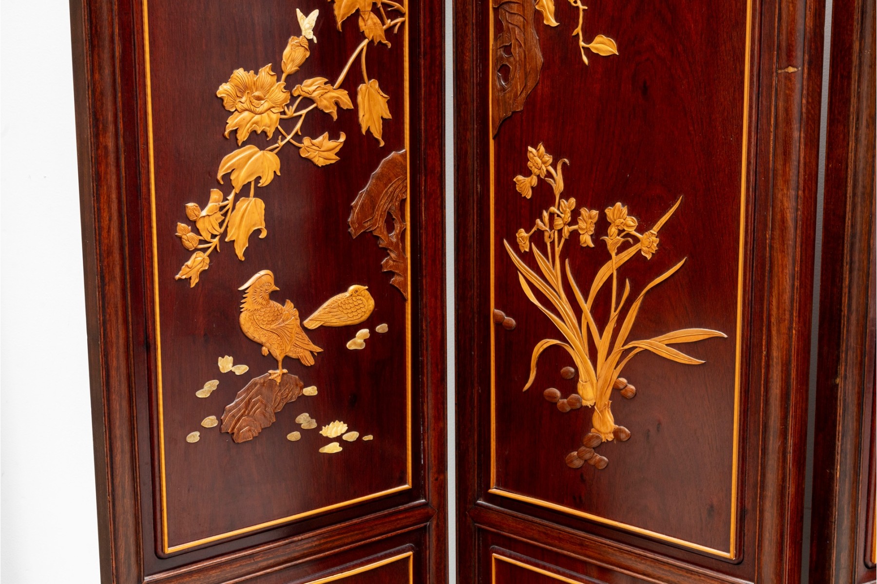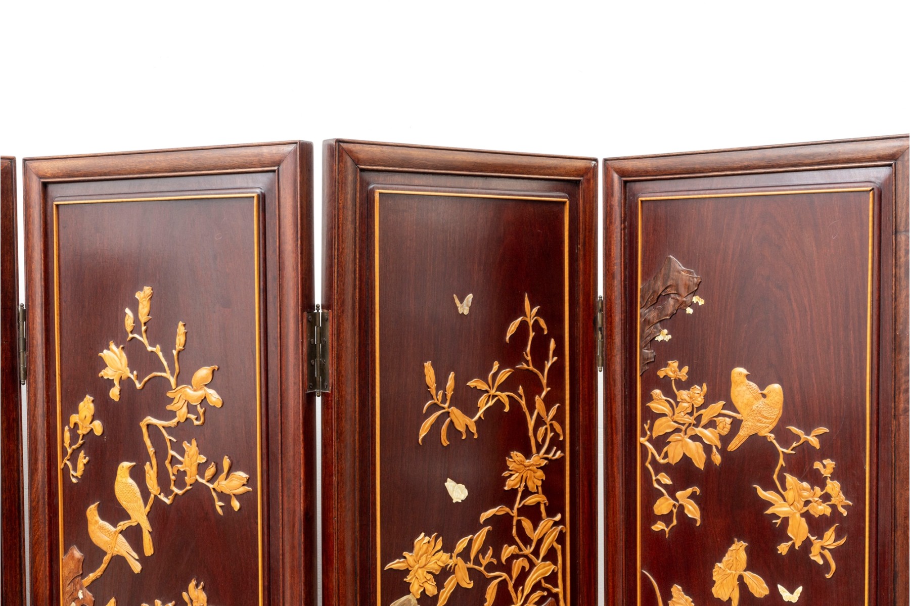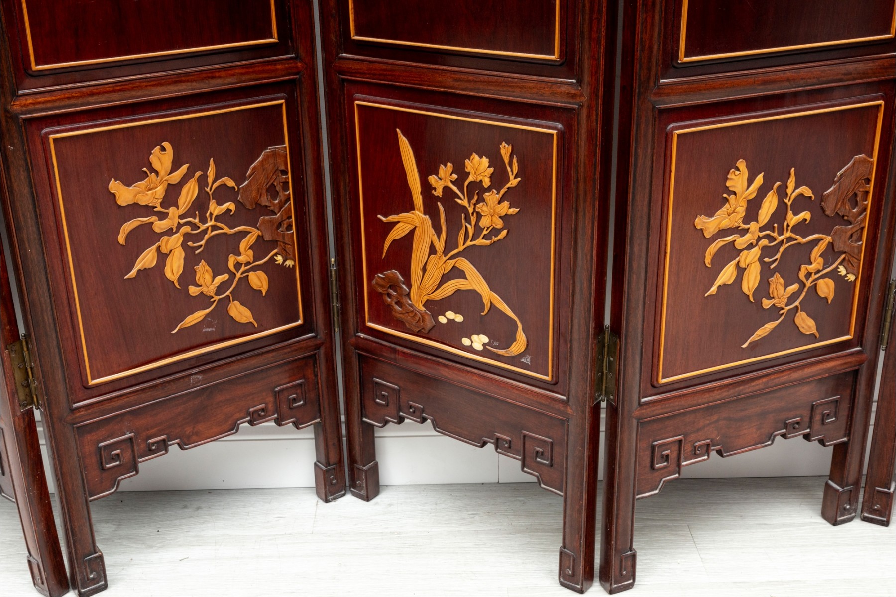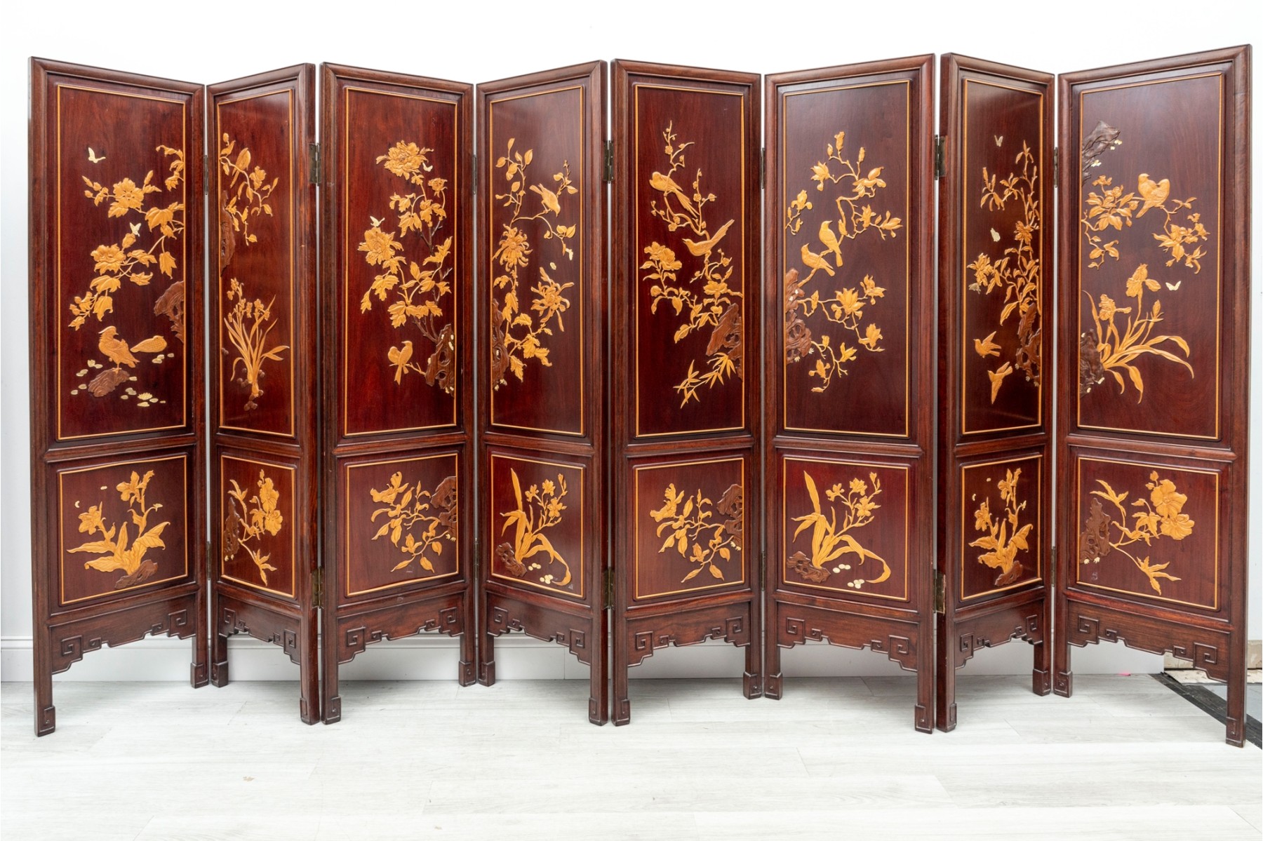 This gorgeous eight-panel Chinese marquetry screen is a stunning piece of artistry, crafted from rich mahogany and featuring intricate inlaid reliefs. Sparse yet striking inset mother-of-pearl detailing adds a touch of elegance, catching the light and enhancing the overall richness of the screen.
