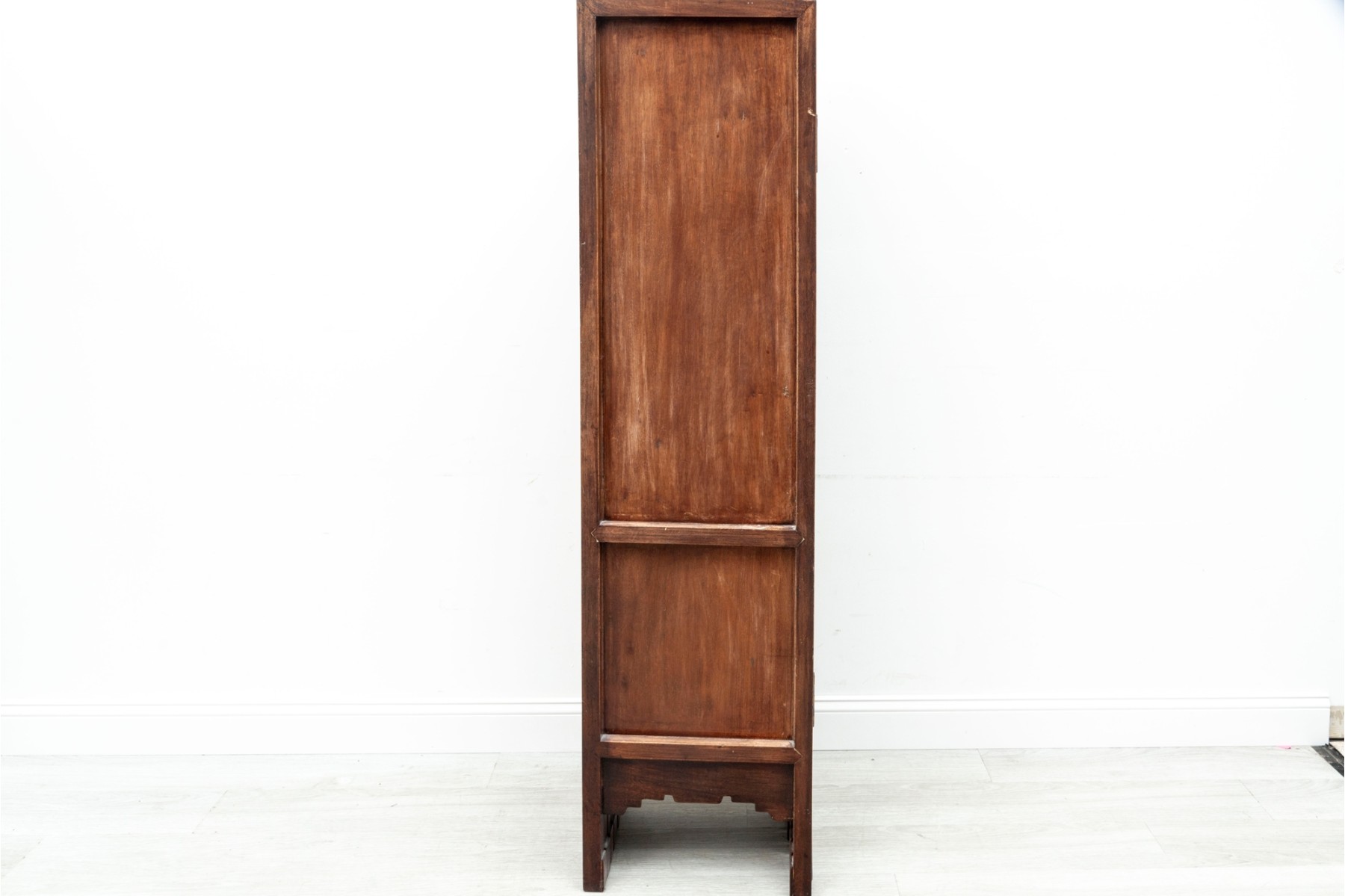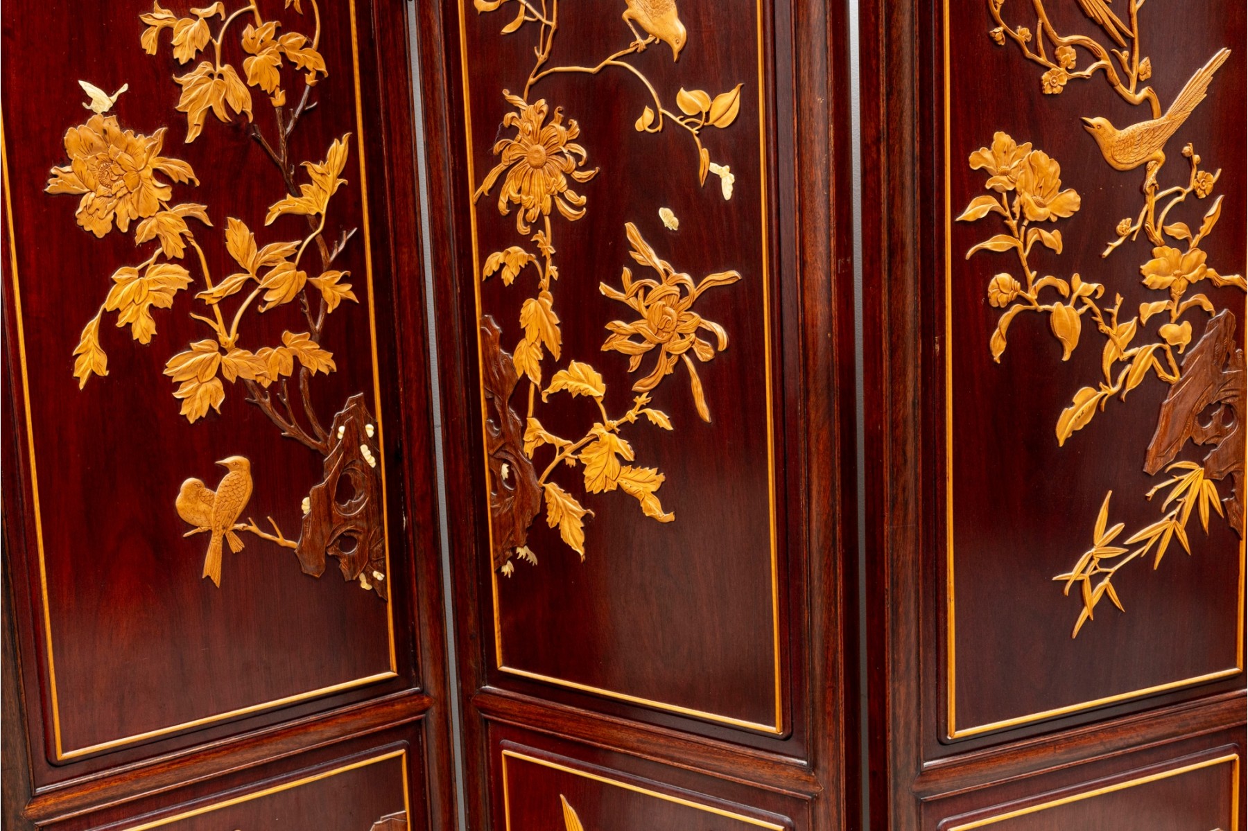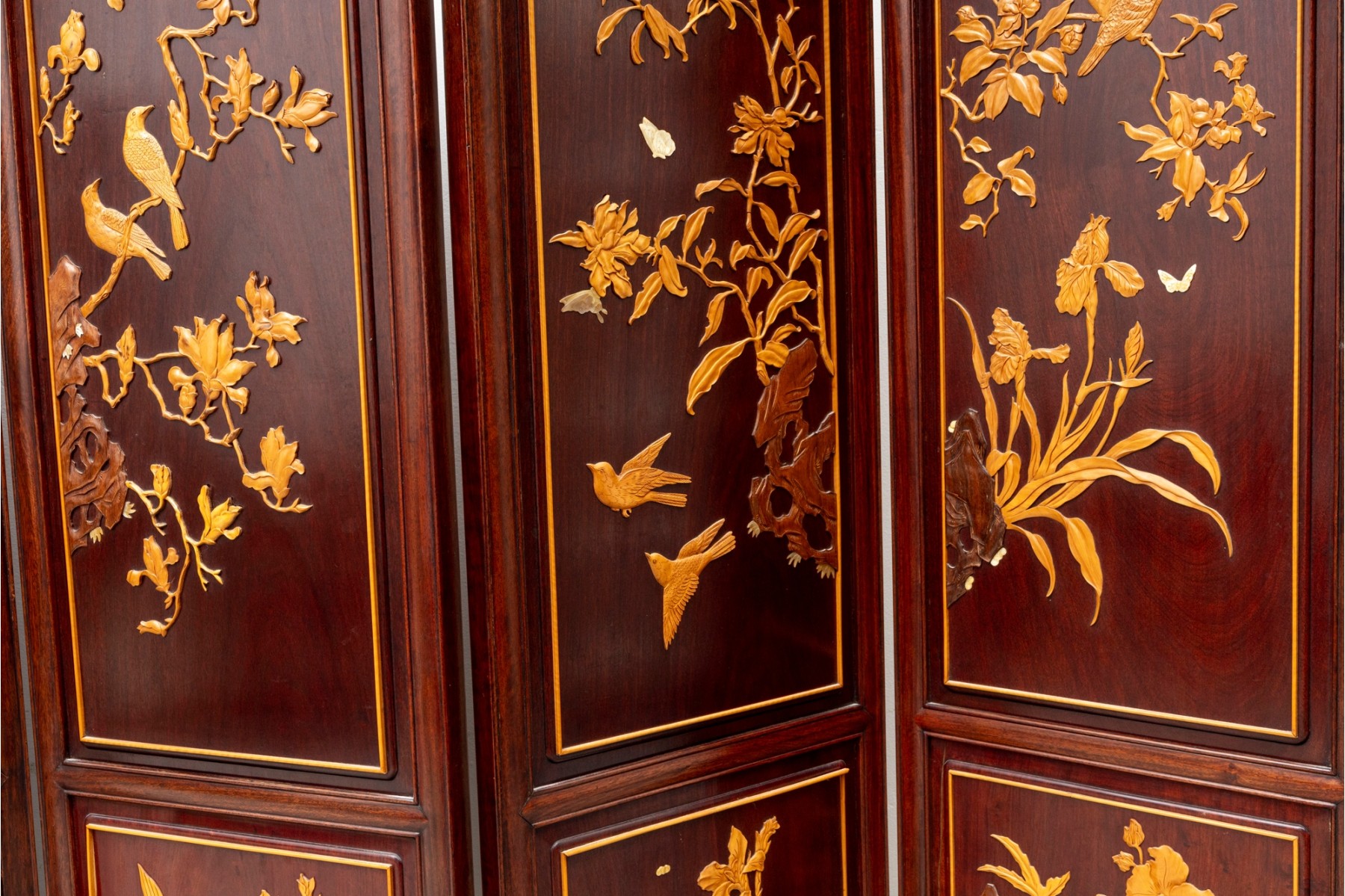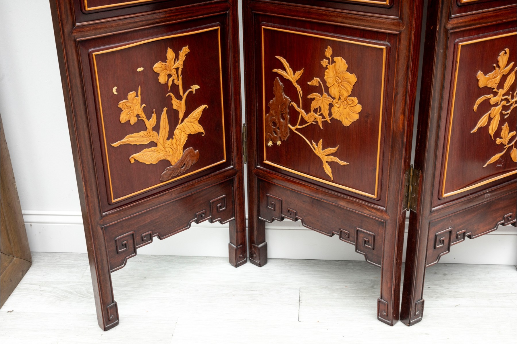 This gorgeous eight-panel Chinese marquetry screen is a stunning piece of artistry, crafted from rich mahogany and featuring intricate inlaid reliefs. Sparse yet striking inset mother-of-pearl detailing adds a touch of elegance, catching the light and enhancing the overall richness of the screen.