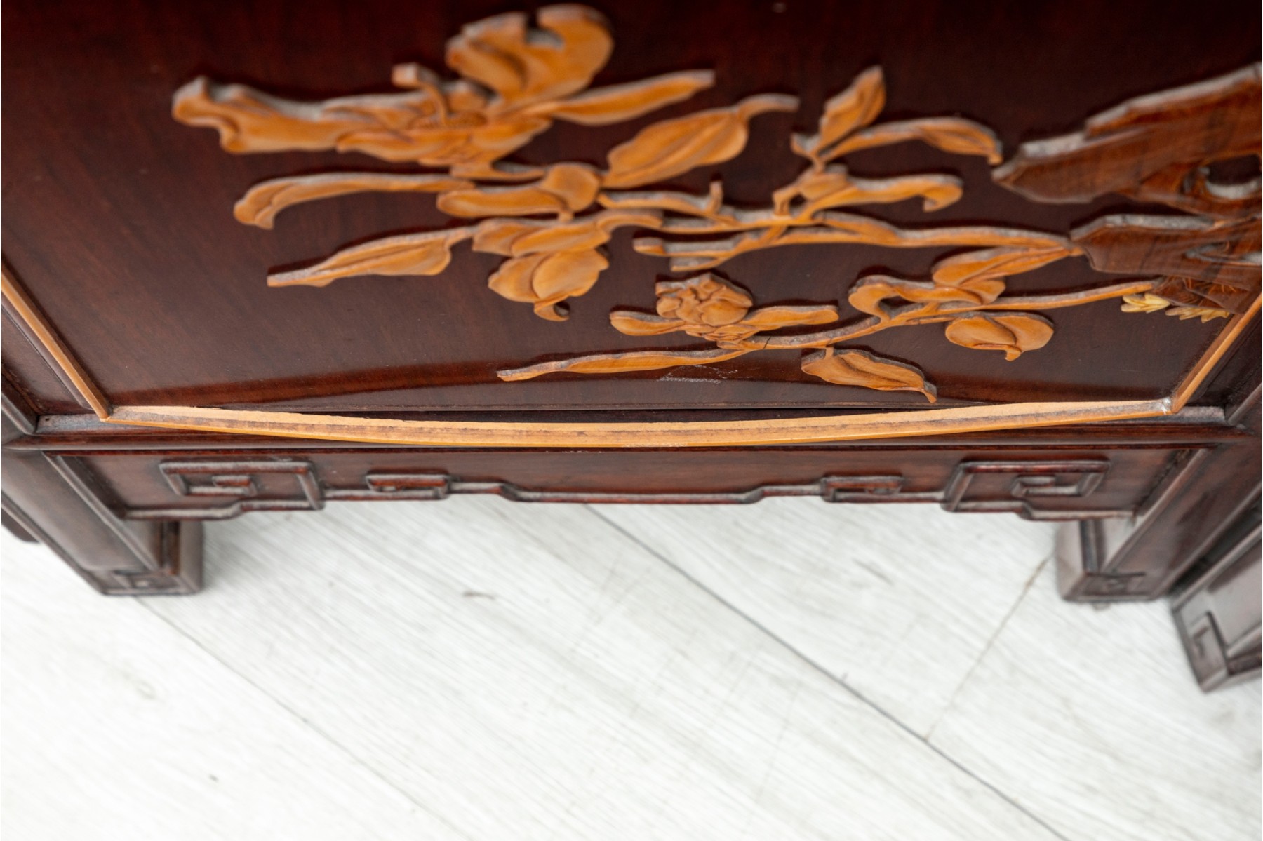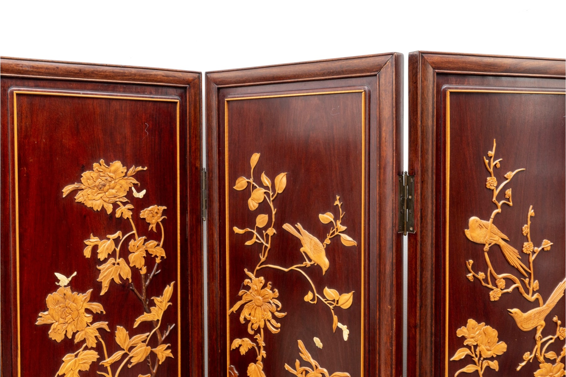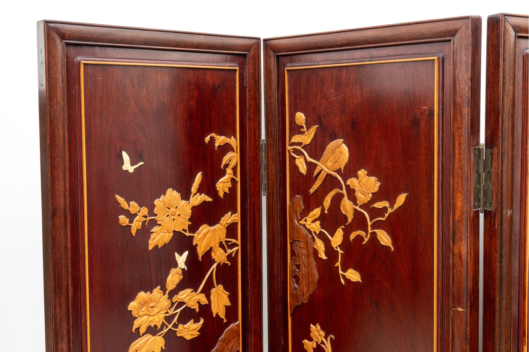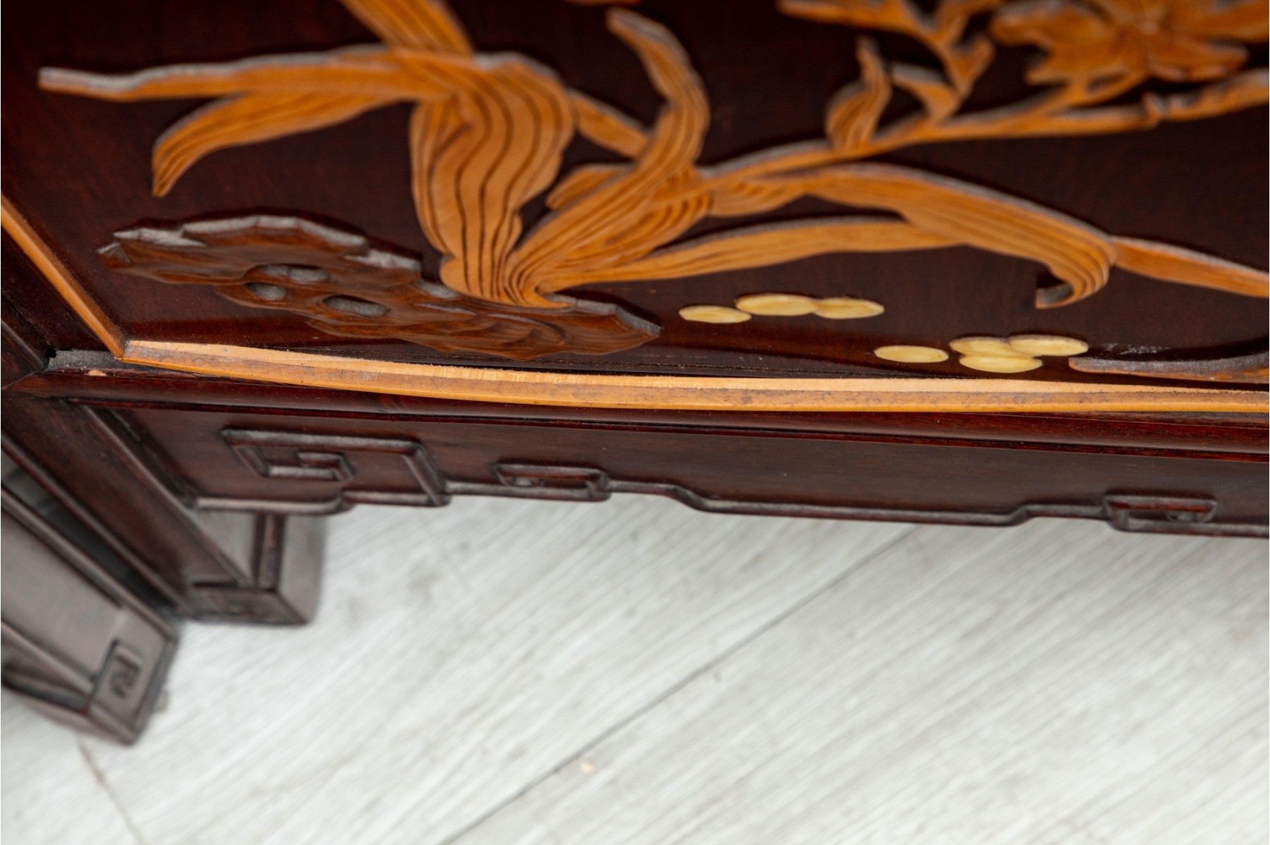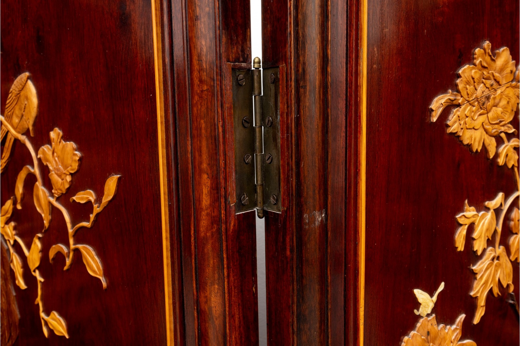 This gorgeous eight-panel Chinese marquetry screen is a stunning piece of artistry, crafted from rich mahogany and featuring intricate inlaid reliefs. Sparse yet striking inset mother-of-pearl detailing adds a touch of elegance, catching the light and enhancing the overall richness of the screen.