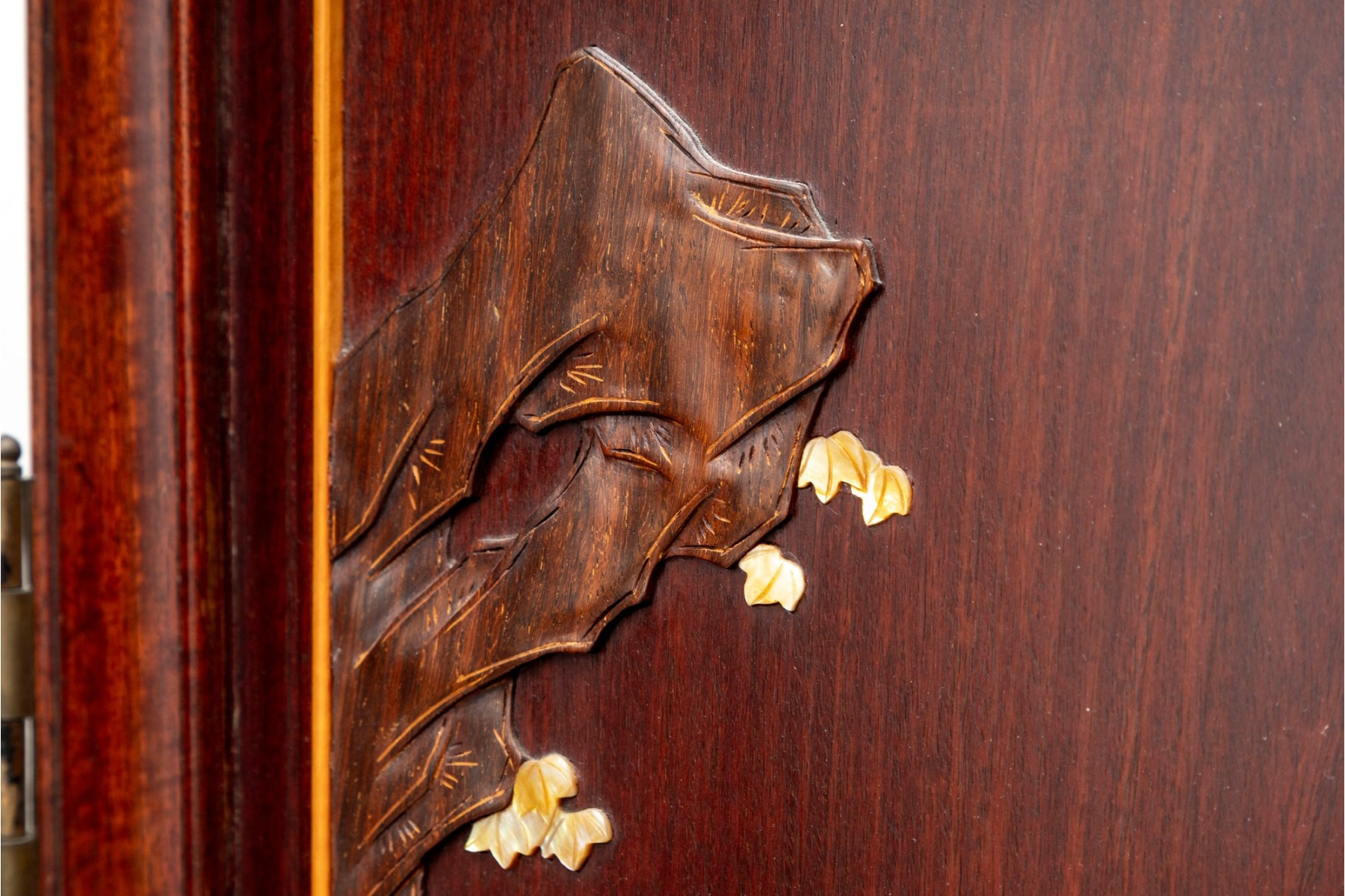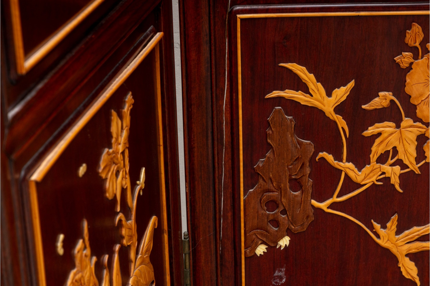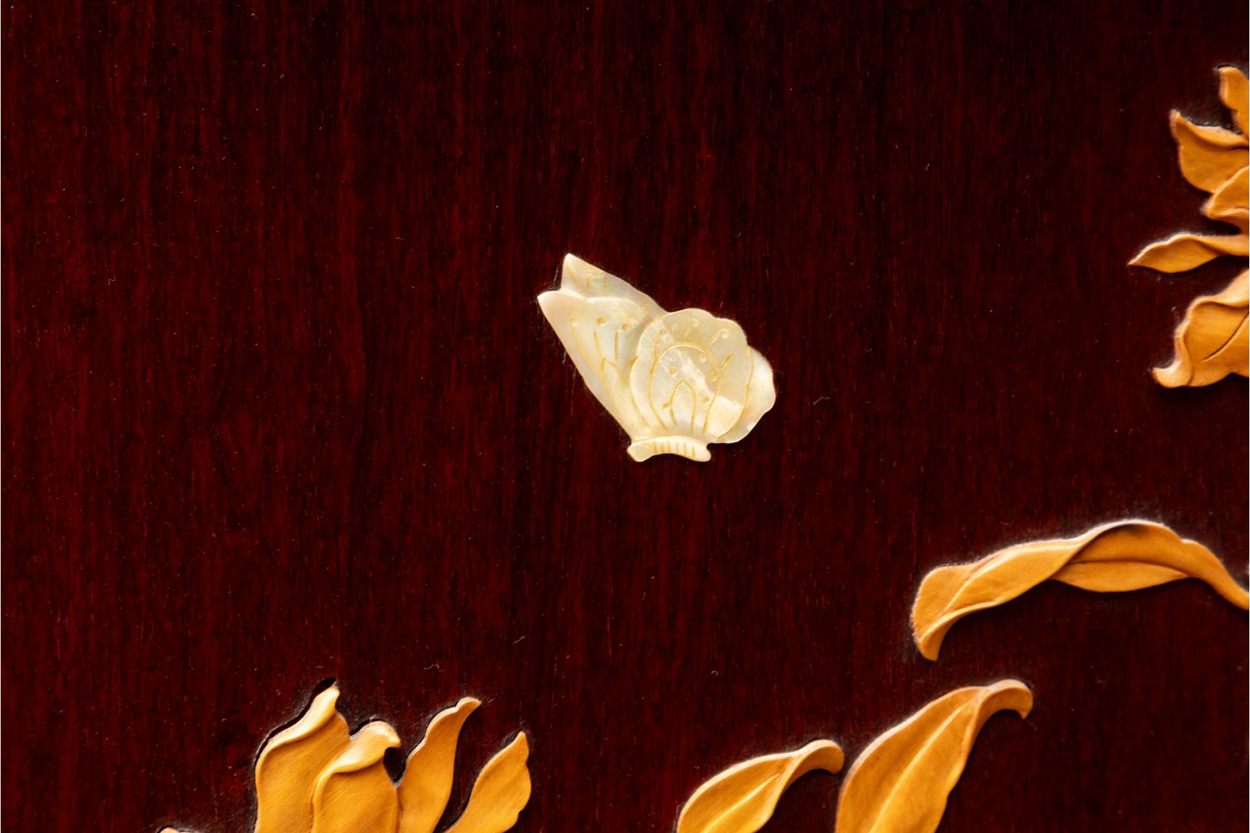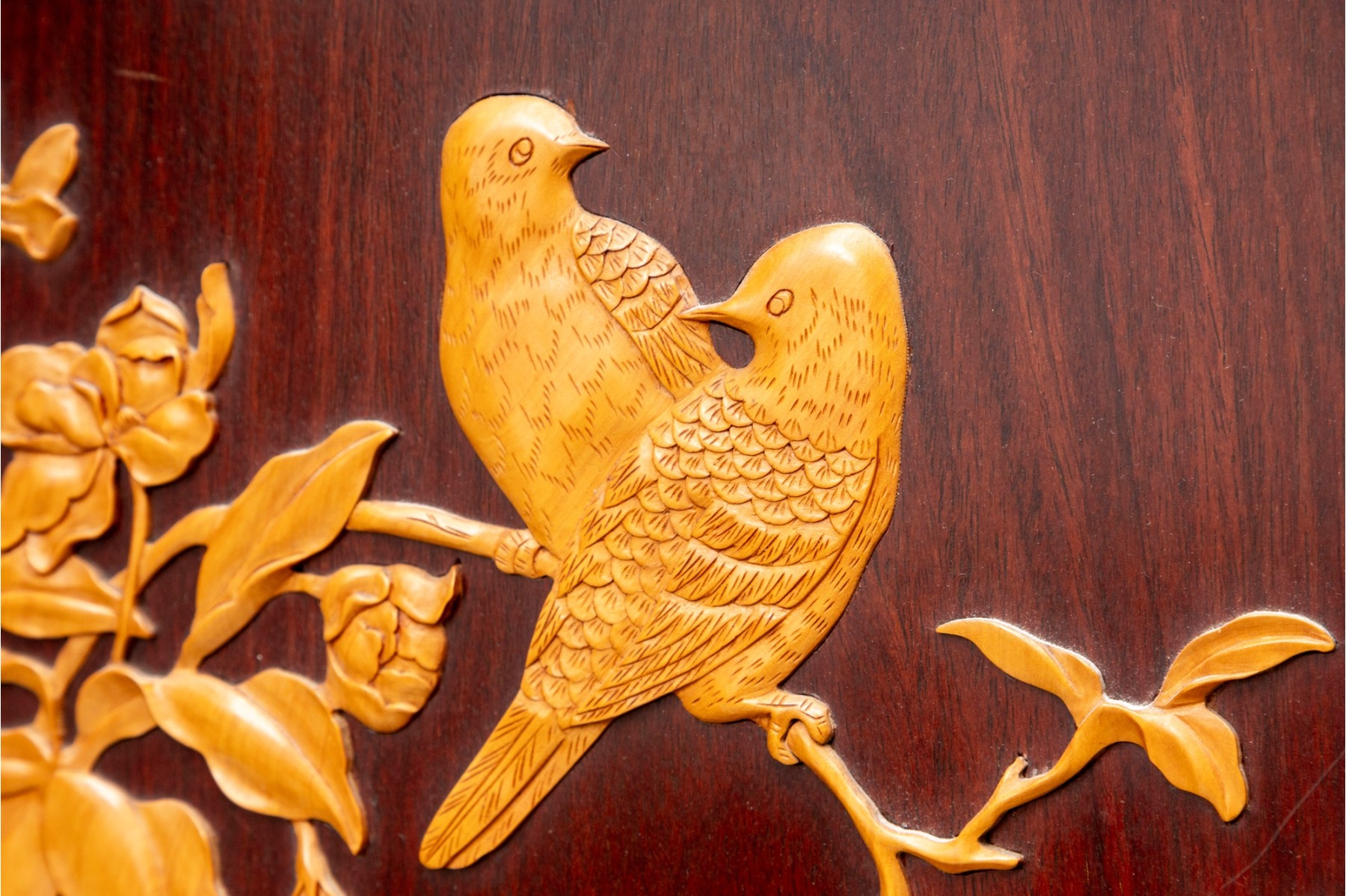 This gorgeous eight-panel Chinese marquetry screen is a stunning piece of artistry, crafted from rich mahogany and featuring intricate inlaid reliefs. Sparse yet striking inset mother-of-pearl detailing adds a touch of elegance, catching the light and enhancing the overall richness of the screen.