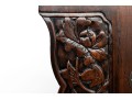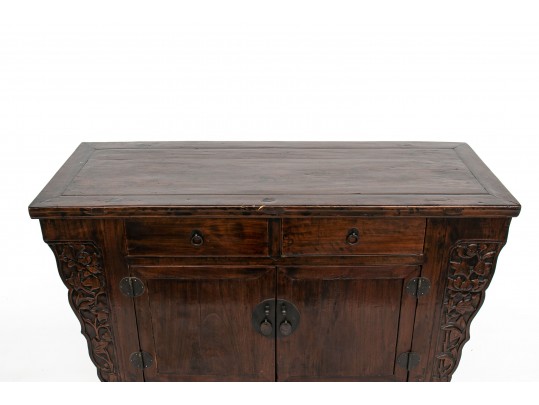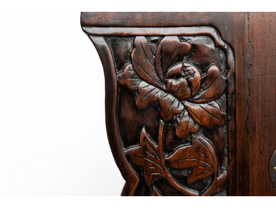 Chinese coffer table constructed out of Elmwood. Rectangular top over two shorts drawers resting above two panel doors that open to reveal a central bisection shelf. Elaborate floral carved accent panels flanking the body. With a scalloped skirt and raised on short straight legs.