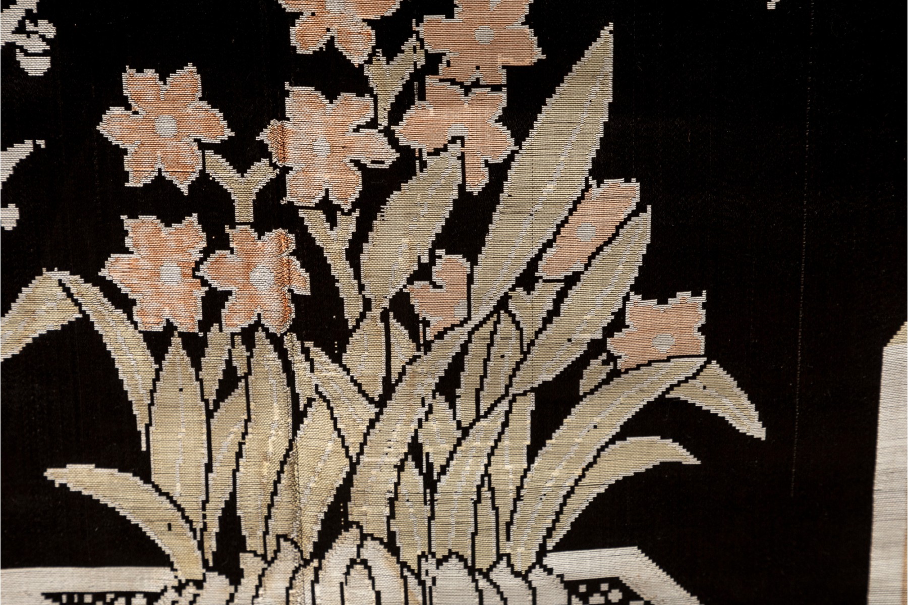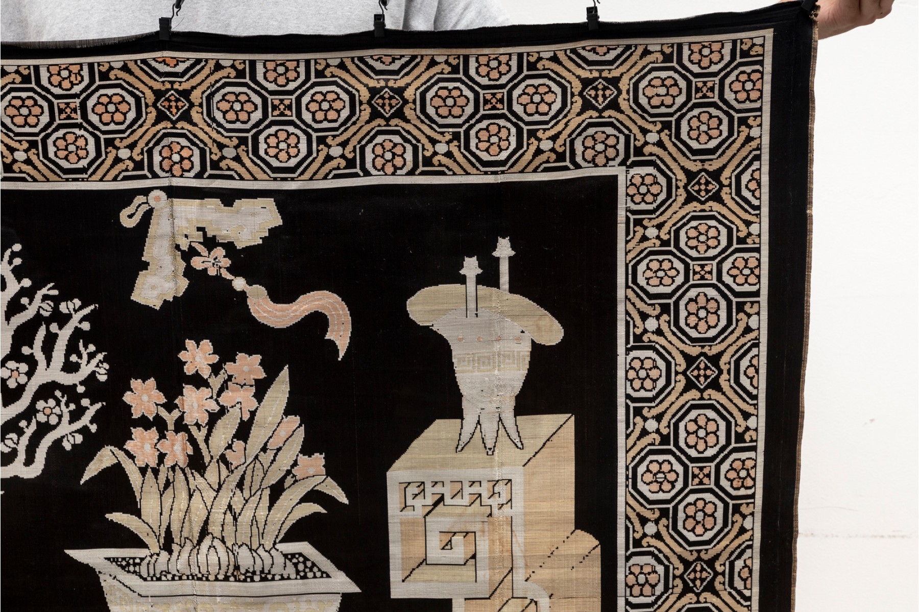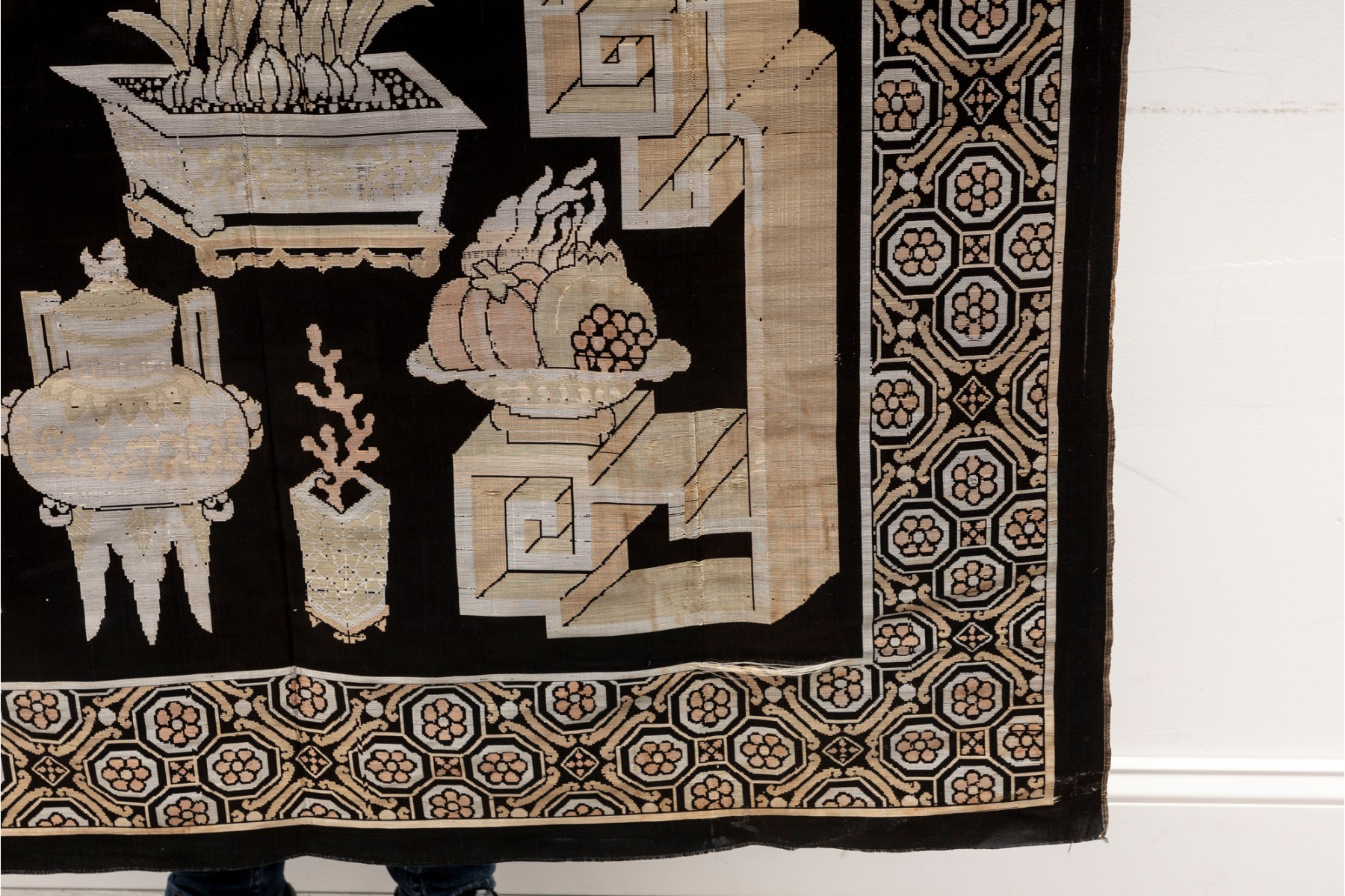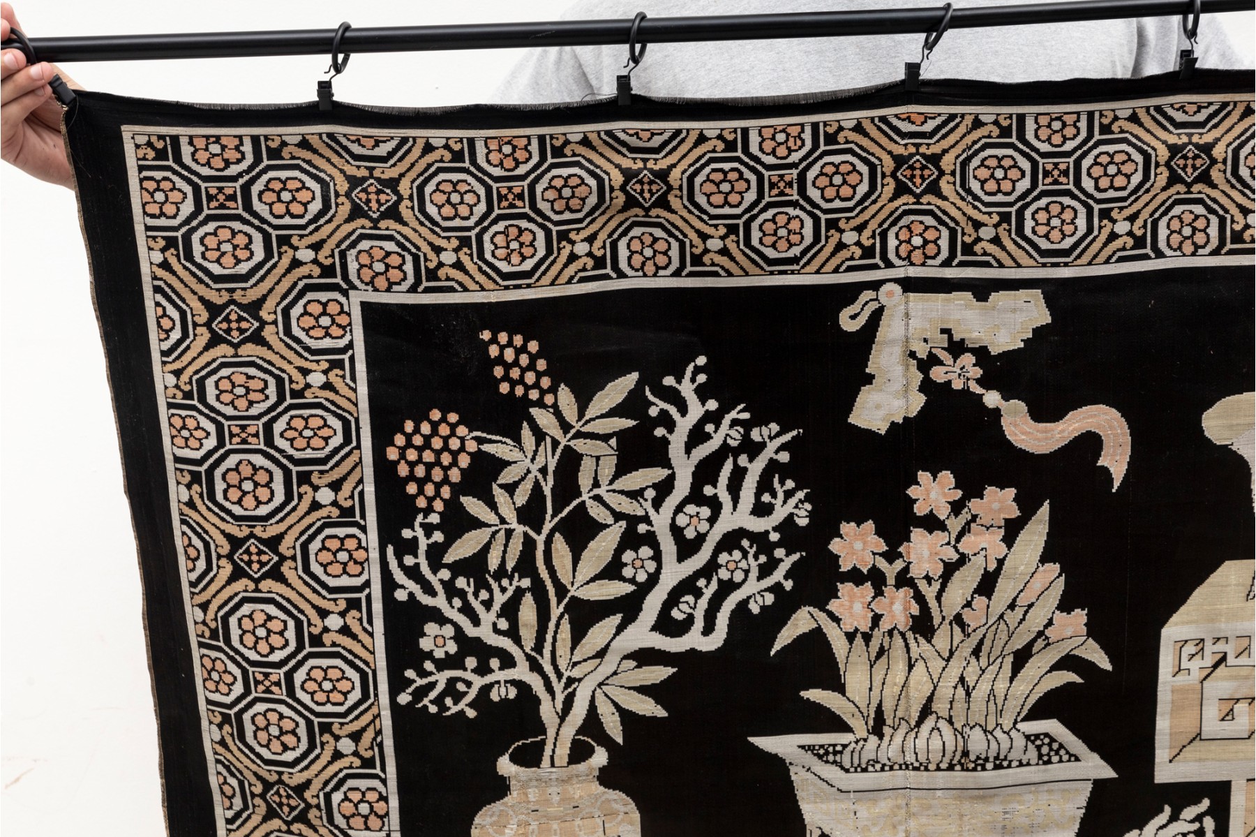 A vintage Chinese silk panel embroidered with potted plants over a black field -- often referred to as 'garden' tapestries.