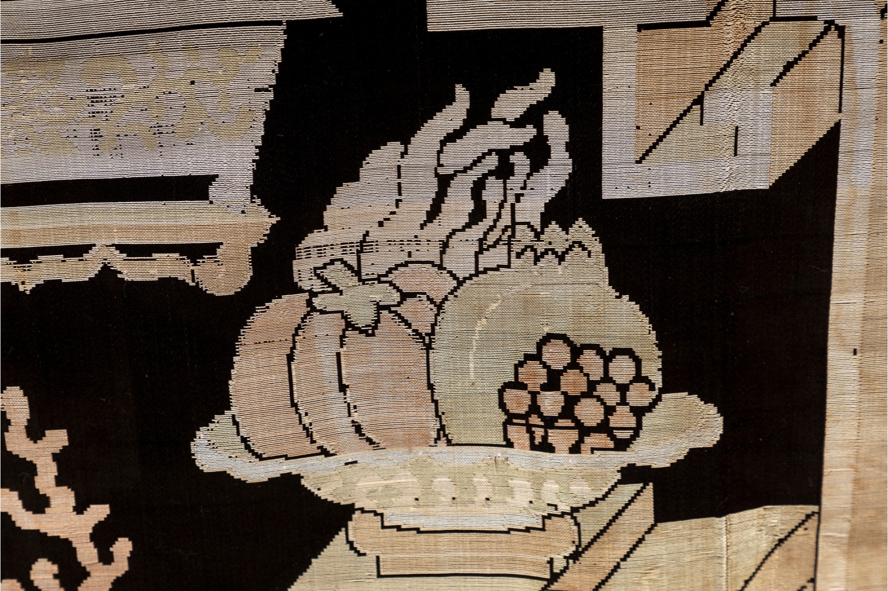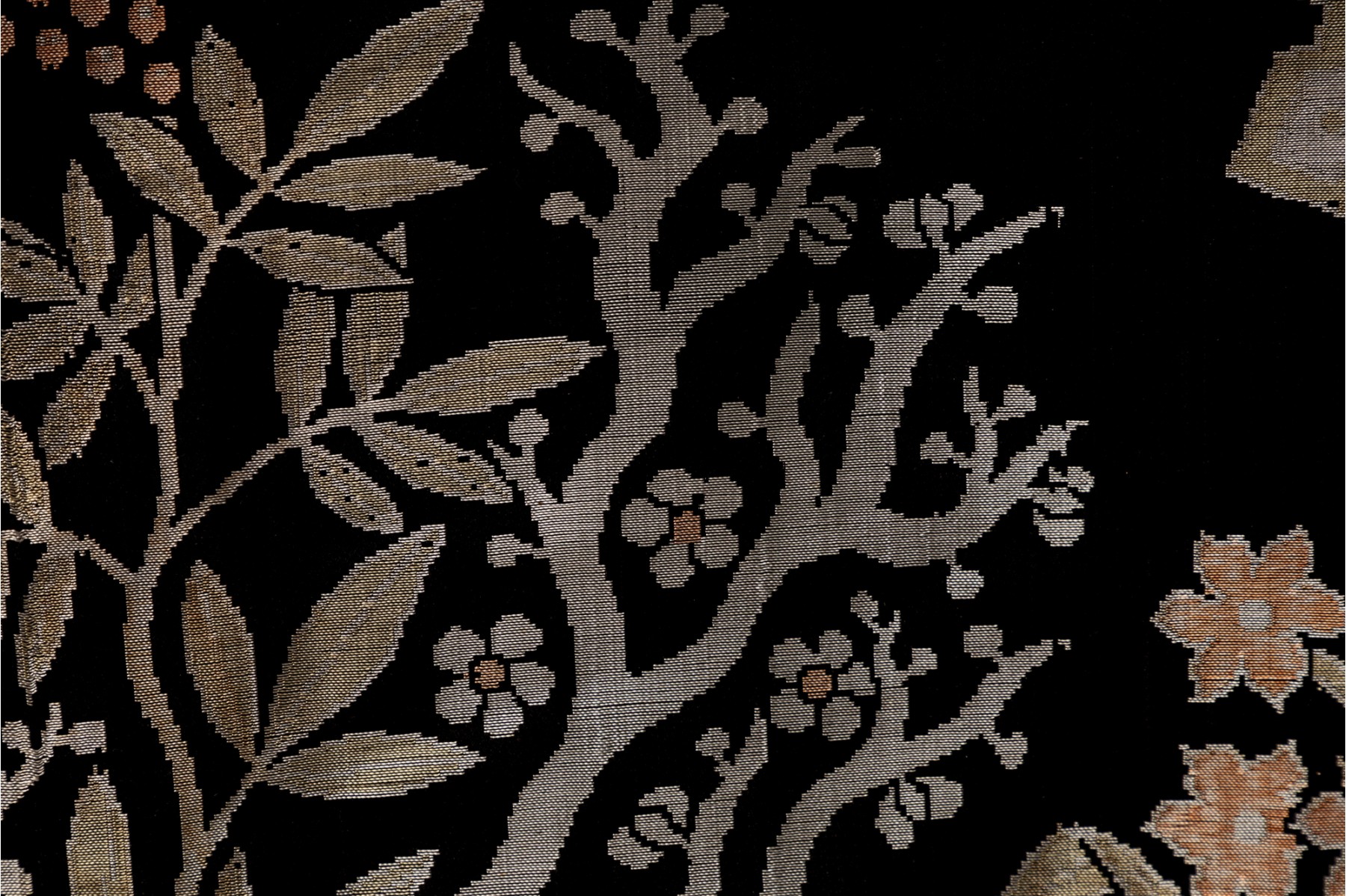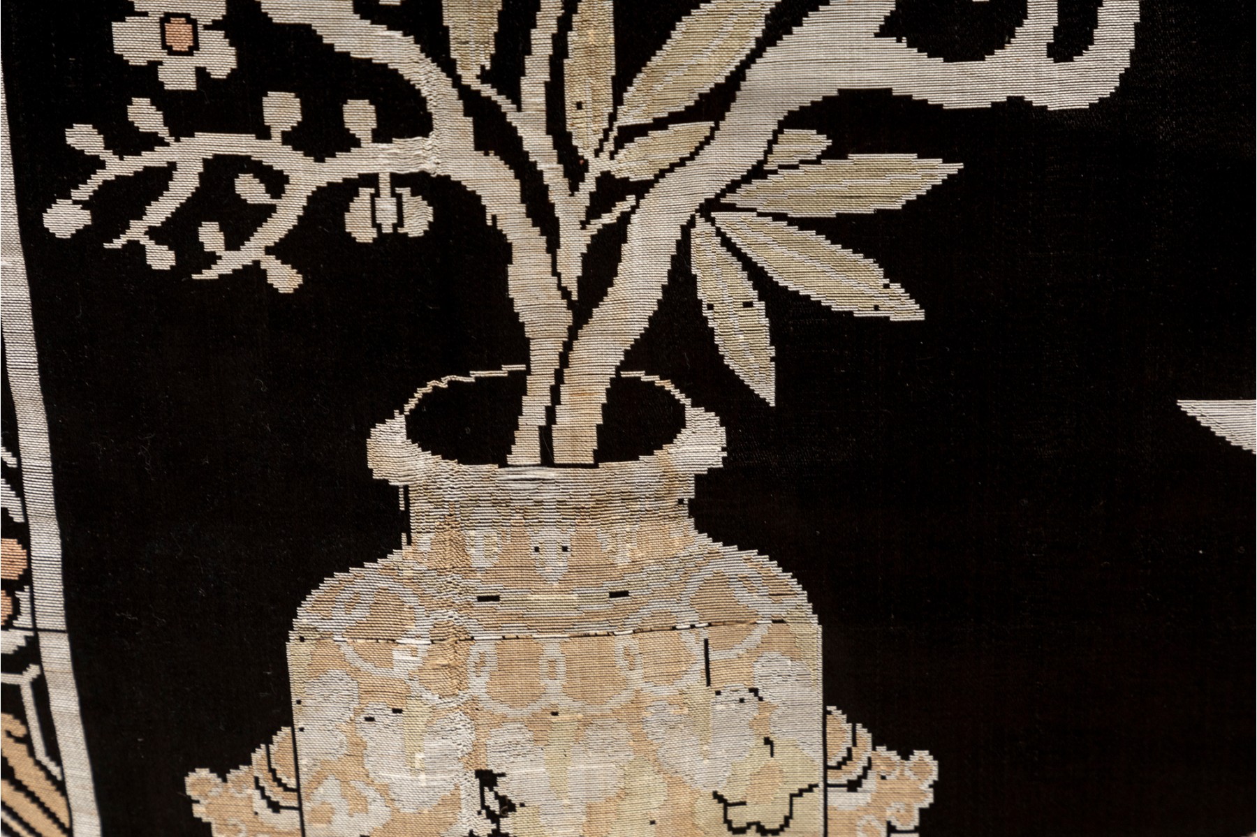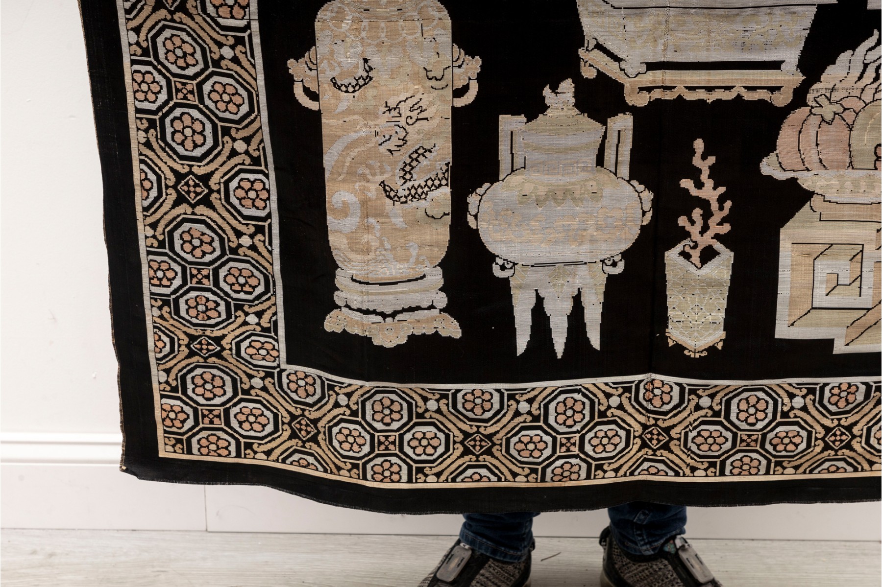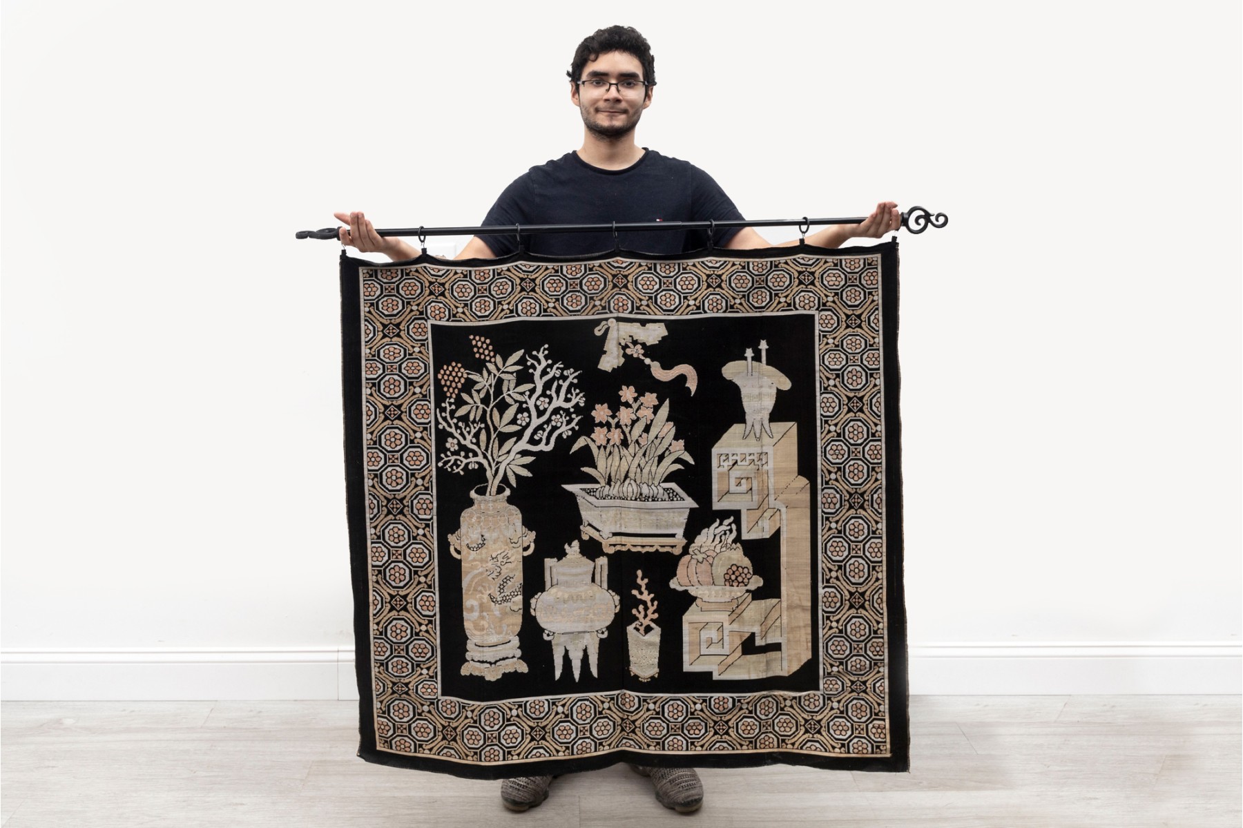 A vintage Chinese silk panel embroidered with potted plants over a black field -- often referred to as 'garden' tapestries.