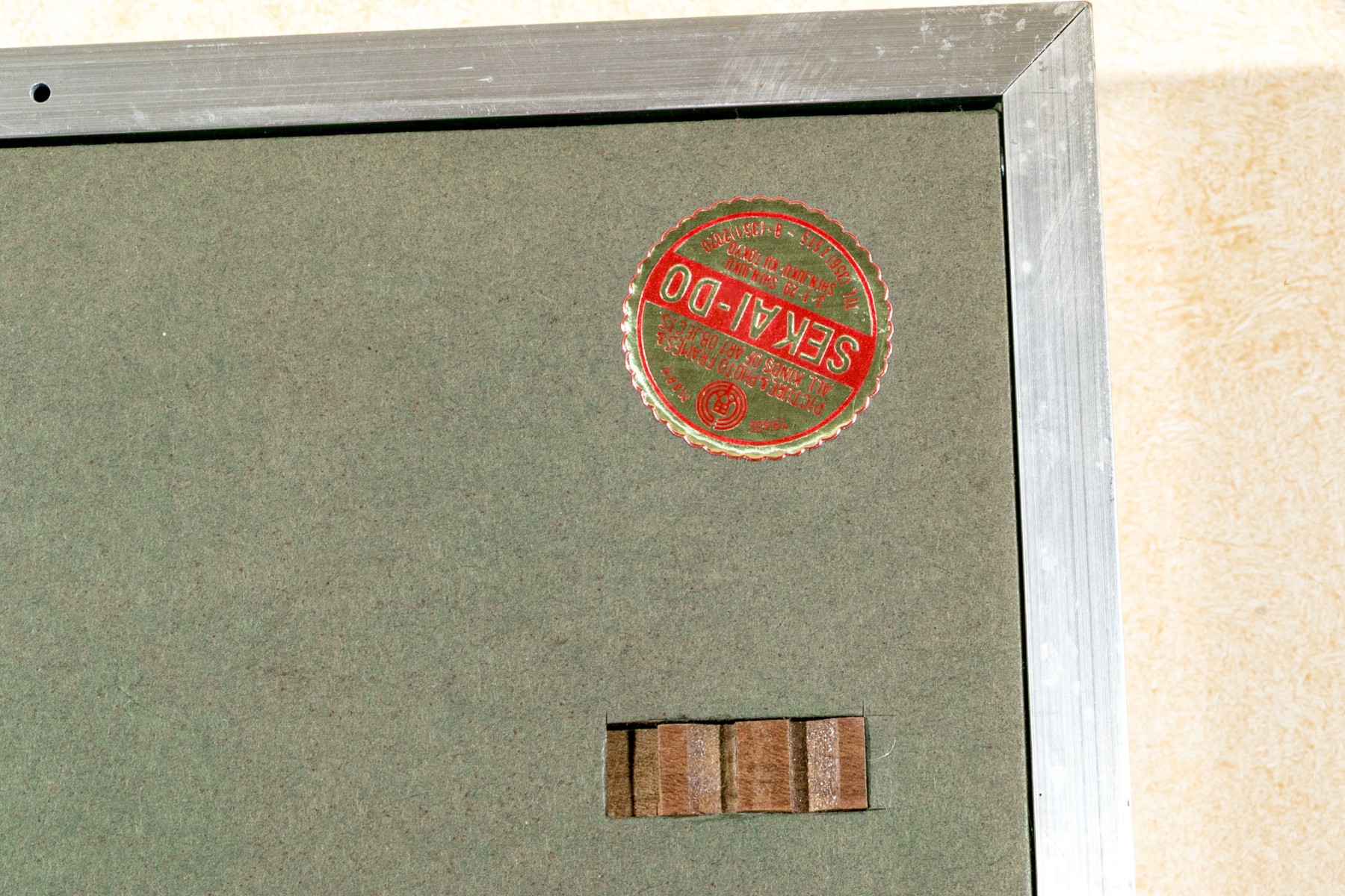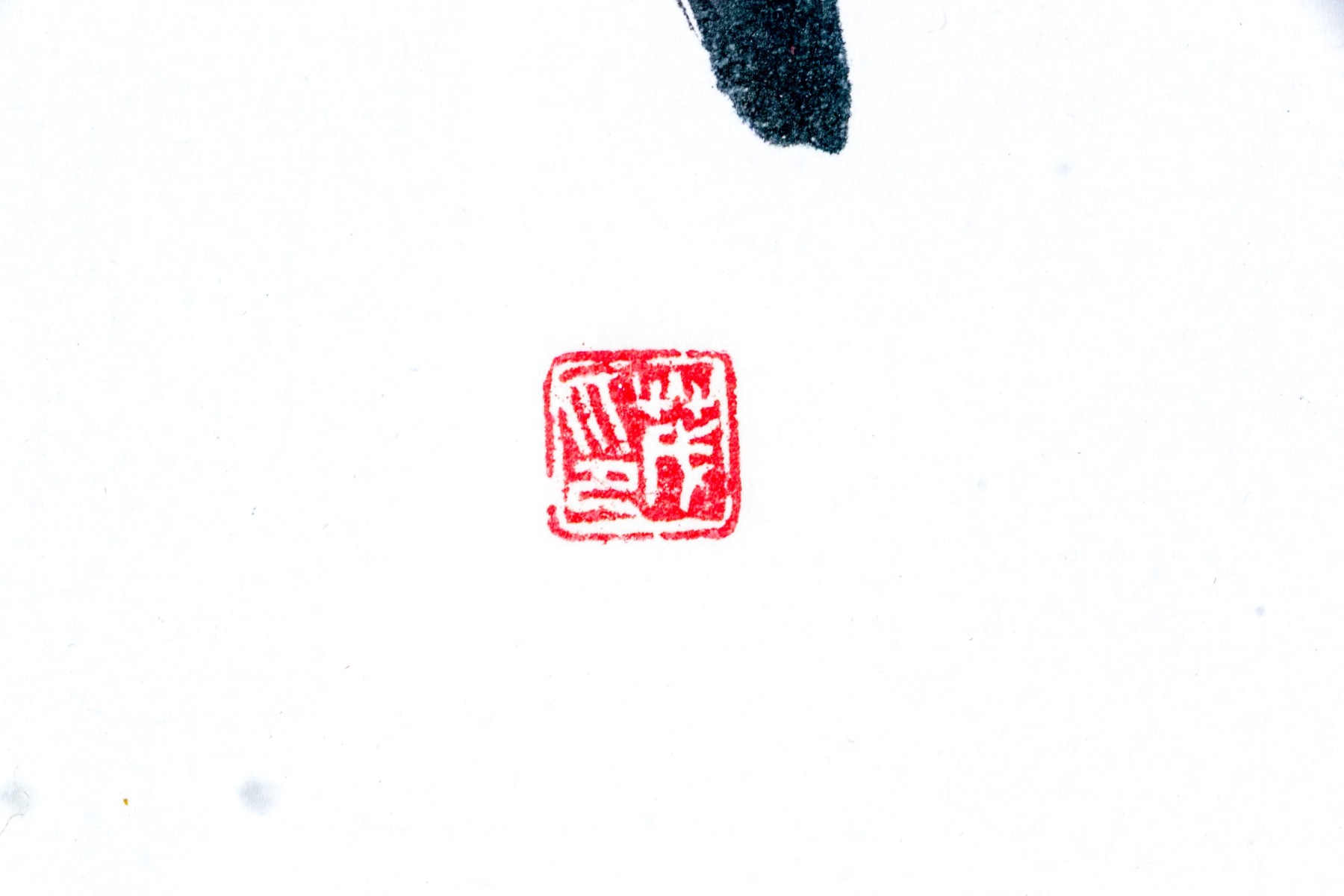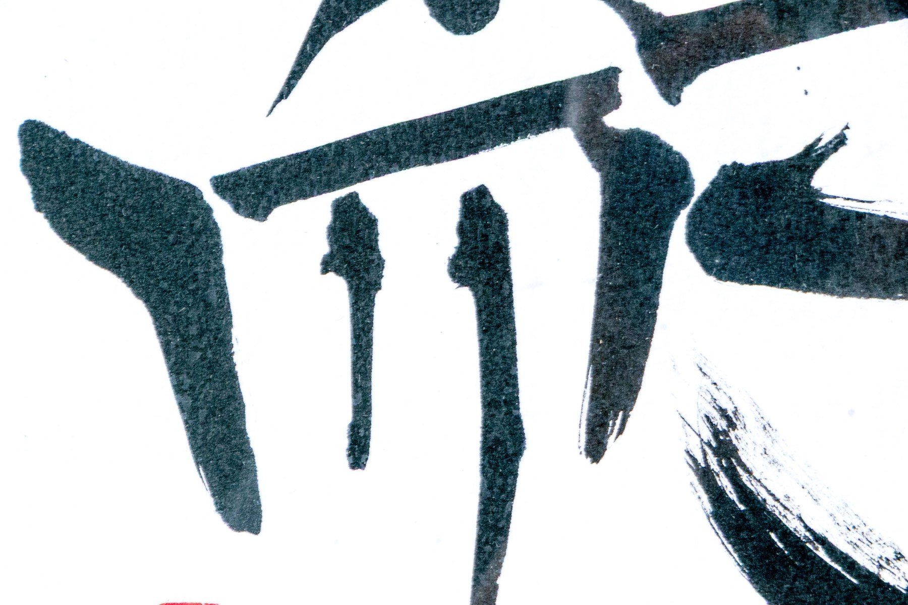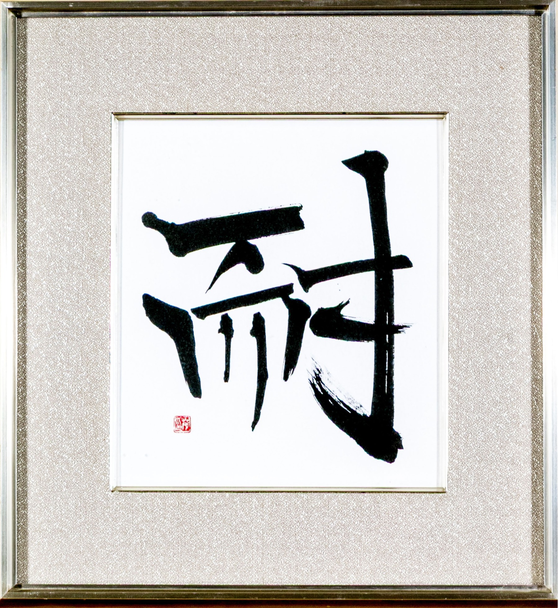 A wonderful Chinese calligraphy depicting the character "耐" (nài) meaning to endure, withstand, or bear. With a red chop seal lower left. Displayed with a metallic gray mat and fillet in a metallic gray frame.