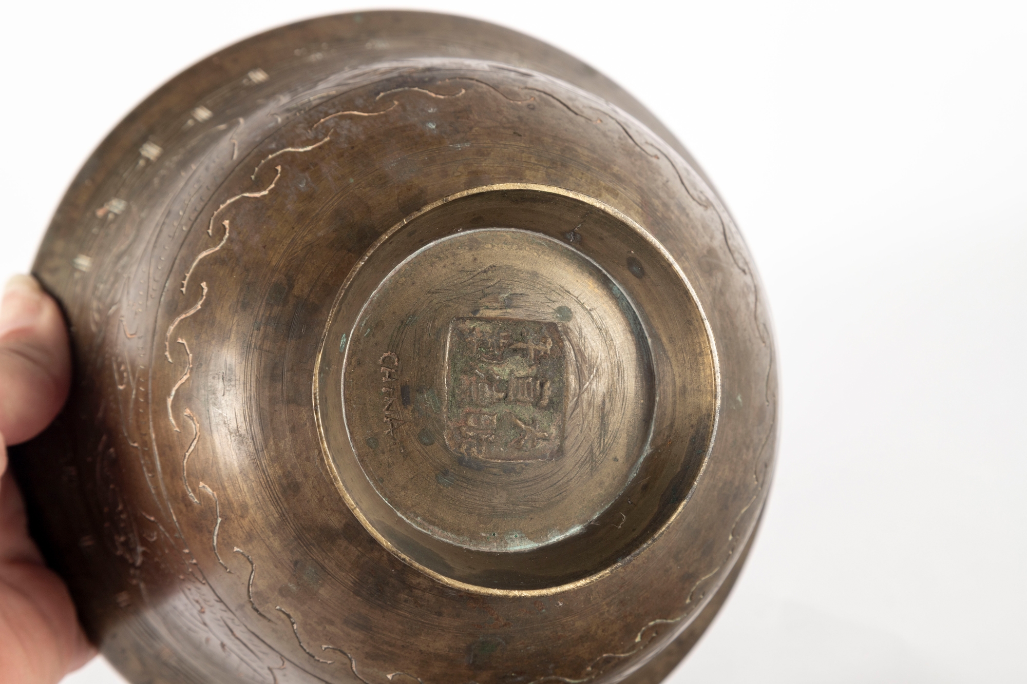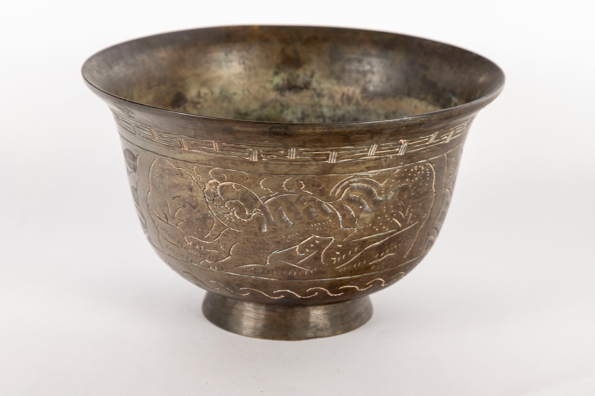 An antique decorative Chinese brass bowl featuring intricate engraved detailing with foo dog/guardian lion motifs.