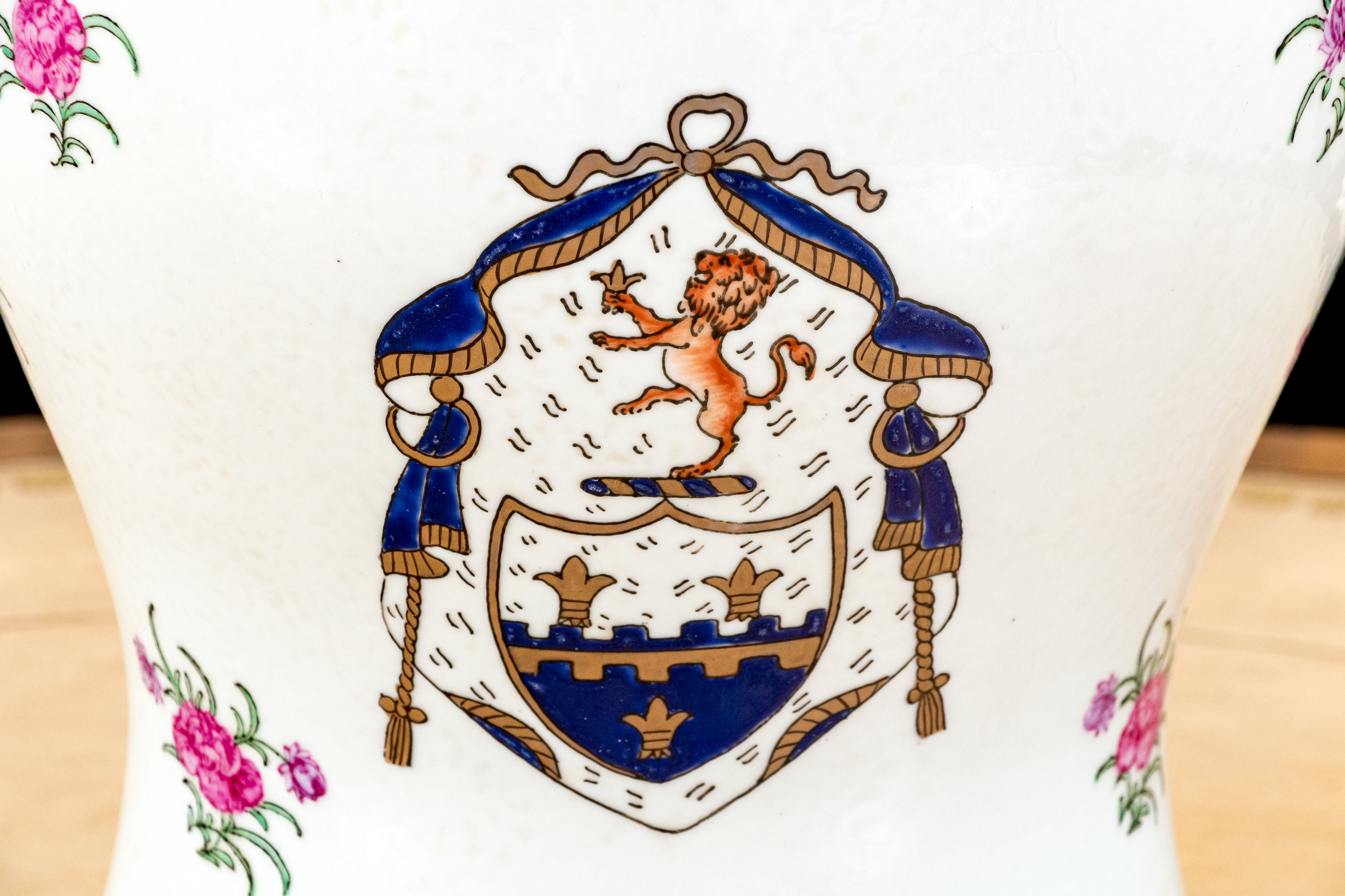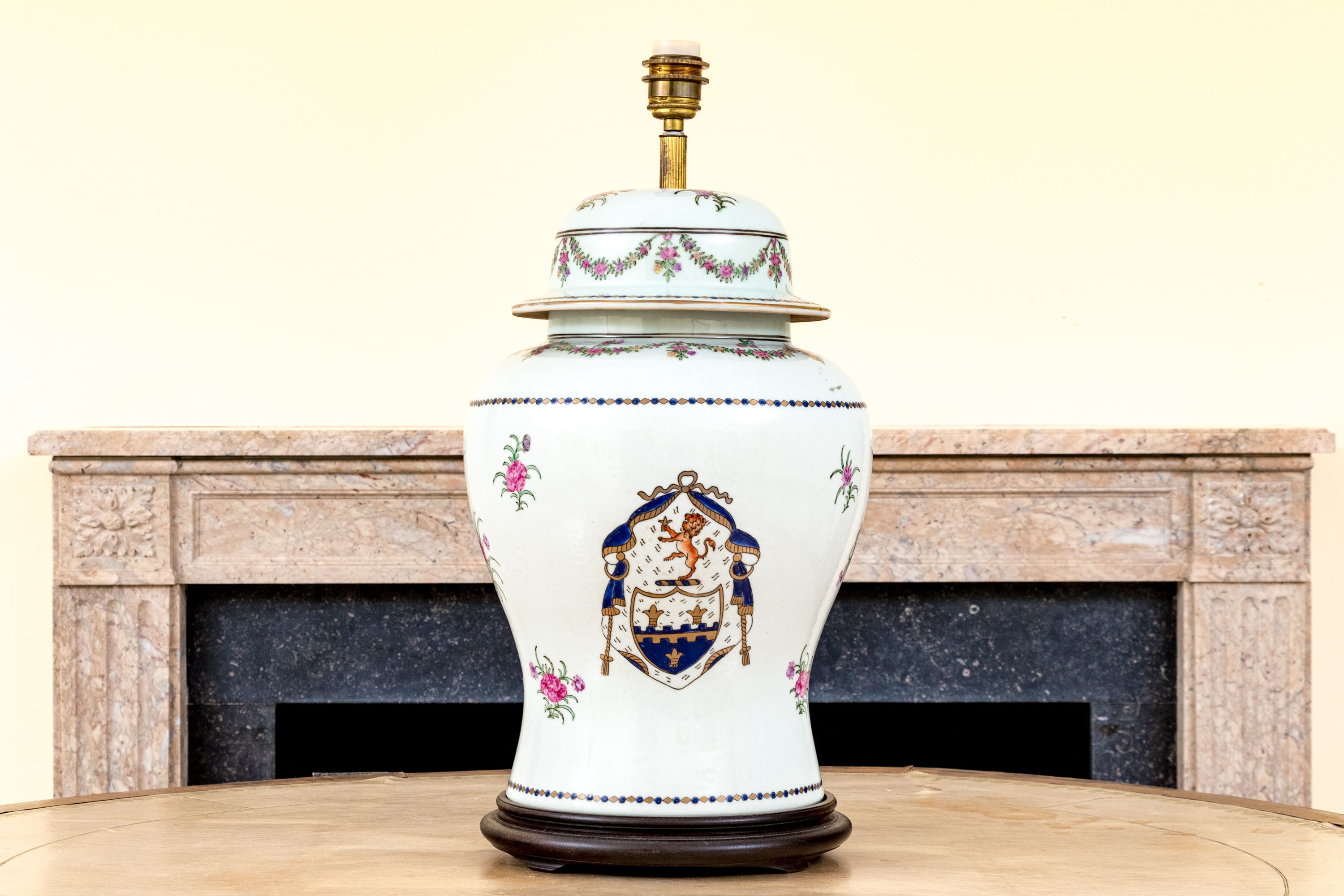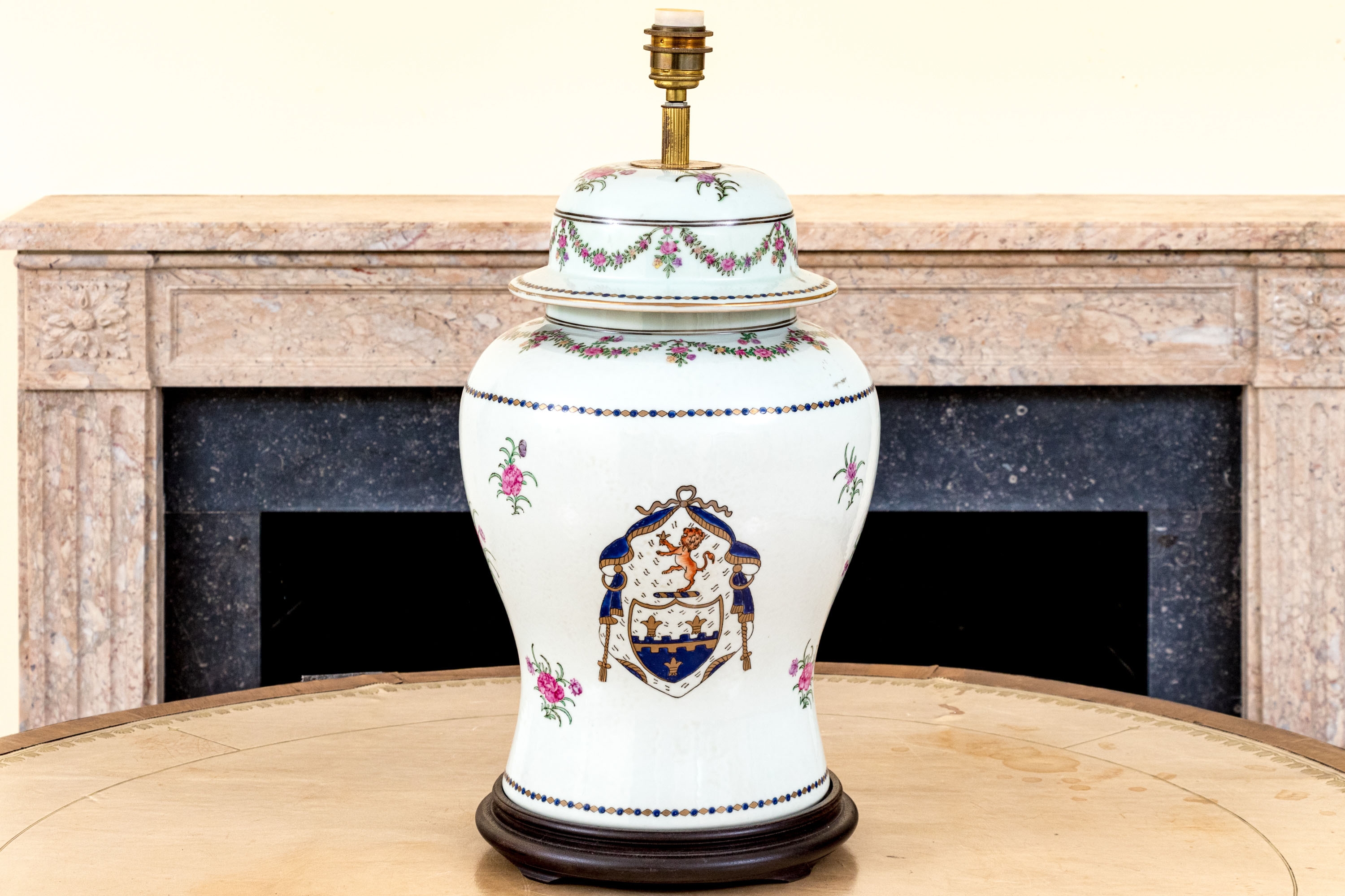 A fantastic Chinese export armorial style porcelain jar mounted as a table lamp, showcasing a domed lid over an elegant body with rotund shoulders tapering to a cylindrical foot. The jar is decorated with pretty pink and yellow floral swags and blue and gilt diamond-motif borders, leading to a heraldic center with a lion over a shield under blue drapery. The jar is displayed with a dark brown turned wood base on stout feet.