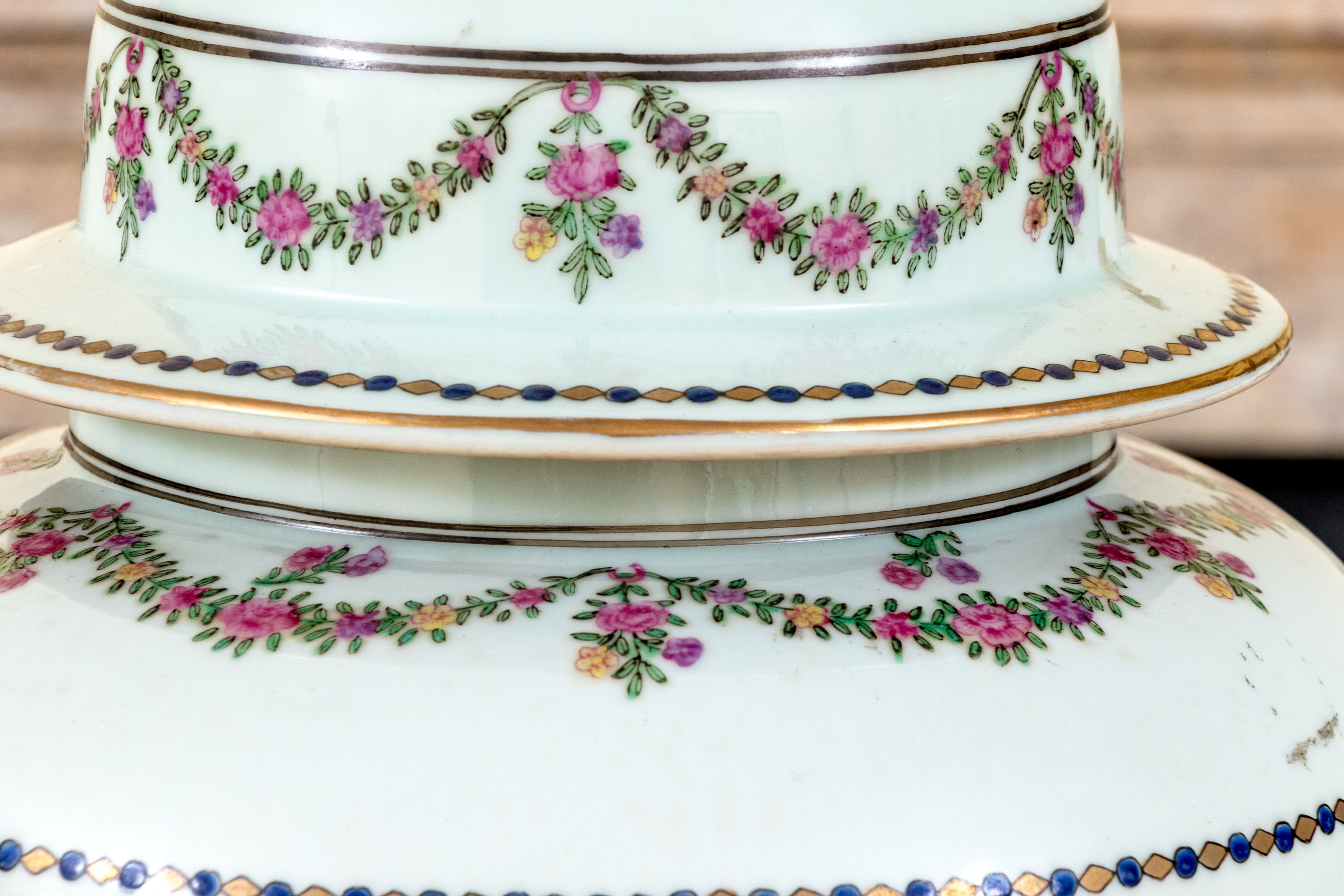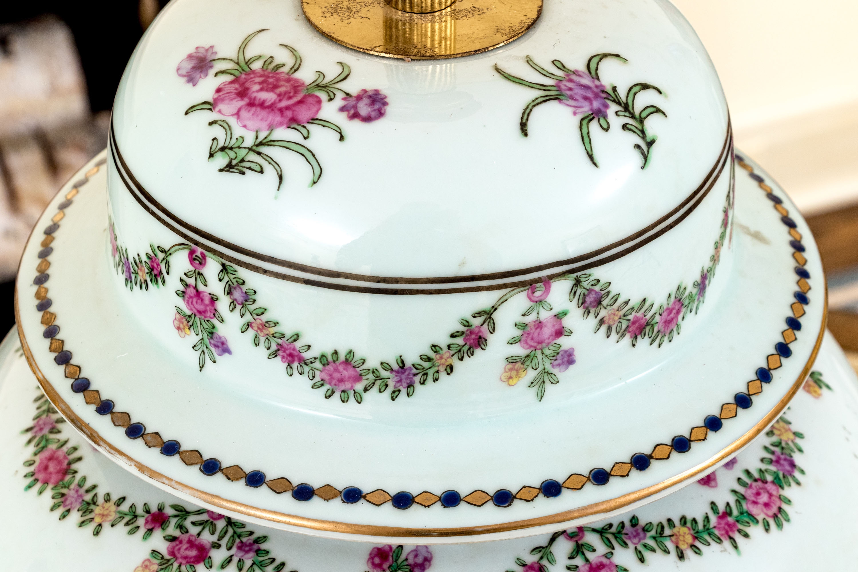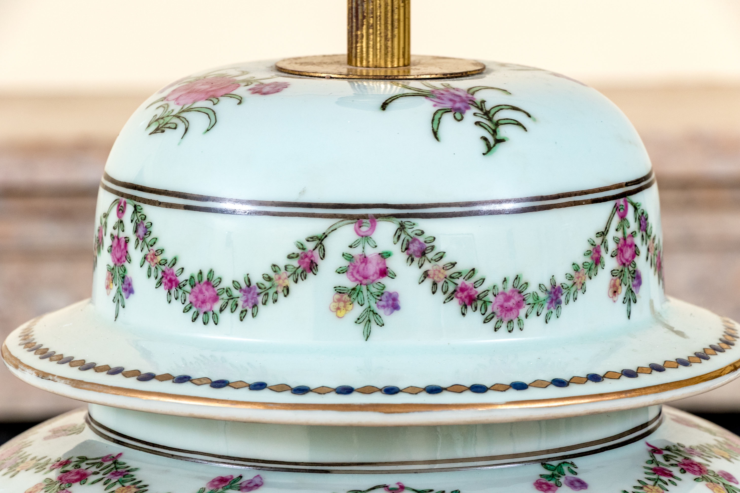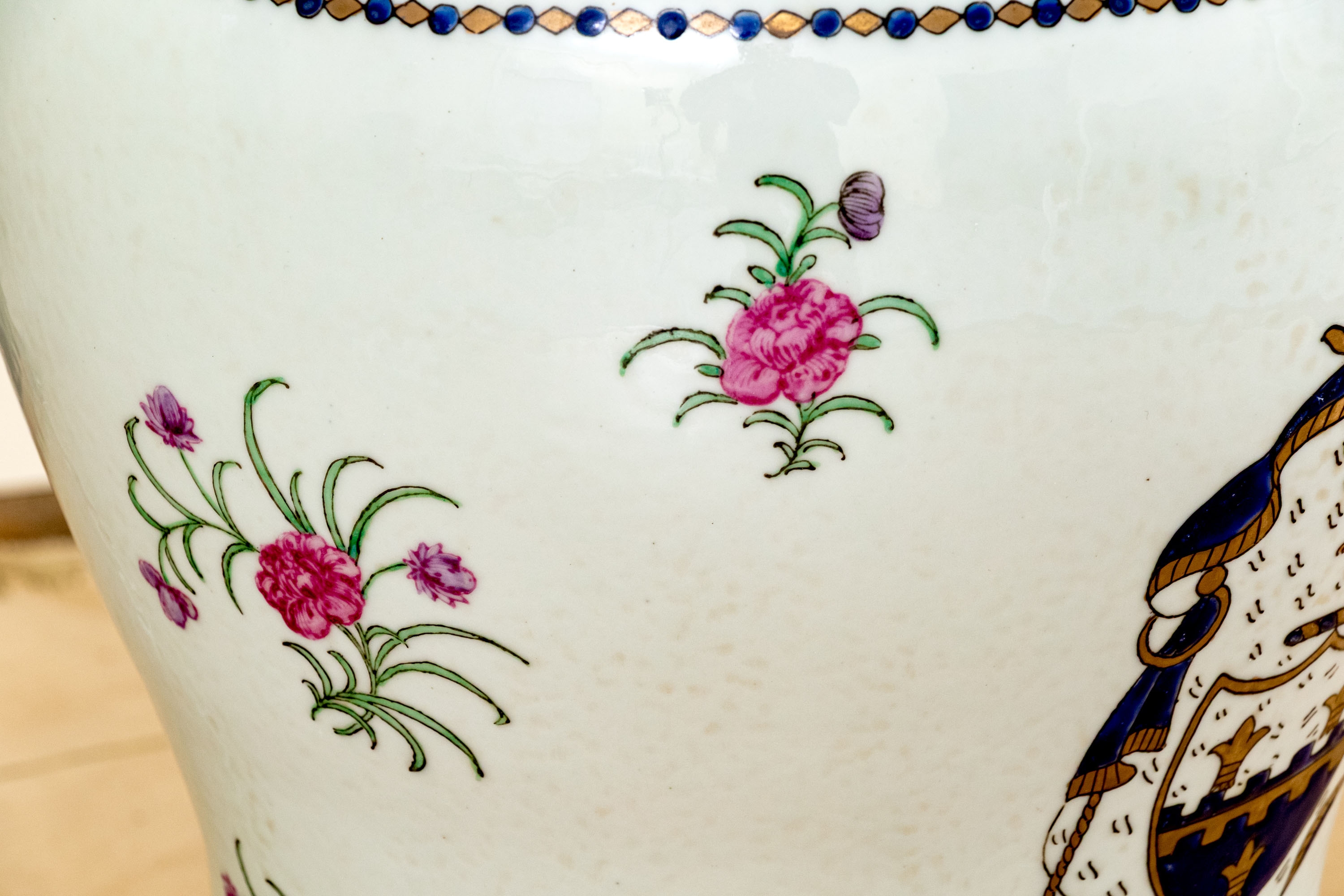 A fantastic Chinese export armorial style porcelain jar mounted as a table lamp, showcasing a domed lid over an elegant body with rotund shoulders tapering to a cylindrical foot. The jar is decorated with pretty pink and yellow floral swags and blue and gilt diamond-motif borders, leading to a heraldic center with a lion over a shield under blue drapery. The jar is displayed with a dark brown turned wood base on stout feet.