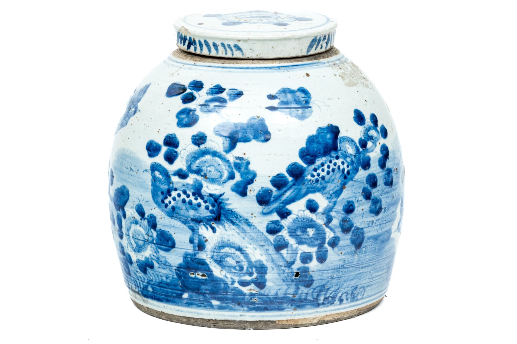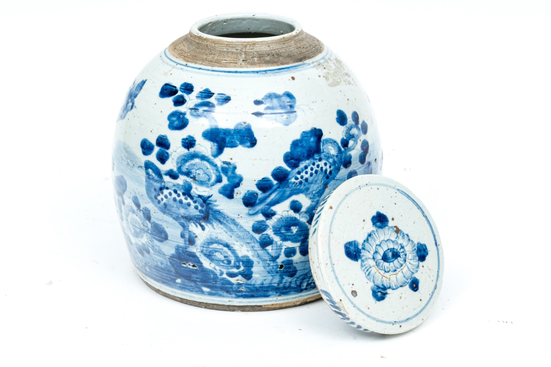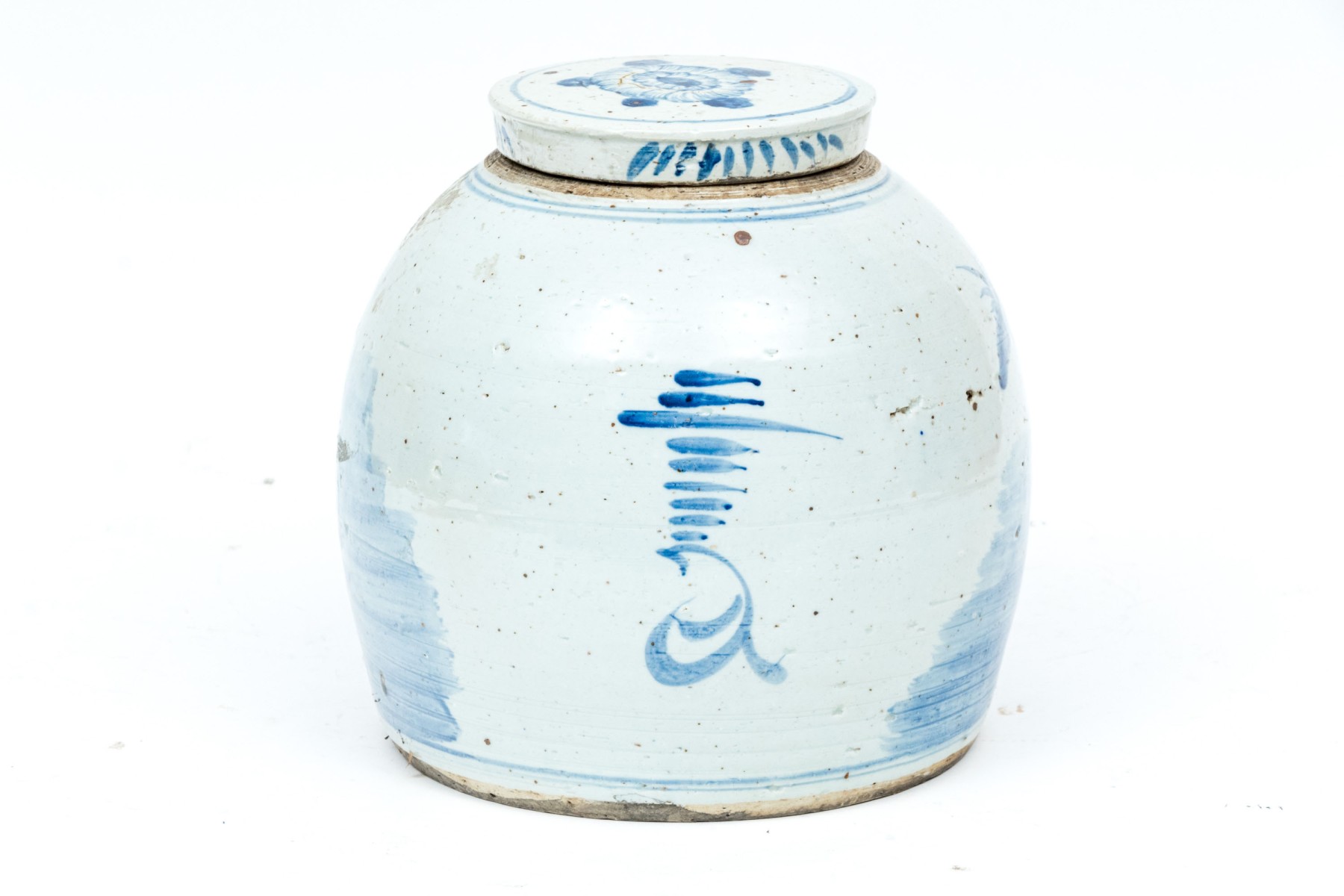 A Chinese export style blue and white oversized porcelain ginger jar with its circular lid.