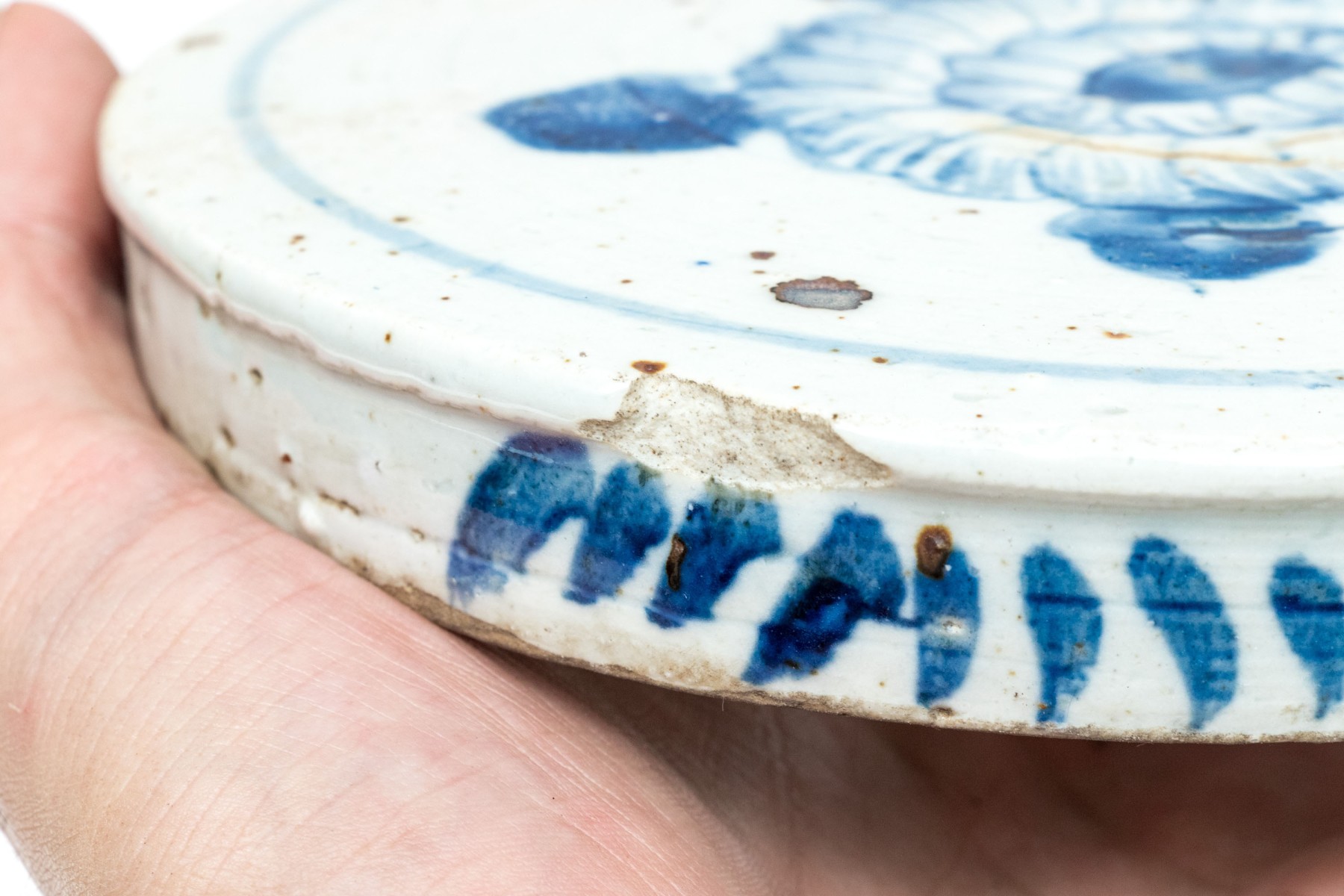 There is a spot where a label had left sticky residue, some chipping and losses to the porcelain notable around the trim of the lid. Please review the photos as they are part of the condition report.
