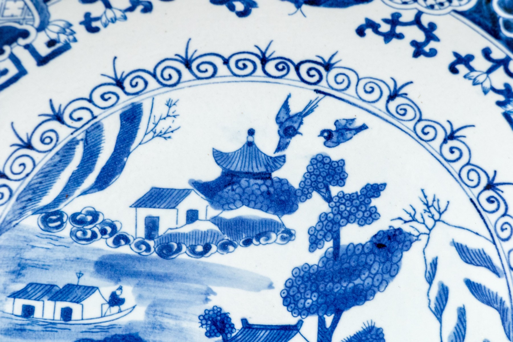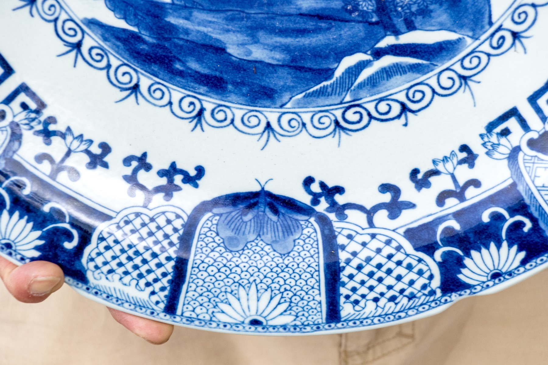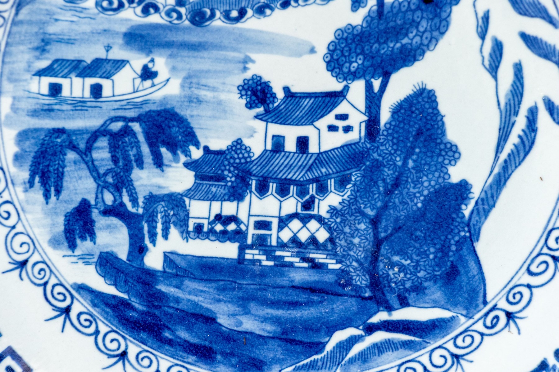 A gorgeous 20th century Chinese export blue and white porcelain charger with a scalloped rim with ornate petaled scenes of flowers and geometric motifs. A Blue Willow or Canton style scene at the center reserve depicts an architectural landscape with lush trees, cliffs, and two birds flying overhead. Finished with three decorative grassy sprays to the underside.