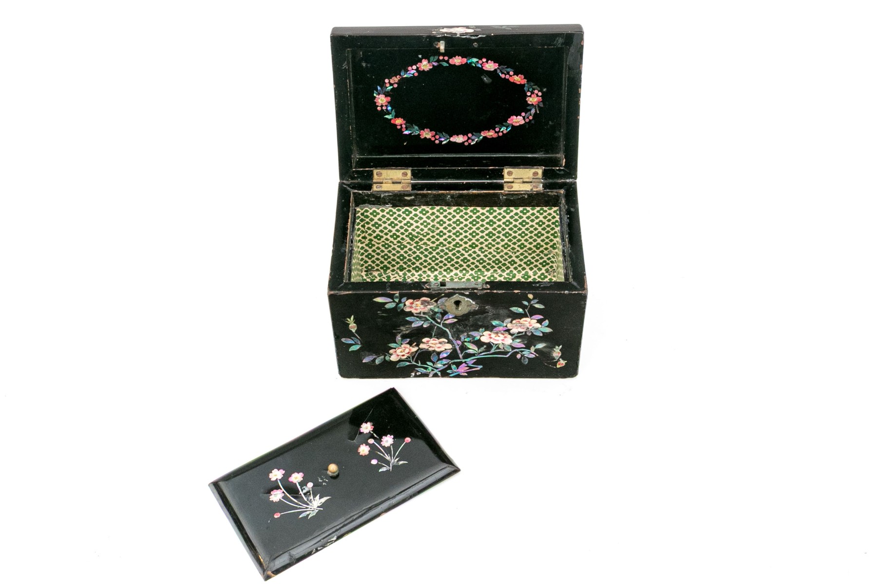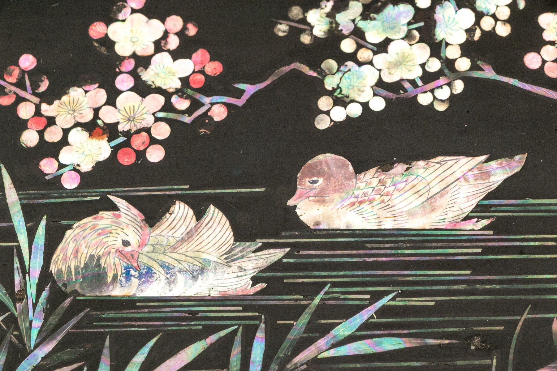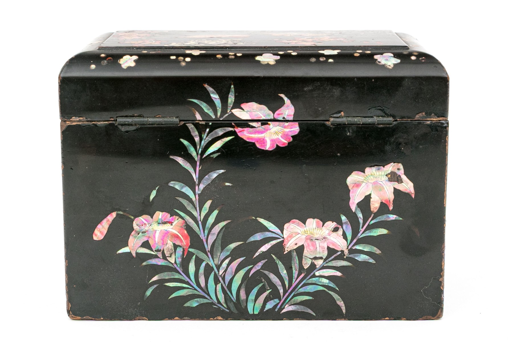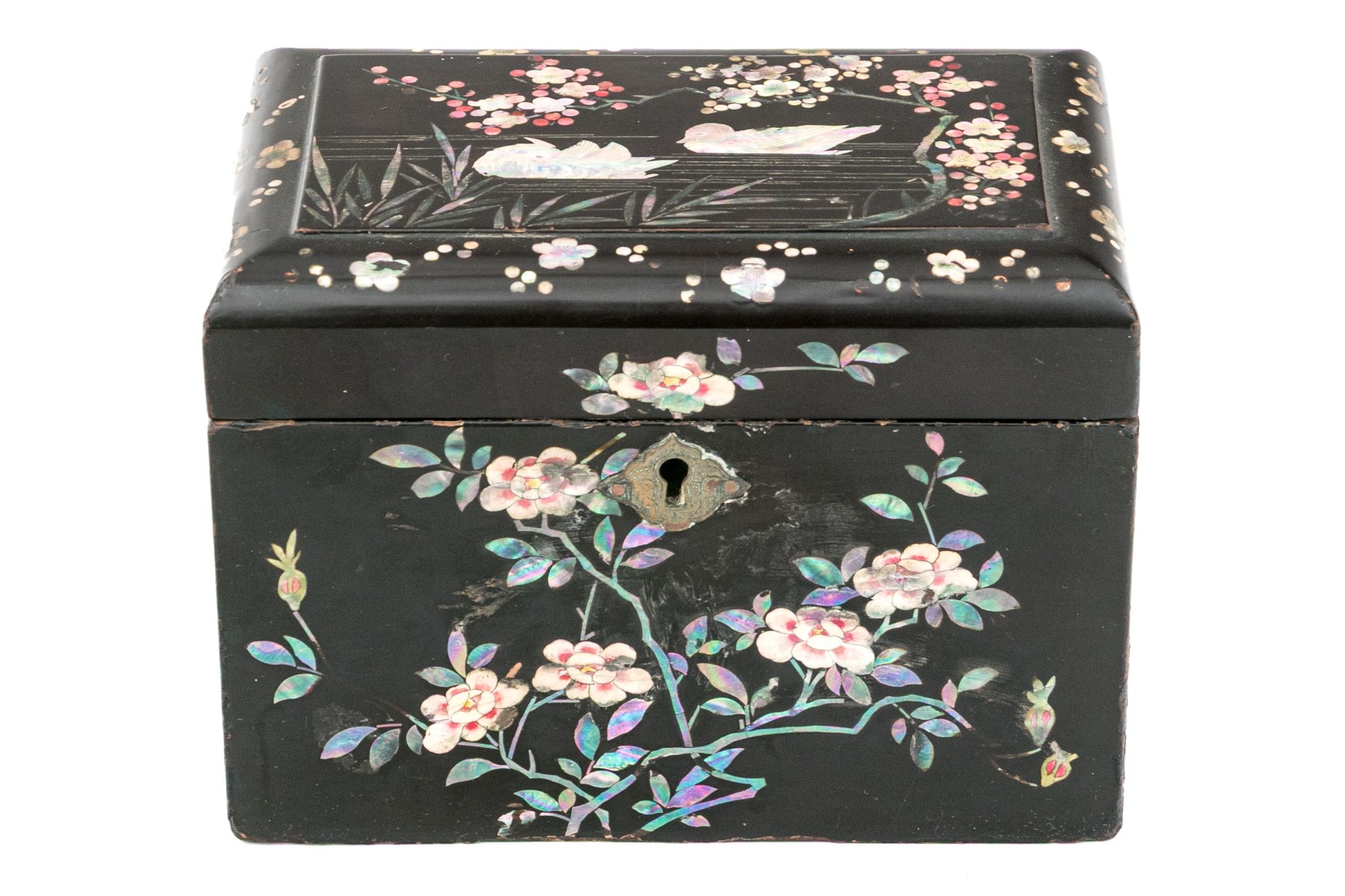 A beautiful Asian lacquered tea caddy in classic black, wonderfully detailed with fine mother of pearl inlaid marquetry of dainty floral sprays in iridescent green, pink, purple, and blue. The lid features a rounded top with a rectangular center scene depicting two ducks floating on a pond under a flowering branch, opening to a floral wreath on the lid interior and a green and white patterned paper liner within an interior lidded compartment.