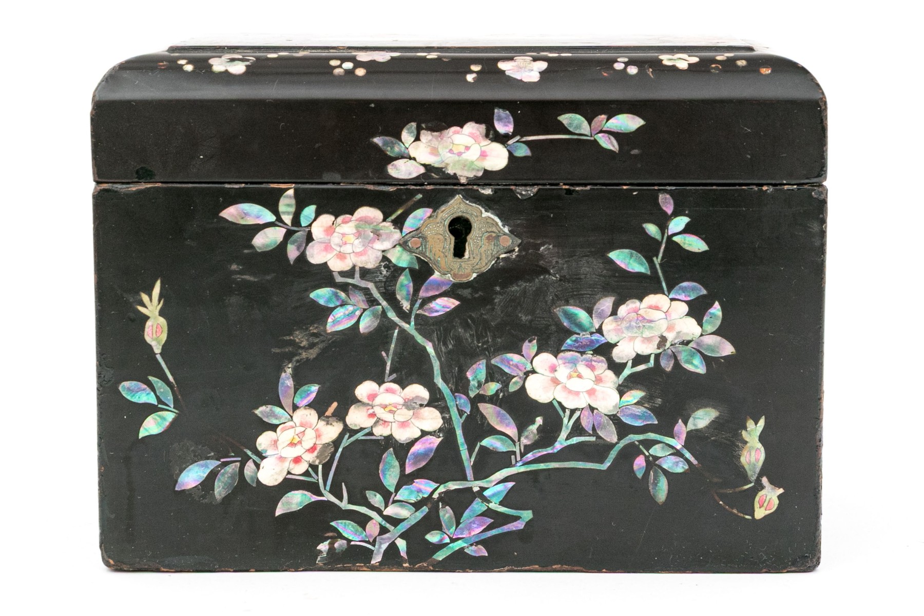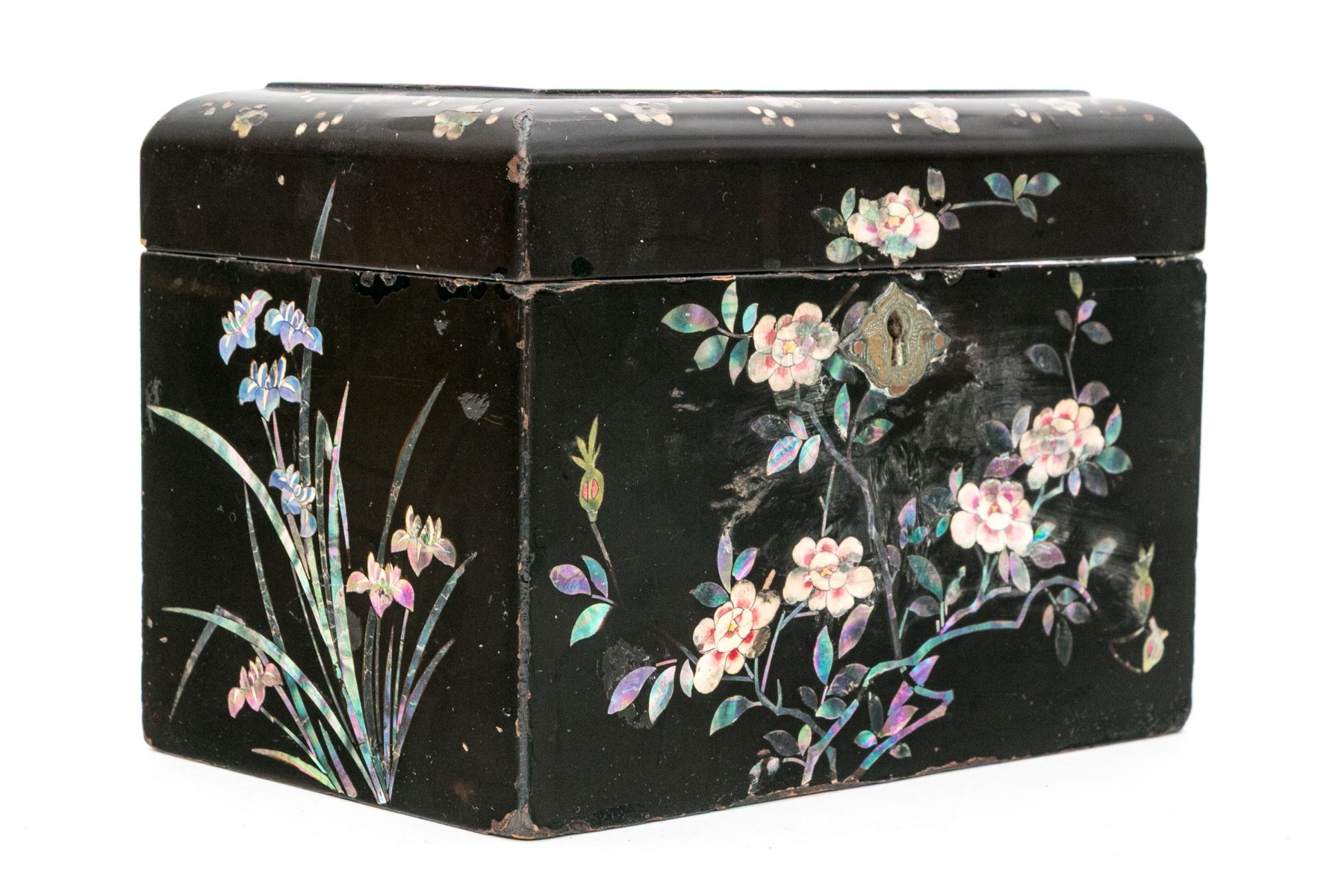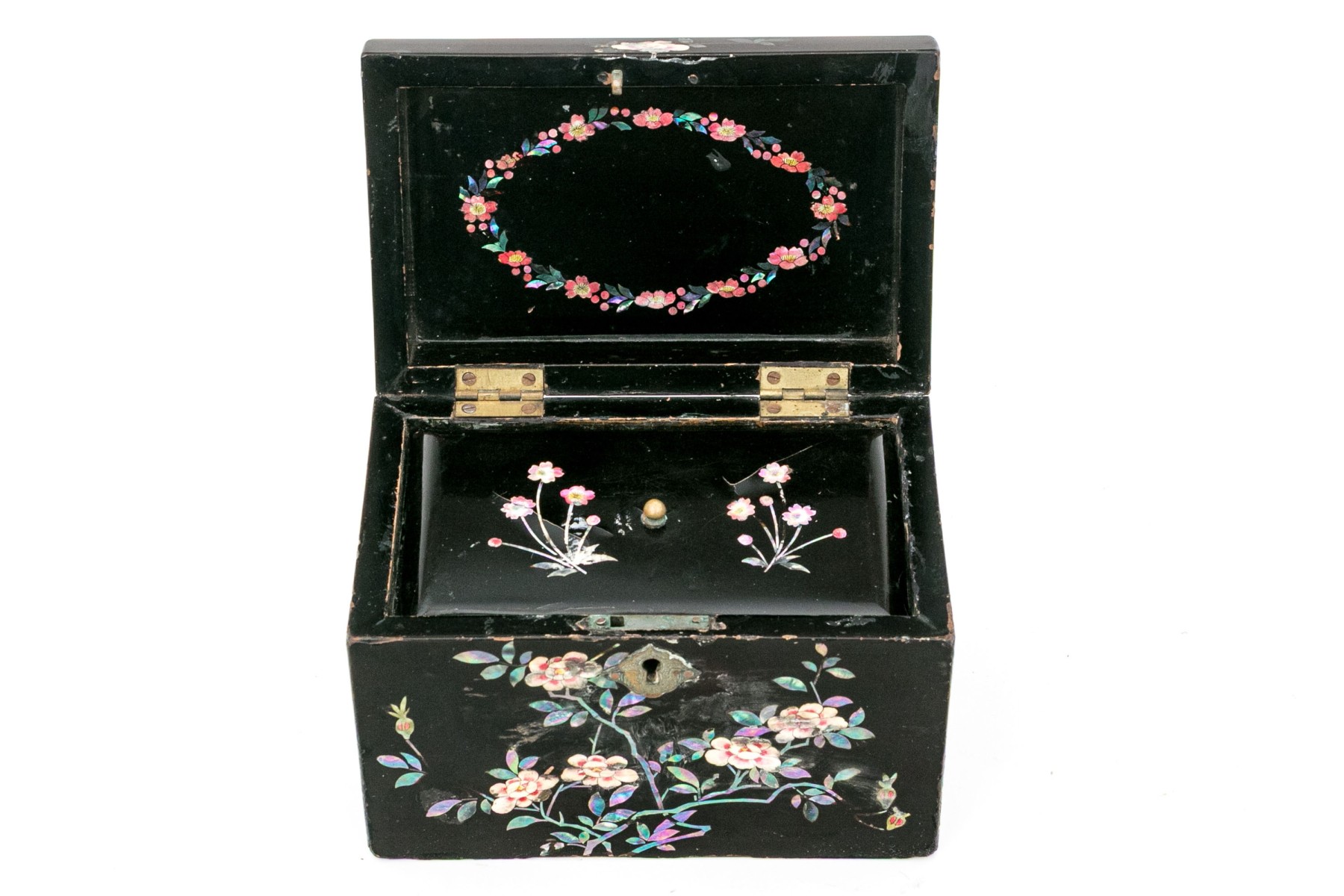 A beautiful Asian lacquered tea caddy in classic black, wonderfully detailed with fine mother of pearl inlaid marquetry of dainty floral sprays in iridescent green, pink, purple, and blue. The lid features a rounded top with a rectangular center scene depicting two ducks floating on a pond under a flowering branch, opening to a floral wreath on the lid interior and a green and white patterned paper liner within an interior lidded compartment.