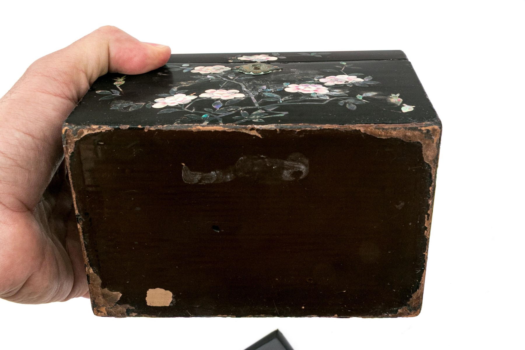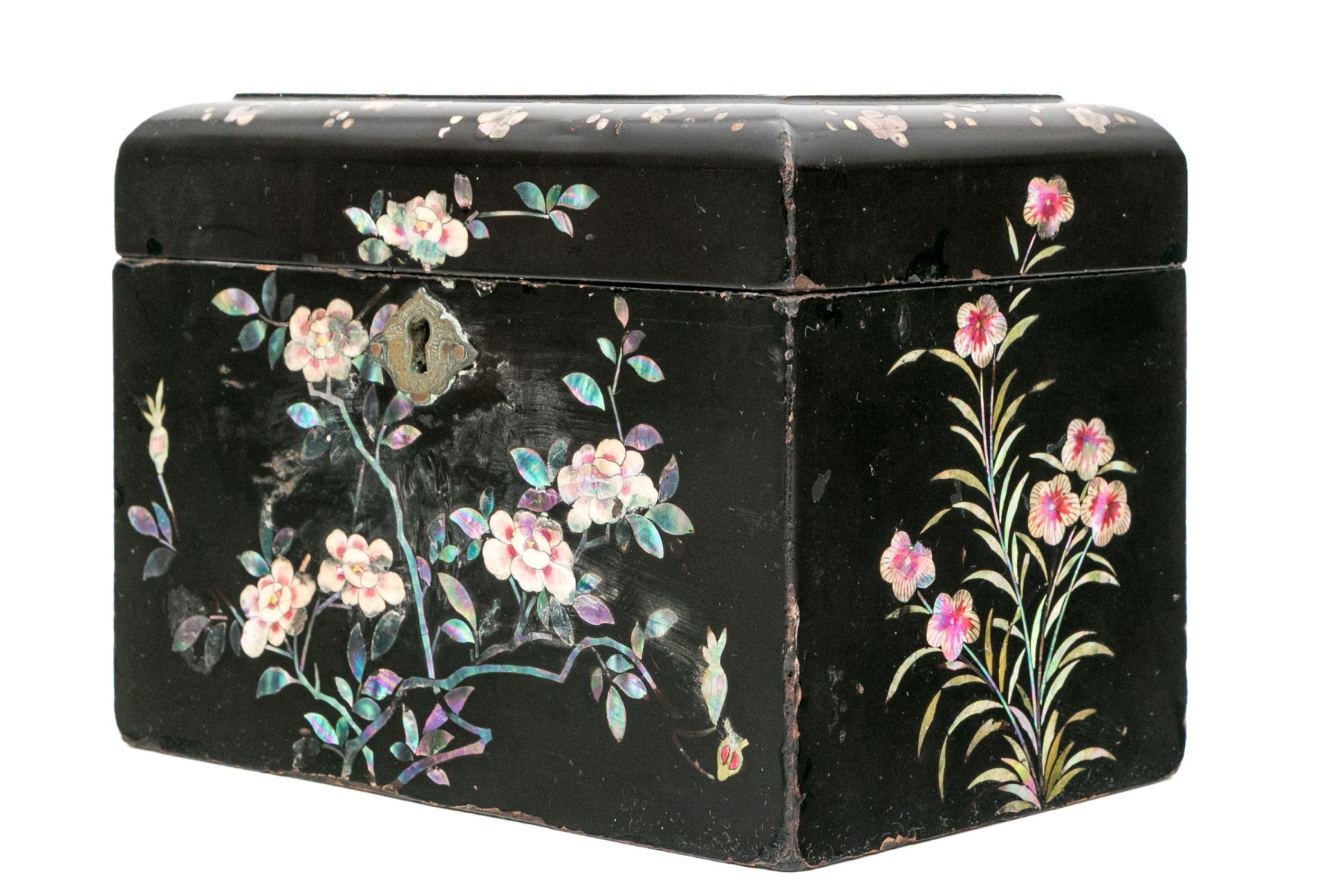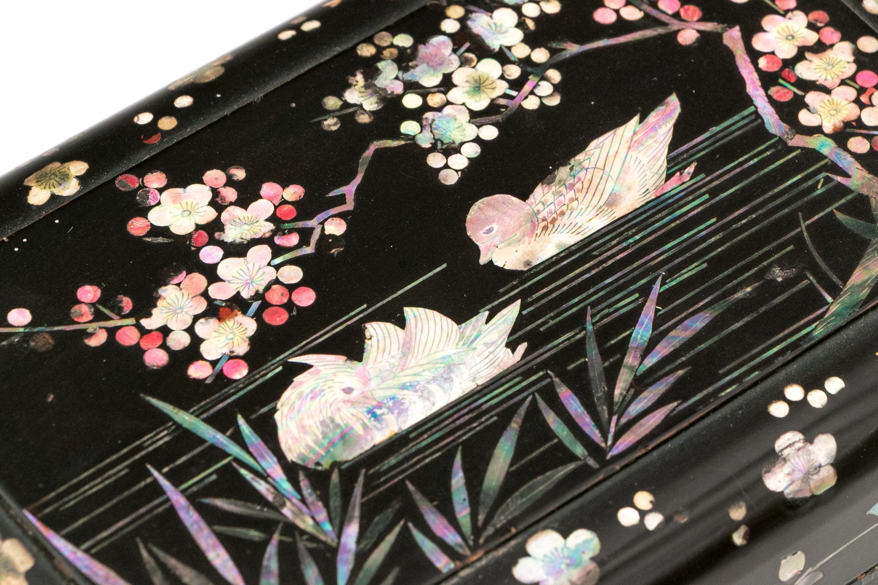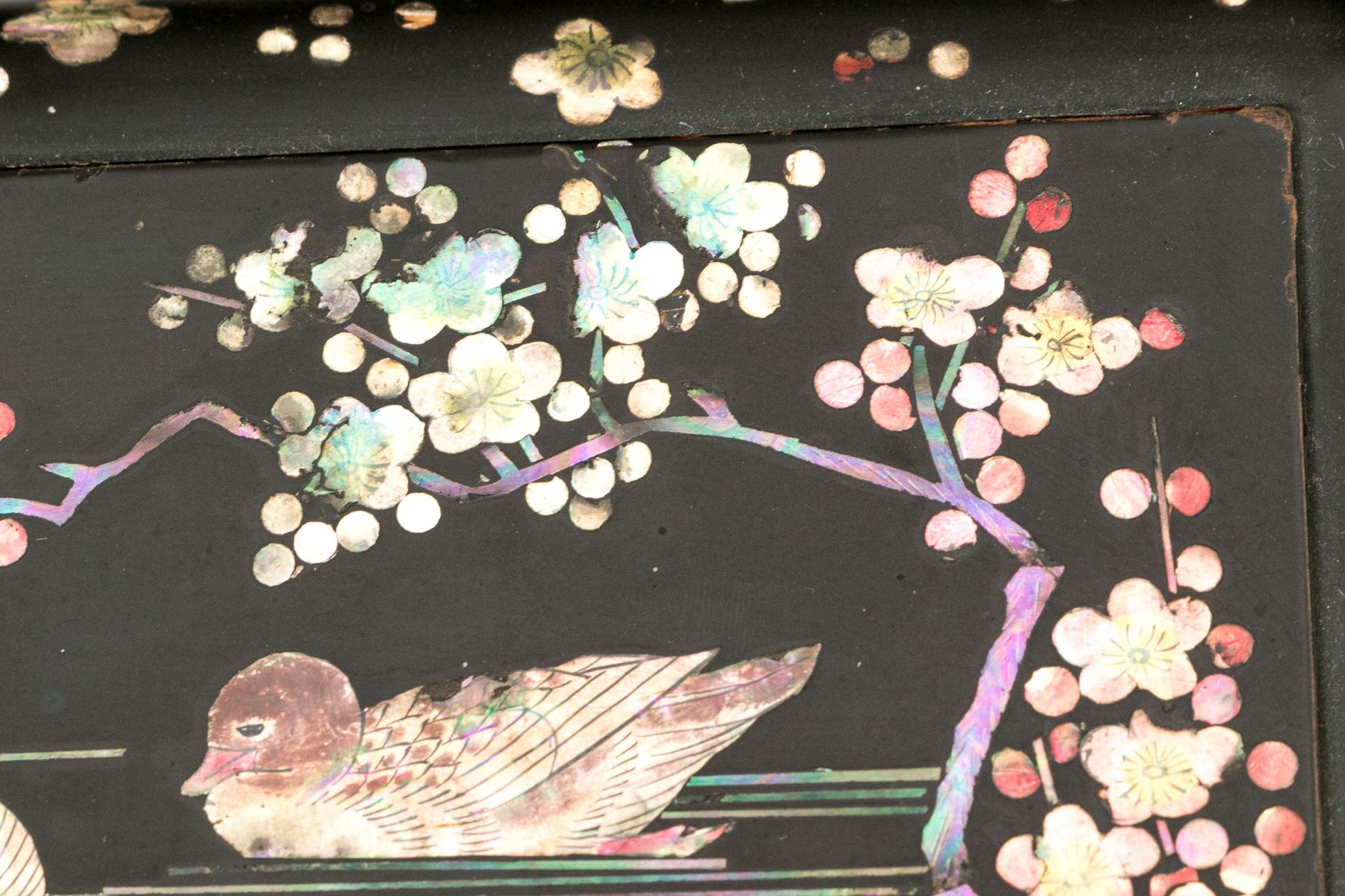 A beautiful Asian lacquered tea caddy in classic black, wonderfully detailed with fine mother of pearl inlaid marquetry of dainty floral sprays in iridescent green, pink, purple, and blue. The lid features a rounded top with a rectangular center scene depicting two ducks floating on a pond under a flowering branch, opening to a floral wreath on the lid interior and a green and white patterned paper liner within an interior lidded compartment.
