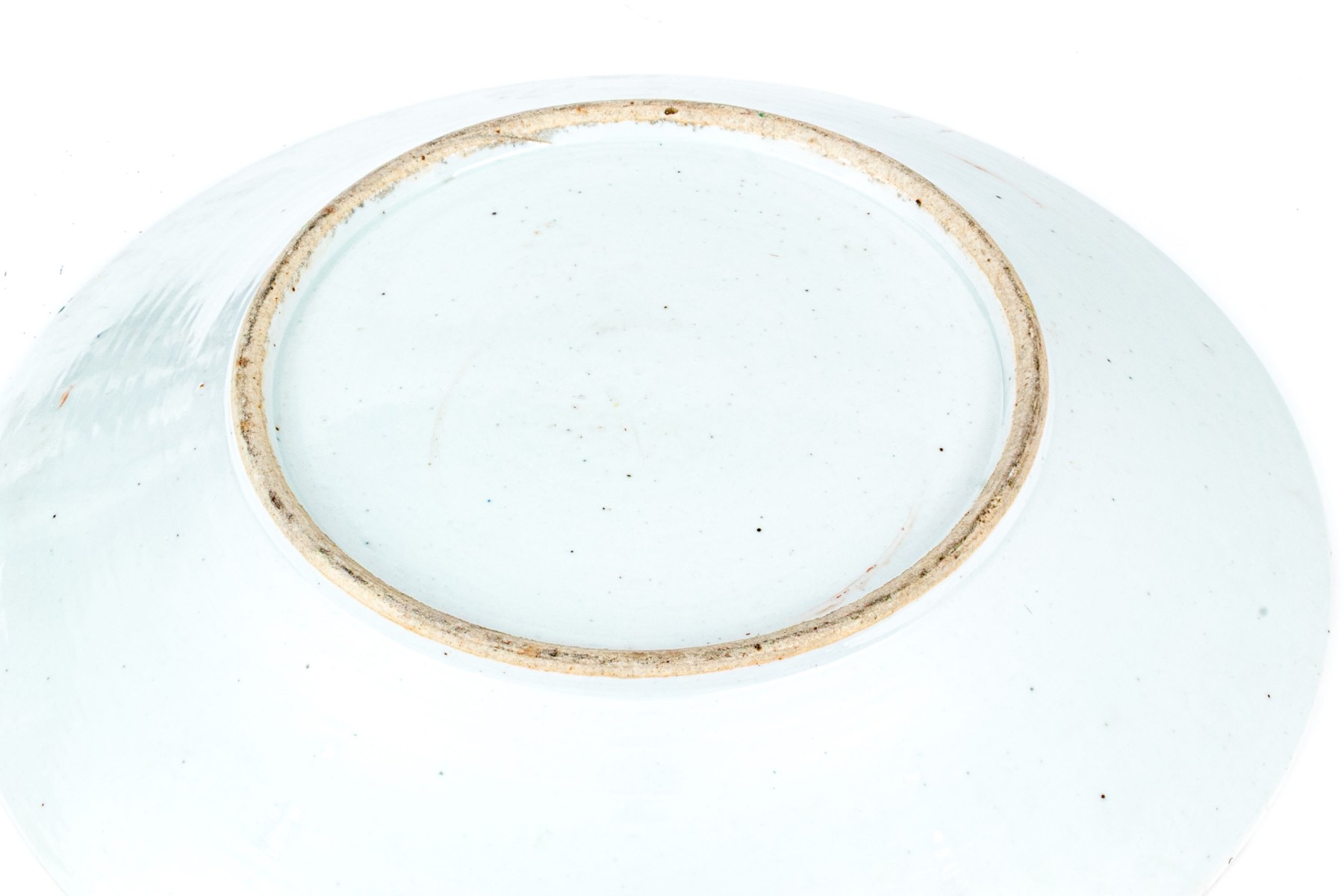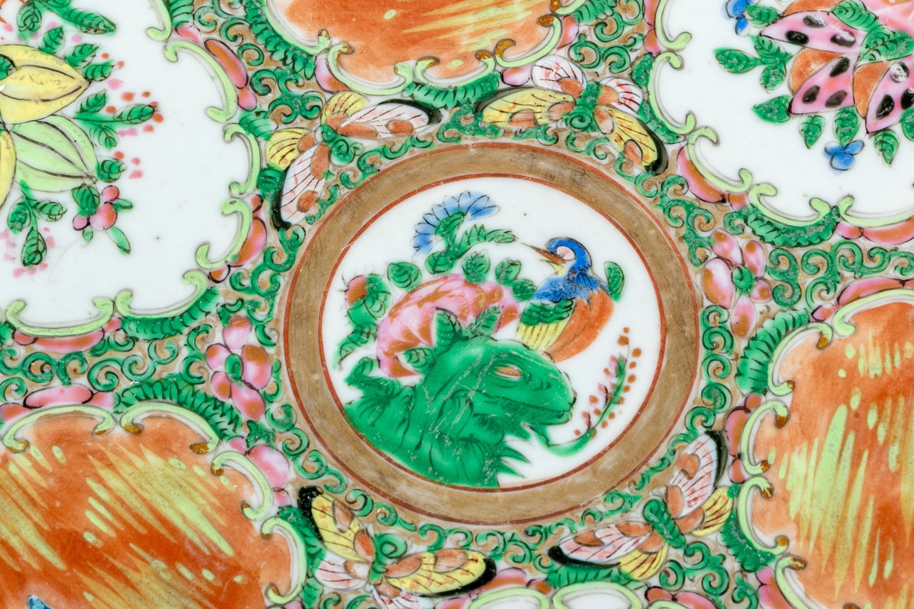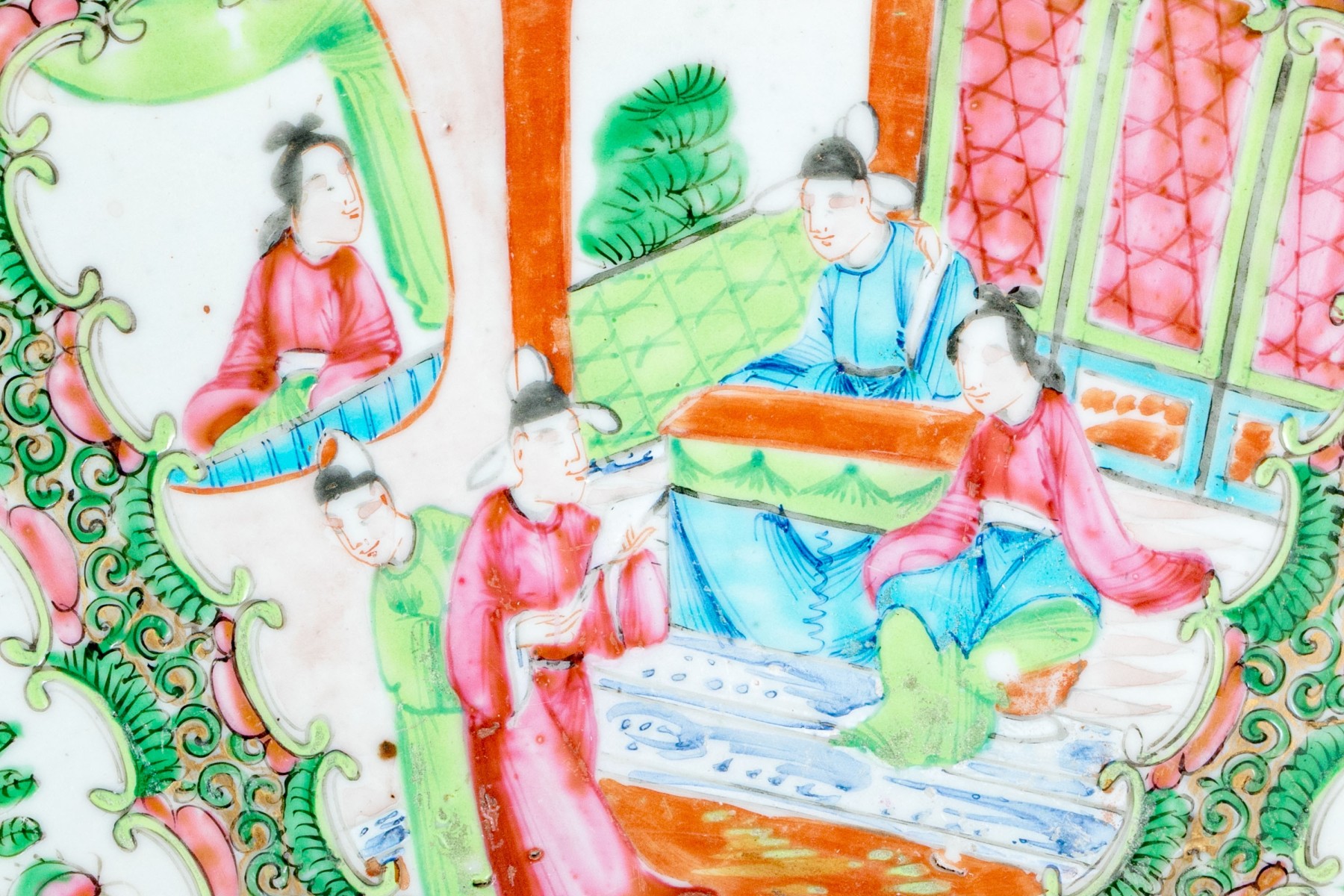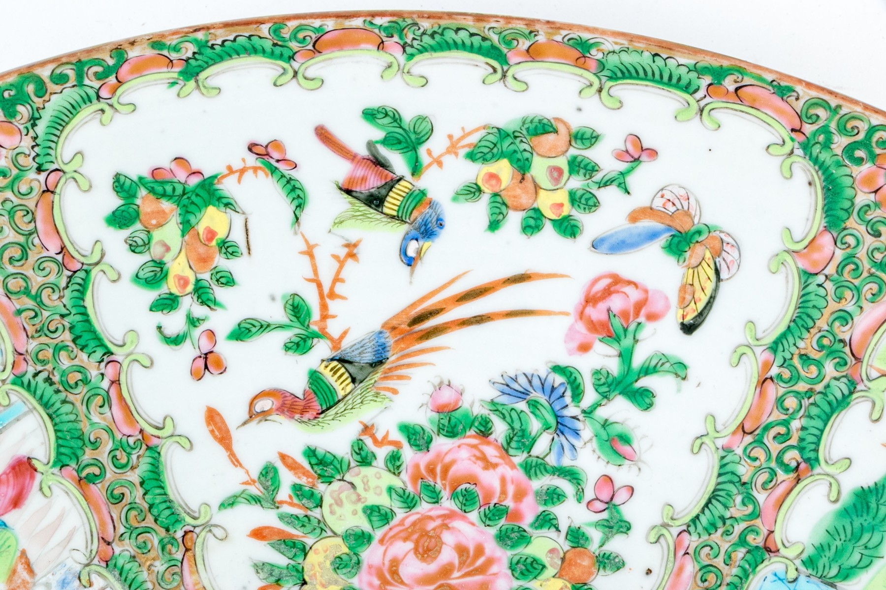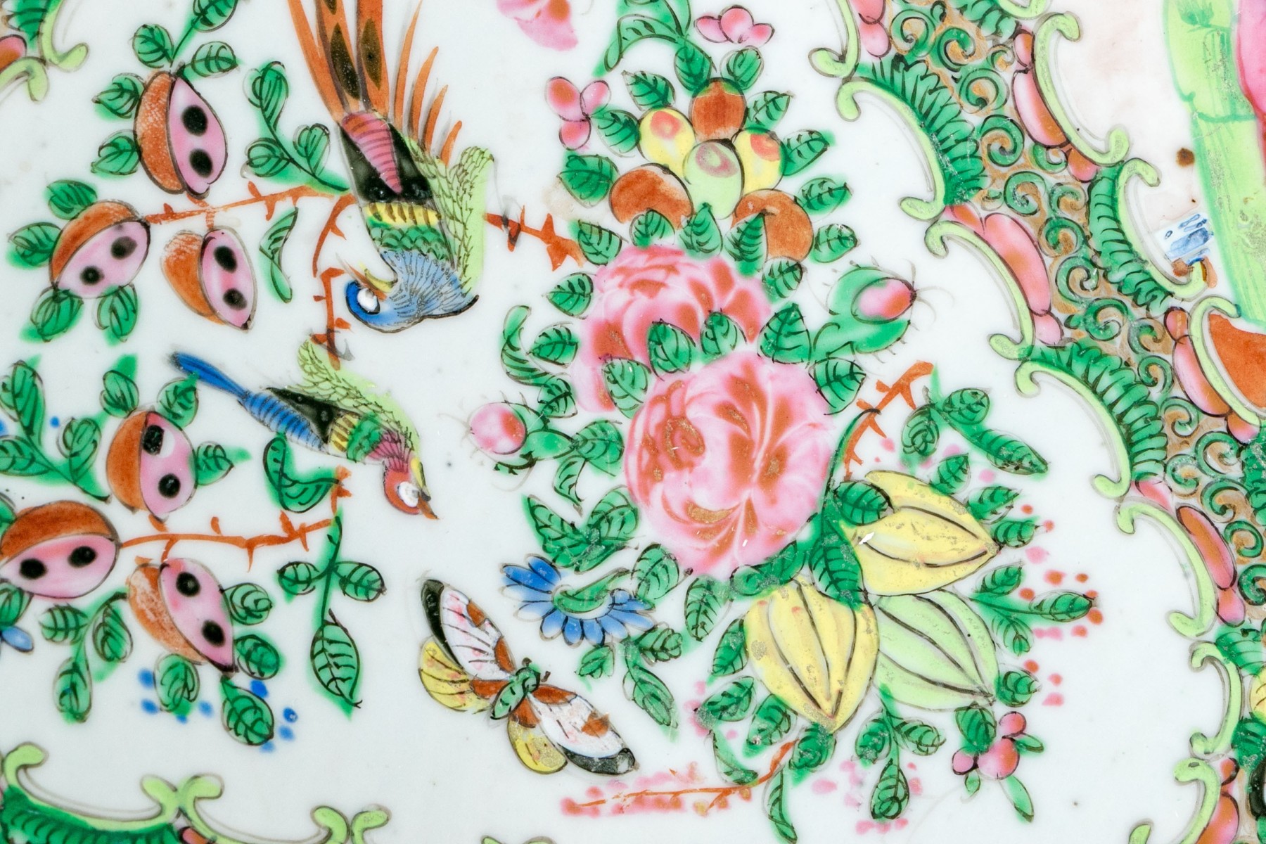 A gorgeous antique Chinese porcelain charger circa 1840 hand-decorated with classic rose medallion scenes of figures in palatial interiors, floral sprays, and colorful birds alternating with lush scalloped borders with yellow butterflies, green vines, and pink flowers.