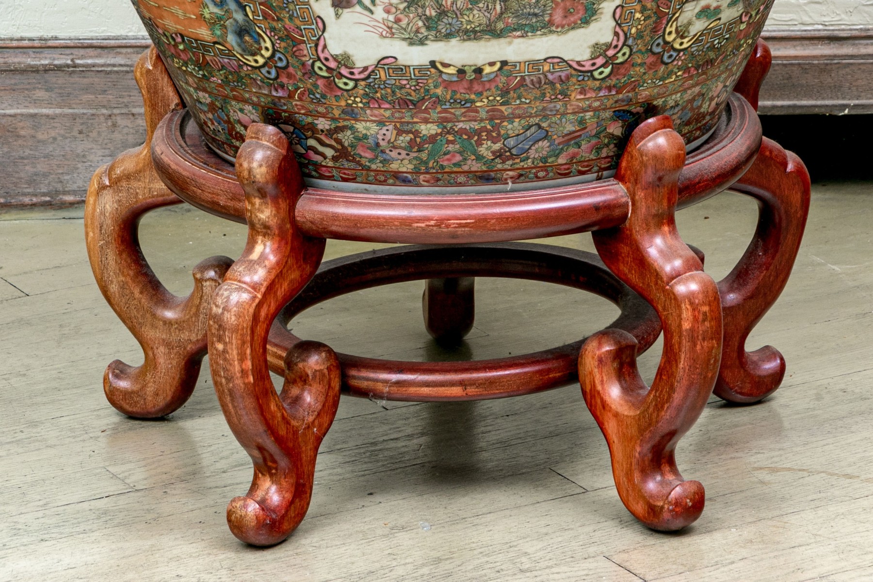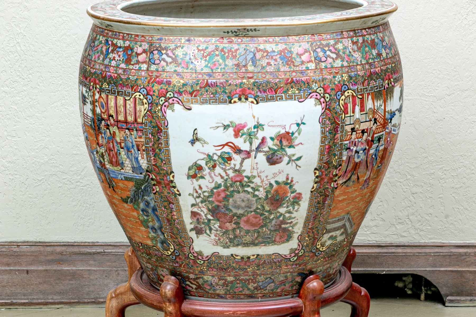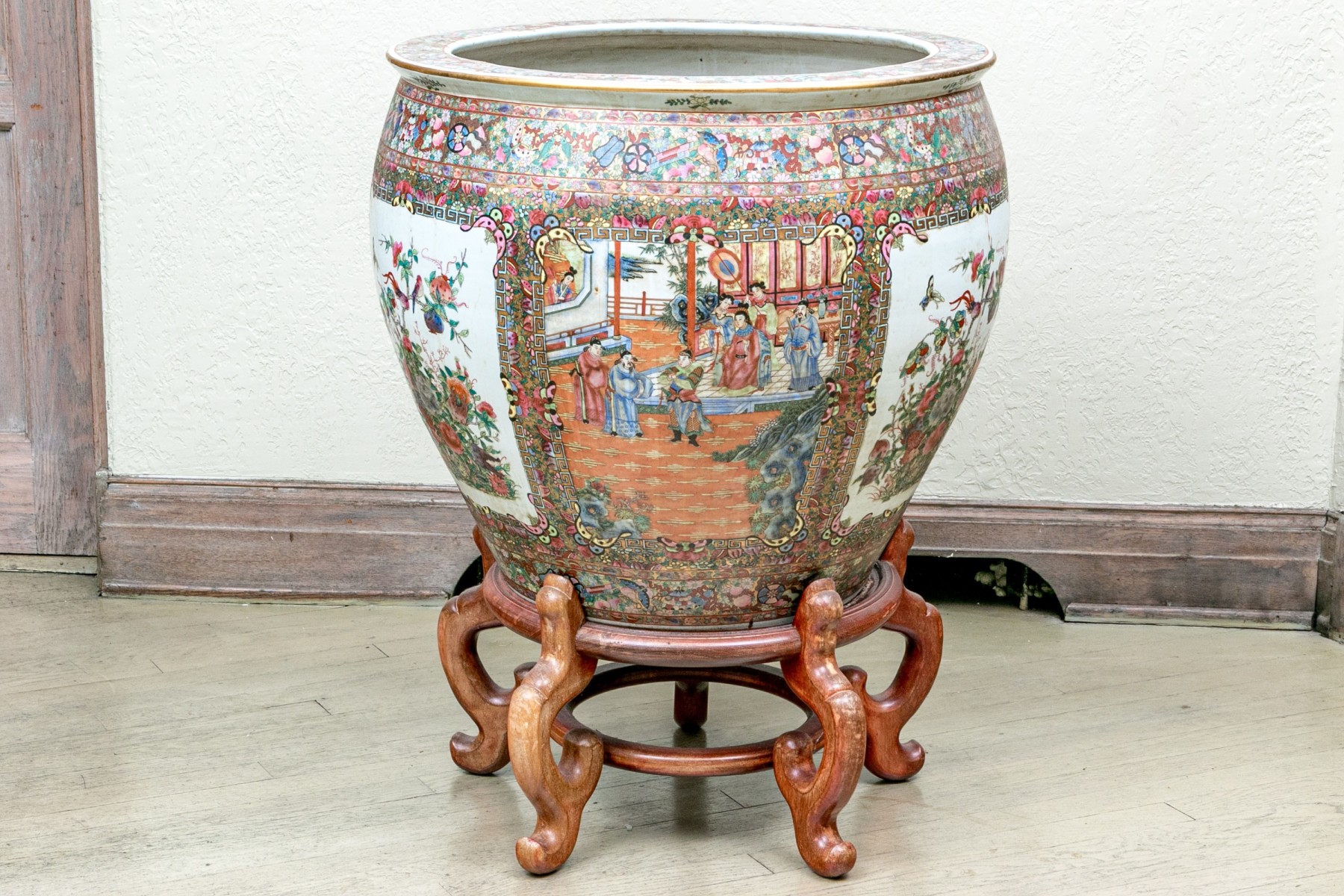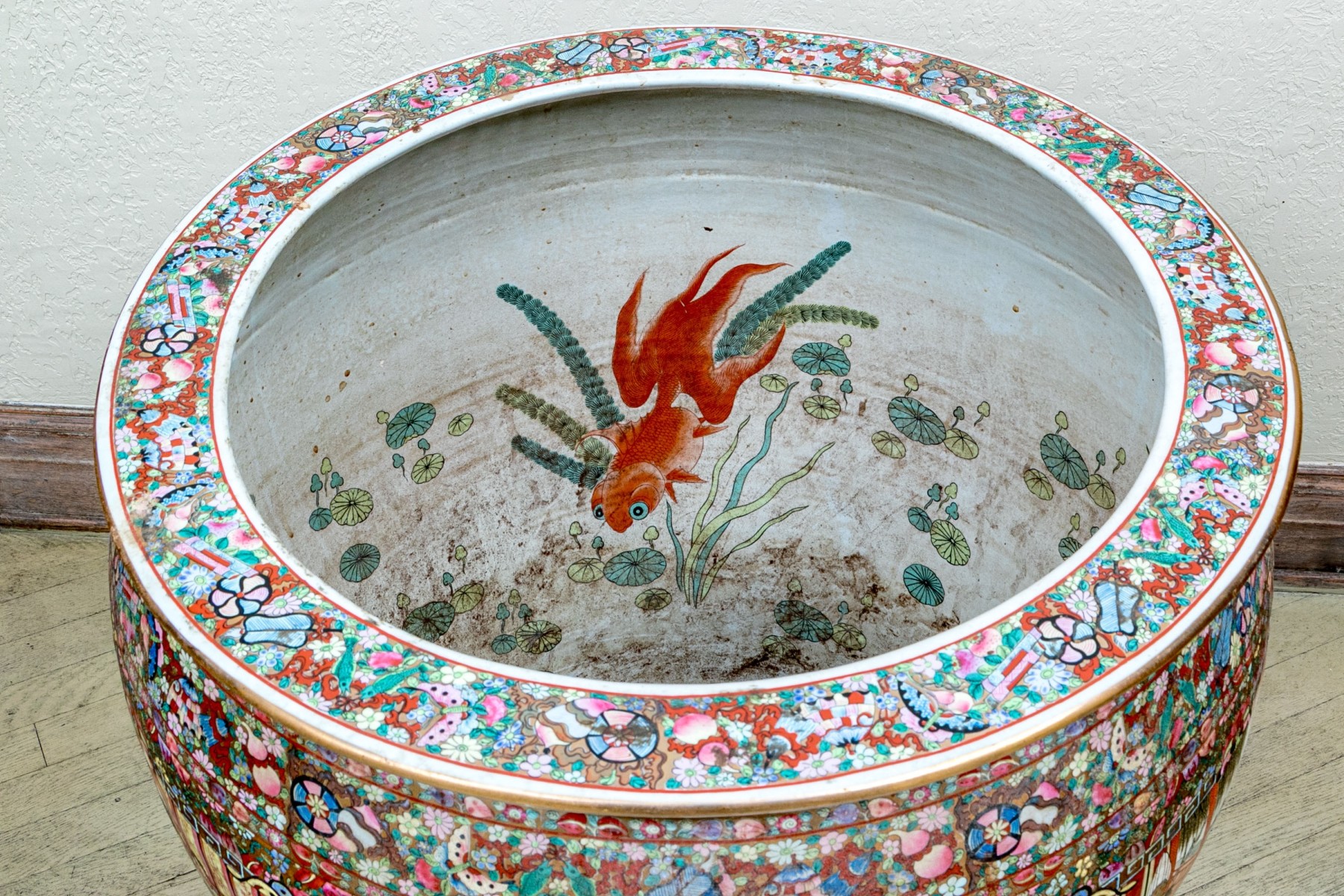 A fabulous mid-century Chinese export ceramic fishbowl planter jardiniere with rich rose medallion decoration around the exterior and goldfish painted along the interior. Displayed on a classic wood stand.