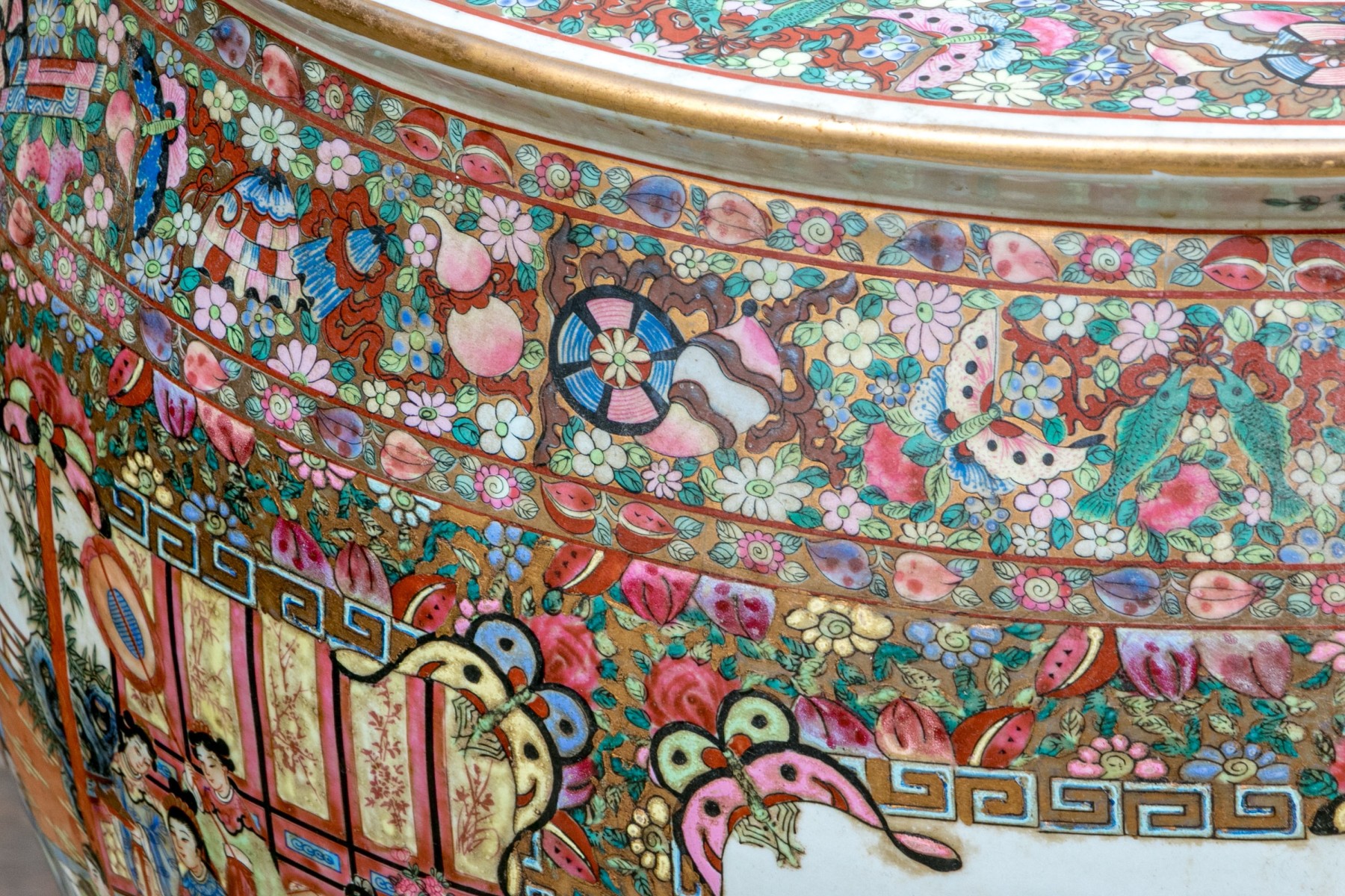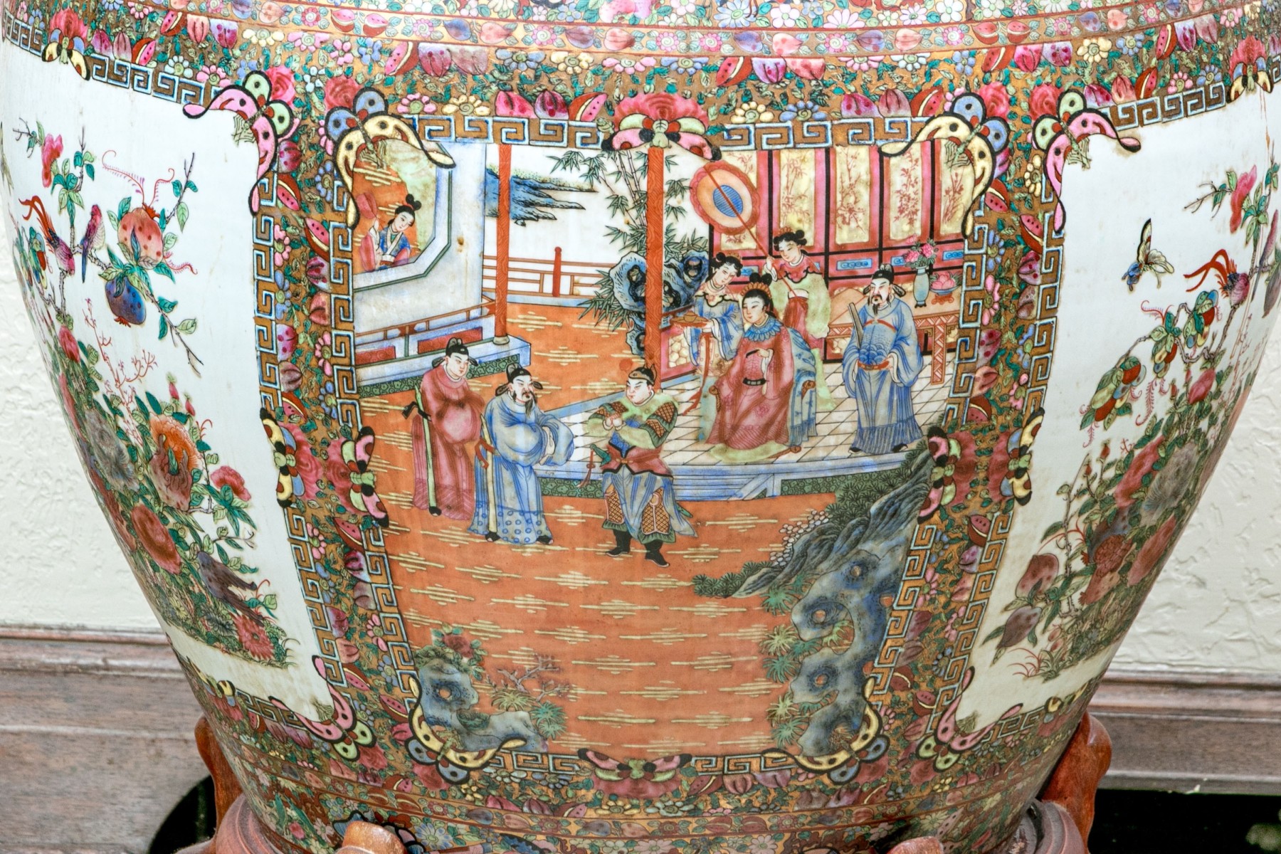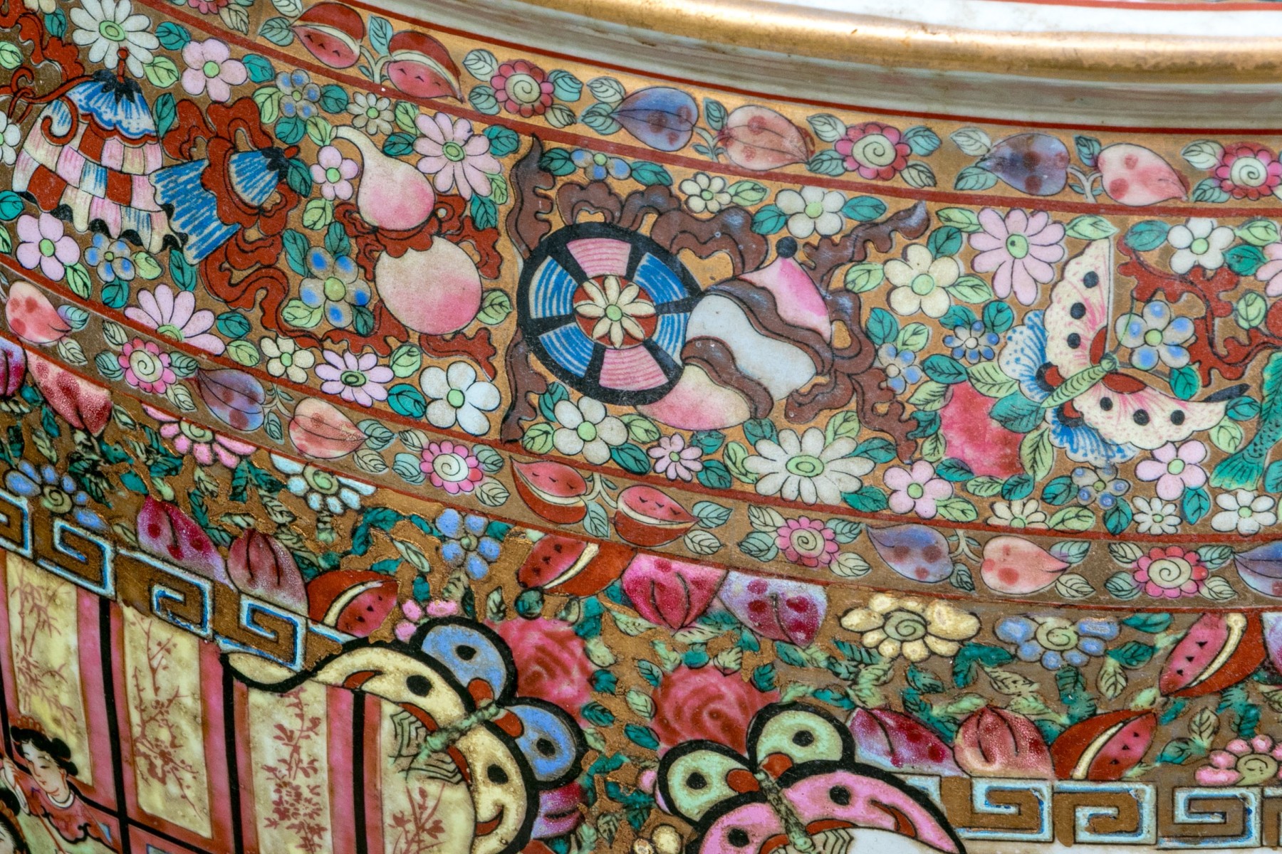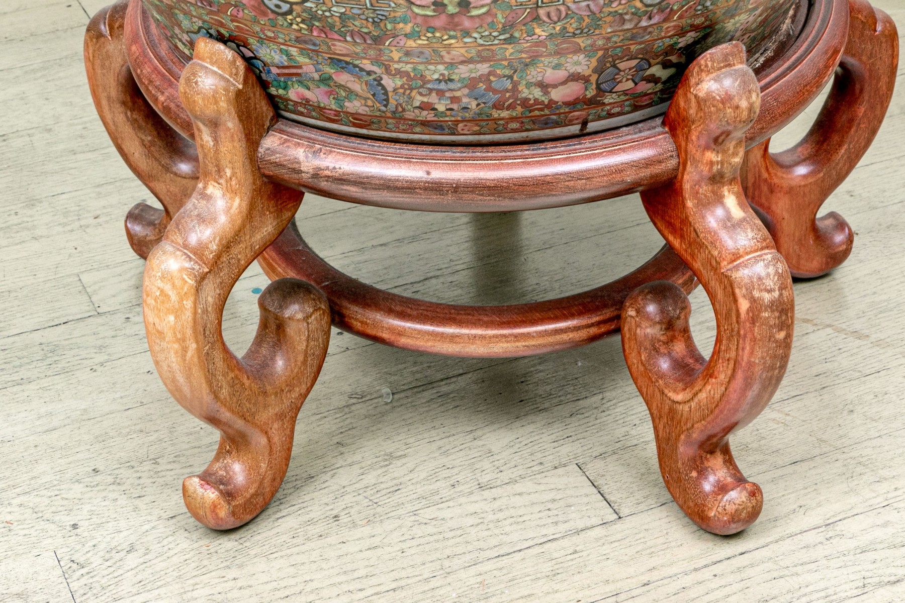 A fabulous mid-century Chinese export ceramic fishbowl planter jardiniere with rich rose medallion decoration around the exterior and goldfish painted along the interior. Displayed on a classic wood stand.