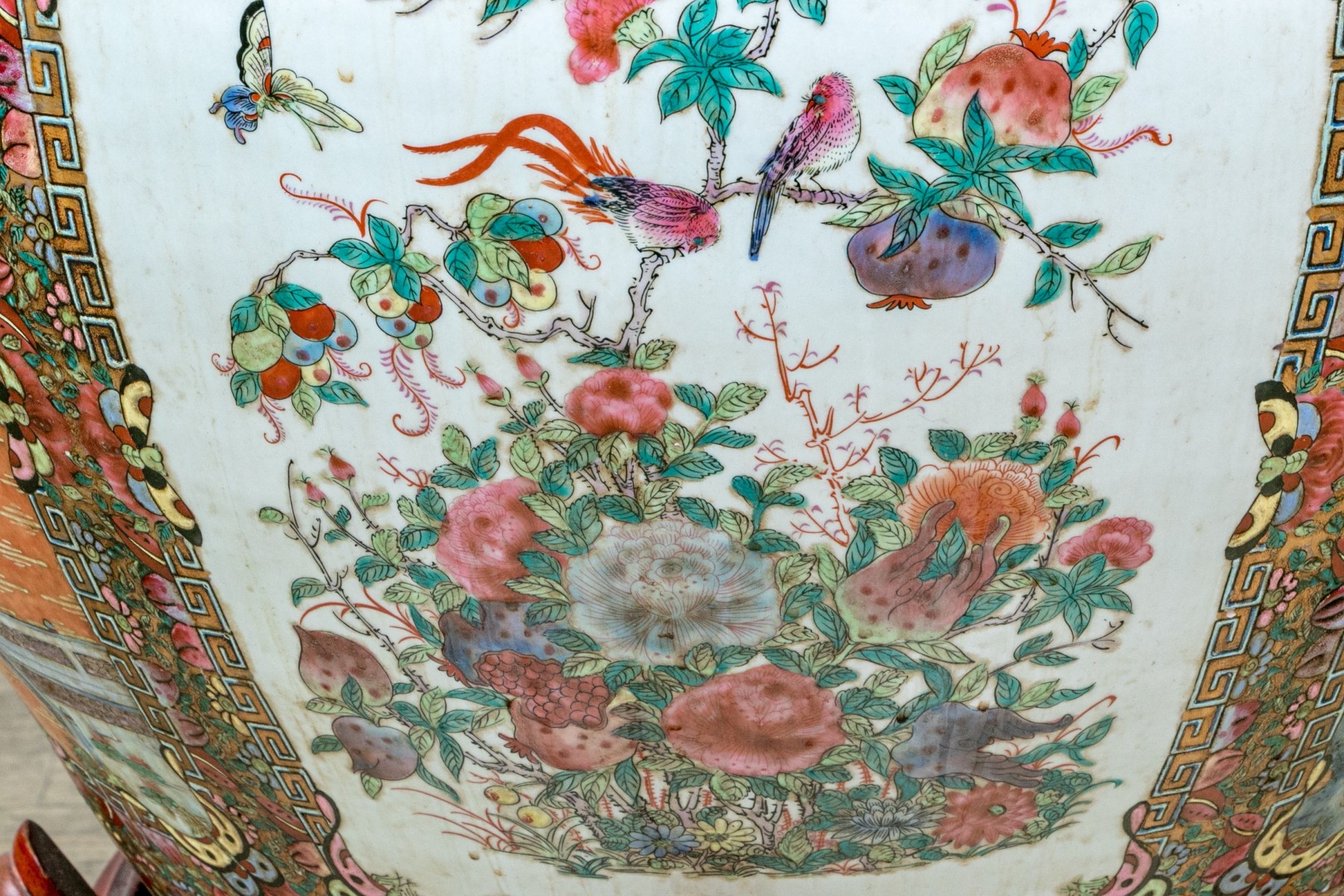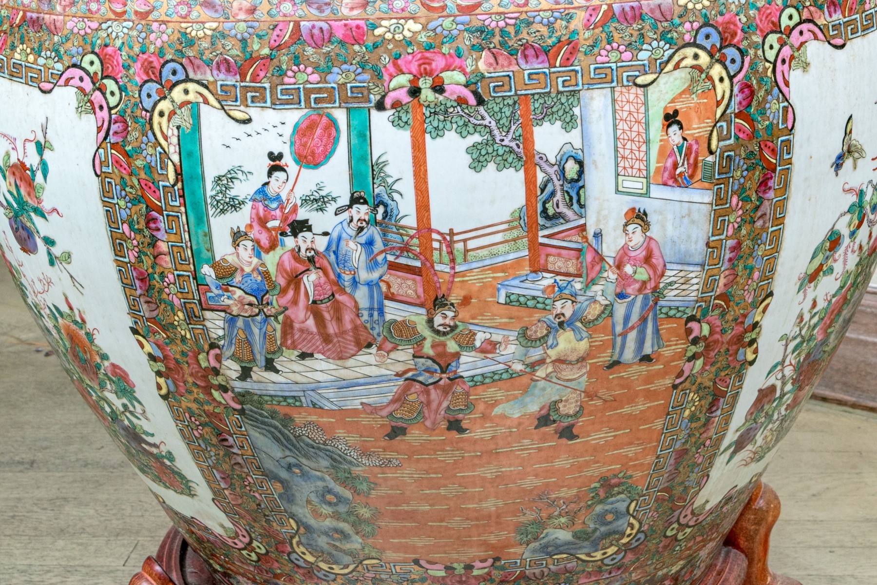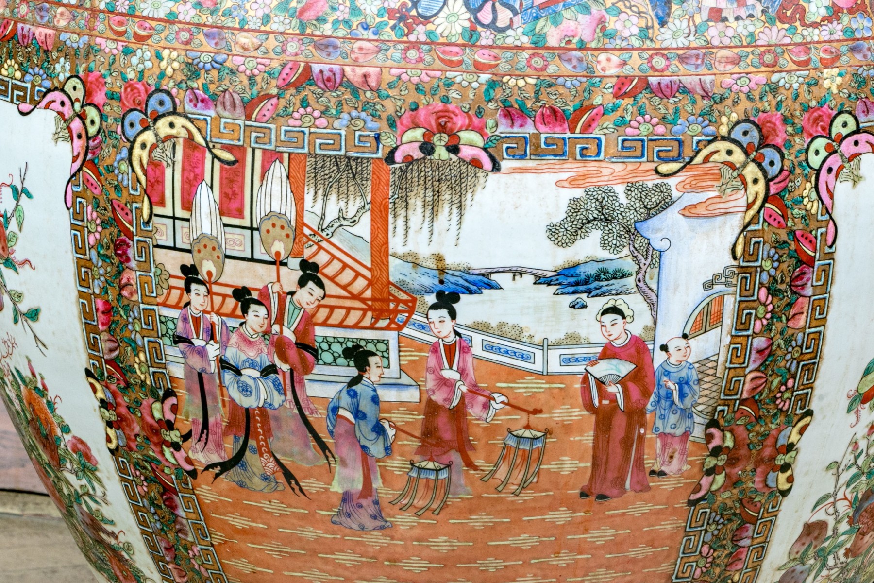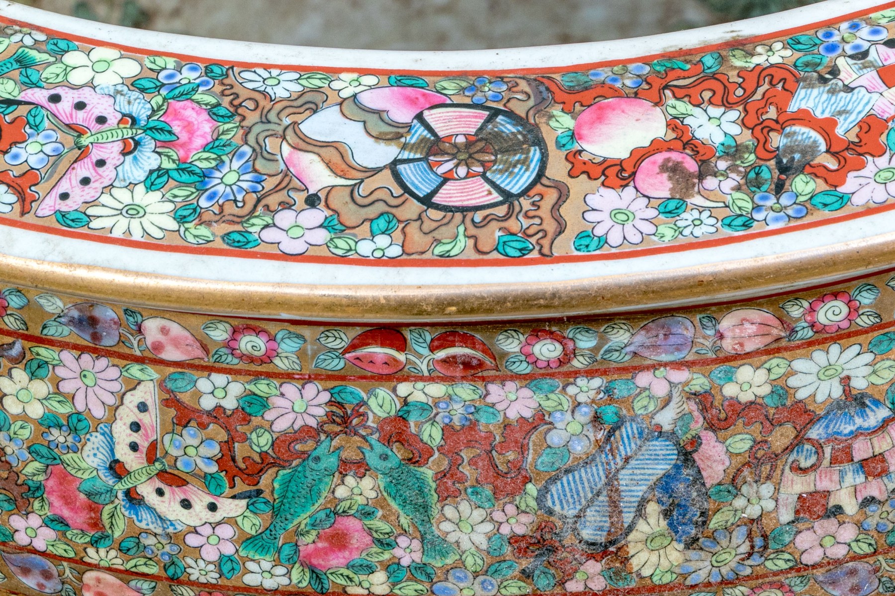 A fabulous mid-century Chinese export ceramic fishbowl planter jardiniere with rich rose medallion decoration around the exterior and goldfish painted along the interior. Displayed on a classic wood stand.