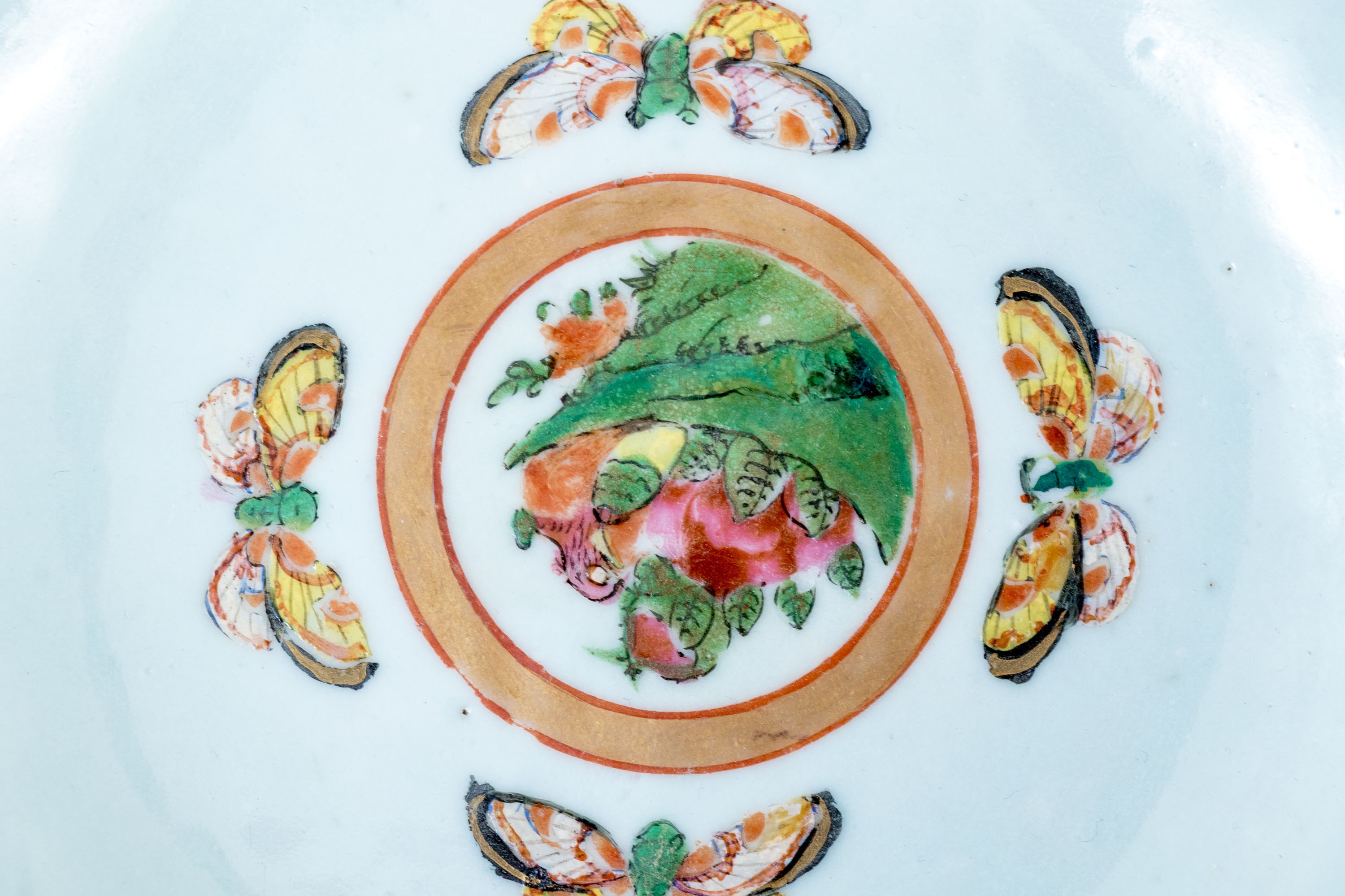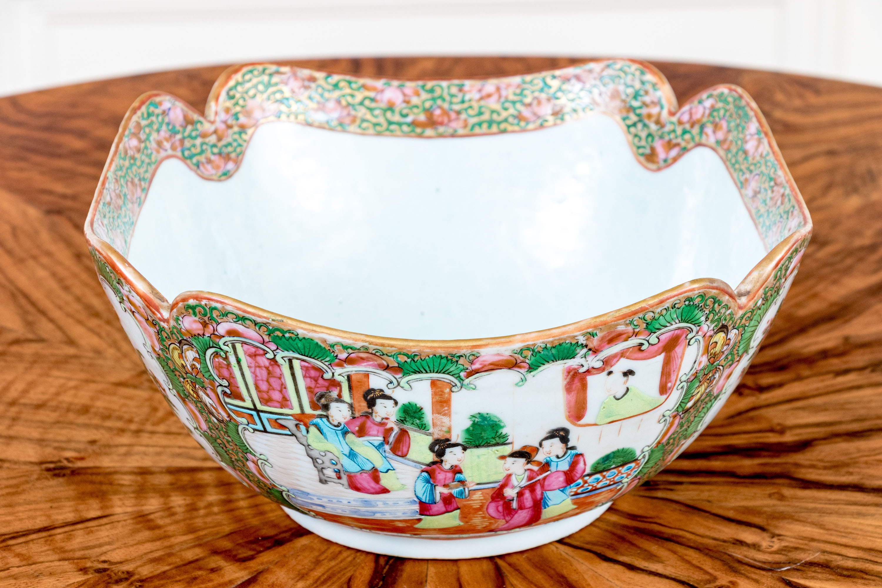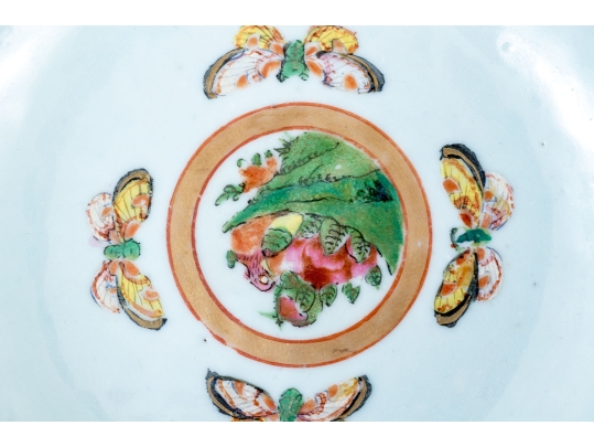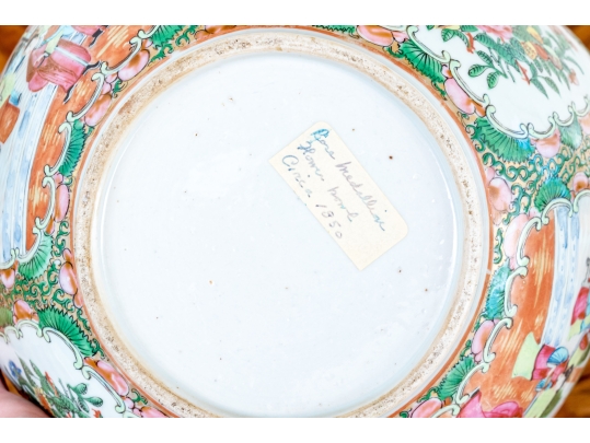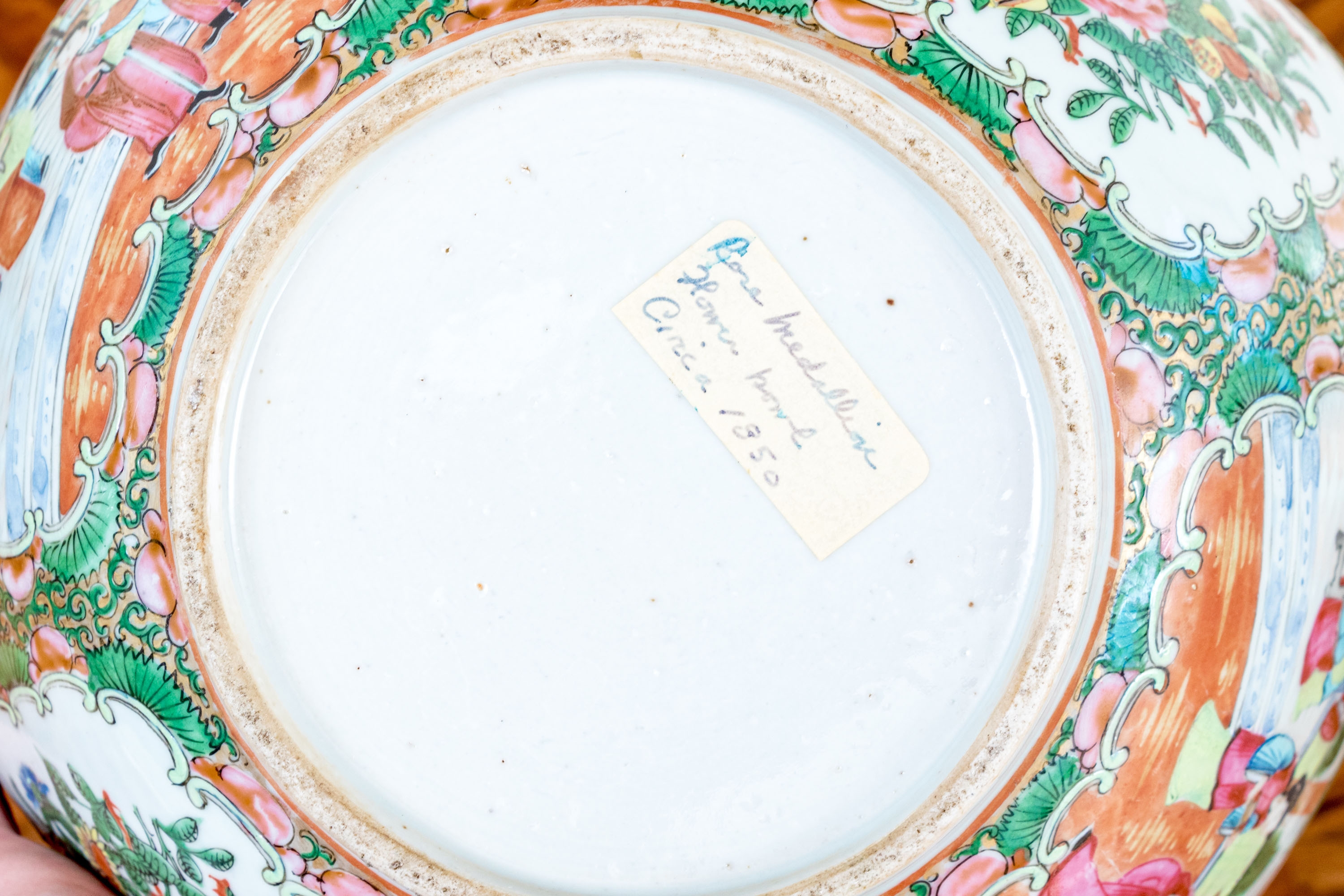 Antique Chinese export Rose Medallion bowl with central medallion surrounded by four butterflies. The interior scalloped border with florals and green scrolls on a gilt background. The exterior with four cartouche panels comprised of figures, birds, flowers, butterflies and fruits.