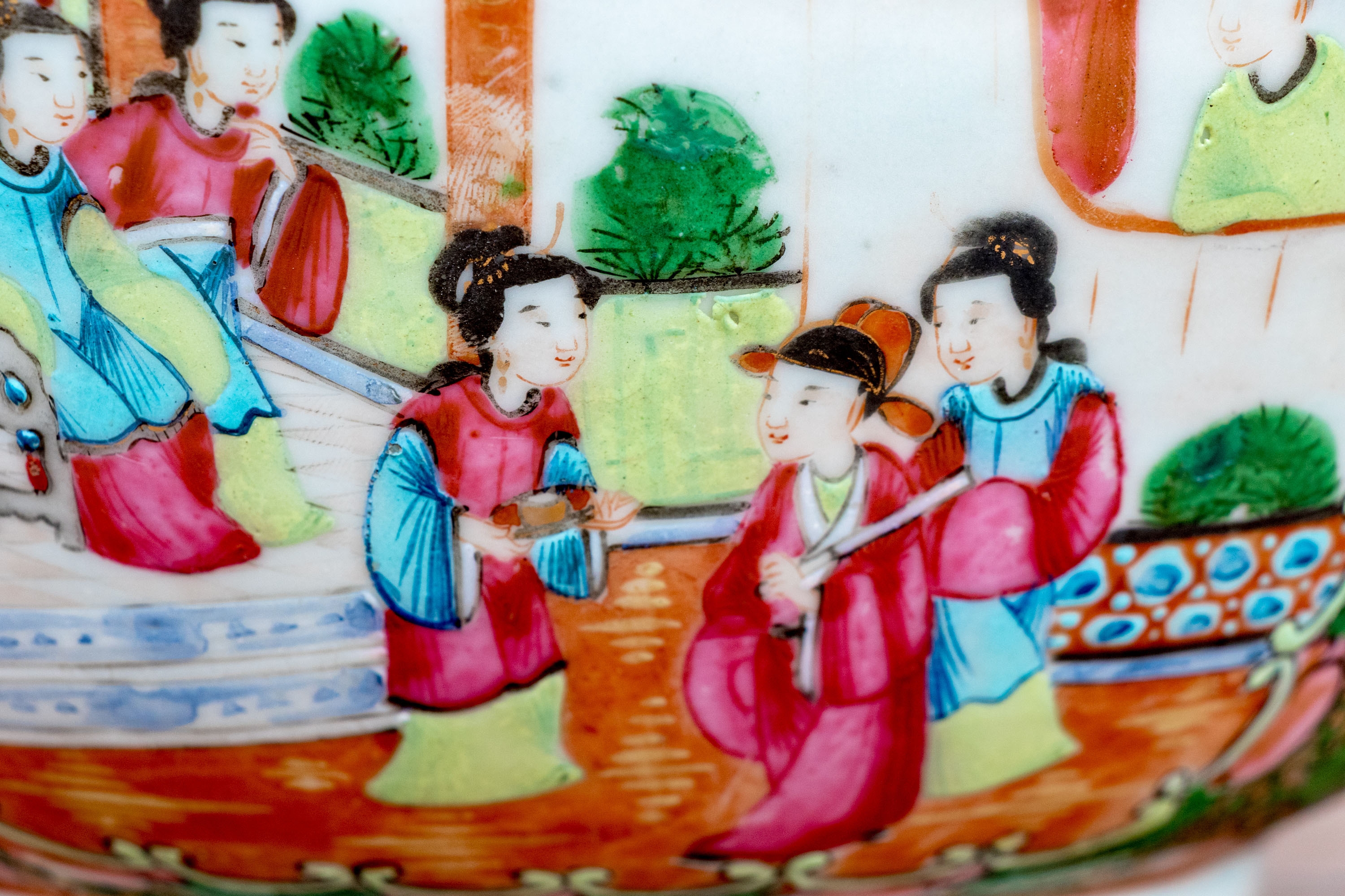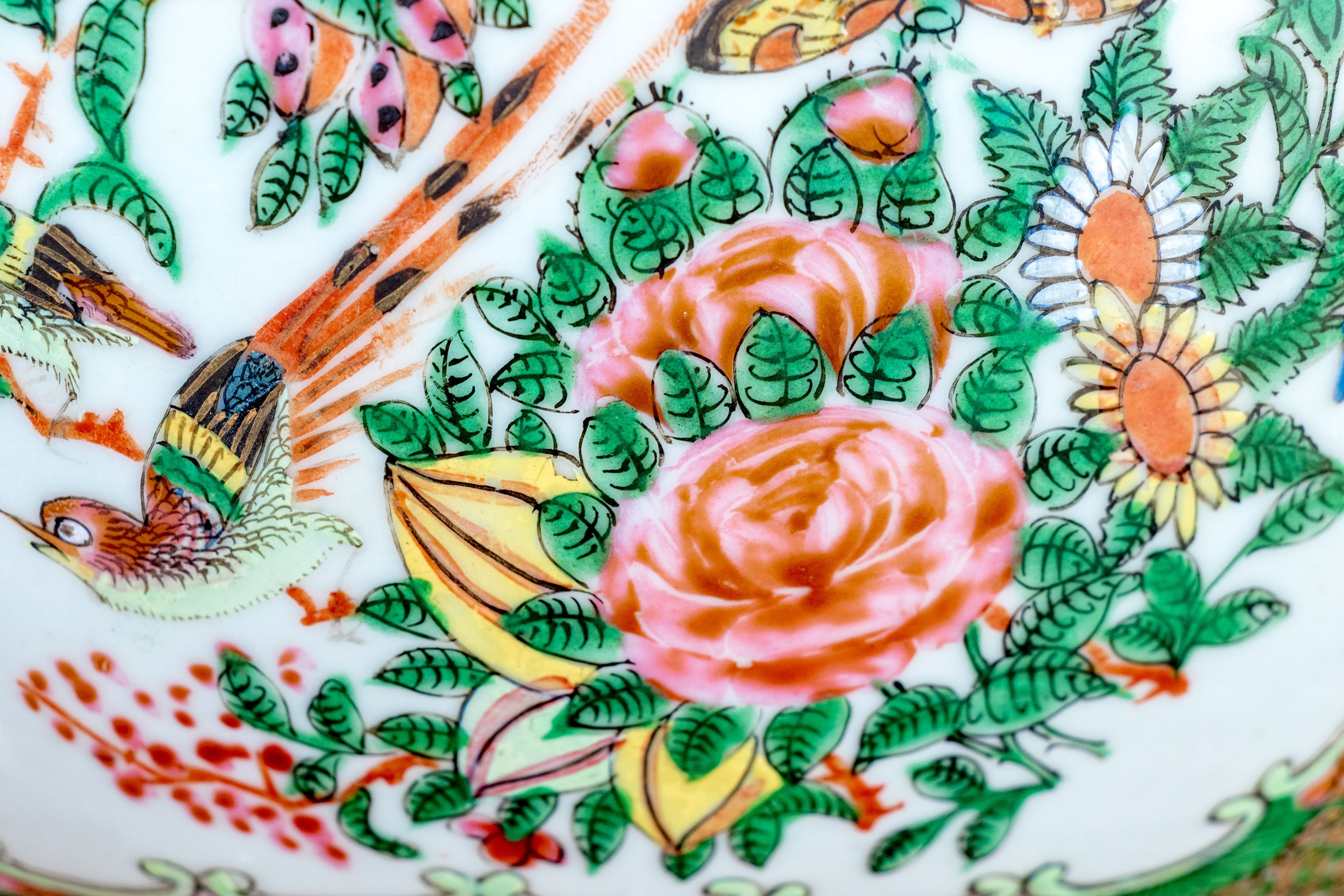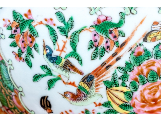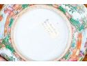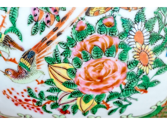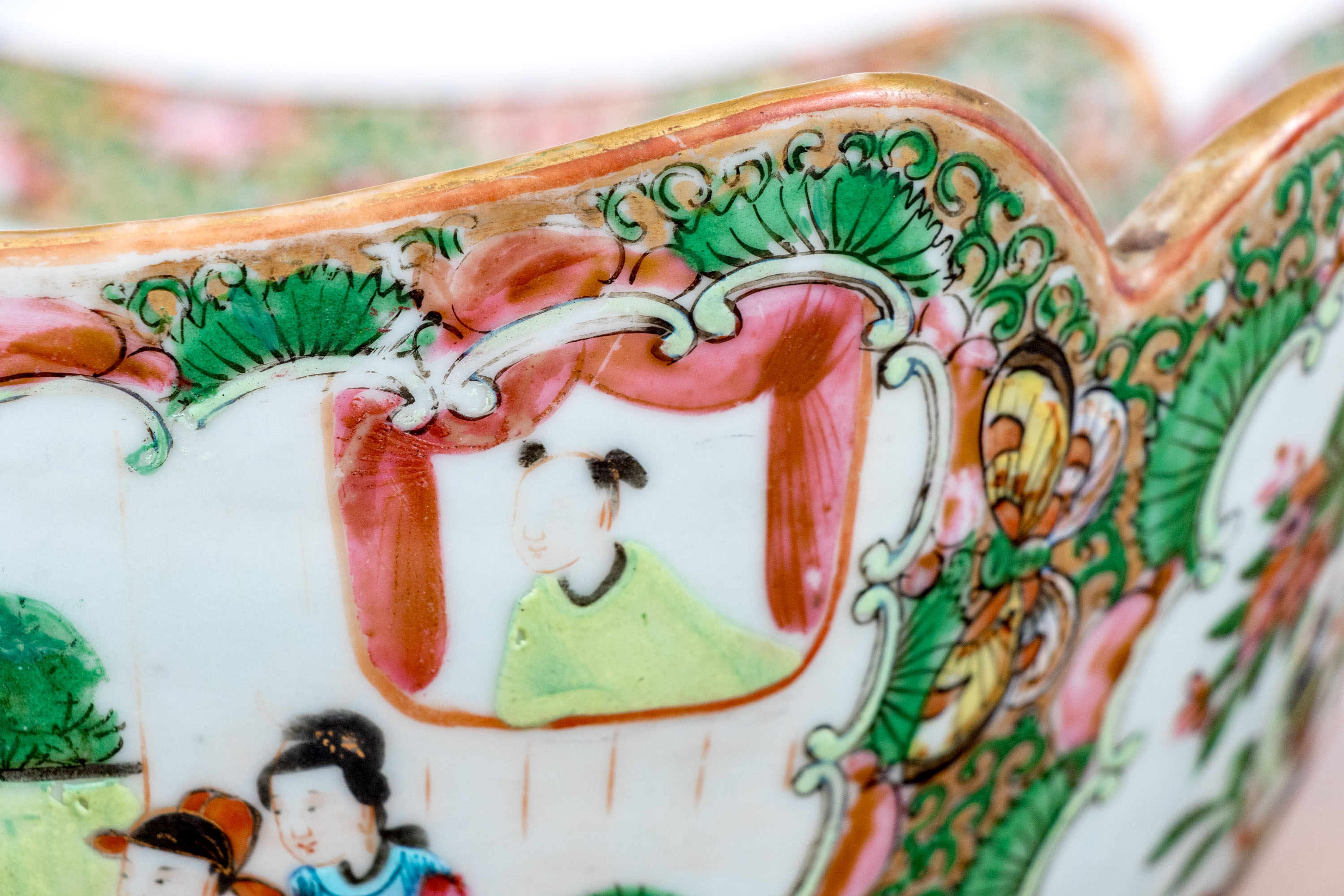 Antique Chinese export Rose Medallion bowl with central medallion surrounded by four butterflies. The interior scalloped border with florals and green scrolls on a gilt background. The exterior with four cartouche panels comprised of figures, birds, flowers, butterflies and fruits.