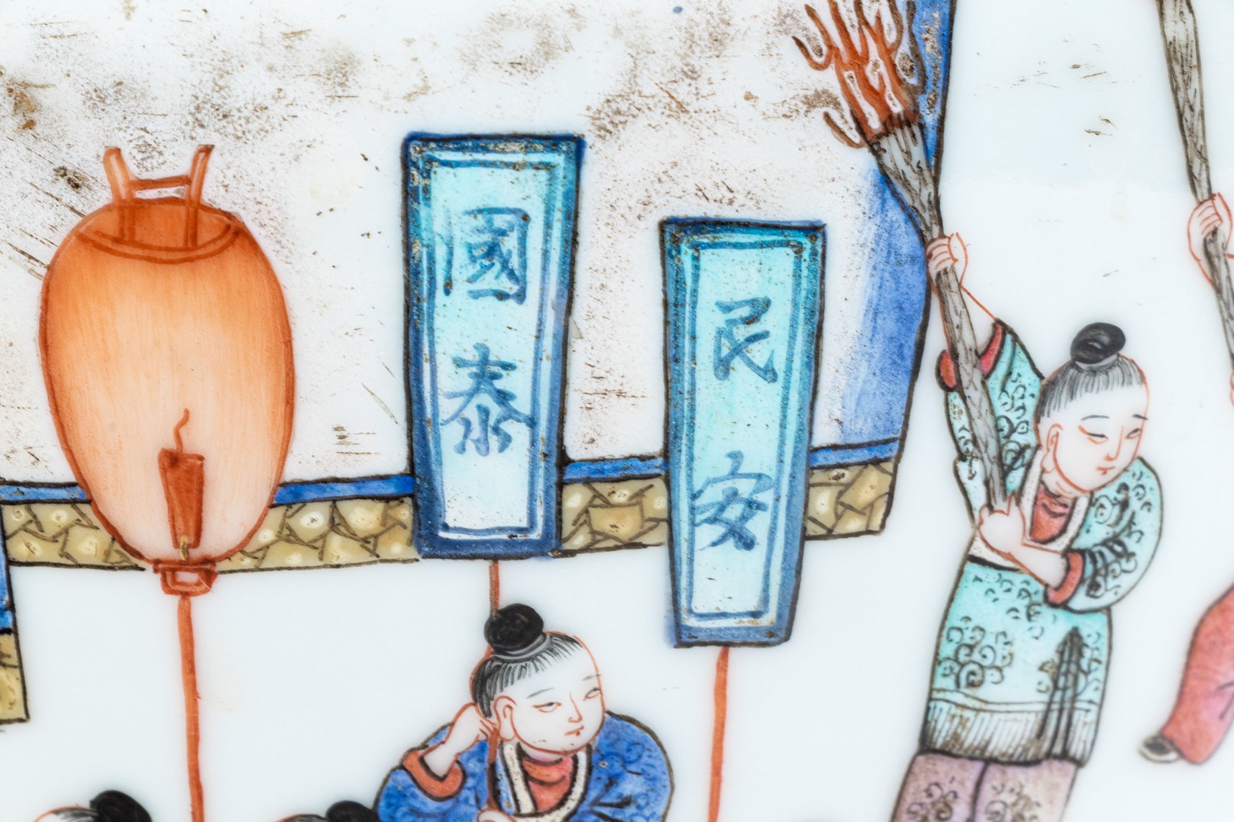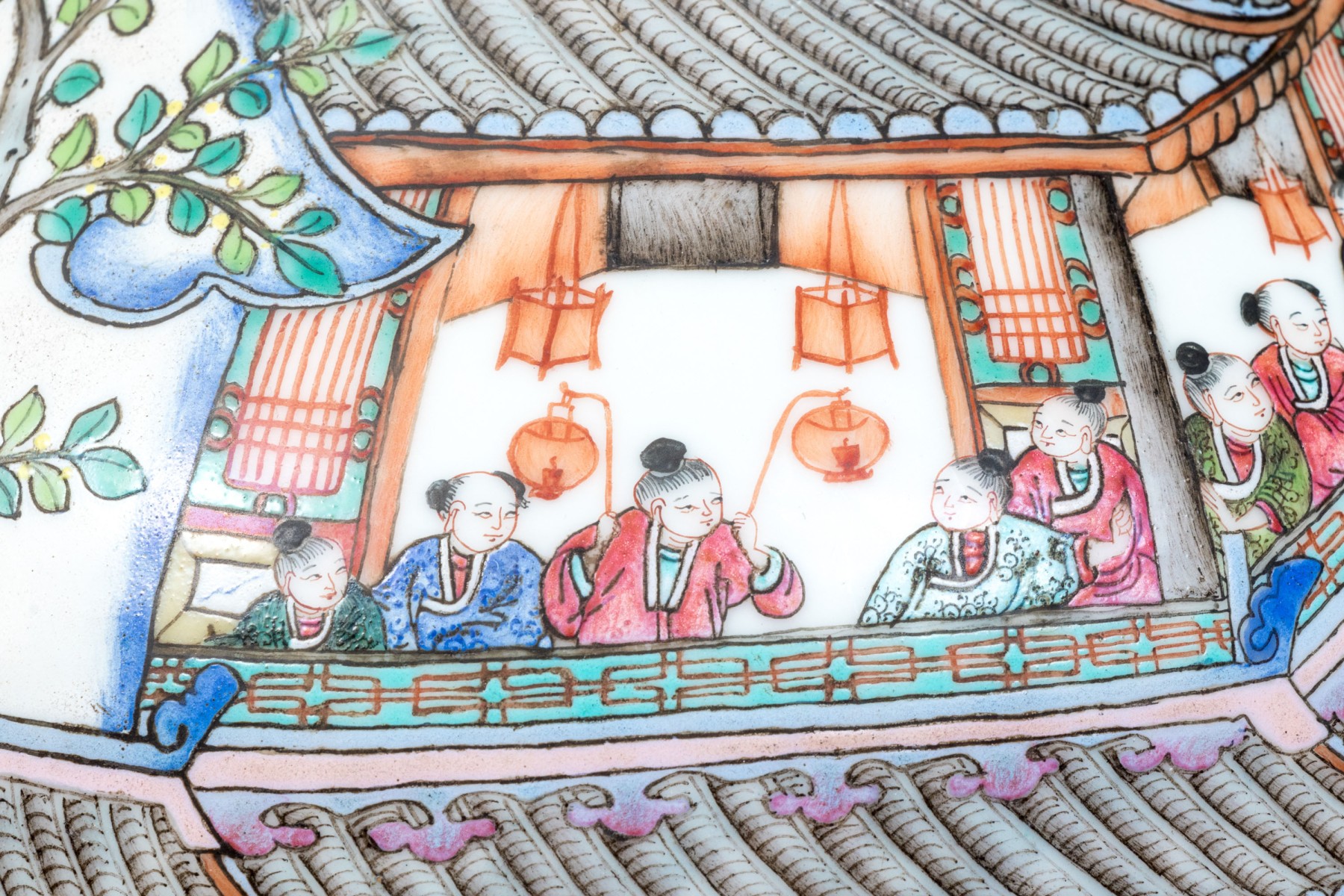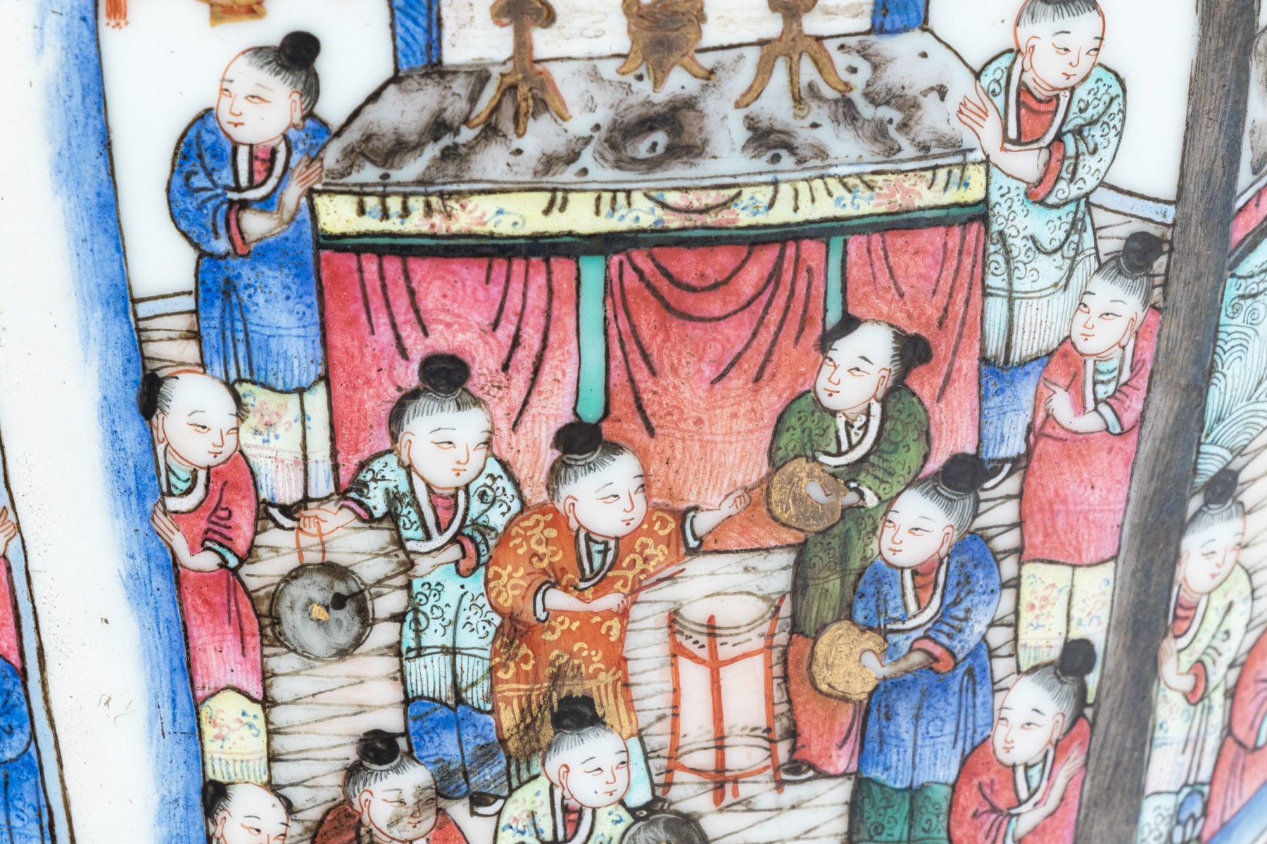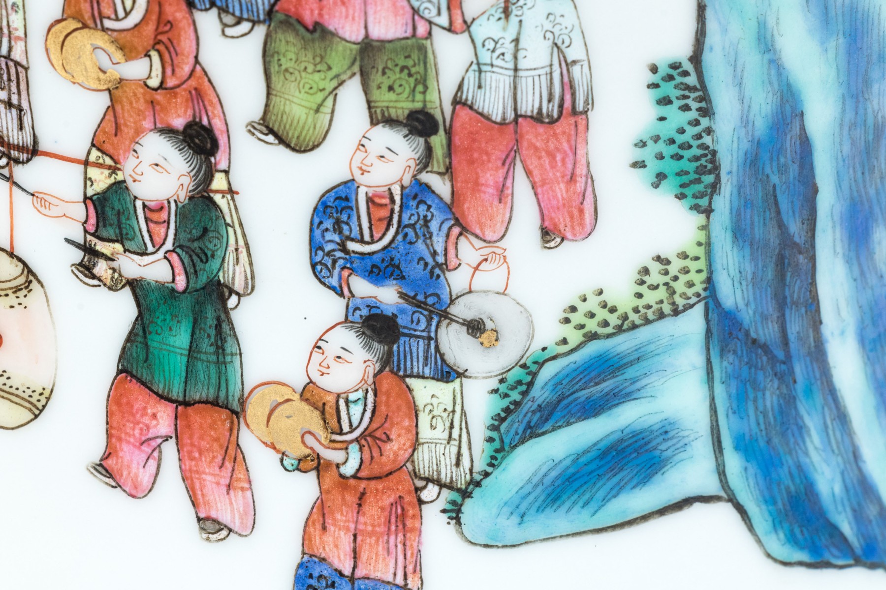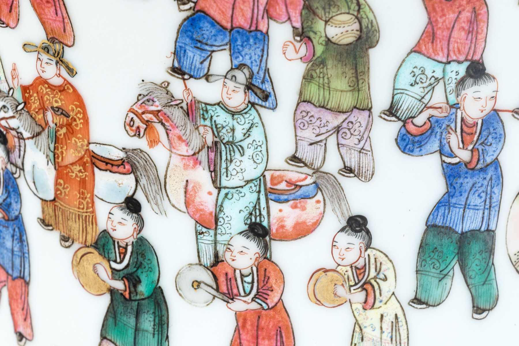 Handsomely painted depicting architectural pagoda with numerous court figures dispersed throughout the lower and upper levels depicted observing a large procession being undertaken with musicians and figures carrying banners and figures of ferocious foo dogs.