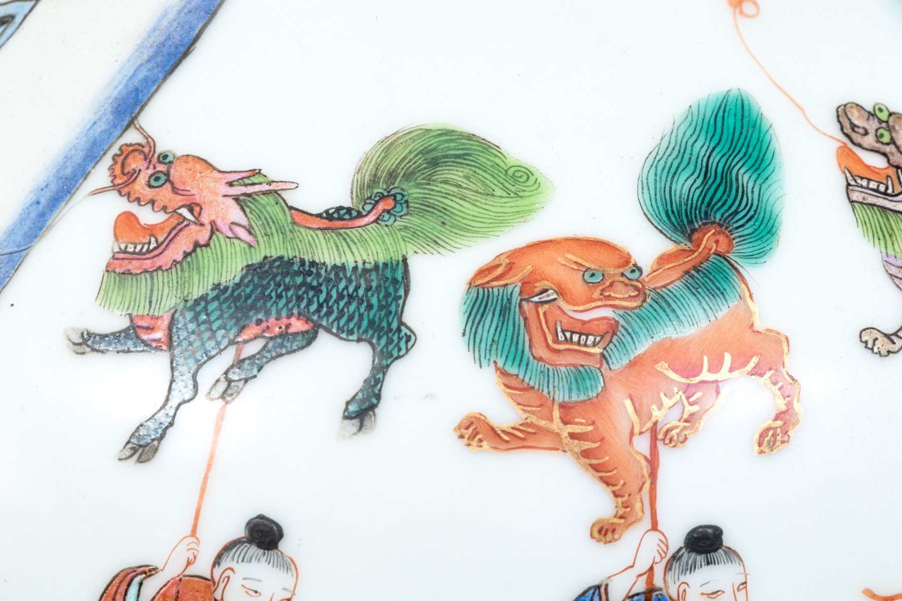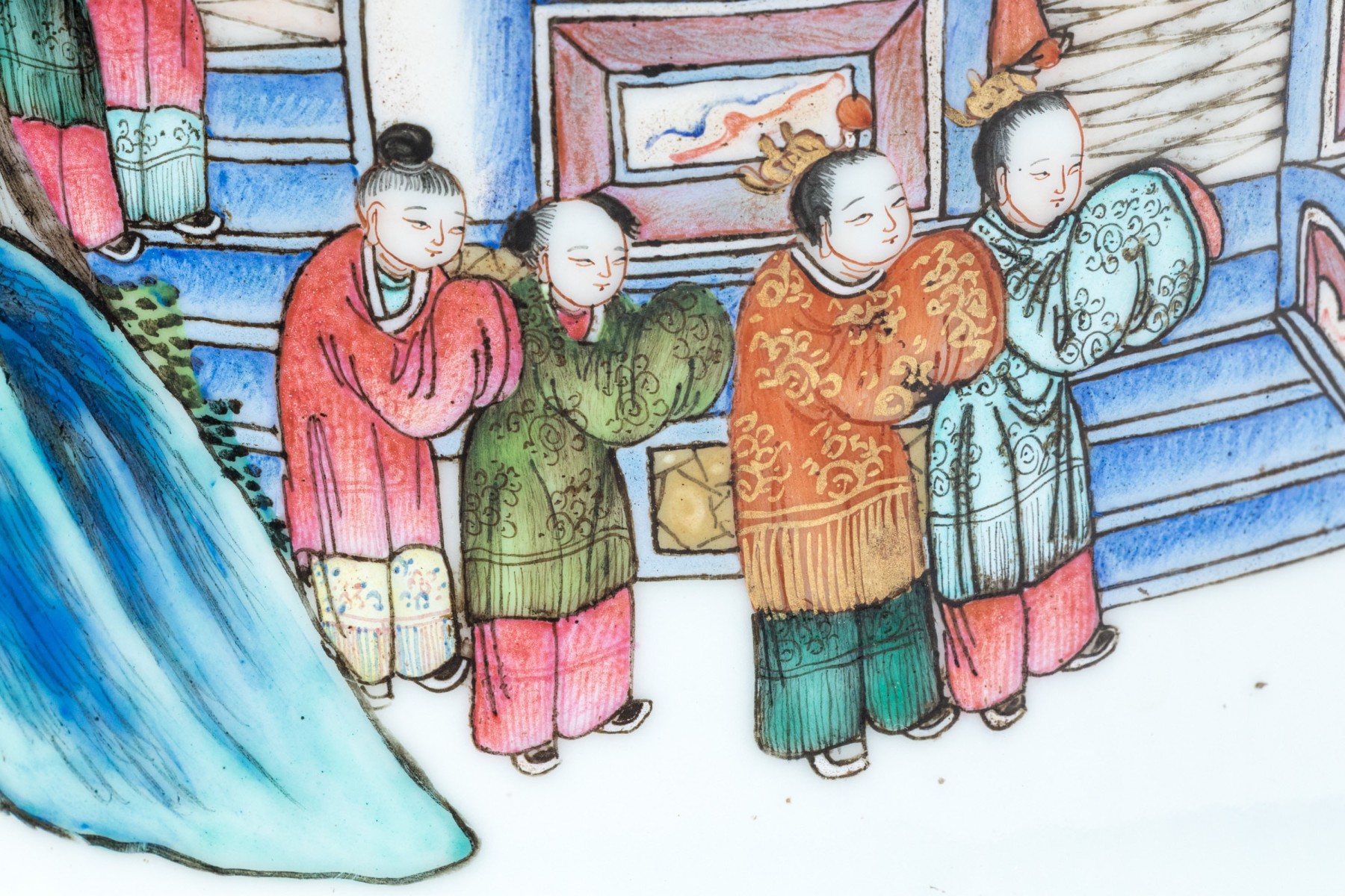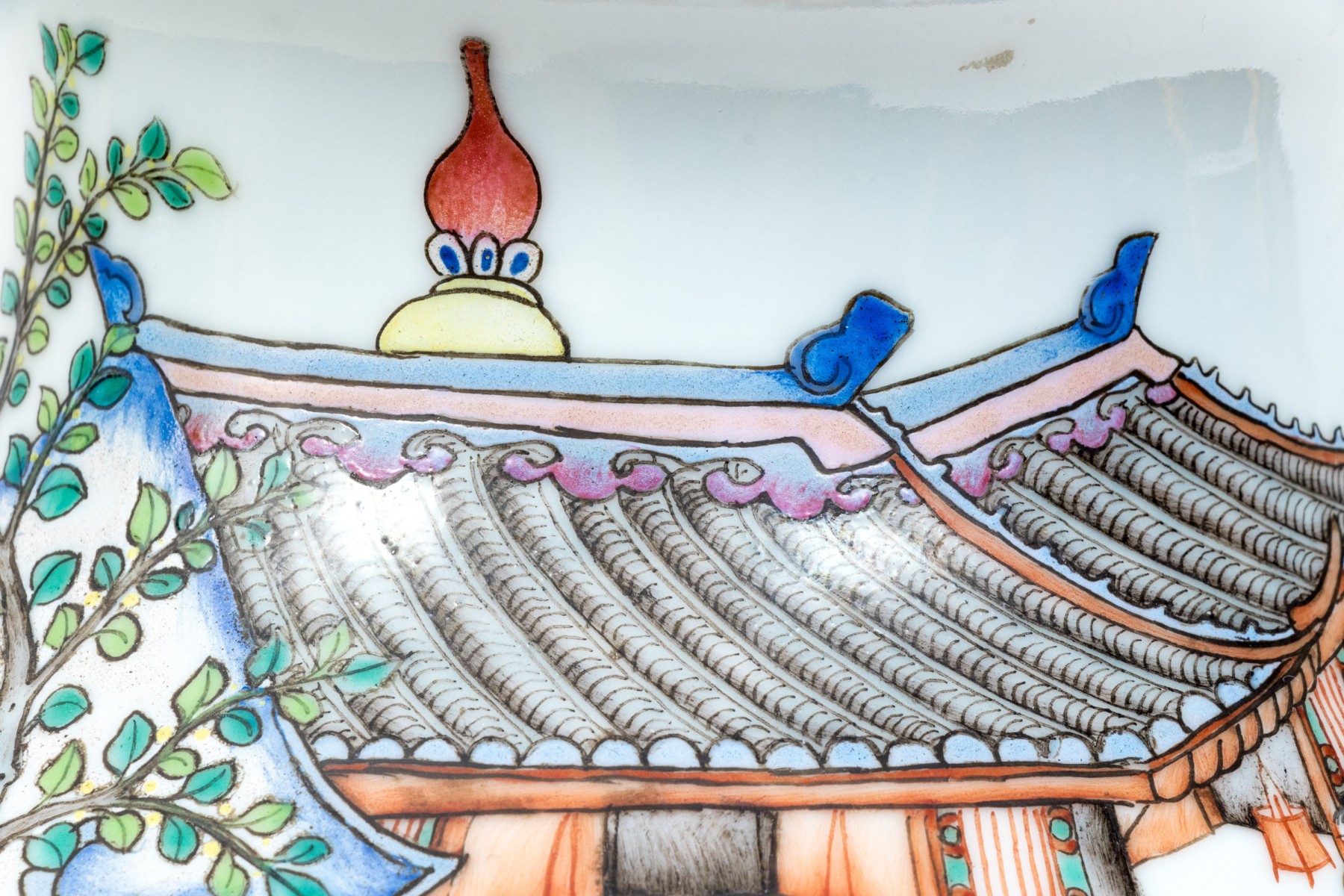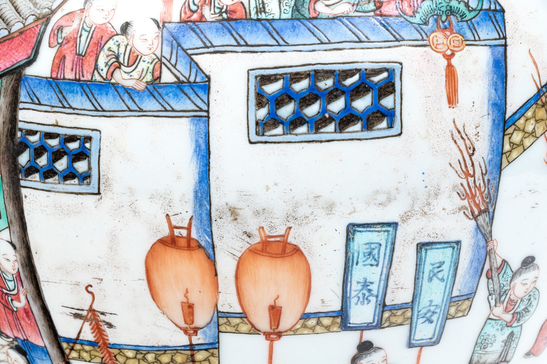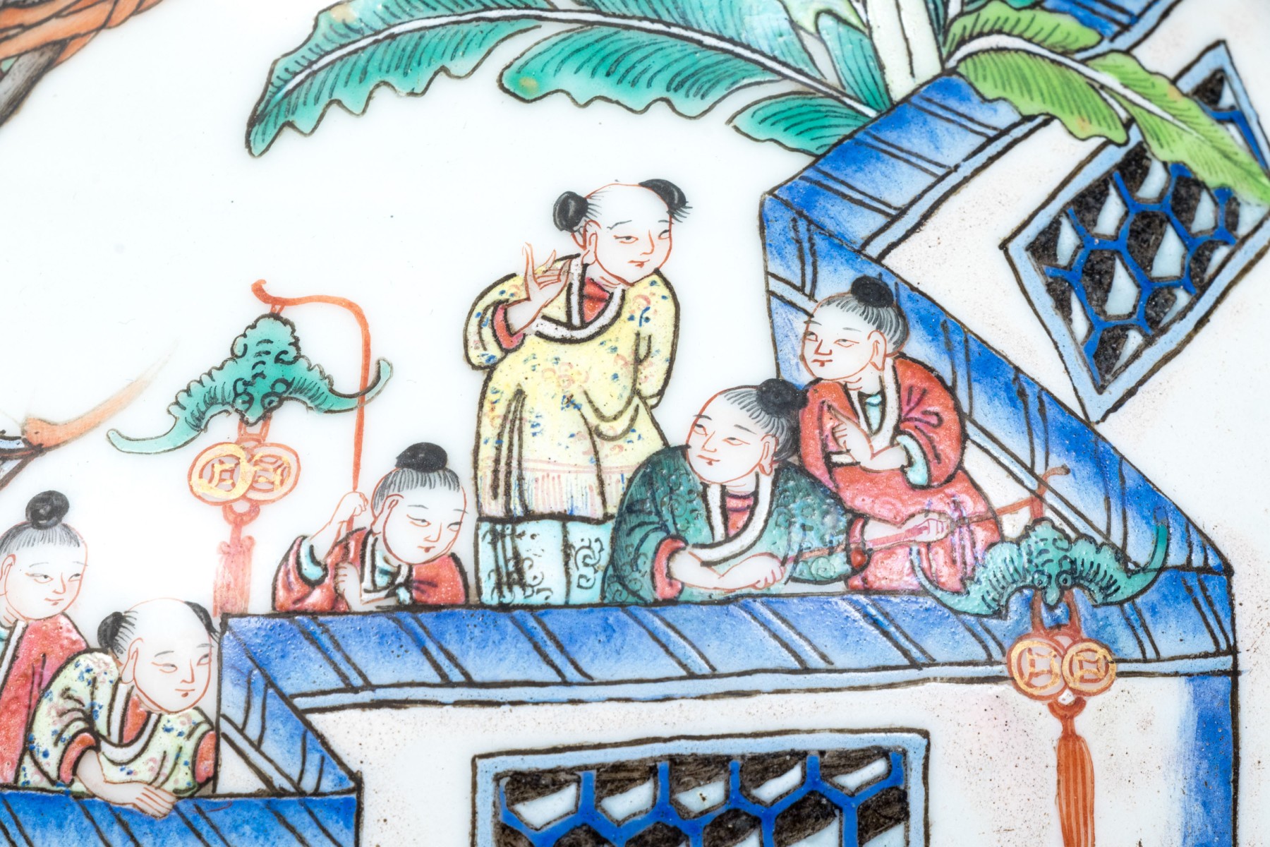 Handsomely painted depicting architectural pagoda with numerous court figures dispersed throughout the lower and upper levels depicted observing a large procession being undertaken with musicians and figures carrying banners and figures of ferocious foo dogs.