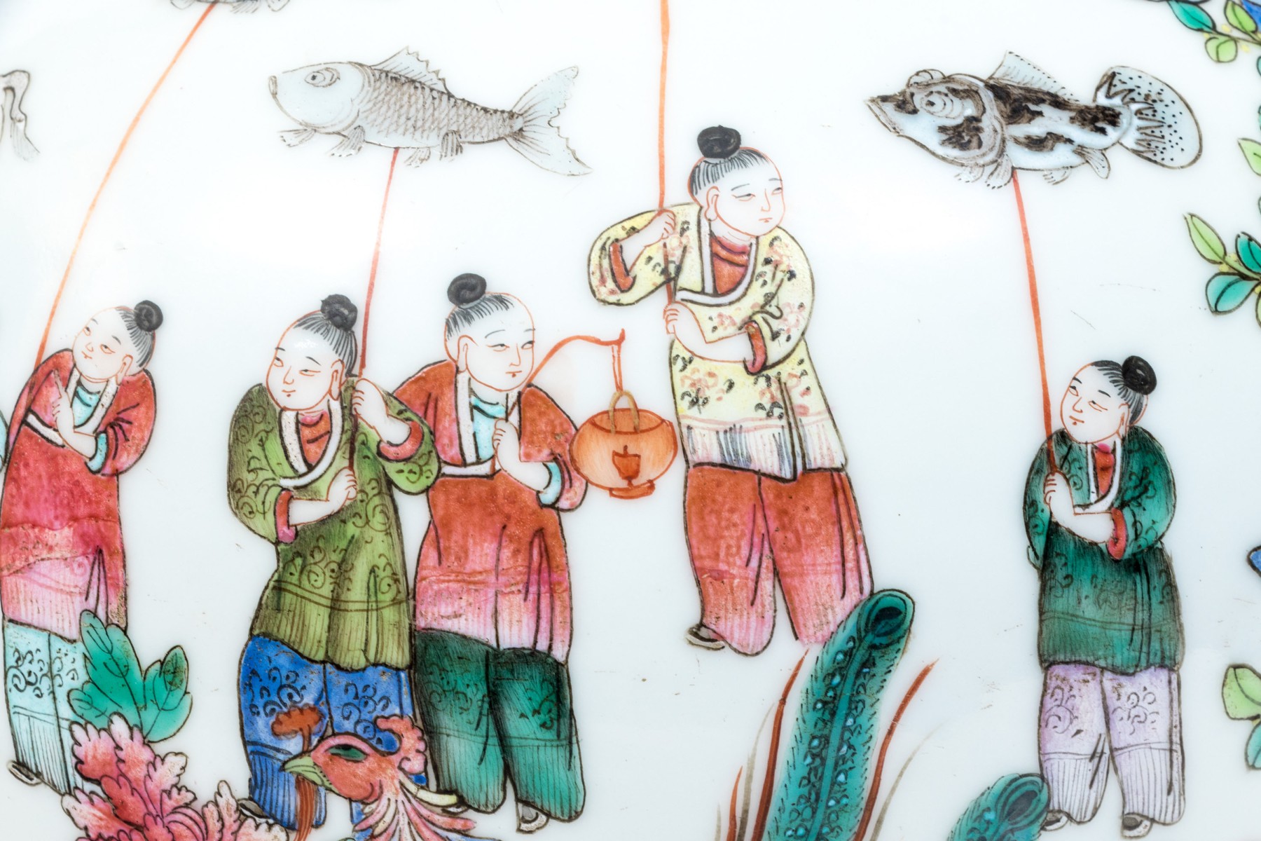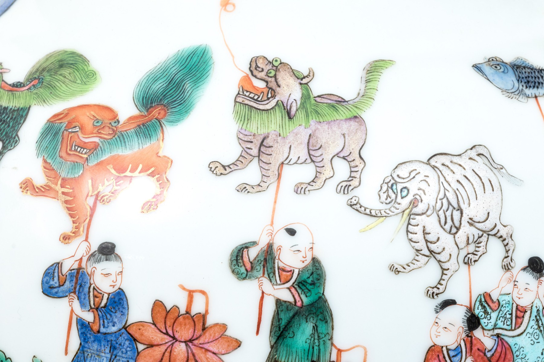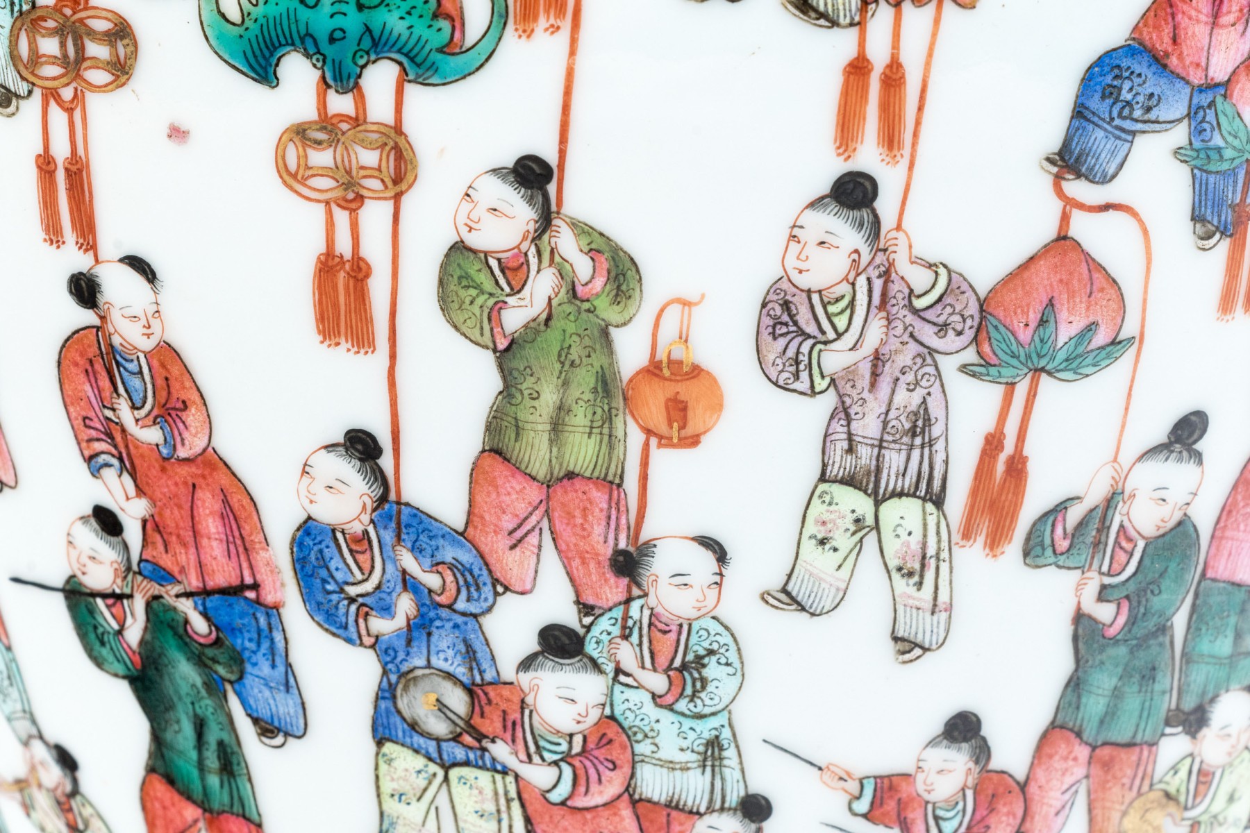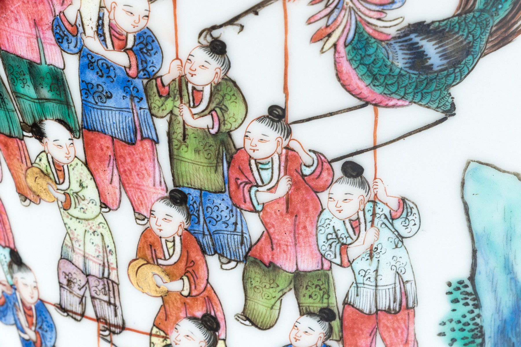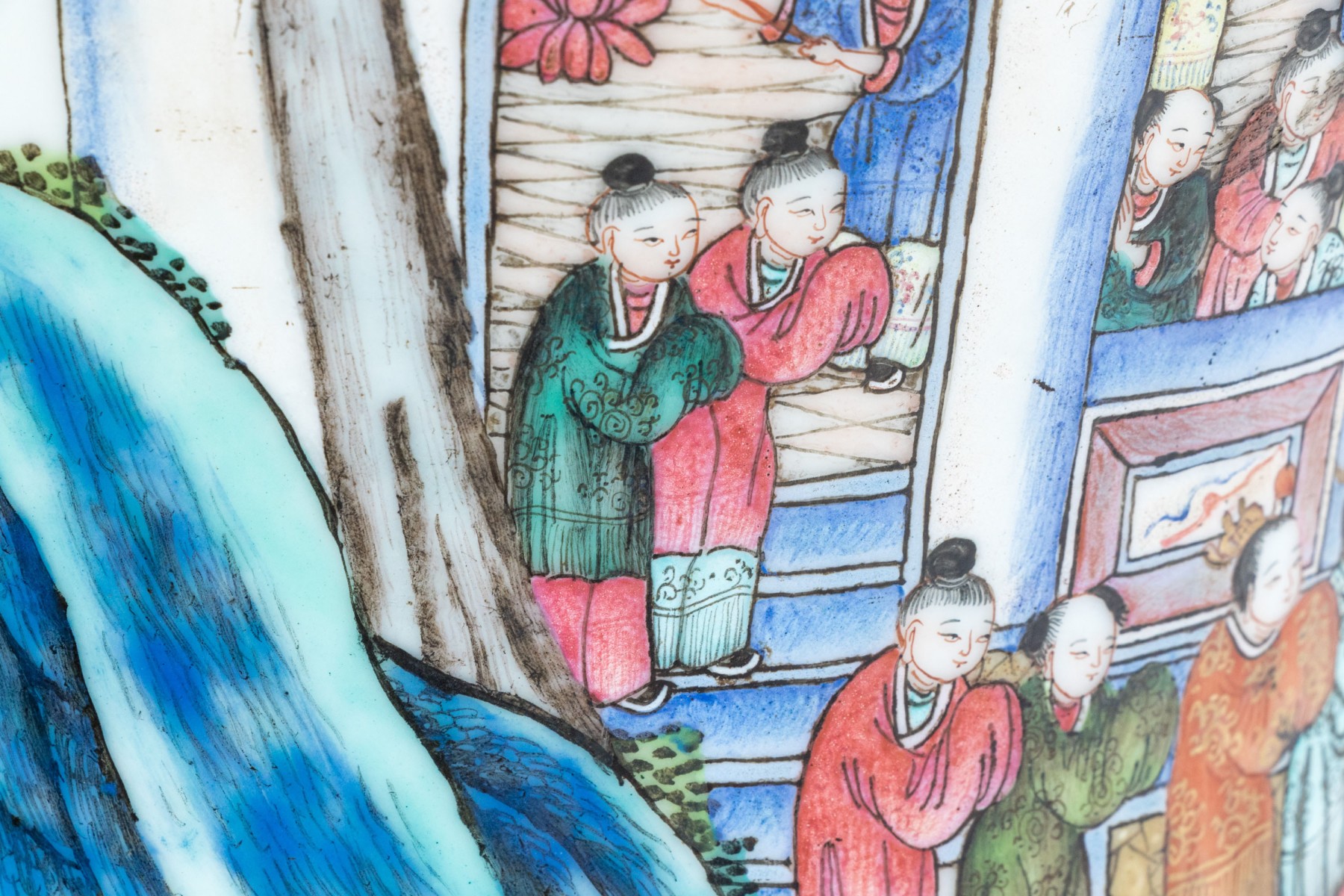 Handsomely painted depicting architectural pagoda with numerous court figures dispersed throughout the lower and upper levels depicted observing a large procession being undertaken with musicians and figures carrying banners and figures of ferocious foo dogs.